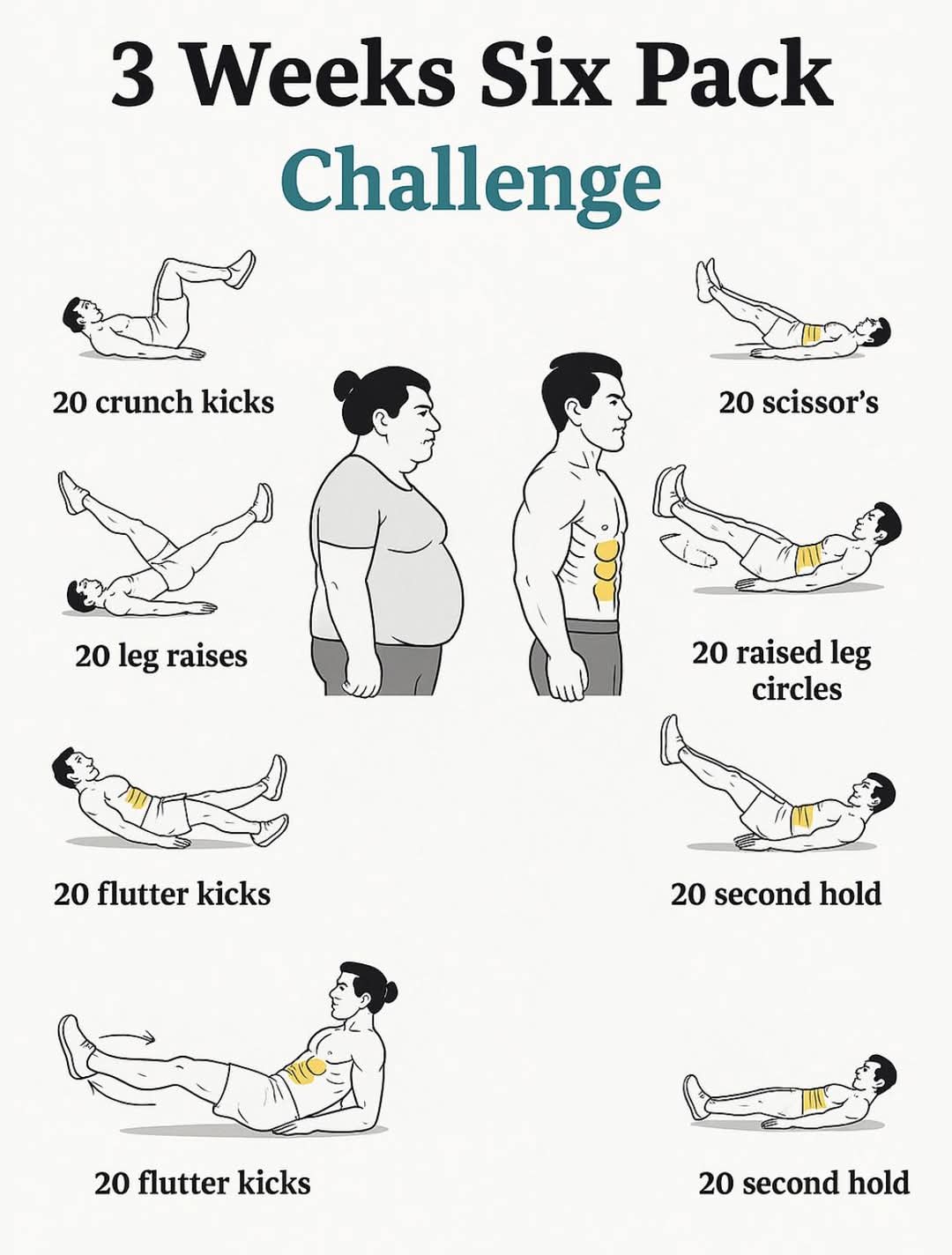 '3주 만에 식스팩 만들기 챌린지'라는 제목으로 다양한 복근 운동을 제시하고 있습니다. 그림에 나온 각 운동 방법을 설명하고, 식스팩을 만드는 데 가장 좋은 운동 방법과 실행 팁을 알려드리겠습니다.