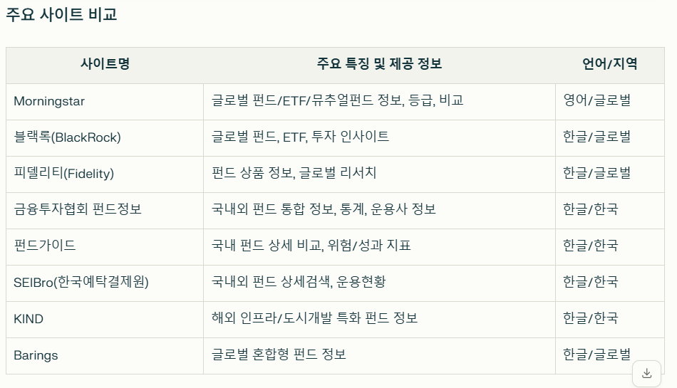 전 세계 펀드(공모/사모펀드, ETF 등) 정보를 확인하고 비교할 수 있는 대표적인 사이트와 특징을 정리했습니다.