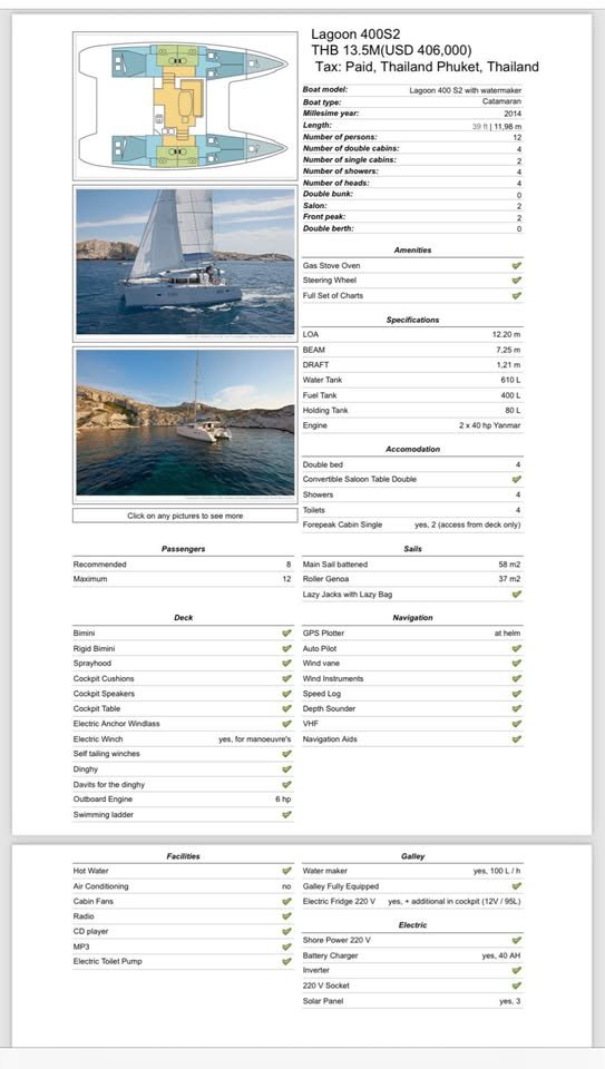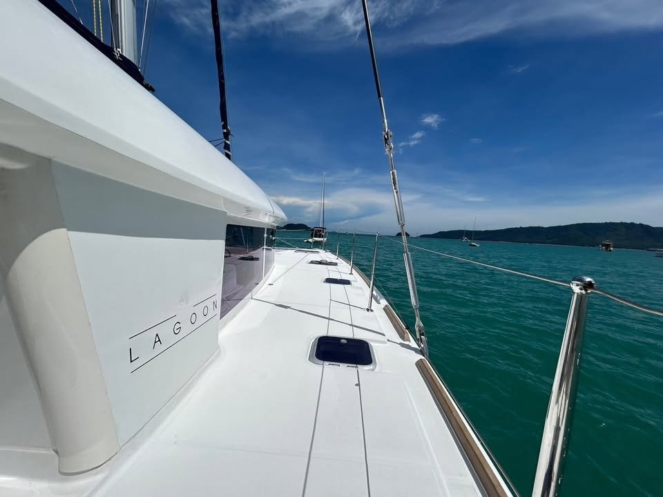 Lagoon 400 S2는 최적의 편안함을 제공하도록 설계된 우아하고 넓은 크루징 쌍동선입니다. 길이 11.97m, 너비 7.25m의 이 보트는 넓은 실내외 생활 공간과 안전한 항해를 위한 최신 장비를 갖추고 있습니다.