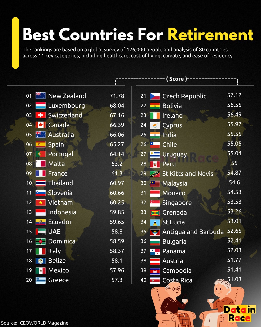 이 이미지는 **“은퇴 후 살기 좋은 나라 순위(Best Countries for Retirement)”**를 보여주는 인포그래픽입니다. 순위는 126,000명을 대상으로 한 글로벌 설문과 80개국에 대한 분석을 기반으로 했으며, 의료, 물가, 기후, 거주 용이성 등 11개 항목을 종합해 평가했다고 합니다. 출처는 CEOWORLD Magazine입니다.
