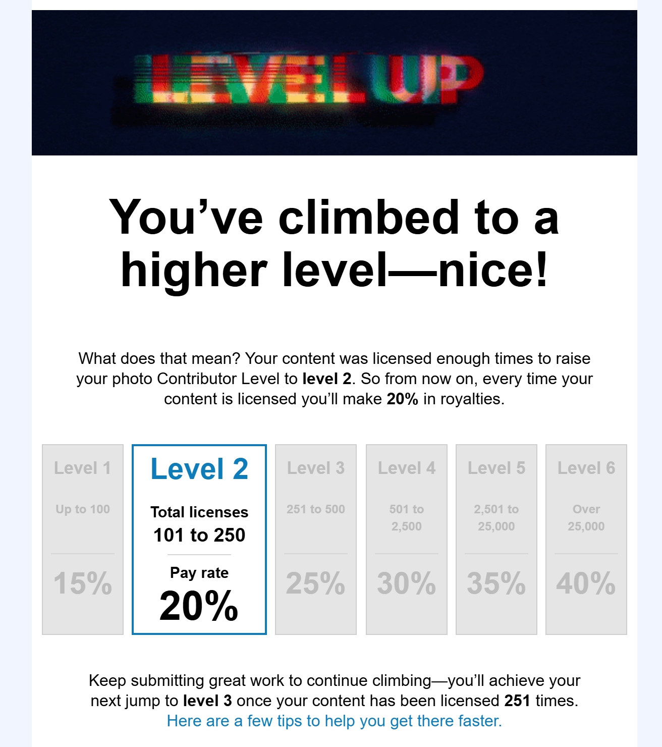 What does that mean? Your content was licensed enough times to raise your photo Contributor Level to level 2. So from now on, every time your content is licensed you’ll make 20% in royalties.