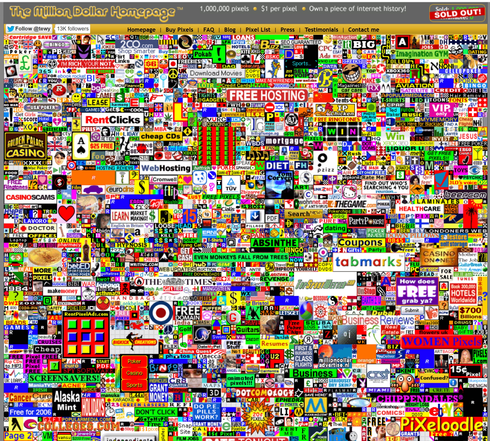 Million Dollar Homepage는 2005년에 영국 대학생 알렉스 투(Alex Tew)가 만든 전설적인 인터넷 사이트입니다. 이 사이트는 1000x1000 픽셀의 그리드를 판매하여, 픽셀당 $1에 총 100만 픽셀 = 100만 달러를 벌어들이는 아이디어로 유명합니다.