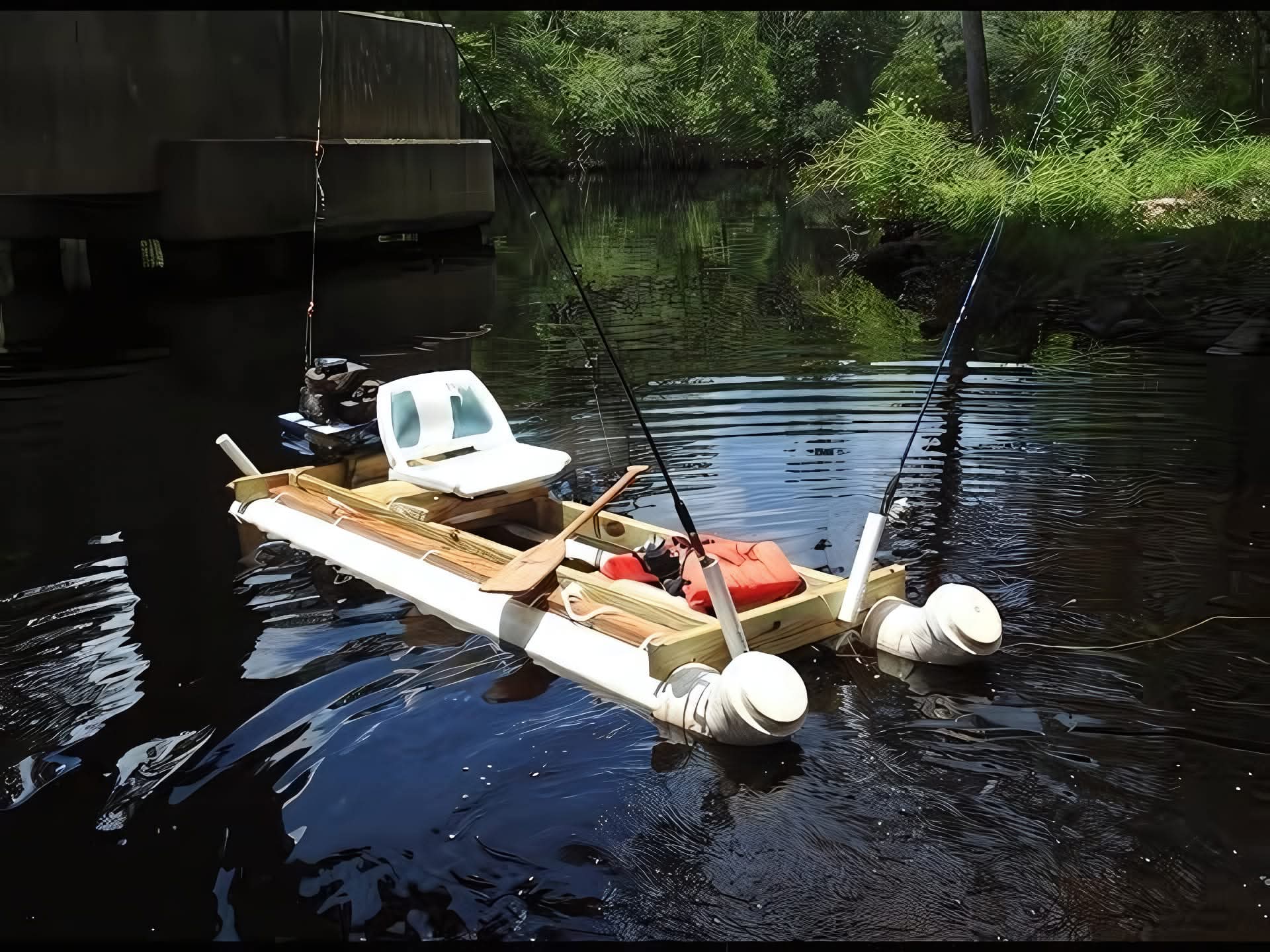 이 사진 속 카약(또는 즉석 뗏목)은 DIY 방식으로 제작된 자작 낚시용 뗏목입니다. 부력 확보를 위해 PVC 파이프를 사용하고, 상판은 목재로 구성되어 있으며, 낚시 의자와 모터, 로드홀더 등 실용적인 장비도 탑재되어 있습니다.