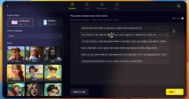 영상 비율은 16대 9로 설정하고, 언어는 한국어, 스타일은 리얼레스틱으로 선택하여 진행한다 .