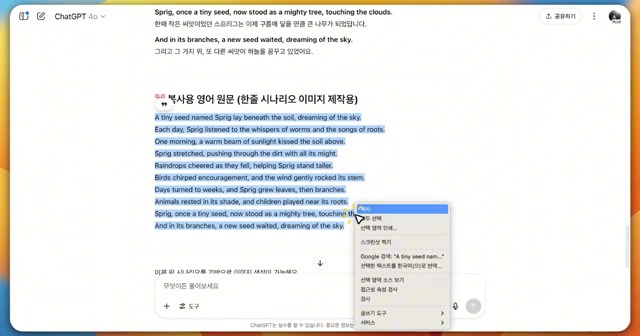 '작은 씨앗이 거대한 나무로 자라는 성장 이야기'라는 스토리를 선택하여 요청한 결과, 시나리오와 캐릭터의 모습 등 구체적인 설정이 제시된다 .