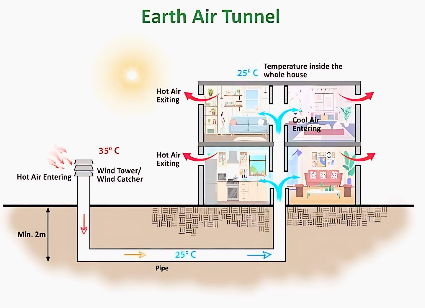 * Heat Exchange: As the hot air from the outside travels through this buried pipe, it exchanges heat with the cooler surrounding earth. The diagram shows the air temperature inside the pipe stabilizing to 25°C.