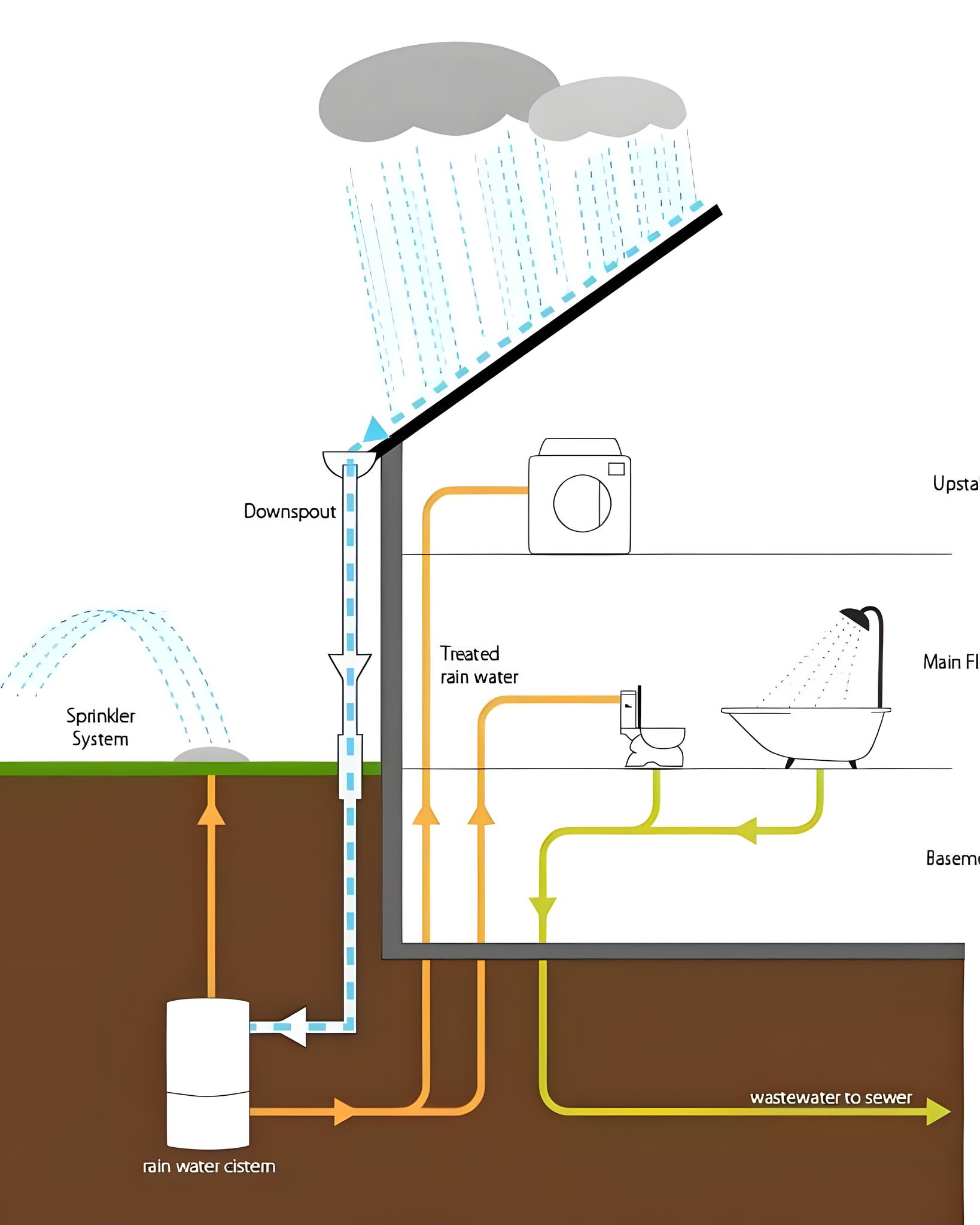 빗물 수확 시스템은 지붕이나 기타 표면에서 빗물을 모아 저장하고, 필요에 따라 다양한 용도로 활용할 수 있도록 설계된 시스템입니다. 그림에서 보이는 것처럼, 크게 빗물 집수, 여과, 저장, 그리고 분배의 네 가지 주요 단계로 구성됩니다.