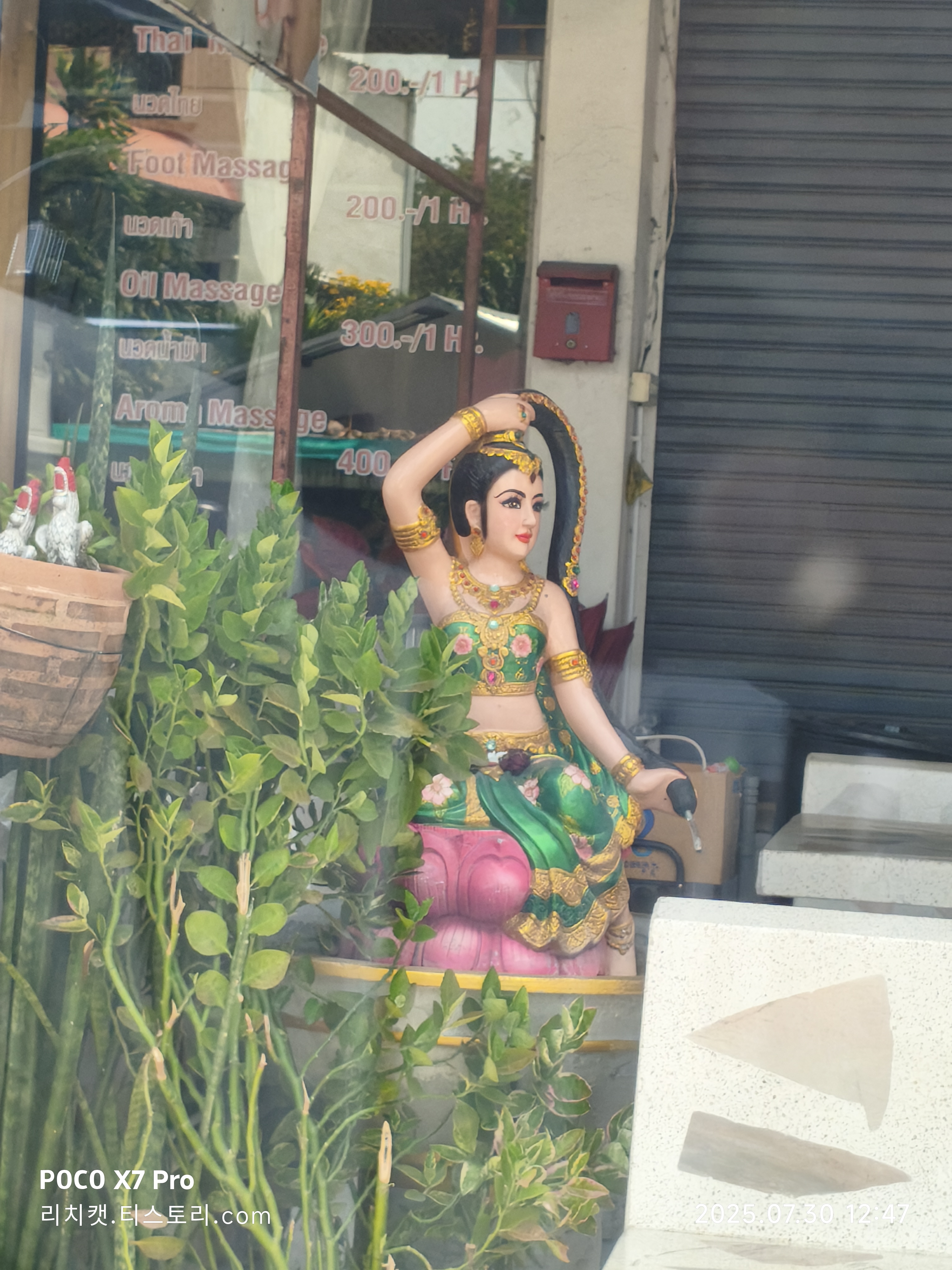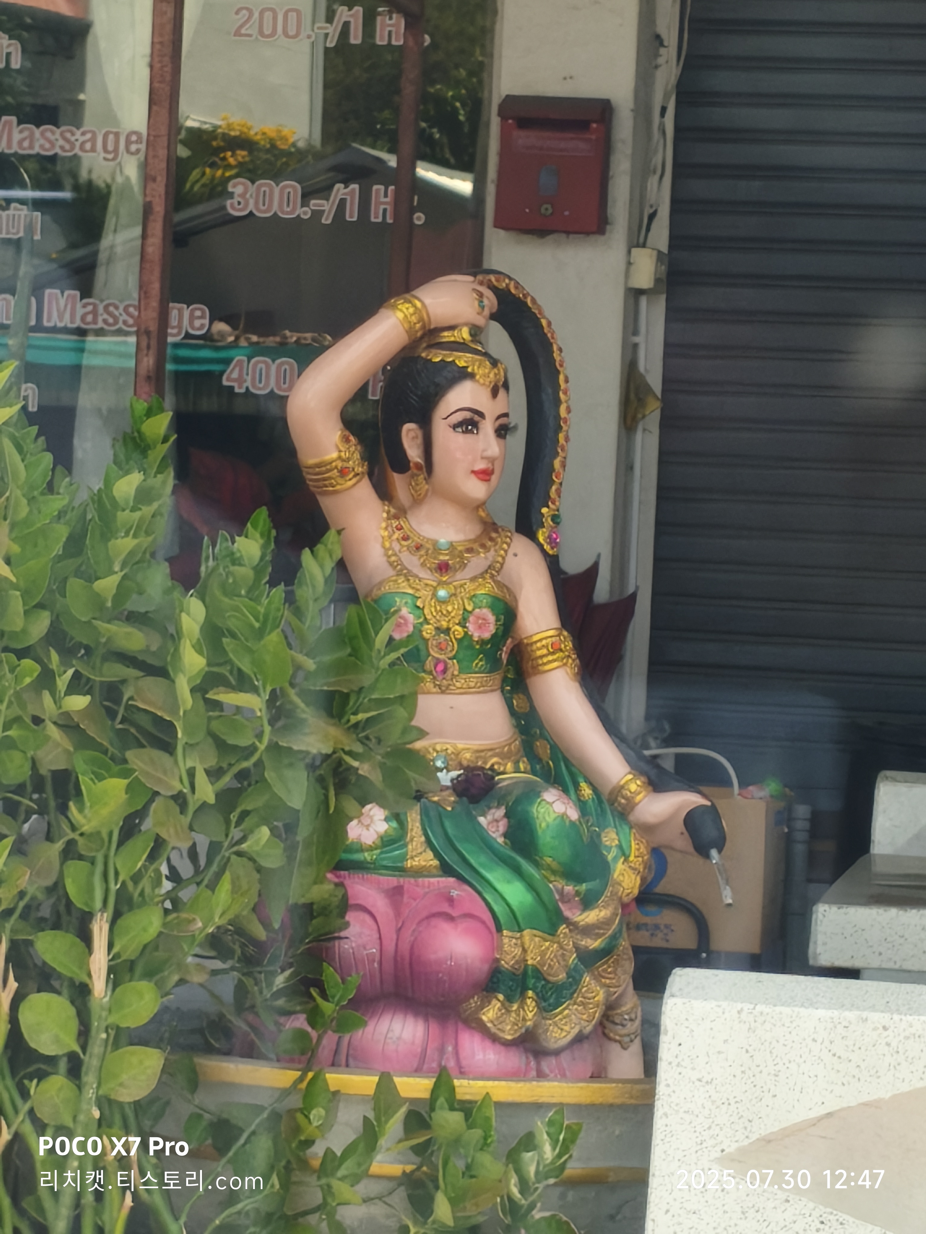 따라서 이 동상은 태국 전통문화에서 행운·보호·번영의 상징이자 사원, 사업장 등지에서 자주 만나는 '프라 메 토라니' 여신상입니다.