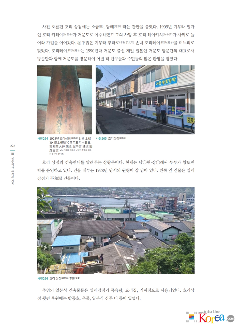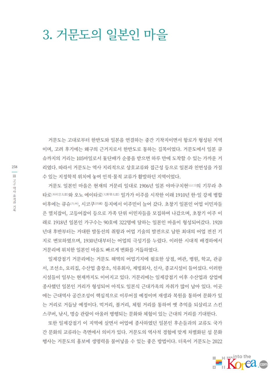 - 일본인 마을은 1900년대 초반부터 거문도 고도 지역에 형성되었으며, 일제강점기 동안 어업 및 행정 중심지 역할을 맡았습니다.