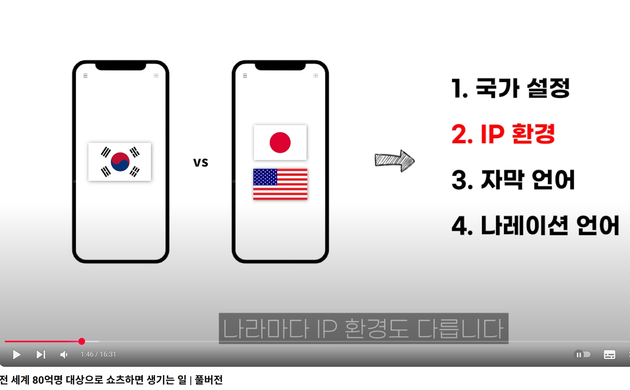 한국 채널과 달리, 해외 채널은 국가별 설정, IP 환경 차이와 자막 및 나레이션 언어가 서로 다르다 .