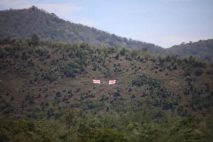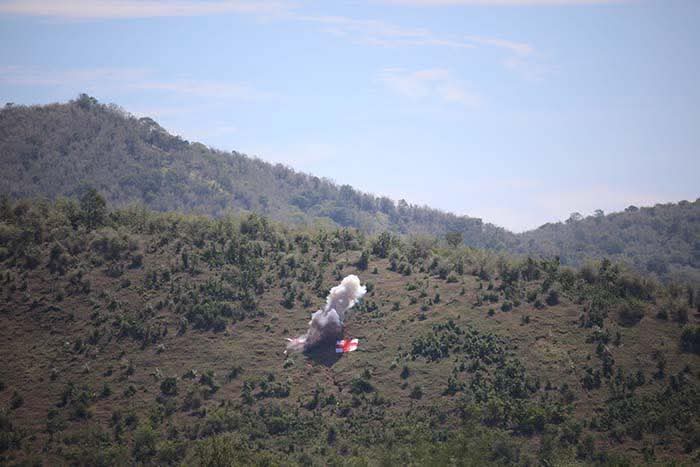 태국 최초! 2023년 7월, DP16 무인 항공기(UCAV)가 탄두가 없는 실탄 레이저 유도 폭탄(LGB)을 시험하는 사진입니다.
