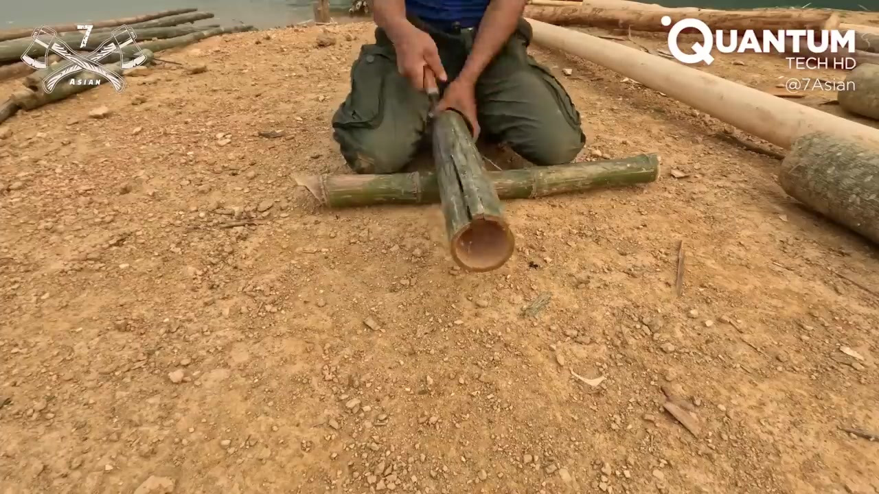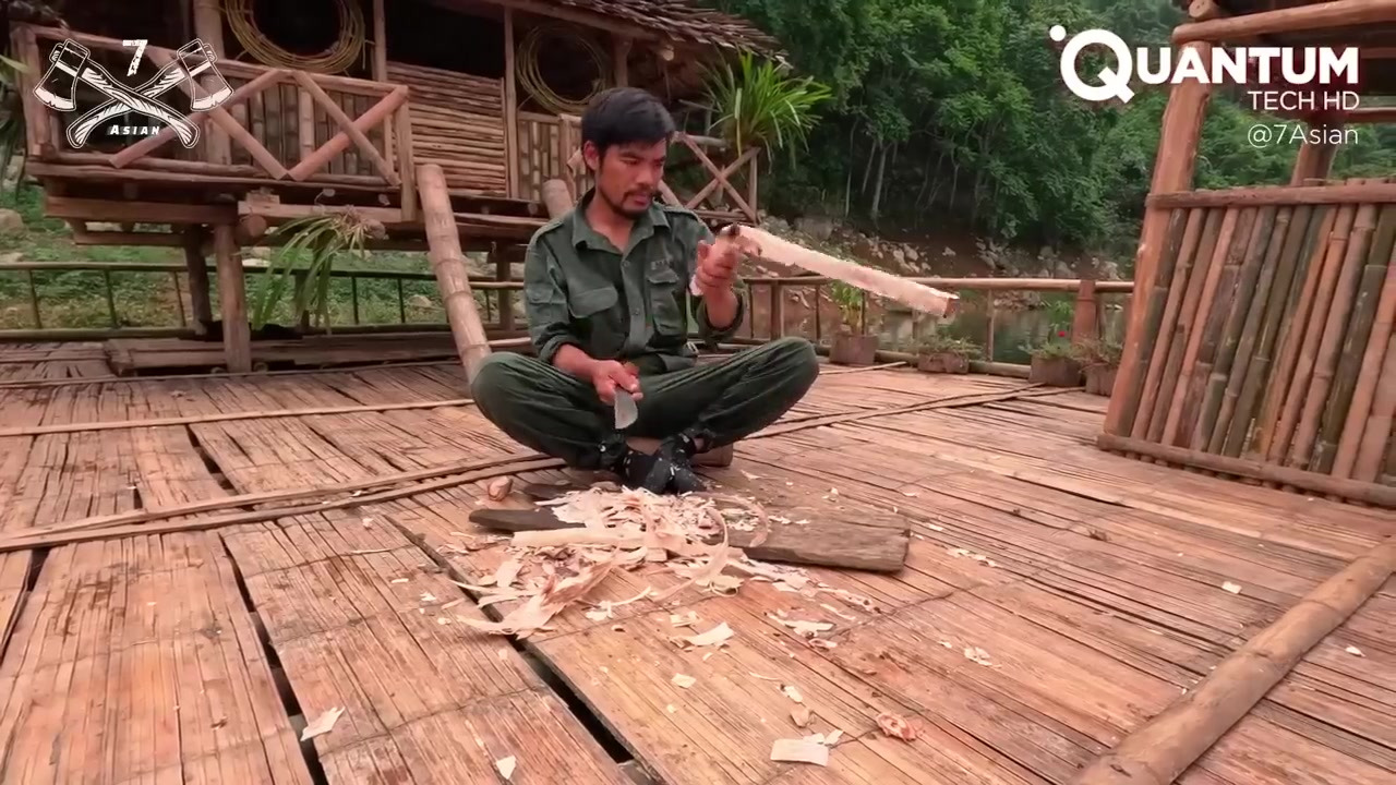 목재 가공: 수상 기초가 마련된 후, 그는 은신처용 목재를 손으로 깎기 시작함