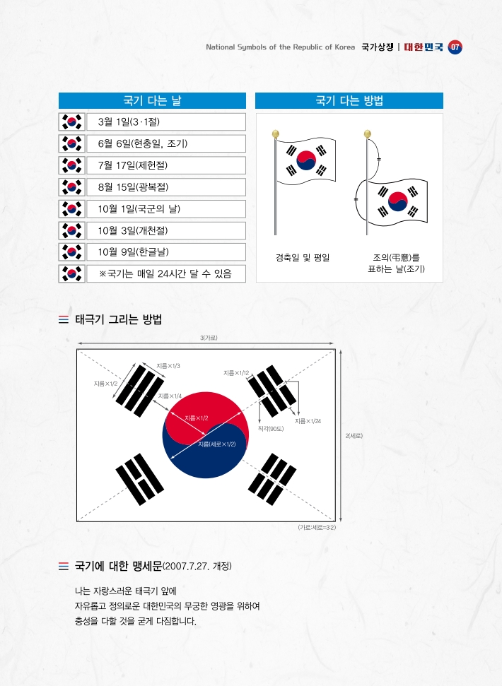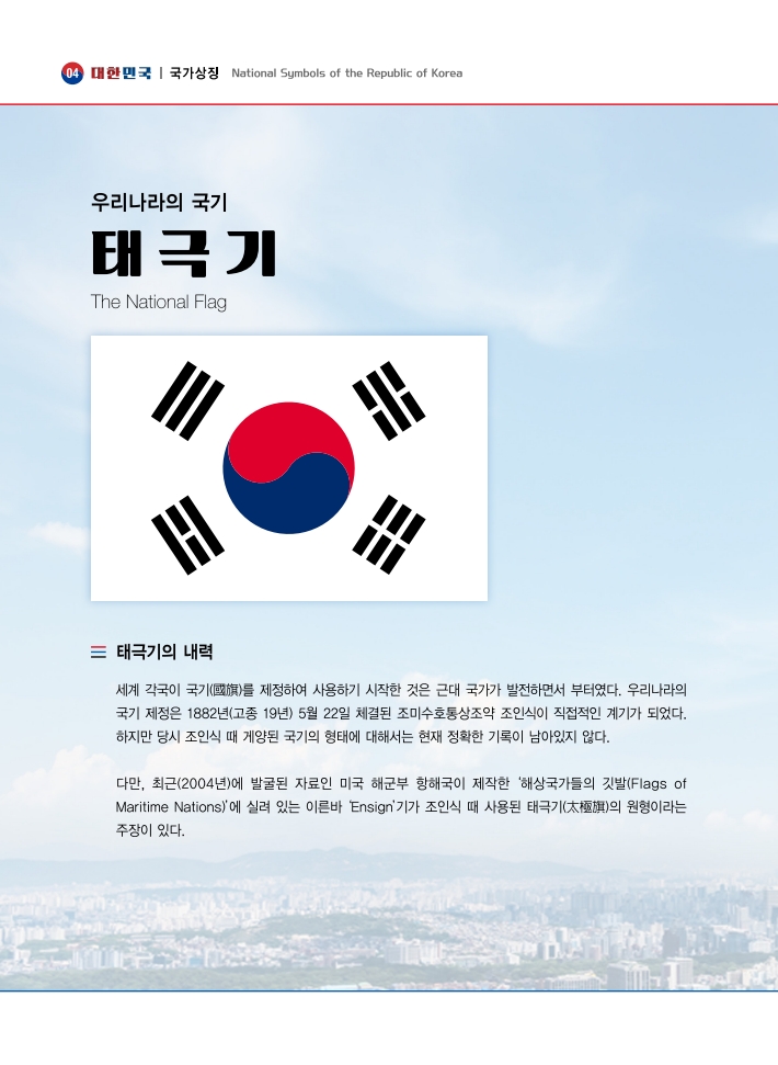 - 내력: 1882년 조미수호통상조약 조인식을 계기로 제정되었으며, 1883년 고종의 왕명으로 국기로 선포되었습니다. 이후 여러 규정을 거쳐 2007년 「대한민국국기법」이 제정되었습니다.