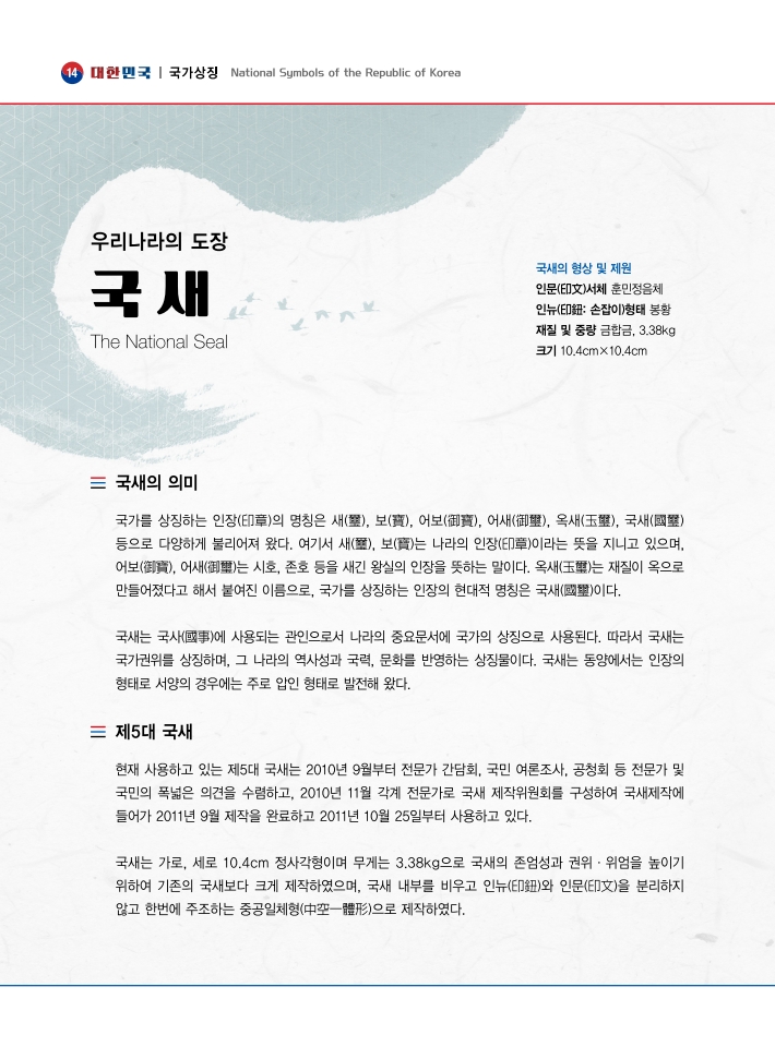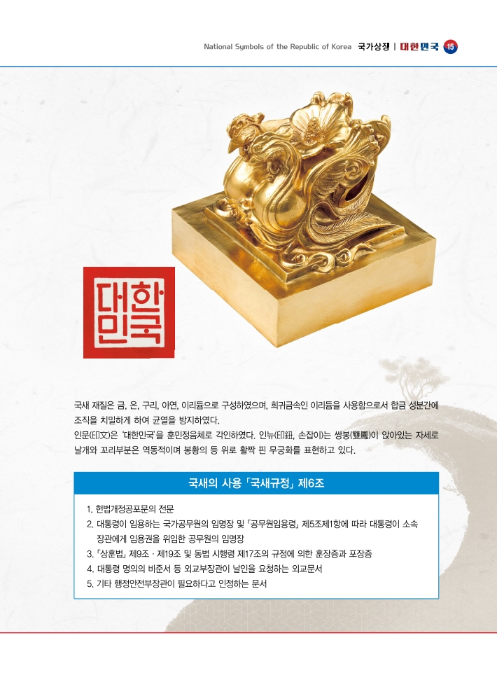 - 의미: 국가의 중요 문서에 국가 상징으로 사용하는 관인으로, 국가의 권위와 역사성, 국력을 반영합니다.