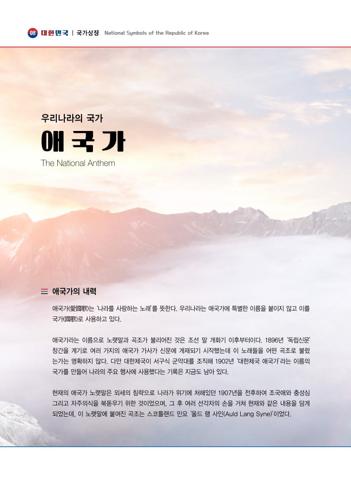 - 내력: 1907년 전후 조국애와 자주의식을 북돋우기 위해 노랫말이 만들어졌으며, 초기에는 스코틀랜드 민요 '올드 랭 사인' 곡조에 맞춰 불렀습니다.