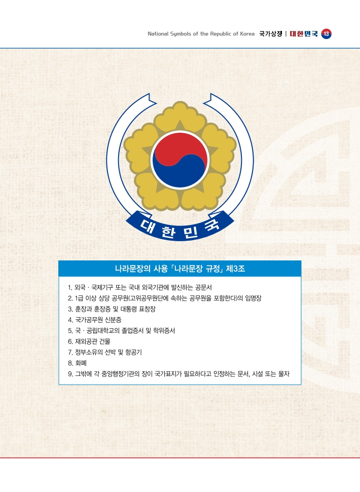 - 사용: 외국 발신 공문서, 훈장, 국가공무원 신분증, 여권, 화폐 등에 대한민국을 상징하는 휘장으로 사용됩니다.