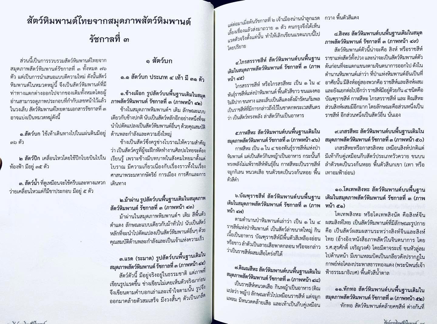 이 책은 고대 야자잎 문서, 경전, 그리고 주로 라마 3세 시대부터 장례 의식에 사용되었던 삼장경에 나오는 태국 문헌 속 동물들을 그리는 방법을 설명합니다. 다양한 힘마판 동물들의 묘사와 그 기원에 대한 역사도 담겨 있습니다.