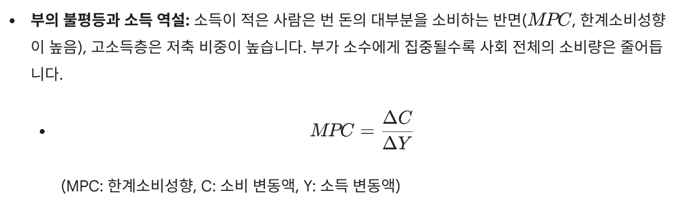 - 부의 불평등과 소득 역설: 소득이 적은 사람은 번 돈의 대부분을 소비하는 반면($MPC$, 한계소비성향이 높음), 고소득층은 저축 비중이 높습니다. 부가 소수에게 집중될수록 사회 전체의 소비량은 줄어듭니다.