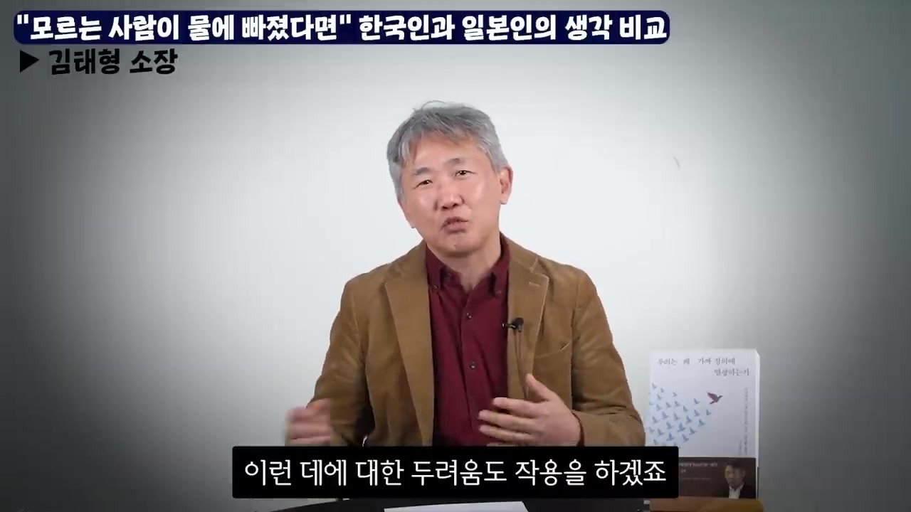 일본인은 집단 처벌이 두려워 발을 구르지만 개인주의자이므로 자발적으로 구하려 하지 않으며, 한국인은 인간 중심주의자이기에 계산 없이 뛰어든다 .
