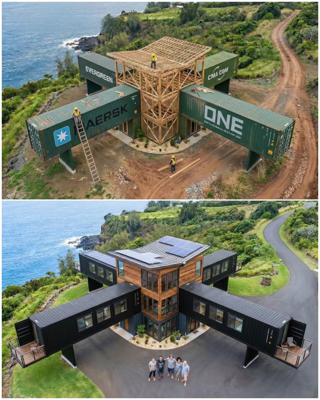 해안 절벽에 마치 바다 위에 아슬아슬하게 자리 잡은 듯한 인상적인 고층 컨테이너 하우스는 탁 트인 전망을 극대화하고 험준한 지형과 조화를 이루는 혁신적인 모듈식 디자인을 보여줍니다. 이러한 스타일의 주택은 일반적으로 40피트(약 12미터) 컨테이너 4개 이상을 십자형이나 별 모양으로 배치하고, 견고한 지지대 위에 캔틸레버 방식으로 돌출시켜 넓은 생활 공간과 드라마틱한 건축미를 구현합니다.