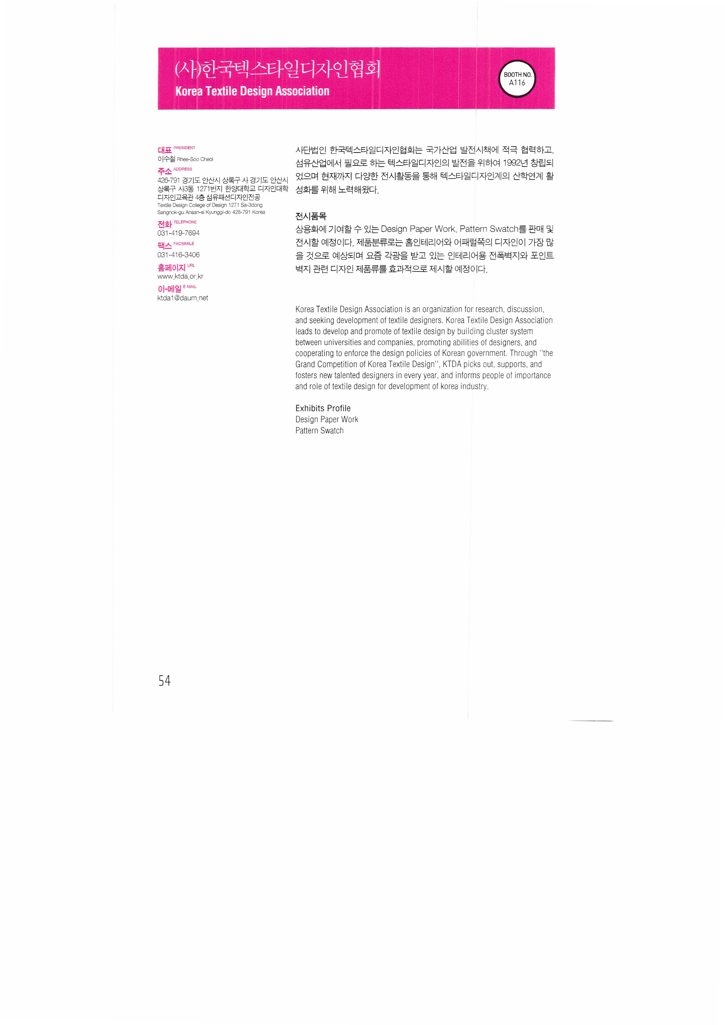 | ㈜에스엠미디어그룹 ㈜에이치알티 ㈜와이피엘 용인송담대학 섬유패션디자인과 ㈜위즈데이타 ㈜윈컴테크 우리애드 ㈜유아이케이 이미지메이킹㈜ 인쇄산업신문 ㈜잉켐테크 제이에스컴 주간인쇄 정보 ㈜칼라월드 코사테크 코스테크㈜ 파랑테크 ㈜필립하이스텍 한국스크린인쇄공업협회 ㈜한국유니콤 (사)한국텍스타일디자인협회 한양대학교 대학원 섬유패션디자인전공 현대캔버스 |