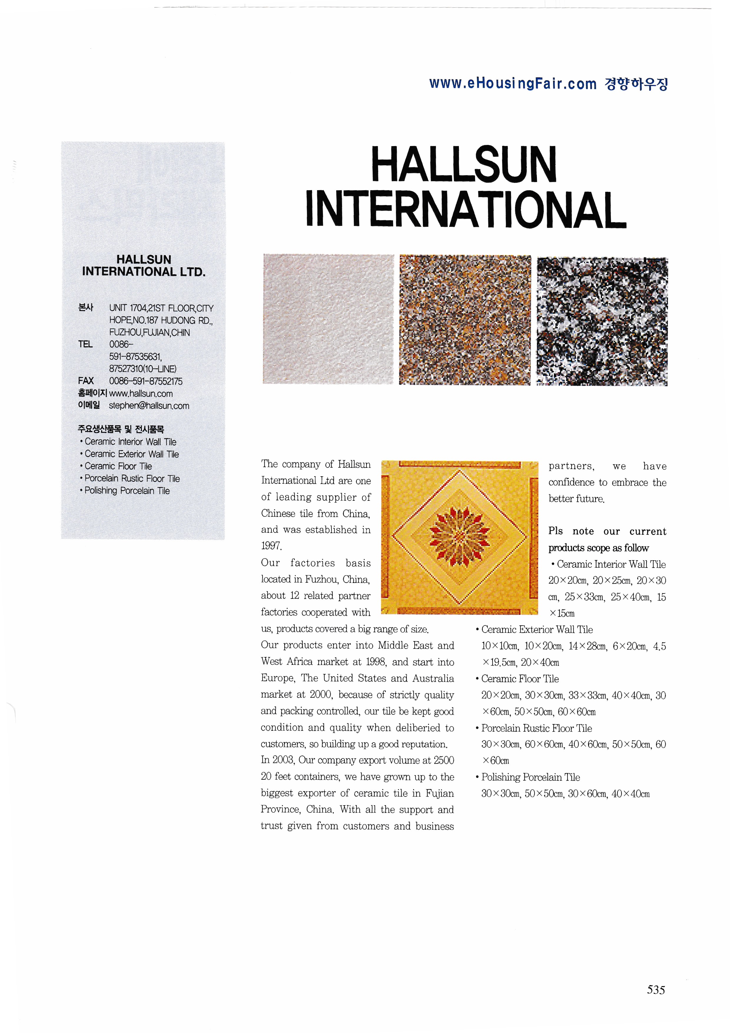 Kona Housing Korea Housing Korea Technology Comedy Clean ceramic Clay Max Tiger Stone Taesung Taewon Timber Taeil System Terraco Korea Toylon Total Stone Industry Faldo Wood Industry Paint House/Woojin Pyeongan Stone Foshan Trade Pungsan Floor Fresco Deco Prix Plasco Union Flora Korea Pio Enterprise Hanicell Hana Corporation Korean Folklore Korea Non-combustibles Korea Weber Korea G&C Korea Homica Hansol Home Deco Hanwha Chemical Hanmin International Chemistry Haein Business Hyunsung General Timber Hyejong Construction Hongsung Industry Ocher country Ocher world Huentech Earthen castle BISAZZA MOSAICO LIMITED Dalian Qisheng Stone Materials & Construction Co., Ltd. EL ALFY Evergreen Building Product Association Global Decking Guangzou Metals & Minerals IMP. & EXP. LTD Hallsun International LTD. JAPAN CERAMICS JiangYin Litai Decorative Materials CO.,LTD. LG Chemical |