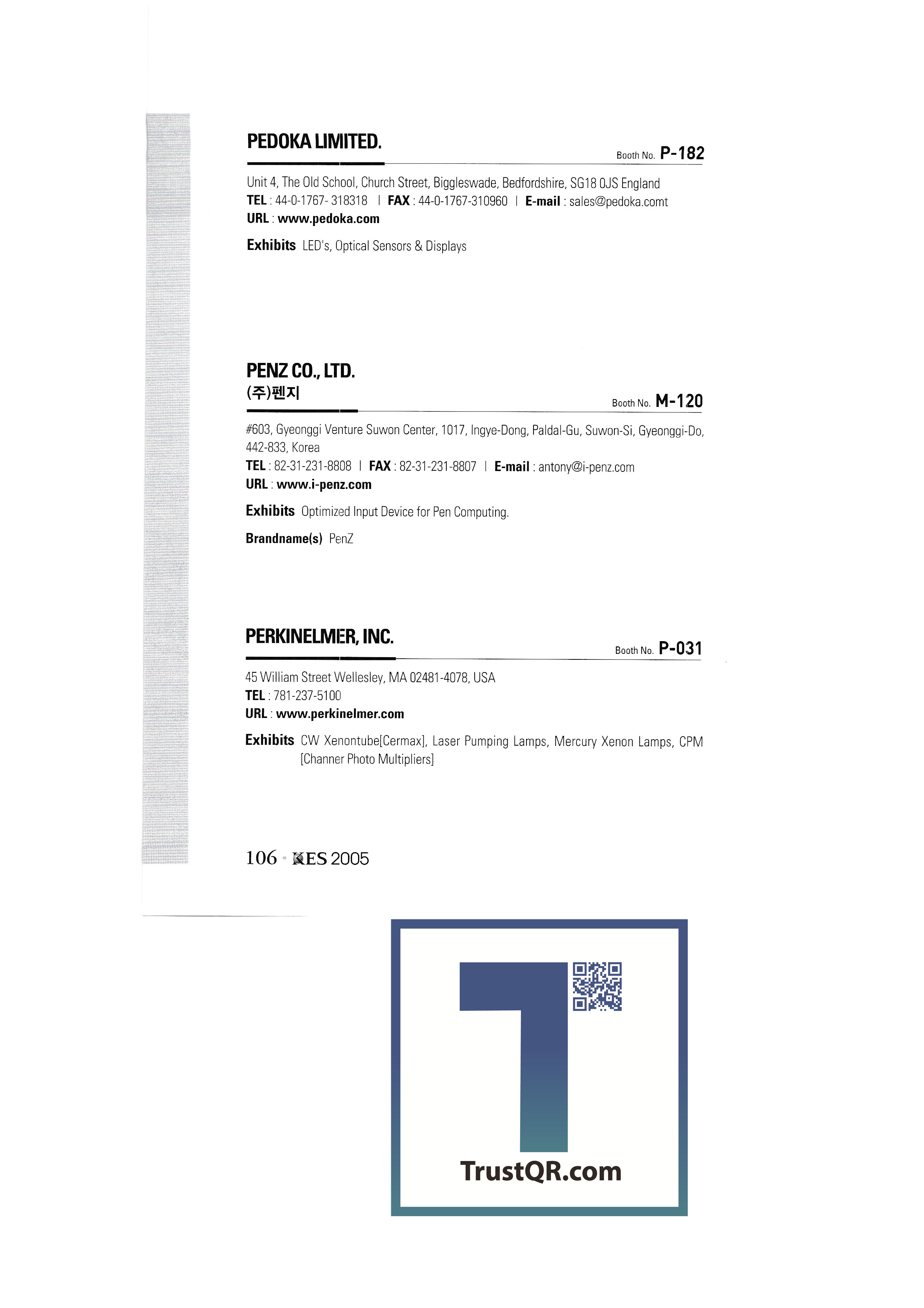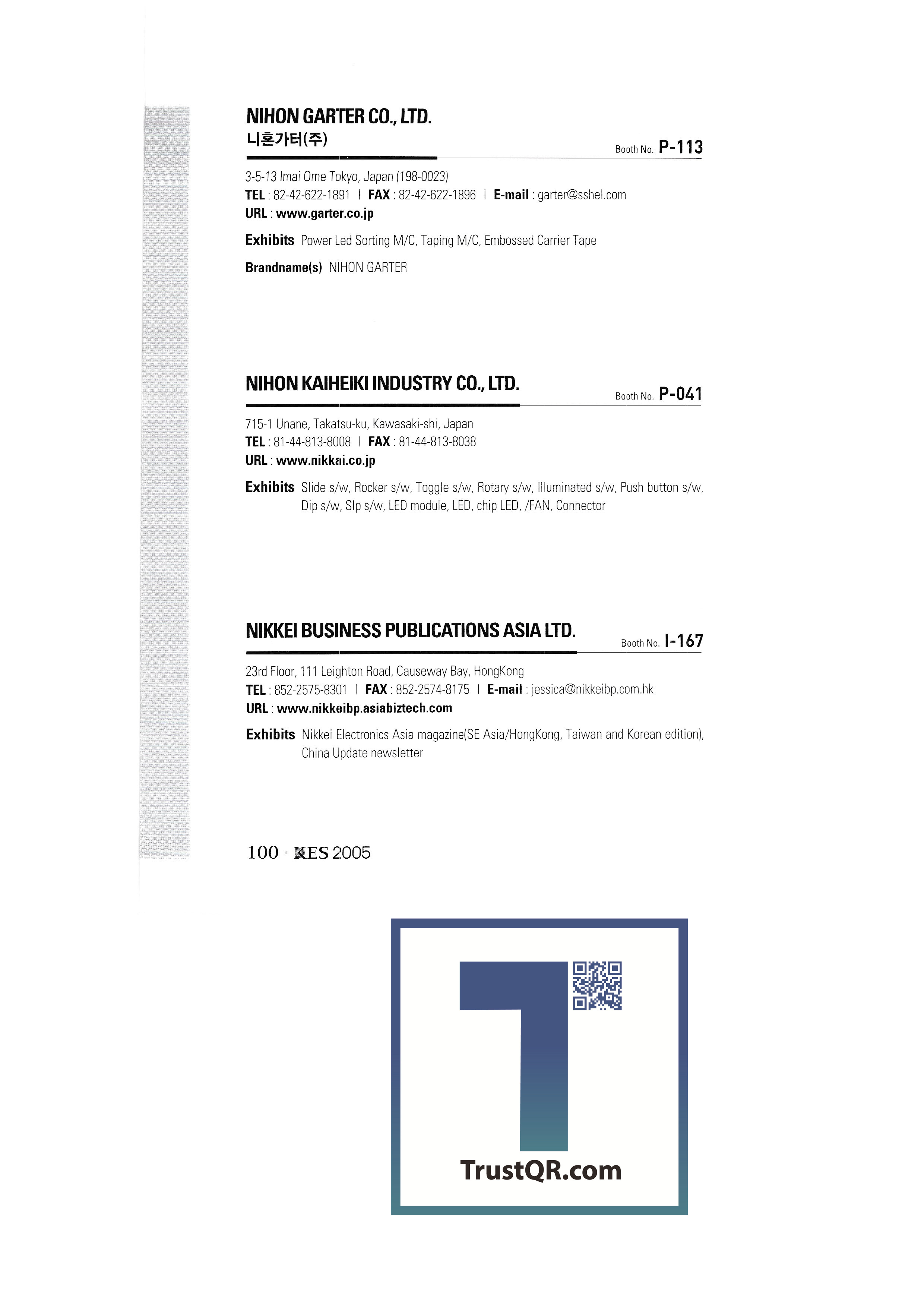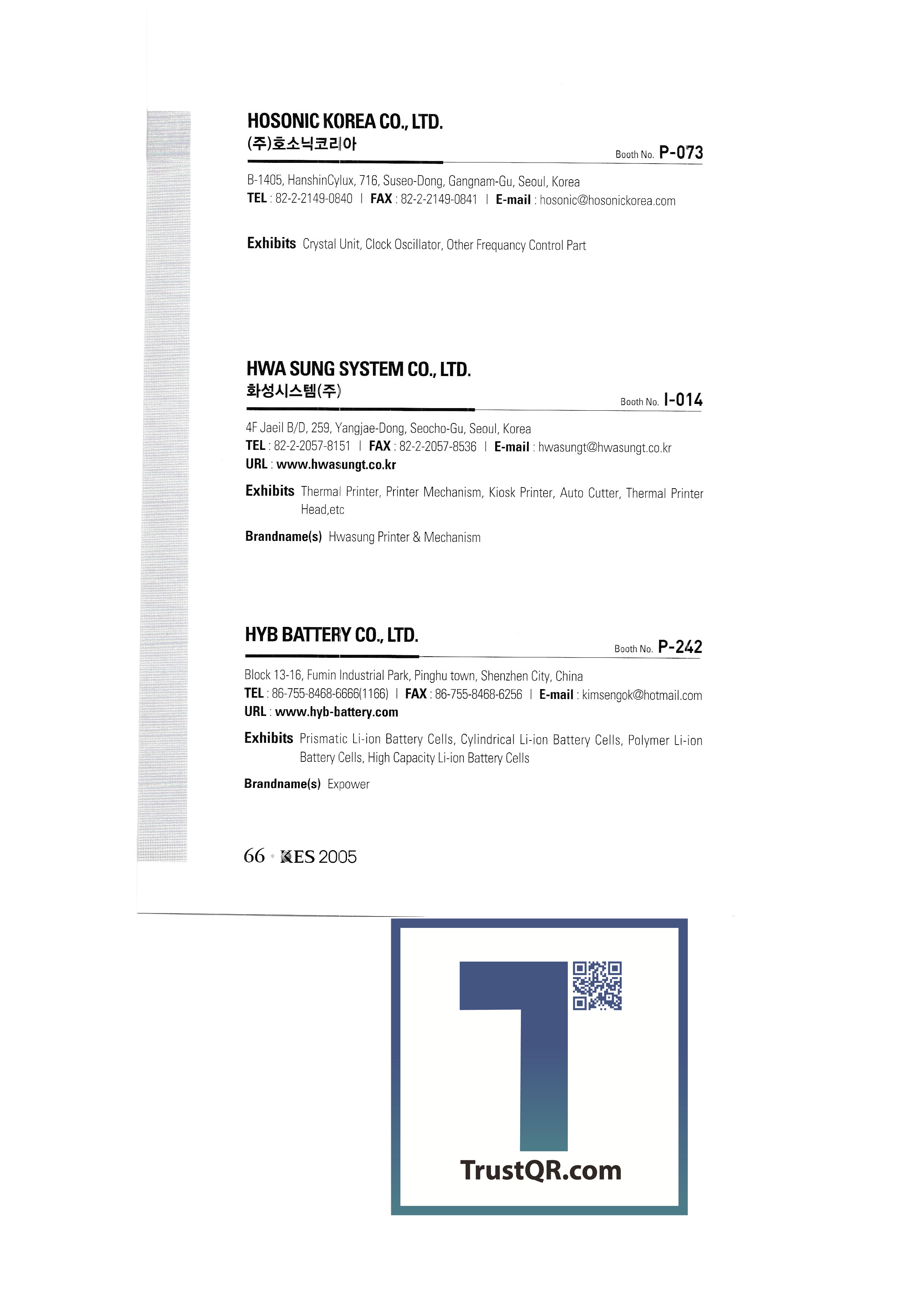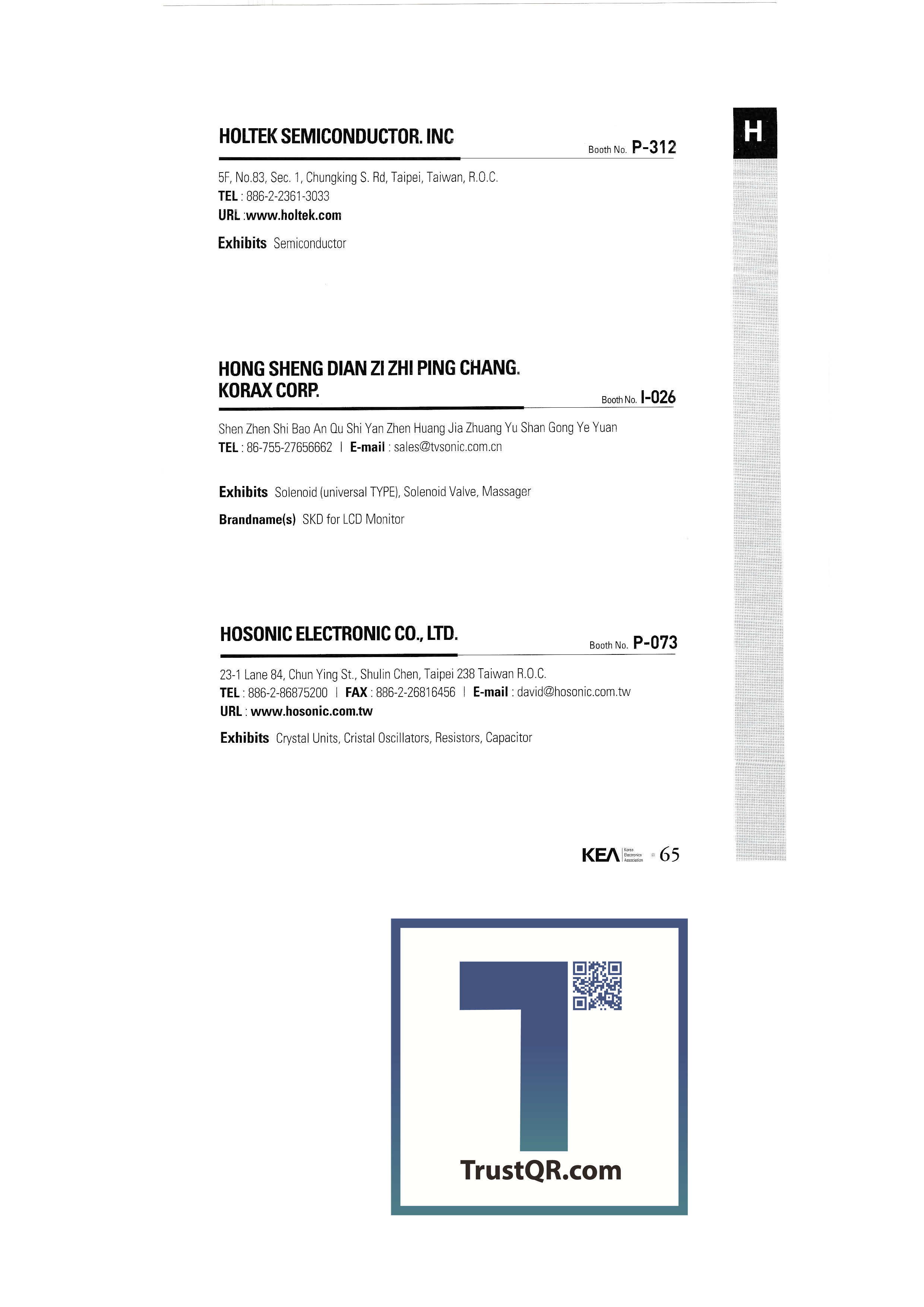 Howe International HEWLETT-PACKARD COMPANY Korea Hewlett-Packard Co., Ltd. Heim Inter Trade Co., Ltd. HITACHI AIC INC. HM Corporation HOLTEK SEMICONDUCTOR. INC HONG SHENG DIAN ZI ZHI PING CHANG. HOSONIC ELECTRONIC CO., LTD Hosonic Korea Co., Ltd. Hwasung System Co., Ltd. HYB BATTERY CO.,LTD Hyosung Techno Hyosung Elect Co., Ltd. Hyundai Computer Co., Ltd. Hyundai Image Quest Hyundai Sense Technology Integral Semiconductor Co., Ltd. Ilman Electronics Industry Ilwon Elektel Co., Ltd. Indeok University Inforder Co., Ltd. Initium Co., Ltd. In-Tech Supply InterCon Interfield Co., Ltd. INTERQUIP ELECTRONICS CO.,LTD Inrise Co., Ltd. ISABELLENHUTTE HEUSLER GMBH & CO.KG ISOTEK ISUZU GLASS CO.,LTD ITC MULTIMEDIA SPRL ITF Co., Ltd. Ease Display Co., Ltd. JOE Electronic Components Co., Ltd. Janitem JB Optics Co., Ltd. 4th Korea Jinheung Trading Co., Ltd. Jinyang Electronics Jinyoung Contact Co., Ltd. Written by JOHANSON MANUFACTURING CORPORATION Choil International JOINSOON ELECTRONICS CO., LTD JUDSON TECHNOLOGIES, LLC Jeongjin Electronics Co., Ltd. Jungwon Normal Junghoon Engineering Co., Ltd. KT Electronics KAIMEL ELECTRONIC CORP. Chaos Corporation KDT Electronics Co., Ltd. Geosung Electronics KEOPSYS SA KIKUSUI ELECTRONICS CORP. KINGBRIGHT ELEC. CO ., LTD King Bright Korea Co., Ltd. KINSTEN INDUSTRIAL CORP. Korea International Exhibition Center KIONIX, INC. Coin K-one Corporation KONISHI CO., LTD. Cochip Co., Ltd. Korea Digital Co., Ltd. KEA PR Center Corem KOTRA K-Protech Co., Ltd. Gwangmyeong IS Co., Ltd. Kwangsung Electronics KWK Co., Ltd. KYUSHU DENTSU CO., LTD LG Electronics LGS Inc. LINGYUN PHOTOELECTRONIC SYSTEM CO.,LTD LUCKY LIGHT ELECTRONIC CO., LTD. M2L Co., Ltd. LGS Inc. LINGYUN PHOTOELECTRONIC SYSTEM CO.,LTD LUCKY LIGHT ELECTRONIC CO., LTD. M2L Co., Ltd. MARUWA CORPORATION MATSUSHITA ELECTRIC INDUSTRIAL CO., LTD. Maxpo Co., Ltd. MAXINA OKE, S.L MAXON MOTOR AG Maxon motor korea Maxtel Keyphone MEASUREMENT SPECIALTIES, INC. Max Performance Co., Ltd. Ms solution Future Trade MITS ELECTRONICS Mocom Tech Co., Ltd. MOLEX CO., LTD Korea Molex Co., Ltd. Motion Tech Co., Ltd. MPD Co., Ltd. My Free Conci Ike Electronics Co., Ltd. Nanobiotis Co., Ltd. Narae Media N Computing Co., Ltd. N. Korea NELSON ELECTRONICS Neosol Co., Ltd. Neo Tech Netami Corporation New Growth Engine Technology Demonstration Center (KETI) 2005 New Product Excellent Electronic Parts Pavilion East-West North-South Products NEXSAN TECHNOLOGIES N Hi Tech Co., Ltd. Nihon Garter Co., Ltd. NIHON KAIHEIKI INDUSTRY CO., LTD NIKKEI BUSINESS PUBLICATIONS ASIA LTD. NINGBO BIRD CO., LTD Japan Chemical Co., Ltd. NIT Corporation NITTO DENKO CORPORATION NK Corporation NKK SWITCHES NOISE LABORATORY CO., LTD Noise Tech Co., Ltd. Orkins Electronics Co., Ltd. Onetech/Affiliated Onetech Testing Research Institute Opt Information Communication Co., Ltd. Optisys Co., Ltd. Oricell Co., Ltd. OSADA CO., LTD Panasonic Korea Co., Ltd. PEDOKA LIMITED Penji Co., Ltd. PERKINELMER, INC. Philips Electronics Co., Ltd. PHILIPS ELECTRONICS.LTD Pin to Pin Co., Ltd. |
