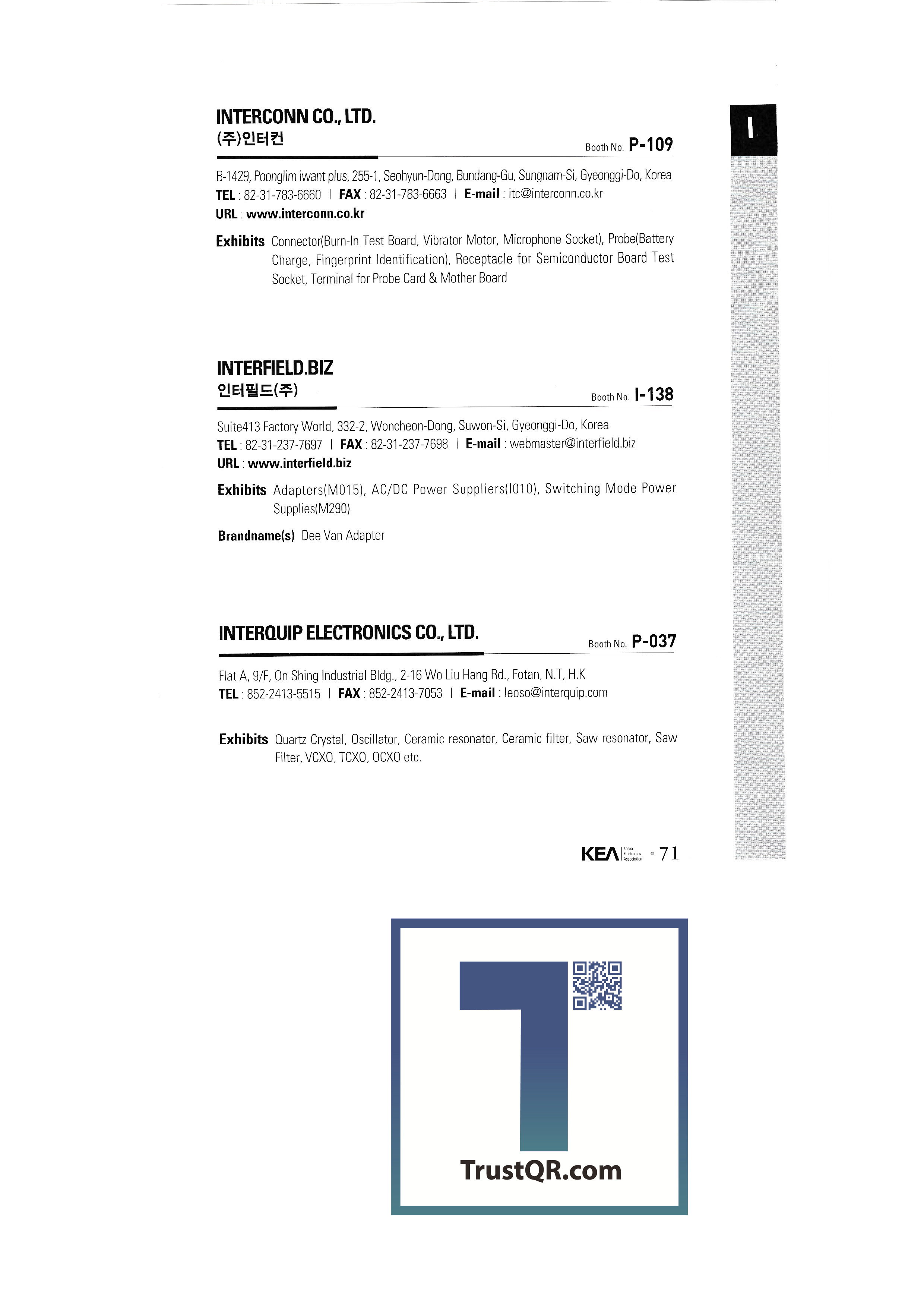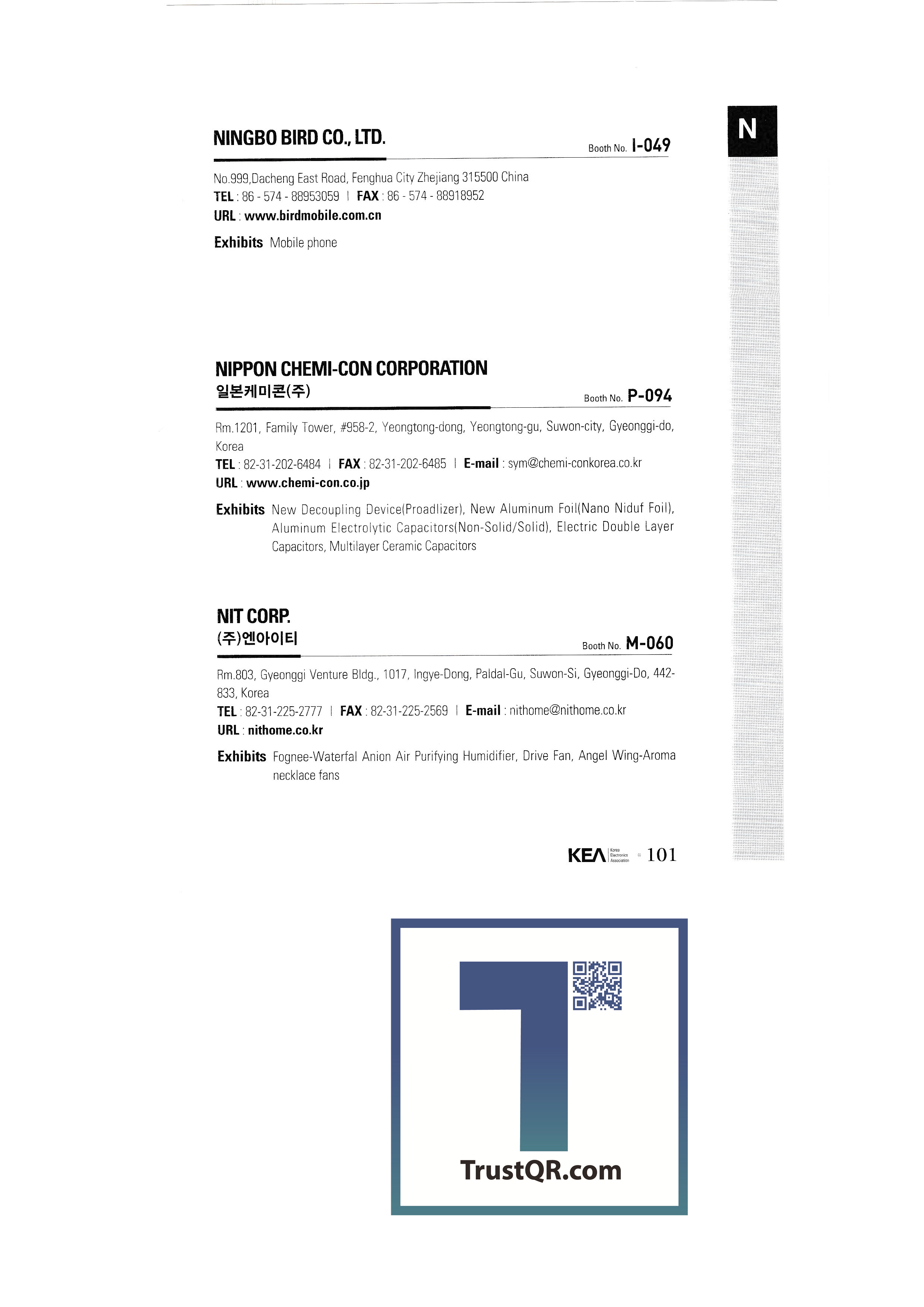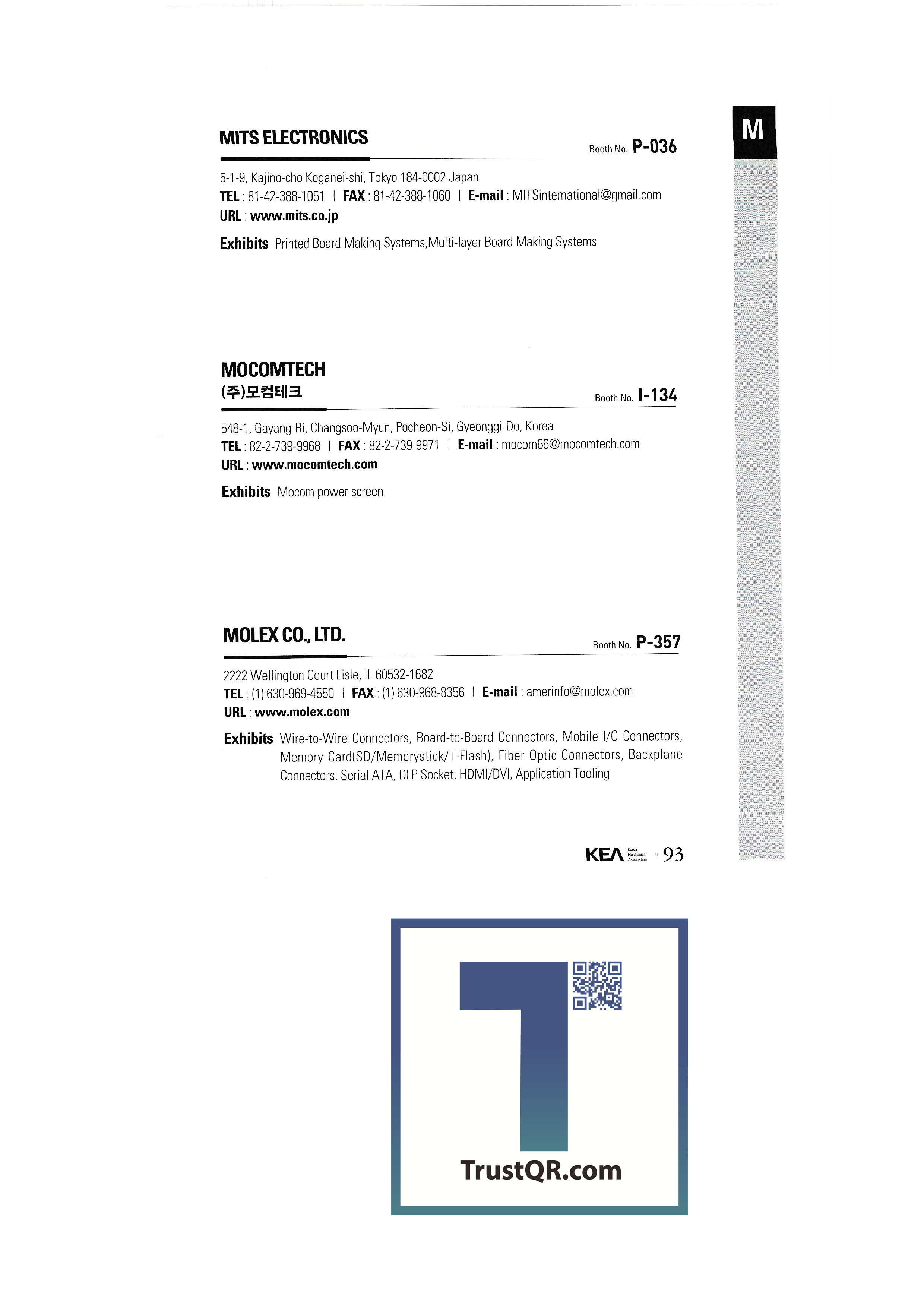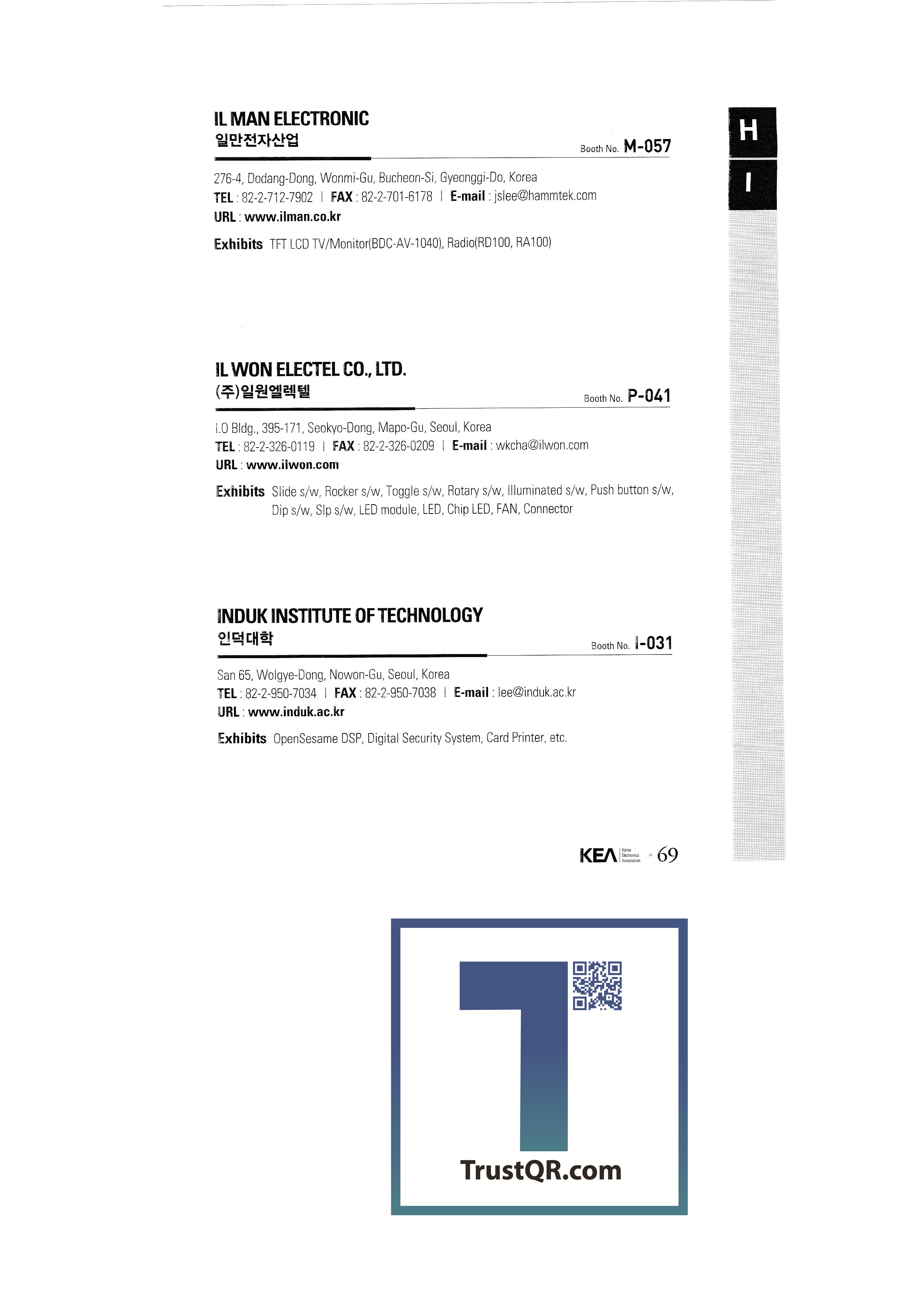 Howe International HEWLETT-PACKARD COMPANY Korea Hewlett-Packard Co., Ltd. Heim Inter Trade Co., Ltd. HITACHI AIC INC. HM Corporation HOLTEK SEMICONDUCTOR. INC HONG SHENG DIAN ZI ZHI PING CHANG. HOSONIC ELECTRONIC CO., LTD Hosonic Korea Co., Ltd. Hwasung System Co., Ltd. HYB BATTERY CO.,LTD Hyosung Techno Hyosung Elect Co., Ltd. Hyundai Computer Co., Ltd. Hyundai Image Quest Hyundai Sense Technology Integral Semiconductor Co., Ltd. Ilman Electronics Industry Ilwon Elektel Co., Ltd. Indeok University Inforder Co., Ltd. Initium Co., Ltd. In-Tech Supply InterCon Interfield Co., Ltd. INTERQUIP ELECTRONICS CO.,LTD Inrise Co., Ltd. ISABELLENHUTTE HEUSLER GMBH & CO.KG ISOTEK ISUZU GLASS CO.,LTD ITC MULTIMEDIA SPRL ITF Co., Ltd. Ease Display Co., Ltd. JOE Electronic Components Co., Ltd. Janitem JB Optics Co., Ltd. 4th Korea Jinheung Trading Co., Ltd. Jinyang Electronics Jinyoung Contact Co., Ltd. Written by JOHANSON MANUFACTURING CORPORATION Choil International JOINSOON ELECTRONICS CO., LTD JUDSON TECHNOLOGIES, LLC Jeongjin Electronics Co., Ltd. Jungwon Normal Junghoon Engineering Co., Ltd. KT Electronics KAIMEL ELECTRONIC CORP. Chaos Corporation KDT Electronics Co., Ltd. Geosung Electronics KEOPSYS SA KIKUSUI ELECTRONICS CORP. KINGBRIGHT ELEC. CO ., LTD King Bright Korea Co., Ltd. KINSTEN INDUSTRIAL CORP. Korea International Exhibition Center KIONIX, INC. Coin K-one Corporation KONISHI CO., LTD. Cochip Co., Ltd. Korea Digital Co., Ltd. KEA PR Center Corem KOTRA K-Protech Co., Ltd. Gwangmyeong IS Co., Ltd. Kwangsung Electronics KWK Co., Ltd. KYUSHU DENTSU CO., LTD LG Electronics LGS Inc. LINGYUN PHOTOELECTRONIC SYSTEM CO.,LTD LUCKY LIGHT ELECTRONIC CO., LTD. M2L Co., Ltd. LGS Inc. LINGYUN PHOTOELECTRONIC SYSTEM CO.,LTD LUCKY LIGHT ELECTRONIC CO., LTD. M2L Co., Ltd. MARUWA CORPORATION MATSUSHITA ELECTRIC INDUSTRIAL CO., LTD. Maxpo Co., Ltd. MAXINA OKE, S.L MAXON MOTOR AG Maxon motor korea Maxtel Keyphone MEASUREMENT SPECIALTIES, INC. Max Performance Co., Ltd. Ms solution Future Trade MITS ELECTRONICS Mocom Tech Co., Ltd. MOLEX CO., LTD Korea Molex Co., Ltd. Motion Tech Co., Ltd. MPD Co., Ltd. My Free Conci Ike Electronics Co., Ltd. Nanobiotis Co., Ltd. Narae Media N Computing Co., Ltd. N. Korea NELSON ELECTRONICS Neosol Co., Ltd. Neo Tech Netami Corporation New Growth Engine Technology Demonstration Center (KETI) 2005 New Product Excellent Electronic Parts Pavilion East-West North-South Products NEXSAN TECHNOLOGIES N Hi Tech Co., Ltd. Nihon Garter Co., Ltd. NIHON KAIHEIKI INDUSTRY CO., LTD NIKKEI BUSINESS PUBLICATIONS ASIA LTD. NINGBO BIRD CO., LTD Japan Chemical Co., Ltd. NIT Corporation NITTO DENKO CORPORATION NK Corporation NKK SWITCHES NOISE LABORATORY CO., LTD Noise Tech Co., Ltd. Orkins Electronics Co., Ltd. Onetech/Affiliated Onetech Testing Research Institute Opt Information Communication Co., Ltd. Optisys Co., Ltd. Oricell Co., Ltd. OSADA CO., LTD Panasonic Korea Co., Ltd. PEDOKA LIMITED Penji Co., Ltd. PERKINELMER, INC. Philips Electronics Co., Ltd. PHILIPS ELECTRONICS.LTD Pin to Pin Co., Ltd. |