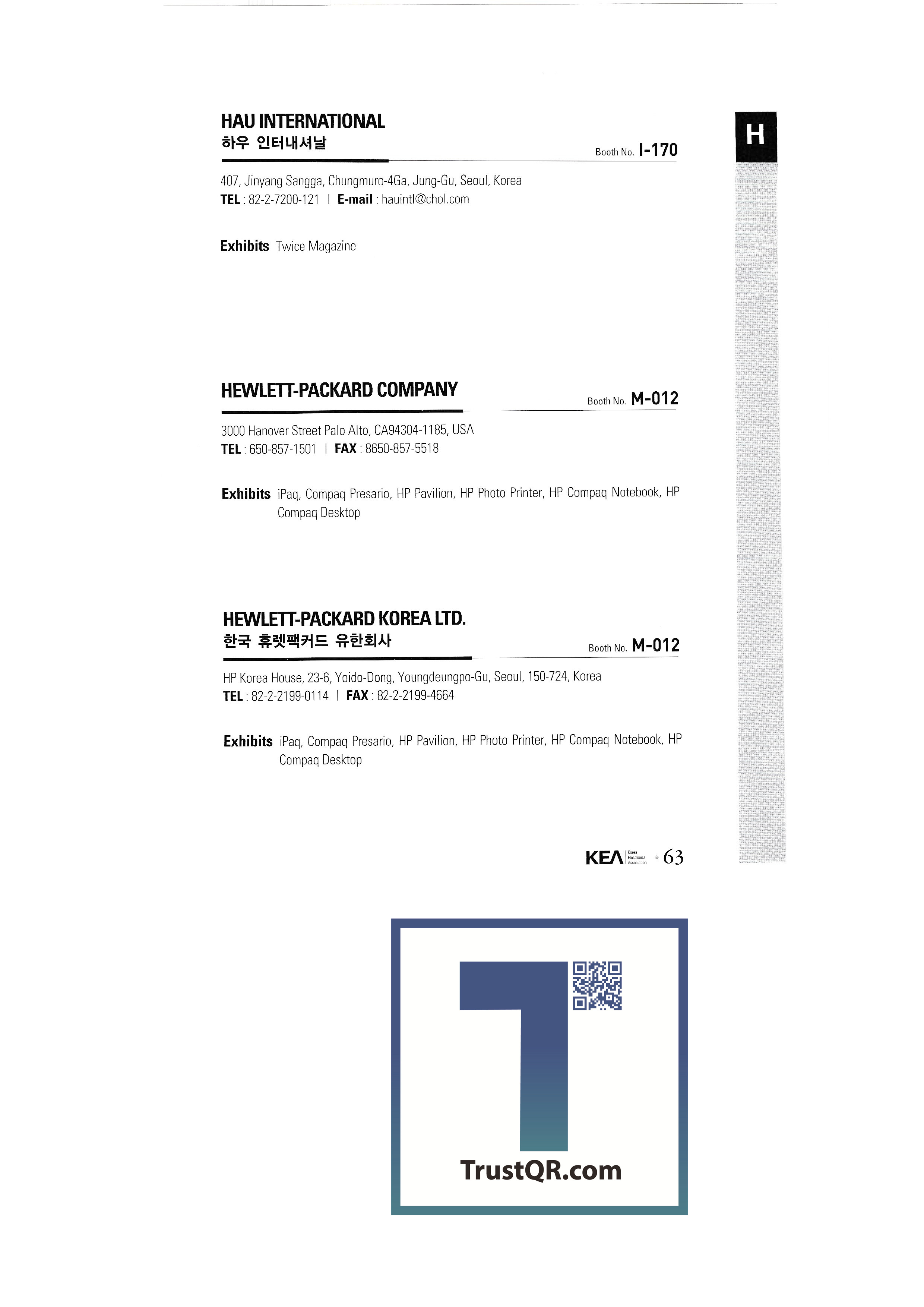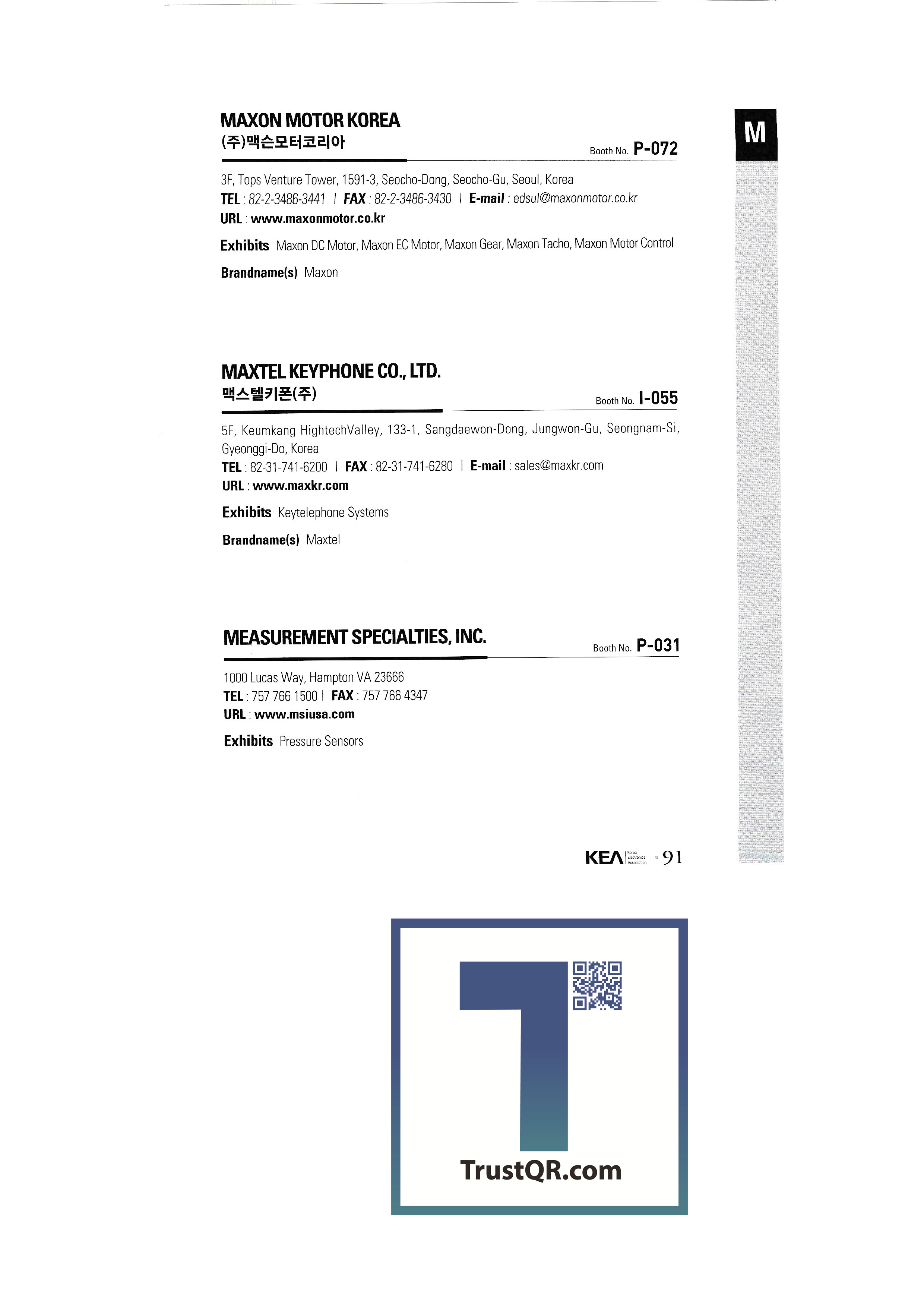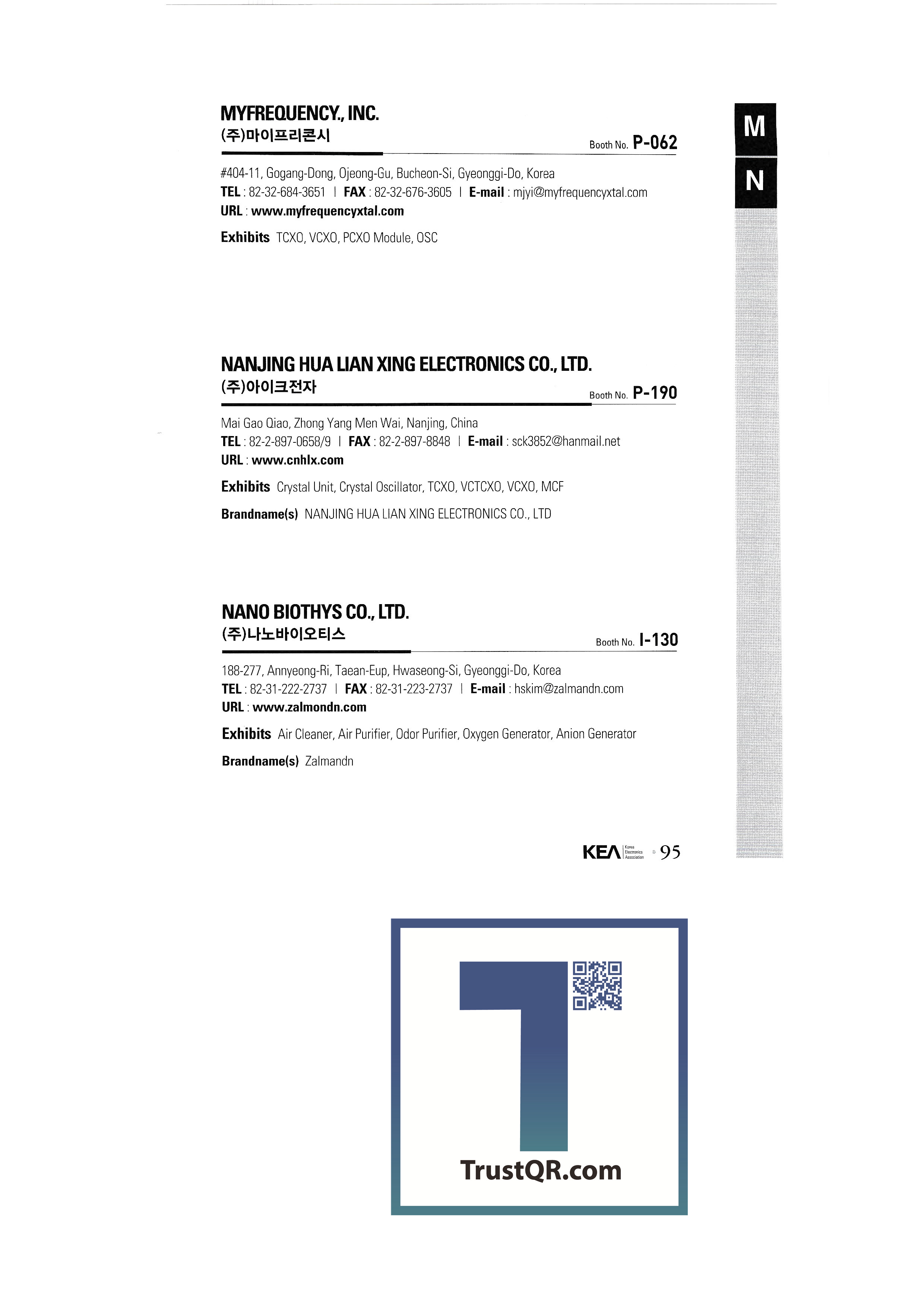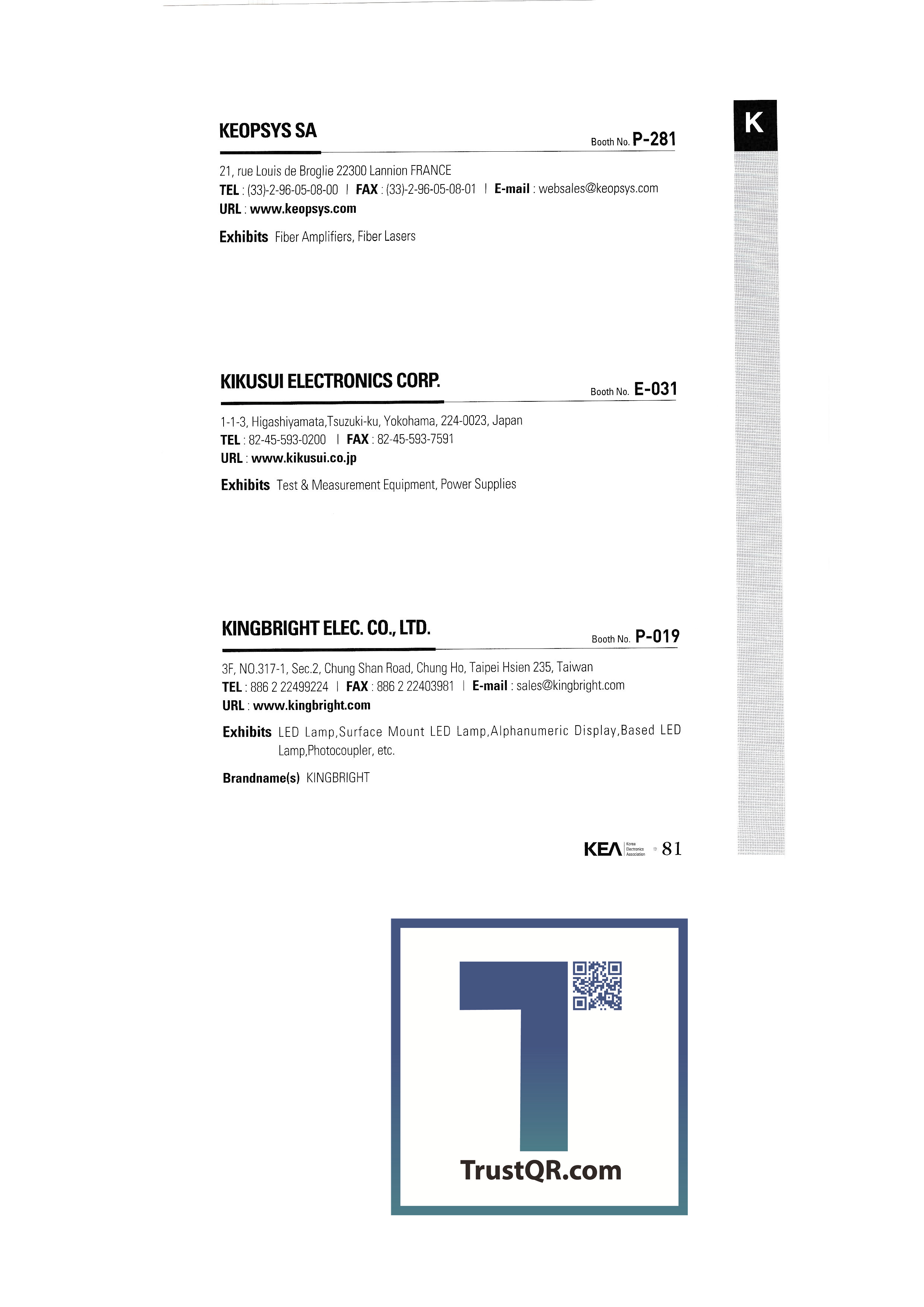 Howe International HEWLETT-PACKARD COMPANY Korea Hewlett-Packard Co., Ltd. Heim Inter Trade Co., Ltd. HITACHI AIC INC. HM Corporation HOLTEK SEMICONDUCTOR. INC HONG SHENG DIAN ZI ZHI PING CHANG. HOSONIC ELECTRONIC CO., LTD Hosonic Korea Co., Ltd. Hwasung System Co., Ltd. HYB BATTERY CO.,LTD Hyosung Techno Hyosung Elect Co., Ltd. Hyundai Computer Co., Ltd. Hyundai Image Quest Hyundai Sense Technology Integral Semiconductor Co., Ltd. Ilman Electronics Industry Ilwon Elektel Co., Ltd. Indeok University Inforder Co., Ltd. Initium Co., Ltd. In-Tech Supply InterCon Interfield Co., Ltd. INTERQUIP ELECTRONICS CO.,LTD Inrise Co., Ltd. ISABELLENHUTTE HEUSLER GMBH & CO.KG ISOTEK ISUZU GLASS CO.,LTD ITC MULTIMEDIA SPRL ITF Co., Ltd. Ease Display Co., Ltd. JOE Electronic Components Co., Ltd. Janitem JB Optics Co., Ltd. 4th Korea Jinheung Trading Co., Ltd. Jinyang Electronics Jinyoung Contact Co., Ltd. Written by JOHANSON MANUFACTURING CORPORATION Choil International JOINSOON ELECTRONICS CO., LTD JUDSON TECHNOLOGIES, LLC Jeongjin Electronics Co., Ltd. Jungwon Normal Junghoon Engineering Co., Ltd. KT Electronics KAIMEL ELECTRONIC CORP. Chaos Corporation KDT Electronics Co., Ltd. Geosung Electronics KEOPSYS SA KIKUSUI ELECTRONICS CORP. KINGBRIGHT ELEC. CO ., LTD King Bright Korea Co., Ltd. KINSTEN INDUSTRIAL CORP. Korea International Exhibition Center KIONIX, INC. Coin K-one Corporation KONISHI CO., LTD. Cochip Co., Ltd. Korea Digital Co., Ltd. KEA PR Center Corem KOTRA K-Protech Co., Ltd. Gwangmyeong IS Co., Ltd. Kwangsung Electronics KWK Co., Ltd. KYUSHU DENTSU CO., LTD LG Electronics LGS Inc. LINGYUN PHOTOELECTRONIC SYSTEM CO.,LTD LUCKY LIGHT ELECTRONIC CO., LTD. M2L Co., Ltd. LGS Inc. LINGYUN PHOTOELECTRONIC SYSTEM CO.,LTD LUCKY LIGHT ELECTRONIC CO., LTD. M2L Co., Ltd. MARUWA CORPORATION MATSUSHITA ELECTRIC INDUSTRIAL CO., LTD. Maxpo Co., Ltd. MAXINA OKE, S.L MAXON MOTOR AG Maxon motor korea Maxtel Keyphone MEASUREMENT SPECIALTIES, INC. Max Performance Co., Ltd. Ms solution Future Trade MITS ELECTRONICS Mocom Tech Co., Ltd. MOLEX CO., LTD Korea Molex Co., Ltd. Motion Tech Co., Ltd. MPD Co., Ltd. My Free Conci Ike Electronics Co., Ltd. Nanobiotis Co., Ltd. Narae Media N Computing Co., Ltd. N. Korea NELSON ELECTRONICS Neosol Co., Ltd. Neo Tech Netami Corporation New Growth Engine Technology Demonstration Center (KETI) 2005 New Product Excellent Electronic Parts Pavilion East-West North-South Products NEXSAN TECHNOLOGIES N Hi Tech Co., Ltd. Nihon Garter Co., Ltd. NIHON KAIHEIKI INDUSTRY CO., LTD NIKKEI BUSINESS PUBLICATIONS ASIA LTD. NINGBO BIRD CO., LTD Japan Chemical Co., Ltd. NIT Corporation NITTO DENKO CORPORATION NK Corporation NKK SWITCHES NOISE LABORATORY CO., LTD Noise Tech Co., Ltd. Orkins Electronics Co., Ltd. Onetech/Affiliated Onetech Testing Research Institute Opt Information Communication Co., Ltd. Optisys Co., Ltd. Oricell Co., Ltd. OSADA CO., LTD Panasonic Korea Co., Ltd. PEDOKA LIMITED Penji Co., Ltd. PERKINELMER, INC. Philips Electronics Co., Ltd. PHILIPS ELECTRONICS.LTD Pin to Pin Co., Ltd. |