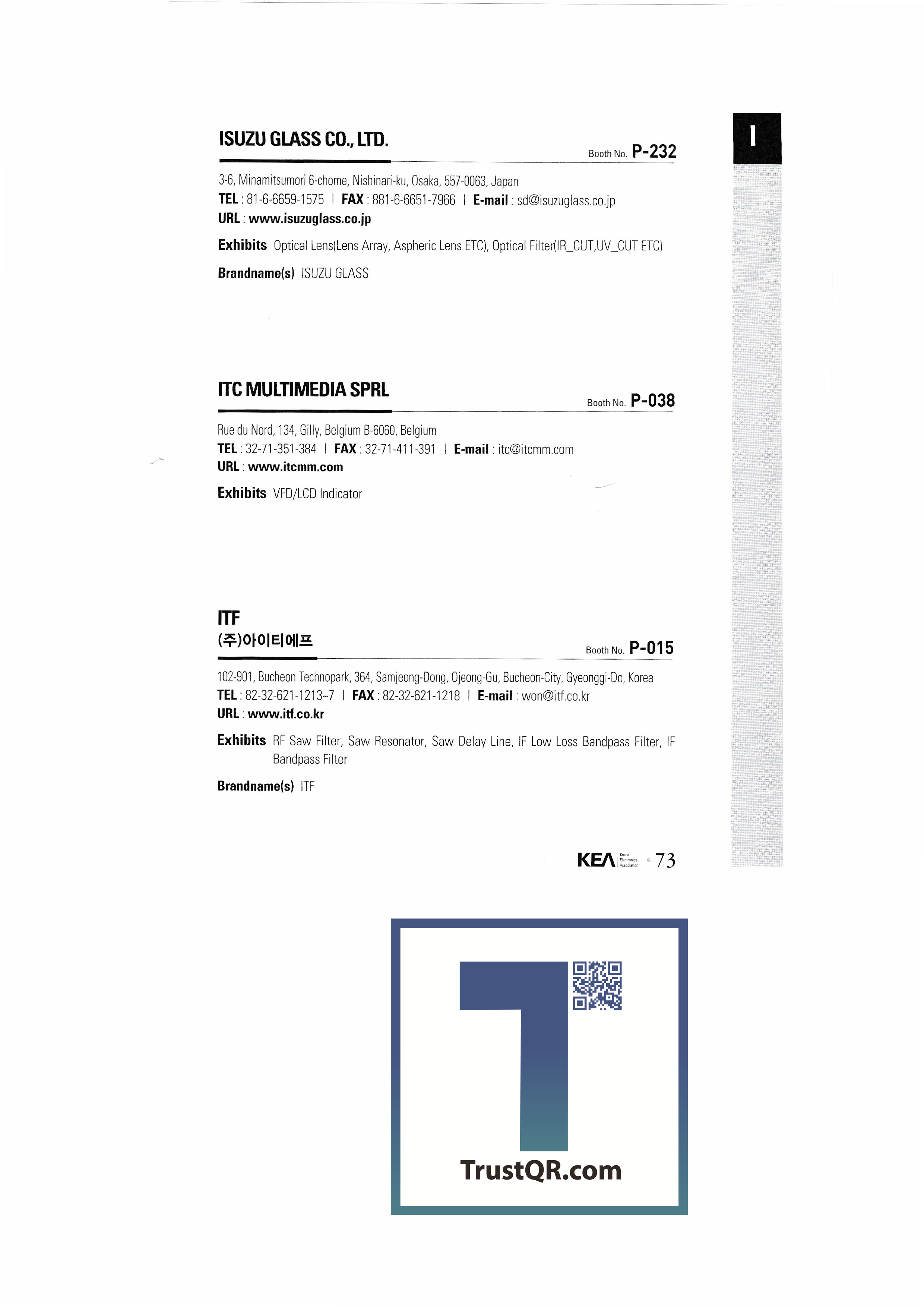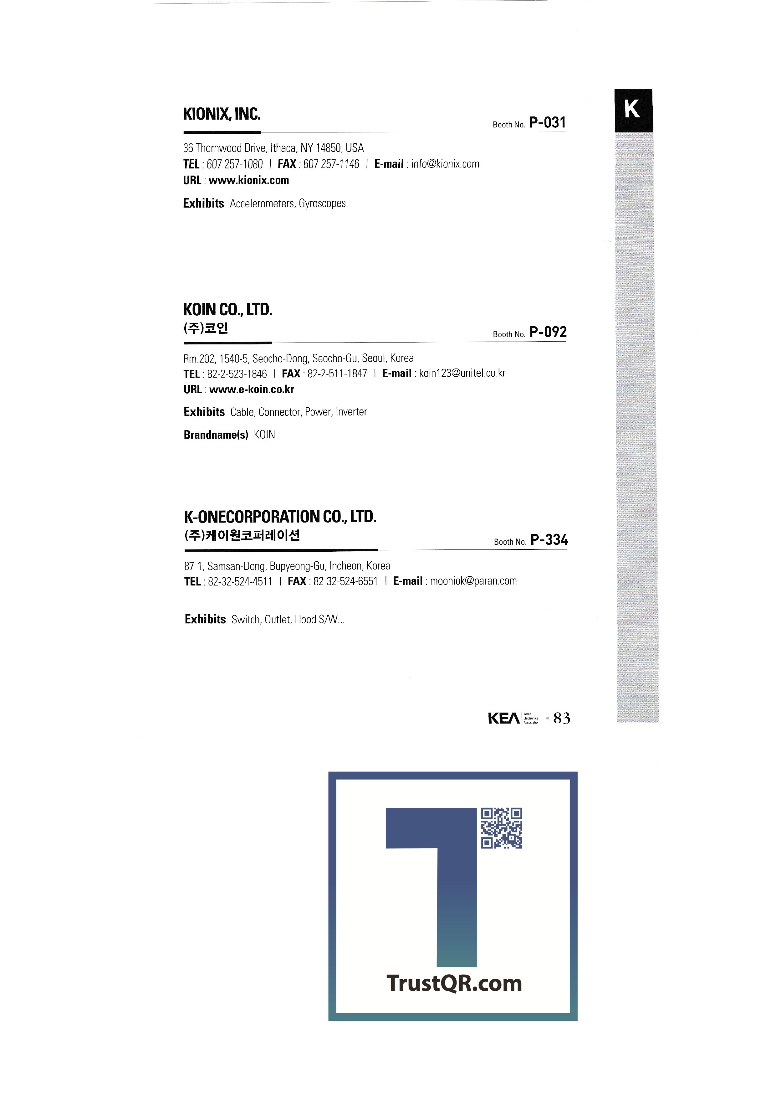 하우 인터내셔날 HEWLETT-PACKARD COMPANY 한국 휴렛팩커드 유한회사 ㈜하임인터트레이드 HITACHI AIC INC. ㈜에치엠알 HOLTEK SEMICONDUCTOR. INC HONG SHENG DIAN ZI ZHI PING CHANG . HOSONIC ELECTRONIC CO., LTD ㈜호소닉코리아 화성시스템㈜ HYB BATTERY CO.,LTD 효성테크노 ㈜효성일렉트 현대컴퓨터㈜ 현대이미지퀘스트㈜ 현대아이센스테크놀러지 인테그랄 반도체㈜ 일만전자산업 ㈜일원엘렉텔 인덕대학 ㈜인포더 ㈜이니티움 인-텍 써플라이 ㈜인터컨 인터필드㈜ INTERQUIP ELECTRONICS CO.,LTD ㈜인트라이즈 ISABELLENHUTTE HEUSLER GMBH & CO.KG ISOTEK ISUZU GLASS CO.,LTD ITC MULTIMEDIA SPRL ㈜아이티에프 ㈜이즈 디스플레이 제이오전자부품㈜ 자니템 제이비 옵틱스㈜ ㈜제 4기한국 진흥무역㈜ 진양전자 진영콘텍㈜ ㈜지음 JOHANSON MANUFACTURING CORPORATION 조일인터내셔날 JOINSOON ELECTRONICS CO., LTD JUDSON TECHNOLOGIES , LLC ㈜정진전자 중원통상 ㈜정훈기공 케이투엘전자 KAIMEL ELECTRONIC CORP. 카오스㈜ KDT전자㈜ 거성전자㈜ KEOPSYS SA KIKUSUI ELECTRONICS CORP. KINGBRIGHT ELEC. CO ., LTD ㈜킹브라이트코리아 KINSTEN INDUSTRIAL CORP. 한국국제전시장㈜ KIONIX , INC. ㈜코인 ㈜케이원코퍼레이션 KONISHI CO., LTD. 코칩㈜ 코리아디지탈㈜ KEA홍보관 코렘 KOTRA ㈜케이프로텍 광명아이에스㈜ 광성전자㈜ 케이와이케이㈜ KYUSHU DENTSU CO., LTD LG전자㈜ ㈜엘지에스 LINGYUN PHOTOELECTRONIC SYSTEM CO.,LTD LUCKY LIGHT ELECTRONIC CO., LTD. ㈜엠투엘 ㈜엘지에스 LINGYUN PHOTOELECTRONIC SYSTEM CO.,LTD LUCKY LIGHT ELECTRONIC CO., LTD. ㈜엠투엘 MARUWA CORPORATION MATSUSHITA ELECTRIC INDUSTRIAL CO., LTD. ㈜맥스포 MAXINA OKE, S.L MAXON MOTOR AG ㈜맥슨모터코리아 맥스텔키폰㈜ MEASUREMENT SPECIALTIES, INC. ㈜맥스기연 ㈜엠에스 솔루션 미래통상 MITS ELECTRONICS ㈜모컴테크 MOLEX CO., LTD 한국몰렉스㈜ ㈜모션테크 ㈜엠피디 ㈜마이프리콘시 ㈜아이크전자 ㈜나노바이오티스 나래미디어 엔컴퓨팅㈜ 엔디코리아㈜ NELSON ELECTRONICS ㈜네오솔 네오테크 ㈜네타미 신성장동력기술시연관(KETI) 2005신제품 우수 전자부품관 동서남북 물산㈜ NEXSAN TECHNOLOGIES 엔하이테크㈜ 니혼가터㈜ NIHON KAIHEIKI INDUSTRY CO., LTD NIKKEI BUSINESS PUBLICATIONS ASIA LTD. NINGBO BIRD CO., LTD 일본케미콘㈜ ㈜엔아이티 NITTO DENKO CORPORATION ㈜엔케이이 NKK SWITCHES NOISE LABORATORY CO., LTD ㈜노이즈텍 ㈜오킨스전자 ㈜원텍/부설 원텍시험연구소 ㈜오피트정보통신 옵티시스㈜ 오리셀㈜ OSADA CO., LTD 파나소닉코리아㈜ PEDOKA LIMITED ㈜펜지 PERKINELMER, INC. ㈜필립스전자 PHILIPS ELECTRONICS.LTD 핀투핀㈜ |
