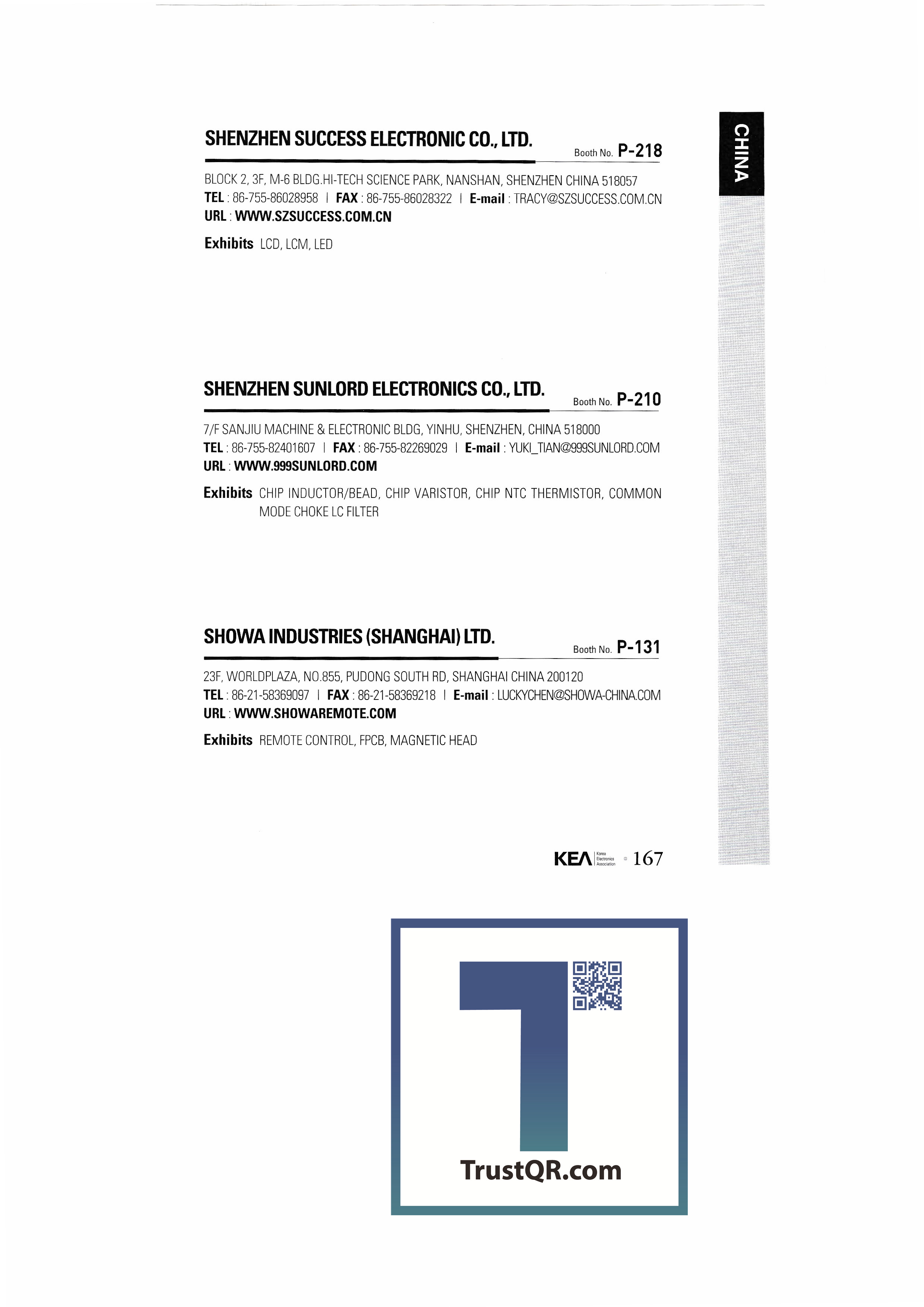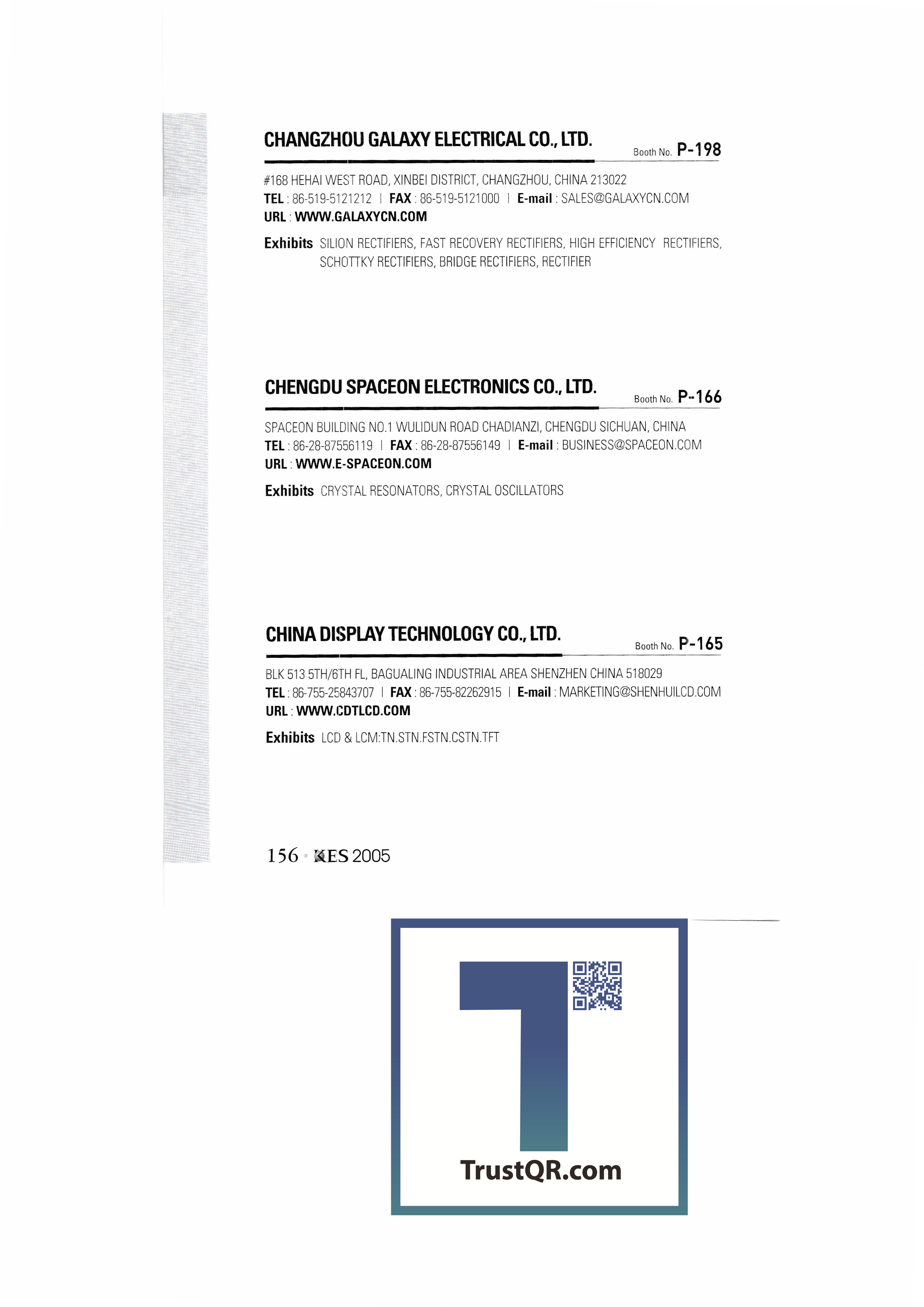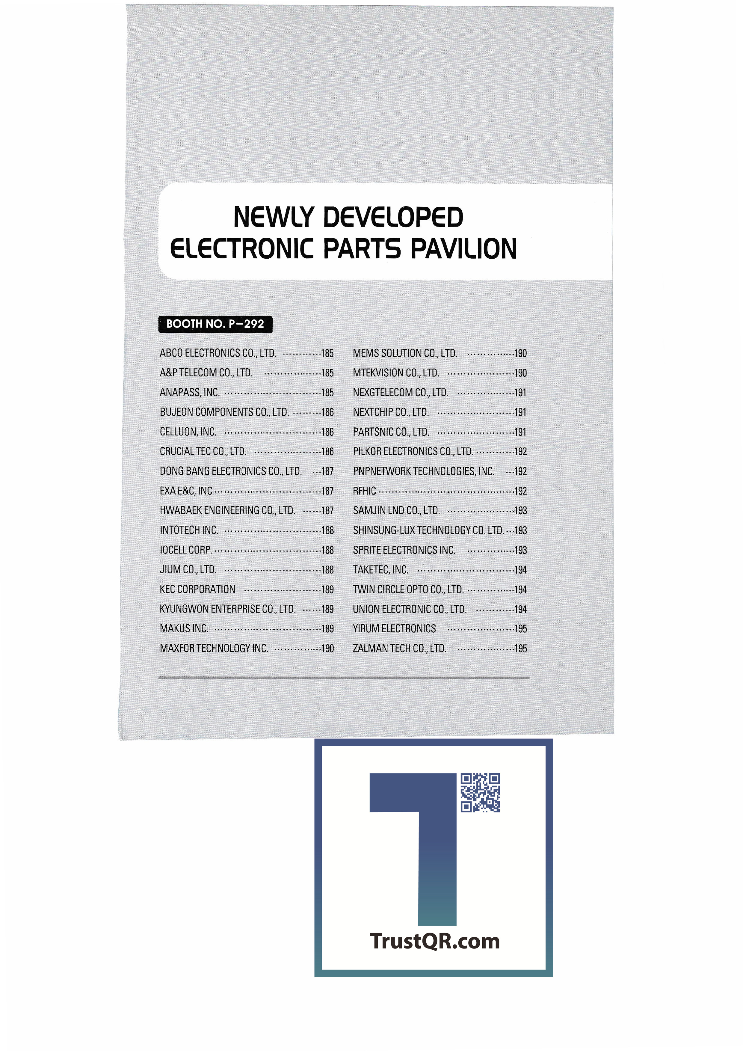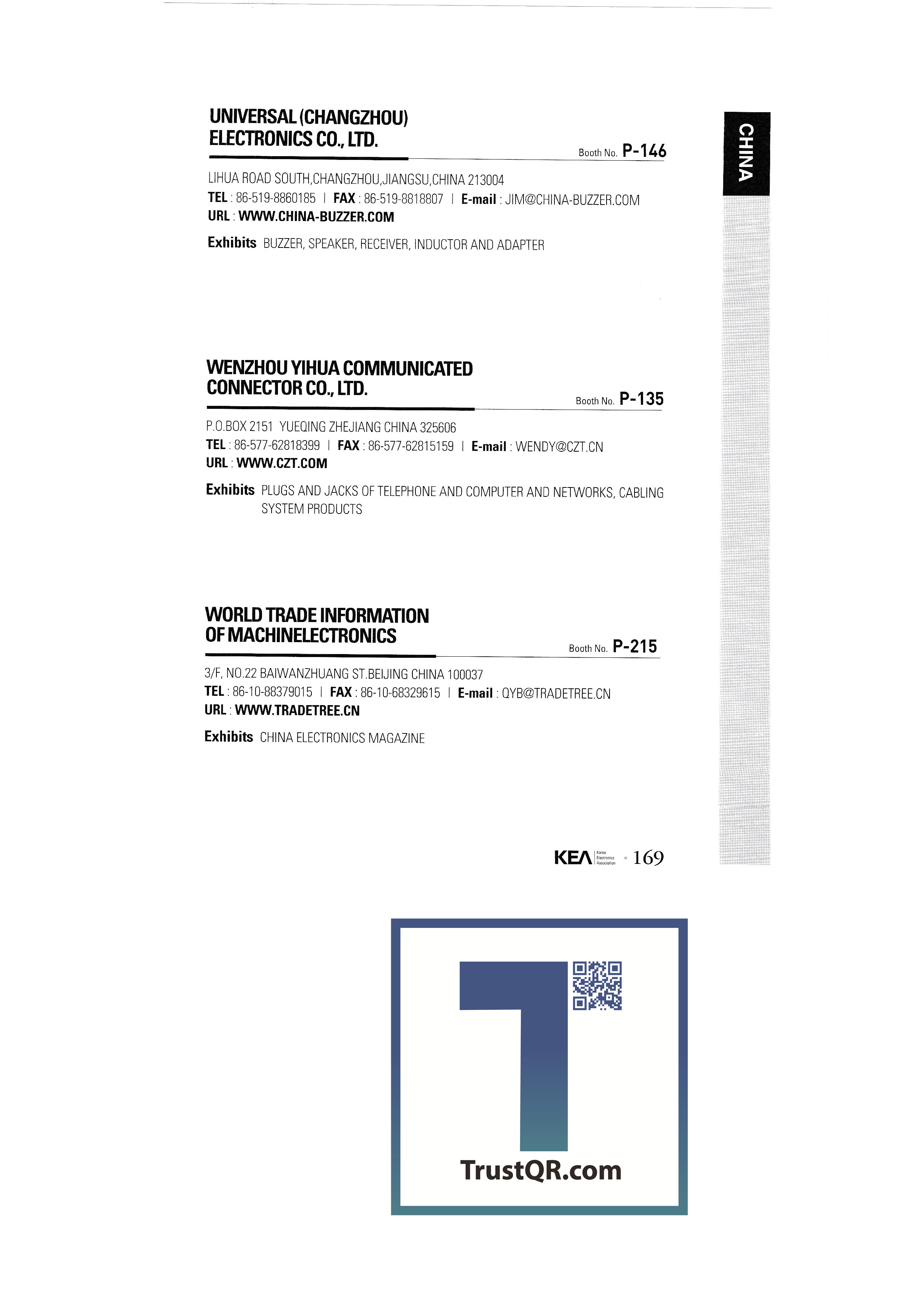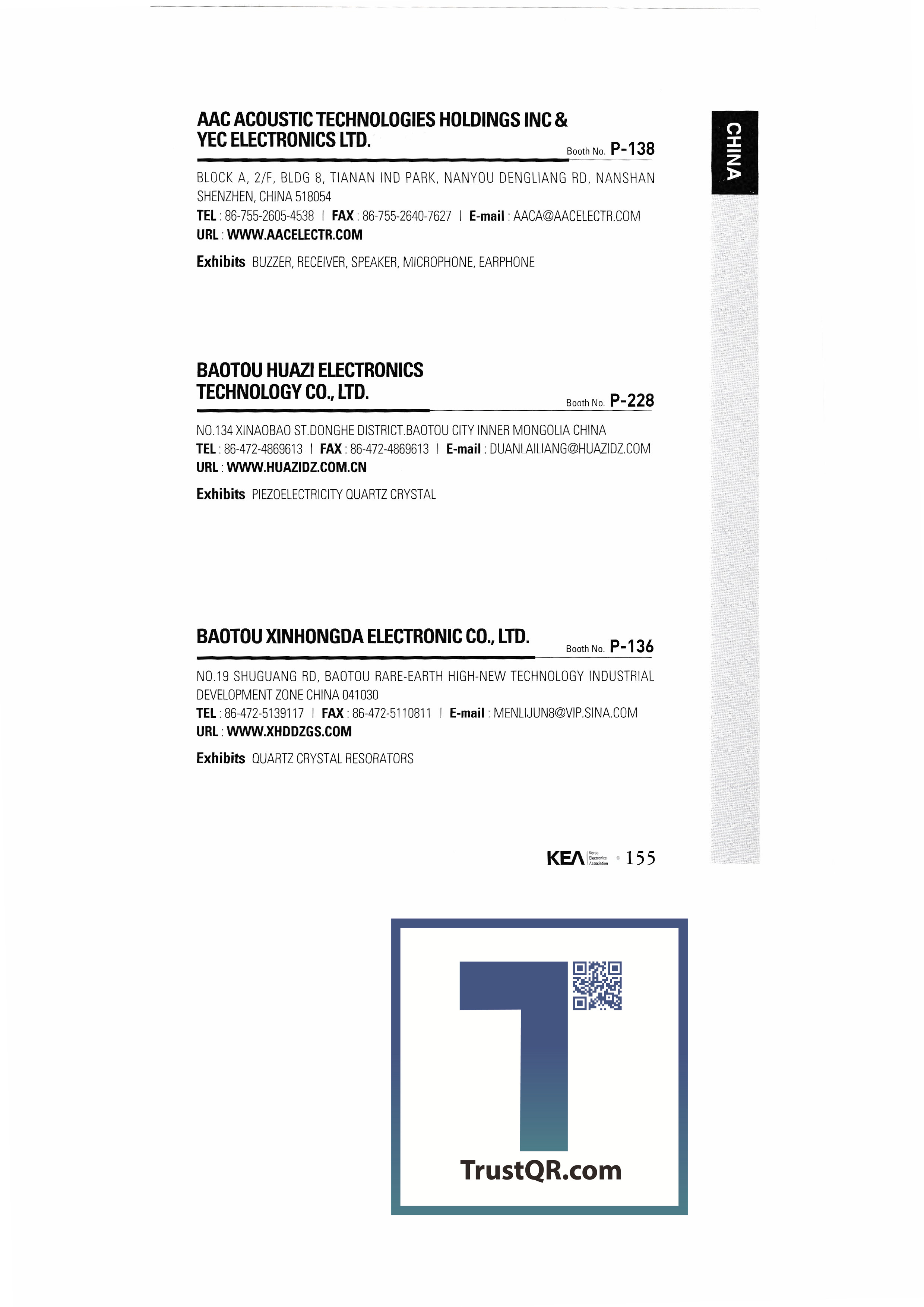 AAC ACOUSTIC TECHNOLOGIES HOLDINGS INC & YEC ELECTRONICS LTD. BAOTOU HUAZI ELECTRONICS TECHNOLOGY CO., LTD. BAOTOU XINHONGDA ELECTRONIC CO., LTD. CHANGZHOU GALAXY ELECTRICAL CO., LTD. CHENGDU SPACEOM ELECTRONICS CO., LTD. CHINA DISPLAY TECHNOLOGY CO., LTD. CHINA NATIONAL ELECTRONICS IMP & EXP ZHEJIANG CO., LTD. DANYANG HAOYUAN &HUAMIN ELECTRON CO., LTD. DEGSON ELECTRONICS CO., LTD. DONGGUAM SANYOU ELECTRICAL APPLIANCES CO ., LTD. DONGGUAM WAFE HARDWARE ELECTRONICS CO., LTD. DONGYANG JINMA MAGNET CO., LTD. ENPING AOERSI DIGITAL SCIENCE AND TECHNOLOGY ELECTRON CO., LTD. ENPING HENGDA ELECTRONIC INDUSTRY CO., LTD. ENPING MISHA ELECTRONIC CO., LTD. HAN'S LASER TECHNOLOGY CO., LTD. HISAUN INDUSTRIES CO., LTD. HUGELENT TELECOMMUNICATION (SUZHOU) CO., LTD. HUNAN CORUN HI-TECH CO.,LTD. JIAN'S HOUSEHOLD ELECTRICAL APPLIANCESS MANUFACTURING LIANYUNGANG RICH-OMEN COMMERCIAL TRADE CO., LTD. NENSHI COMMUNICATION EQUIPMENT CO., LTD. NEW STAR MAGNETS CO., LTD. NINGBOCHARM AUDIO CO.,LTD. NINGBO FORWARD RELAY CORPORATION NINGBO RI-DA ELECTRIC APPLIANCE CO., LTD. NINGBO STRONG MAGNETS CO., LTD. NINGBO YANG GUANG AULI ELECTRONICS APPLIANCE CO., LTD. SHANGYU JINTAO ELECTRON CO.,LTD. SHANTOU GOWORLD DISPLAY CO., LTD. SHENZHEN DIGUANG ELECTRONICS CO.,LTD SHENZHEN HIGHPOWER TECHNOLOGY CO.,LTD. SHENZHEN JINGHUA DISPLAYS. CO., LTD. SHENZHEN JINGRUI INDUSTRY CO., LTD. SHENZHEN JINKE SPECIAL MATERIALS CO., LTD. SHENZHEN SUCCESS ELECTRONIC CO., LTD. SHENZHEN SUNLORD ELECTRONICS CO., LTD. SHOWA INDUSTRIES (SHANGHAI) LTD. SINHUA ELECTRONICS (SHANGHAI) CO., LTD. START MUSICAL INSTRUMENT (HANGZHOU) MANUFACTORY TIANJIN TONG GUANG GROUP DIGITAL COMMUNUCATION CO., LTD. UNIVERSAL (CHANGZHOU) ELECTRONICS CO., LTD. WENZHOU YIHUA COMMUNICATED CONNECTOR CO.,LTD. WORLD TRADE INFORMATION OF MACHINELECTRONICS WUHAN LIXING POWER SOURCES CO., LTD. XIAMEN FREQUENCY-TECH ELECTRONICS CO.,LTD. XIAMEN GUANGPU ELECTRONICS CO., LTD. XIAMEN OCULAR LCD DEVICES CO.,LTD. YUEQING GREAT ELECTRONICS CO., LTD. YUEQING ZHONGZHOU ELECTRONICS. CO., LTD. ZHEJIANG INNUOVO MAGNETICS CO.,LTD. ZHEJIANG JIAKANG ELECTRONICS CO., LTD. ZHEJIANG TIANTONG ELECTRONICS CO., LTD. ZHEJIANG YUEHUA TELECOMMUNICATION CO., LTD. A-BRIGHT INDUSTRICAL CO., LTD. CEN LINK CO., LTD. GOOD WILL INSTRUMENT CO., LTD. HI-LIGHT ELECTRONIC CO., LTD. KUNMING ELECTRONICS CO., LTD. SUN-LIGHT ELECTRONIC TECHNOLOGIES INC. TAIWAN ELECTRICAL AND ELECTRONIC MANUFACTURERS' ASSOCIATION(TEEMA) TRANYOUNG TECHNOLOGY CORP. ZAWARD CORPORATION Abiko Electronics Co., Ltd. A&P Telecom Co., Ltd. Ana Pass Co., Ltd. Bujeon Electronic Components Co., Ltd. Celluon Co., Ltd. Crucial Tech Co., Ltd. Dongbang Electronics Co., Ltd. ExCNC Co., Ltd. Hwabaek Engineering Co., Ltd. Intotech Co., Ltd. IOCELL Co., Ltd. Written by KC Corporation Kyungwon Enterprise Co., Ltd. Mecus Co., Ltd. Maxpo Co., Ltd. MS Solution Co., Ltd. M-Tekvision NexG Telecom Co., Ltd. Next Chip Co., Ltd. Patnick Pilco Electronics Co., Ltd. PnP Network Co., Ltd. RBC Inc. Samjin LND Shinsung Lux Technology Co., Ltd. Korea Sprite Co., Ltd. Take Tech Co., Ltd. Tsio Corporation Union Electronics Eroom Electronics Zalman Tech Co., Ltd. |