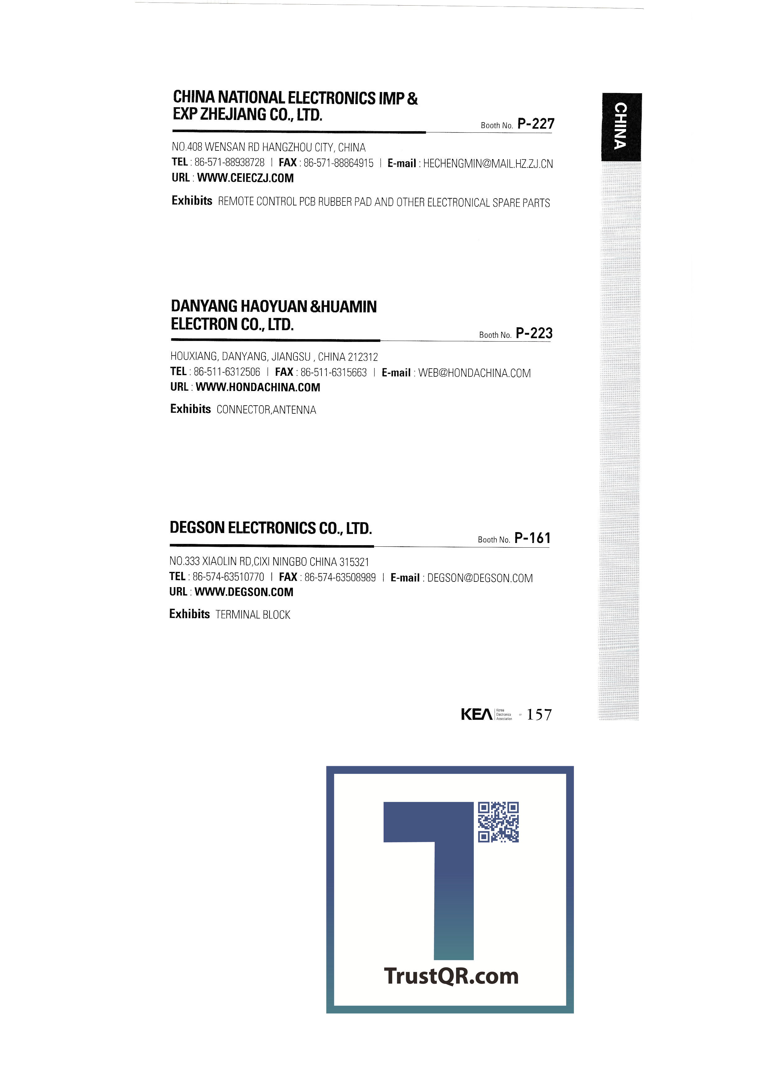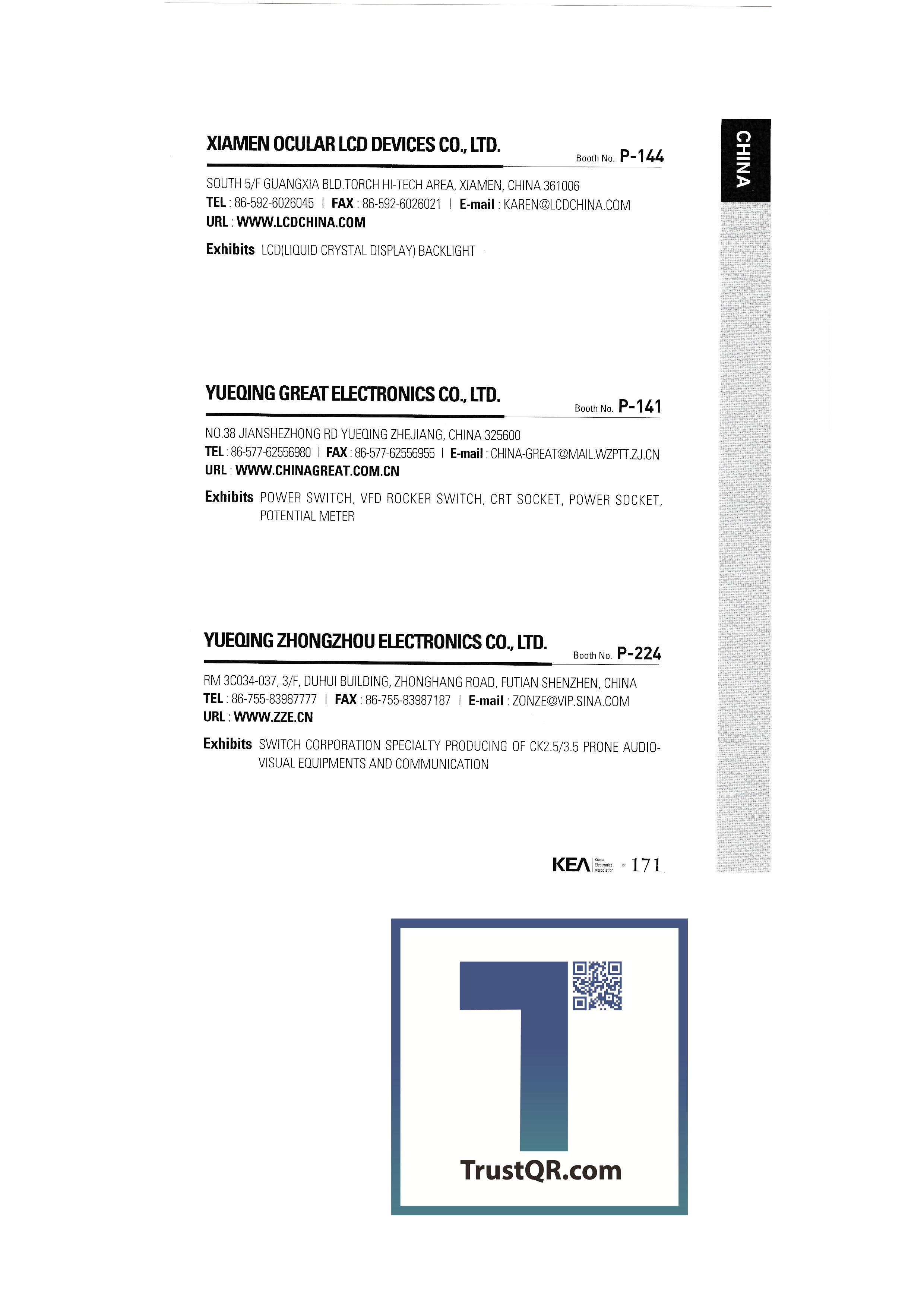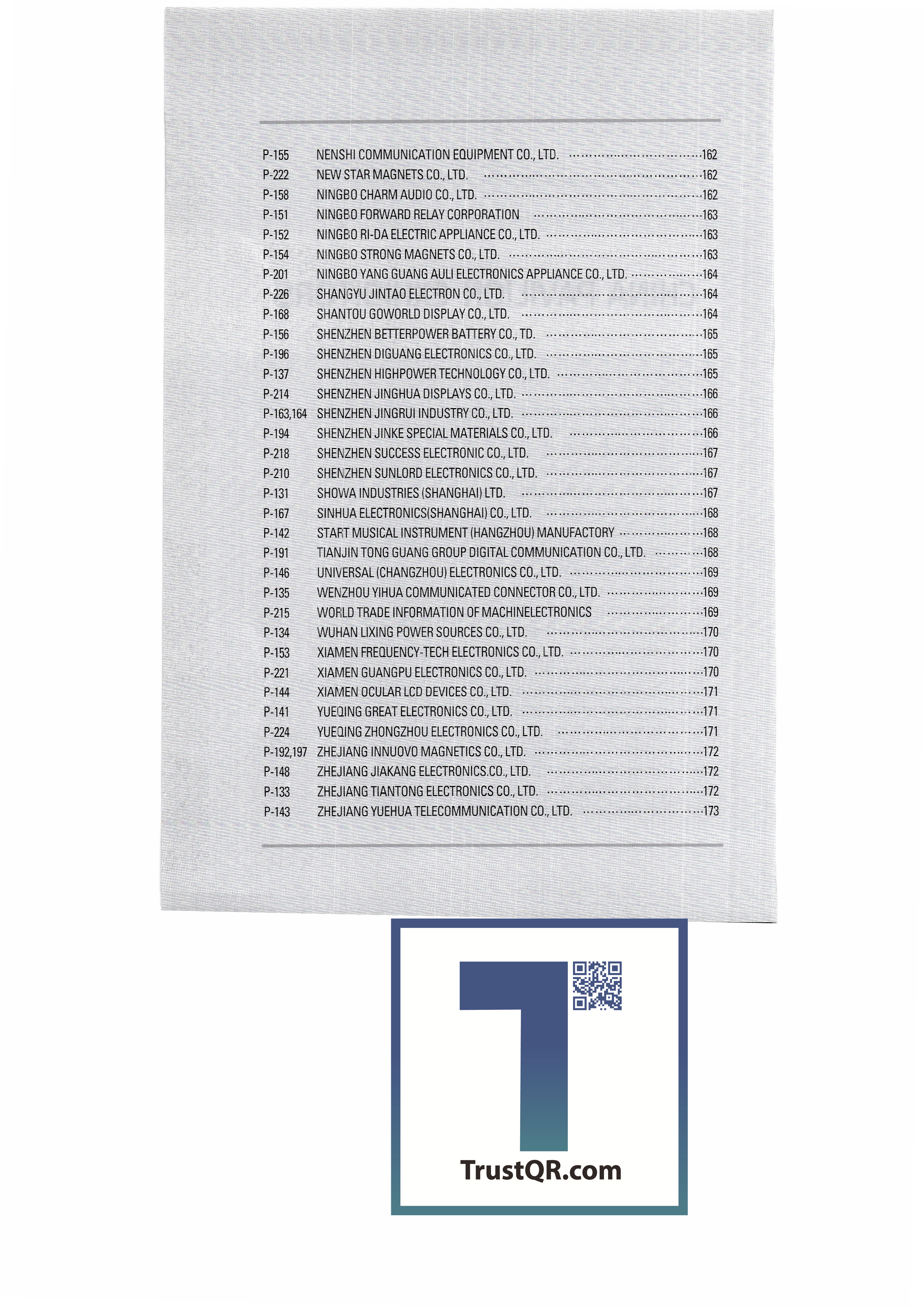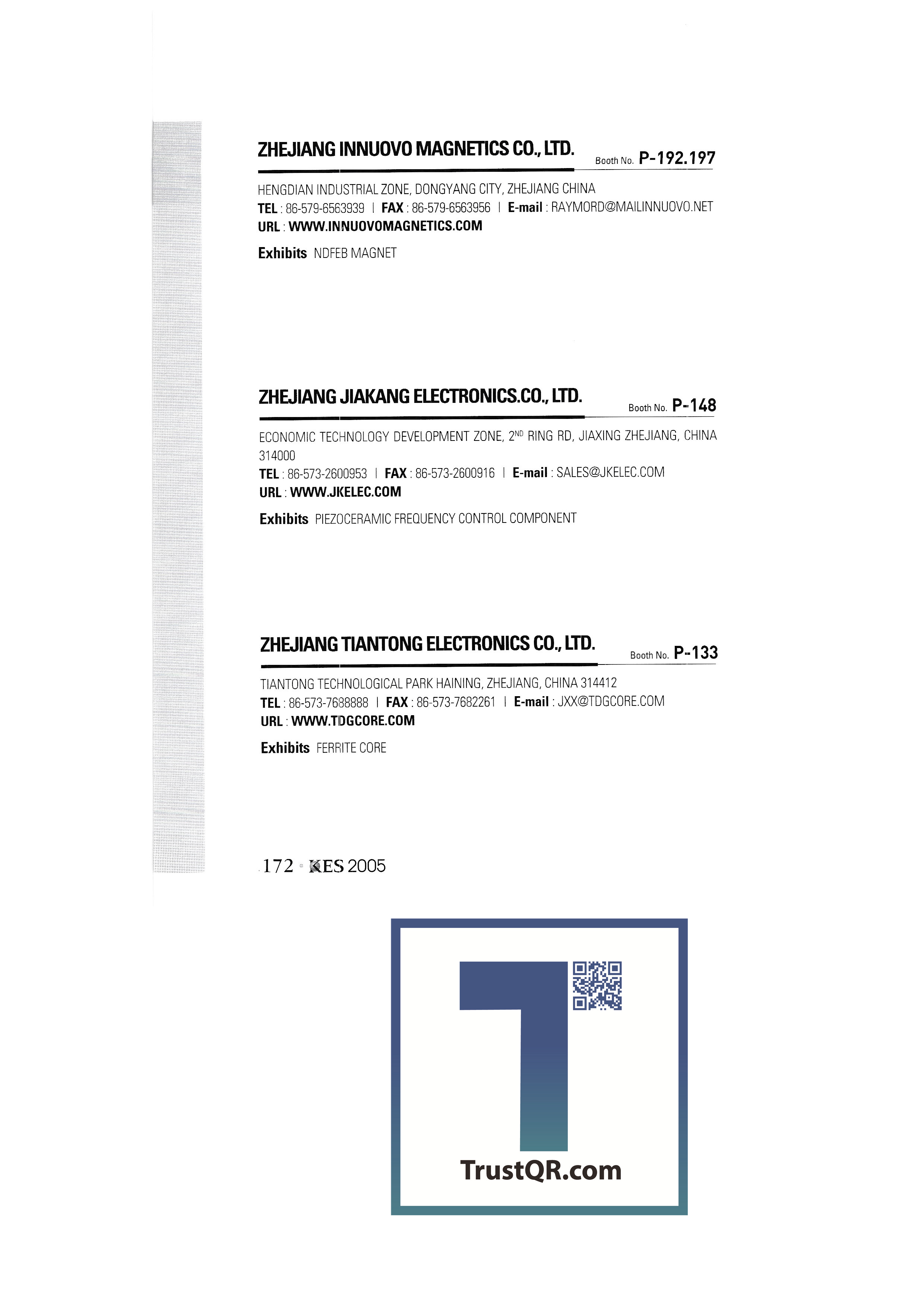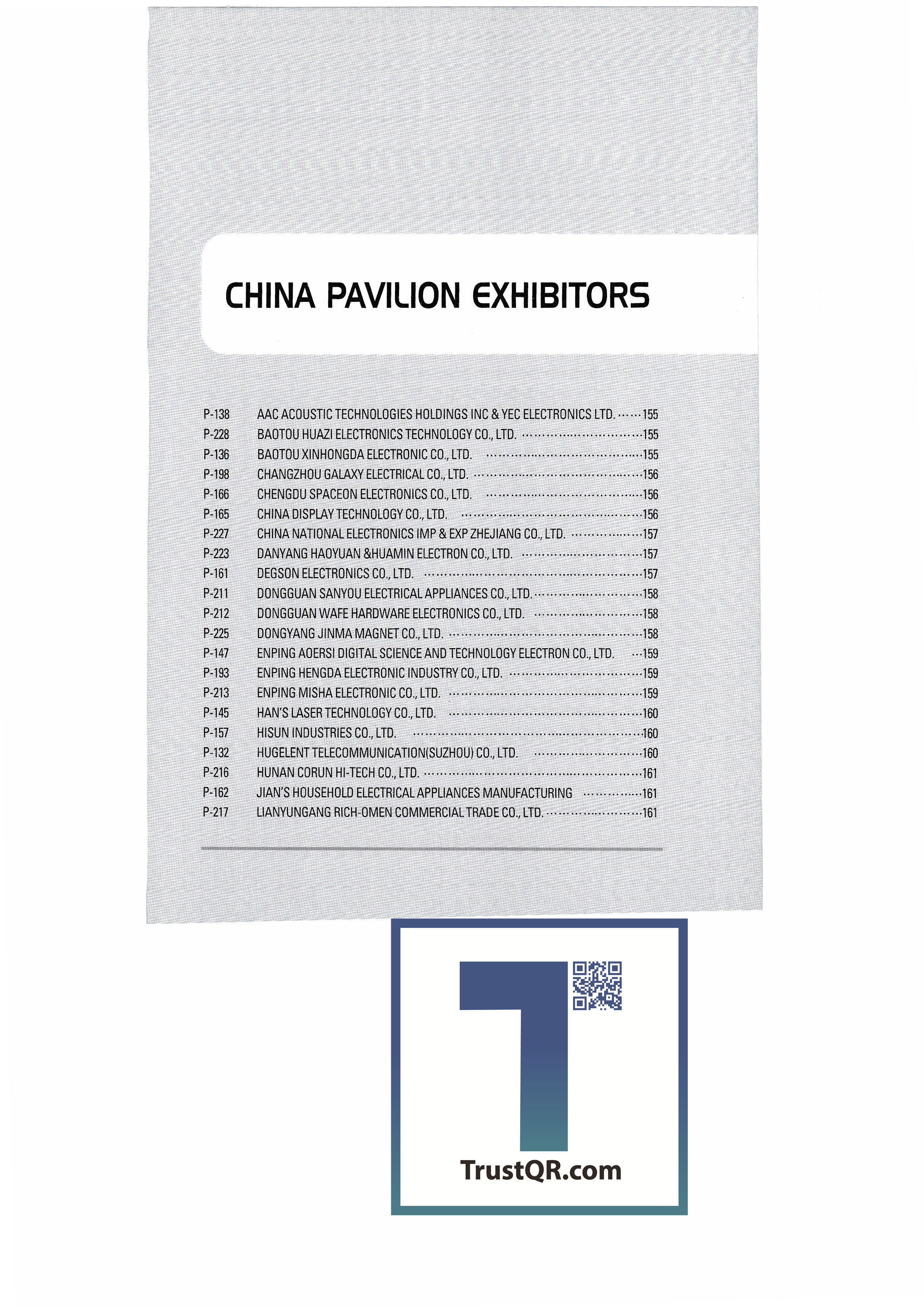 AAC ACOUSTIC TECHNOLOGIES HOLDINGS INC & YEC ELECTRONICS LTD. BAOTOU HUAZI ELECTRONICS TECHNOLOGY CO., LTD. BAOTOU XINHONGDA ELECTRONIC CO., LTD. CHANGZHOU GALAXY ELECTRICAL CO., LTD. CHENGDU SPACEOM ELECTRONICS CO., LTD. CHINA DISPLAY TECHNOLOGY CO., LTD. CHINA NATIONAL ELECTRONICS IMP & EXP ZHEJIANG CO., LTD. DANYANG HAOYUAN &HUAMIN ELECTRON CO., LTD. DEGSON ELECTRONICS CO., LTD. DONGGUAM SANYOU ELECTRICAL APPLIANCES CO ., LTD. DONGGUAM WAFE HARDWARE ELECTRONICS CO., LTD. DONGYANG JINMA MAGNET CO., LTD. ENPING AOERSI DIGITAL SCIENCE AND TECHNOLOGY ELECTRON CO., LTD. ENPING HENGDA ELECTRONIC INDUSTRY CO., LTD. ENPING MISHA ELECTRONIC CO., LTD. HAN'S LASER TECHNOLOGY CO., LTD. HISAUN INDUSTRIES CO., LTD. HUGELENT TELECOMMUNICATION (SUZHOU) CO., LTD. HUNAN CORUN HI-TECH CO.,LTD. JIAN'S HOUSEHOLD ELECTRICAL APPLIANCESS MANUFACTURING LIANYUNGANG RICH-OMEN COMMERCIAL TRADE CO., LTD. NENSHI COMMUNICATION EQUIPMENT CO., LTD. NEW STAR MAGNETS CO., LTD. NINGBOCHARM AUDIO CO.,LTD. NINGBO FORWARD RELAY CORPORATION NINGBO RI-DA ELECTRIC APPLIANCE CO., LTD. NINGBO STRONG MAGNETS CO., LTD. NINGBO YANG GUANG AULI ELECTRONICS APPLIANCE CO., LTD. SHANGYU JINTAO ELECTRON CO.,LTD. SHANTOU GOWORLD DISPLAY CO., LTD. SHENZHEN DIGUANG ELECTRONICS CO.,LTD SHENZHEN HIGHPOWER TECHNOLOGY CO.,LTD. SHENZHEN JINGHUA DISPLAYS. CO., LTD. SHENZHEN JINGRUI INDUSTRY CO., LTD. SHENZHEN JINKE SPECIAL MATERIALS CO., LTD. SHENZHEN SUCCESS ELECTRONIC CO., LTD. SHENZHEN SUNLORD ELECTRONICS CO., LTD. SHOWA INDUSTRIES (SHANGHAI) LTD. SINHUA ELECTRONICS (SHANGHAI) CO., LTD. START MUSICAL INSTRUMENT (HANGZHOU) MANUFACTORY TIANJIN TONG GUANG GROUP DIGITAL COMMUNUCATION CO., LTD. UNIVERSAL (CHANGZHOU) ELECTRONICS CO., LTD. WENZHOU YIHUA COMMUNICATED CONNECTOR CO.,LTD. WORLD TRADE INFORMATION OF MACHINELECTRONICS WUHAN LIXING POWER SOURCES CO., LTD. XIAMEN FREQUENCY-TECH ELECTRONICS CO.,LTD. XIAMEN GUANGPU ELECTRONICS CO., LTD. XIAMEN OCULAR LCD DEVICES CO.,LTD. YUEQING GREAT ELECTRONICS CO., LTD. YUEQING ZHONGZHOU ELECTRONICS. CO., LTD. ZHEJIANG INNUOVO MAGNETICS CO.,LTD. ZHEJIANG JIAKANG ELECTRONICS CO., LTD. ZHEJIANG TIANTONG ELECTRONICS CO., LTD. ZHEJIANG YUEHUA TELECOMMUNICATION CO., LTD. A-BRIGHT INDUSTRICAL CO., LTD. CEN LINK CO., LTD. GOOD WILL INSTRUMENT CO., LTD. HI-LIGHT ELECTRONIC CO., LTD. KUNMING ELECTRONICS CO., LTD. SUN-LIGHT ELECTRONIC TECHNOLOGIES INC. TAIWAN ELECTRICAL AND ELECTRONIC MANUFACTURERS' ASSOCIATION(TEEMA) TRANYOUNG TECHNOLOGY CORP. ZAWARD CORPORATION Abiko Electronics Co., Ltd. A&P Telecom Co., Ltd. Ana Pass Co., Ltd. Bujeon Electronic Components Co., Ltd. Celluon Co., Ltd. Crucial Tech Co., Ltd. Dongbang Electronics Co., Ltd. ExCNC Co., Ltd. Hwabaek Engineering Co., Ltd. Intotech Co., Ltd. IOCELL Co., Ltd. Written by KC Corporation Kyungwon Enterprise Co., Ltd. Mecus Co., Ltd. Maxpo Co., Ltd. MS Solution Co., Ltd. M-Tekvision NexG Telecom Co., Ltd. Next Chip Co., Ltd. Patnick Pilco Electronics Co., Ltd. PnP Network Co., Ltd. RBC Inc. Samjin LND Shinsung Lux Technology Co., Ltd. Korea Sprite Co., Ltd. Take Tech Co., Ltd. Tsio Corporation Union Electronics Eroom Electronics Zalman Tech Co., Ltd. |