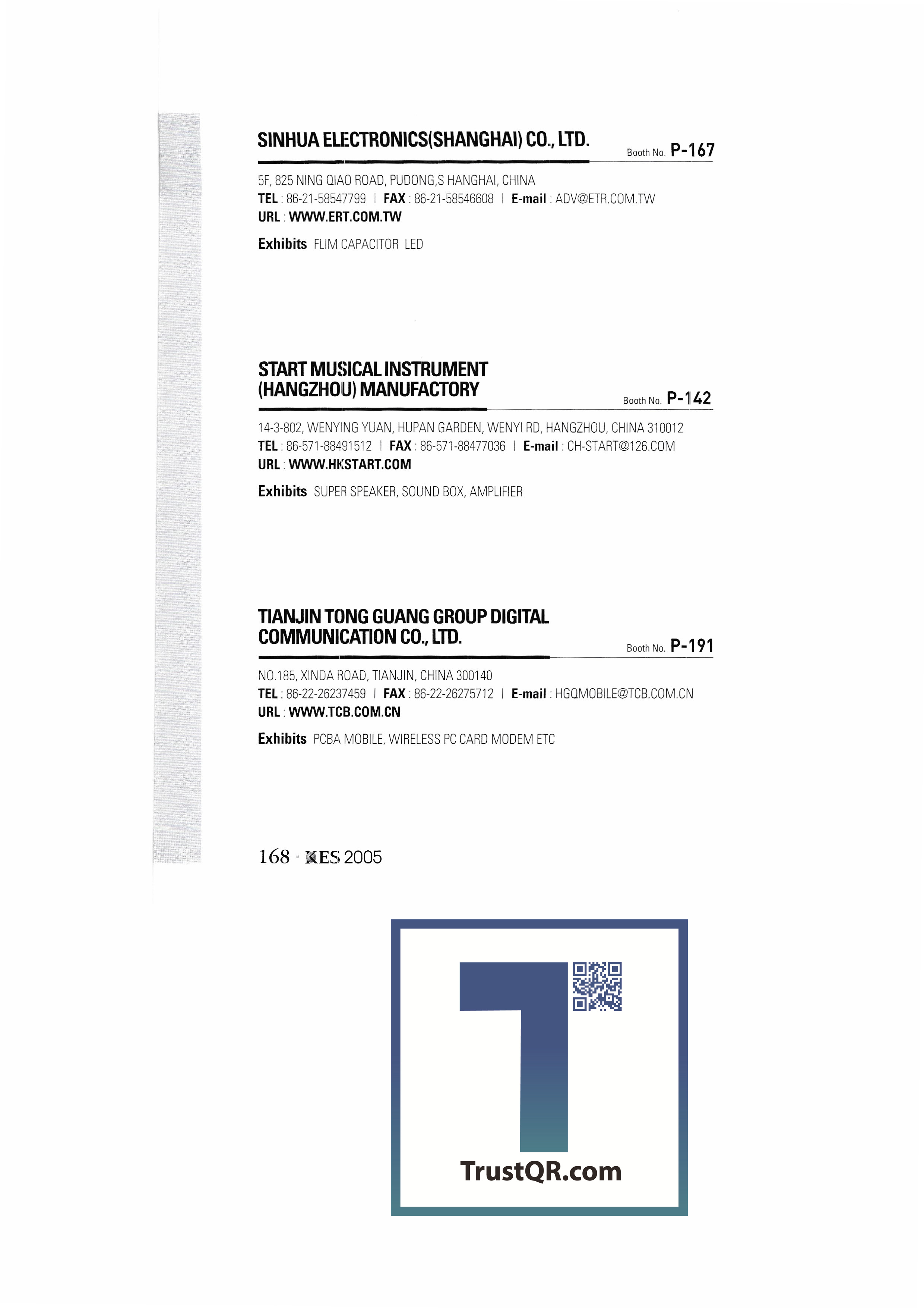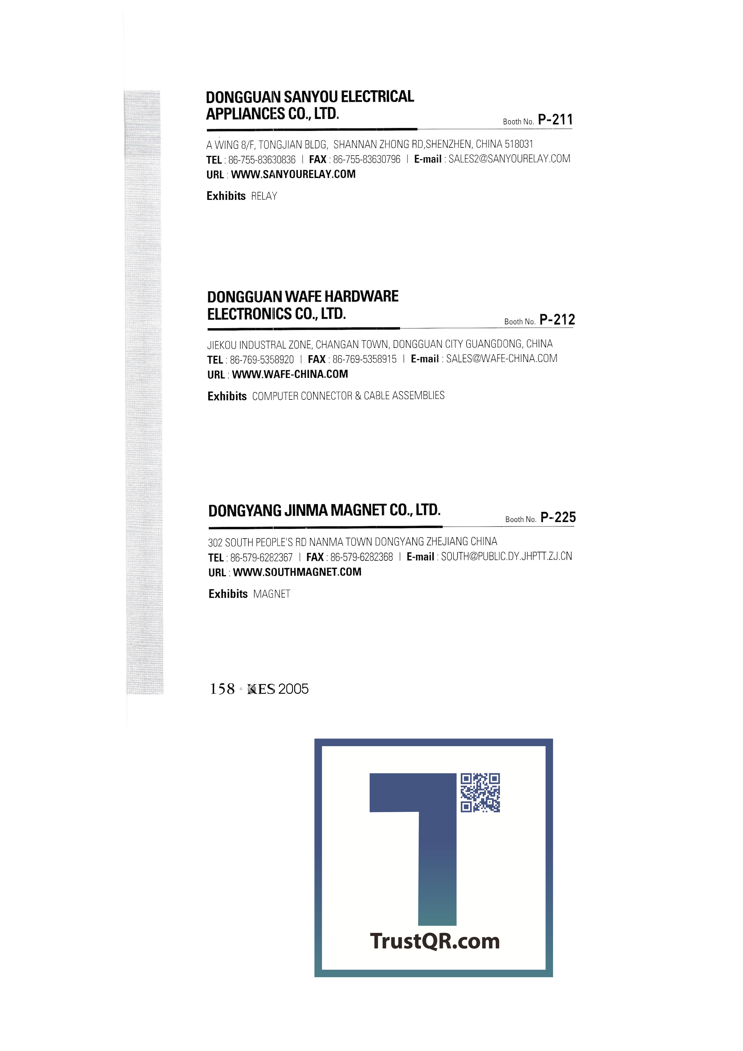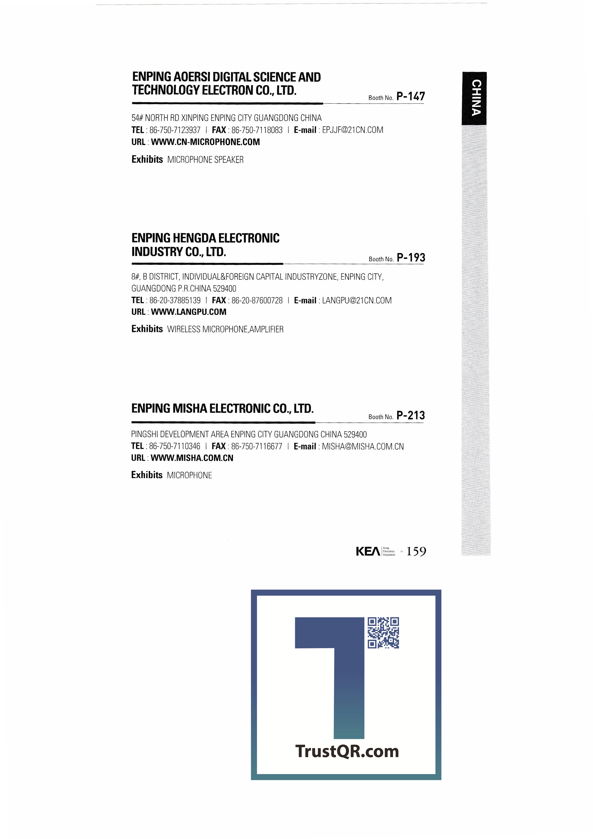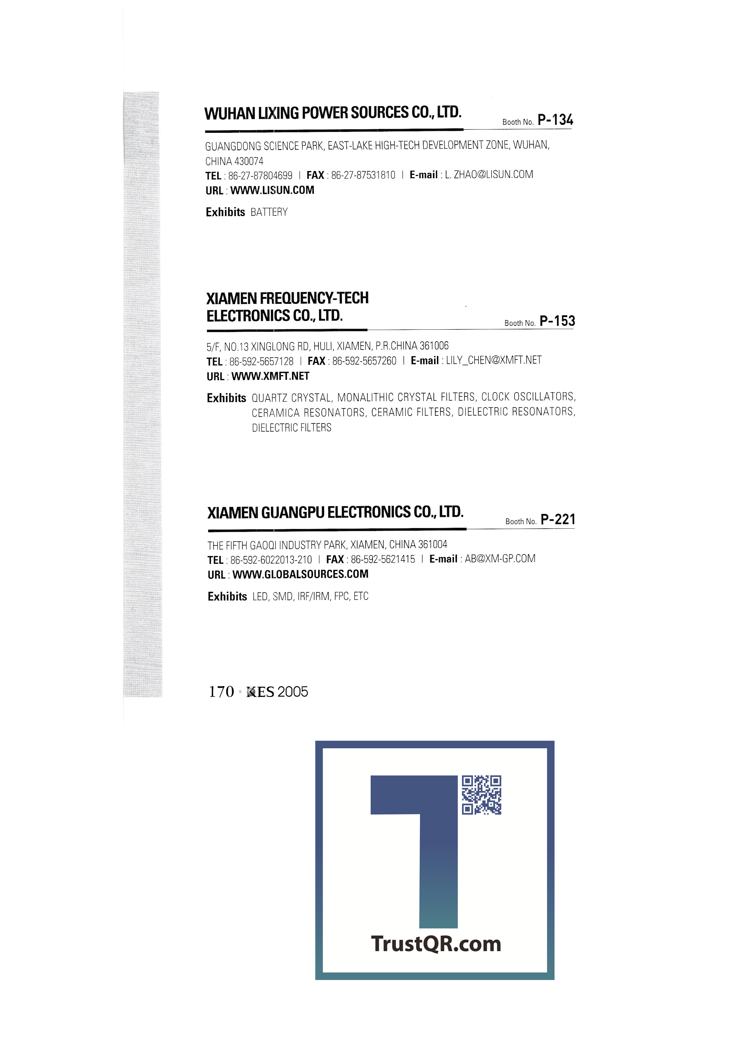 AAC ACOUSTIC TECHNOLOGIES HOLDINGS INC & YEC ELECTRONICS LTD. BAOTOU HUAZI ELECTRONICS TECHNOLOGY CO., LTD. BAOTOU XINHONGDA ELECTRONIC CO., LTD. CHANGZHOU GALAXY ELECTRICAL CO., LTD. CHENGDU SPACEOM ELECTRONICS CO., LTD. CHINA DISPLAY TECHNOLOGY CO., LTD. CHINA NATIONAL ELECTRONICS IMP & EXP ZHEJIANG CO., LTD. DANYANG HAOYUAN &HUAMIN ELECTRON CO., LTD. DEGSON ELECTRONICS CO., LTD. DONGGUAM SANYOU ELECTRICAL APPLIANCES CO ., LTD. DONGGUAM WAFE HARDWARE ELECTRONICS CO., LTD. DONGYANG JINMA MAGNET CO., LTD. ENPING AOERSI DIGITAL SCIENCE AND TECHNOLOGY ELECTRON CO., LTD. ENPING HENGDA ELECTRONIC INDUSTRY CO., LTD. ENPING MISHA ELECTRONIC CO., LTD. HAN'S LASER TECHNOLOGY CO., LTD. HISAUN INDUSTRIES CO., LTD. HUGELENT TELECOMMUNICATION (SUZHOU) CO., LTD. HUNAN CORUN HI-TECH CO.,LTD. JIAN'S HOUSEHOLD ELECTRICAL APPLIANCESS MANUFACTURING LIANYUNGANG RICH-OMEN COMMERCIAL TRADE CO., LTD. NENSHI COMMUNICATION EQUIPMENT CO., LTD. NEW STAR MAGNETS CO., LTD. NINGBOCHARM AUDIO CO.,LTD. NINGBO FORWARD RELAY CORPORATION NINGBO RI-DA ELECTRIC APPLIANCE CO., LTD. NINGBO STRONG MAGNETS CO., LTD. NINGBO YANG GUANG AULI ELECTRONICS APPLIANCE CO., LTD. SHANGYU JINTAO ELECTRON CO.,LTD. SHANTOU GOWORLD DISPLAY CO., LTD. SHENZHEN DIGUANG ELECTRONICS CO.,LTD SHENZHEN HIGHPOWER TECHNOLOGY CO.,LTD. SHENZHEN JINGHUA DISPLAYS. CO., LTD. SHENZHEN JINGRUI INDUSTRY CO., LTD. SHENZHEN JINKE SPECIAL MATERIALS CO., LTD. SHENZHEN SUCCESS ELECTRONIC CO., LTD. SHENZHEN SUNLORD ELECTRONICS CO., LTD. SHOWA INDUSTRIES (SHANGHAI) LTD. SINHUA ELECTRONICS (SHANGHAI) CO., LTD. START MUSICAL INSTRUMENT (HANGZHOU) MANUFACTORY TIANJIN TONG GUANG GROUP DIGITAL COMMUNUCATION CO., LTD. UNIVERSAL (CHANGZHOU) ELECTRONICS CO., LTD. WENZHOU YIHUA COMMUNICATED CONNECTOR CO.,LTD. WORLD TRADE INFORMATION OF MACHINELECTRONICS WUHAN LIXING POWER SOURCES CO., LTD. XIAMEN FREQUENCY-TECH ELECTRONICS CO.,LTD. XIAMEN GUANGPU ELECTRONICS CO., LTD. XIAMEN OCULAR LCD DEVICES CO.,LTD. YUEQING GREAT ELECTRONICS CO., LTD. YUEQING ZHONGZHOU ELECTRONICS. CO., LTD. ZHEJIANG INNUOVO MAGNETICS CO.,LTD. ZHEJIANG JIAKANG ELECTRONICS CO., LTD. ZHEJIANG TIANTONG ELECTRONICS CO., LTD. ZHEJIANG YUEHUA TELECOMMUNICATION CO., LTD. A-BRIGHT INDUSTRICAL CO., LTD. CEN LINK CO., LTD. GOOD WILL INSTRUMENT CO., LTD. HI-LIGHT ELECTRONIC CO., LTD. KUNMING ELECTRONICS CO., LTD. SUN-LIGHT ELECTRONIC TECHNOLOGIES INC. TAIWAN ELECTRICAL AND ELECTRONIC MANUFACTURERS' ASSOCIATION(TEEMA) TRANYOUNG TECHNOLOGY CORP. ZAWARD CORPORATION Abiko Electronics Co., Ltd. A&P Telecom Co., Ltd. Ana Pass Co., Ltd. Bujeon Electronic Components Co., Ltd. Celluon Co., Ltd. Crucial Tech Co., Ltd. Dongbang Electronics Co., Ltd. ExCNC Co., Ltd. Hwabaek Engineering Co., Ltd. Intotech Co., Ltd. IOCELL Co., Ltd. Written by KC Corporation Kyungwon Enterprise Co., Ltd. Mecus Co., Ltd. Maxpo Co., Ltd. MS Solution Co., Ltd. M-Tekvision NexG Telecom Co., Ltd. Next Chip Co., Ltd. Patnick Pilco Electronics Co., Ltd. PnP Network Co., Ltd. RBC Inc. Samjin LND Shinsung Lux Technology Co., Ltd. Korea Sprite Co., Ltd. Take Tech Co., Ltd. Tsio Corporation Union Electronics Eroom Electronics Zalman Tech Co., Ltd. |