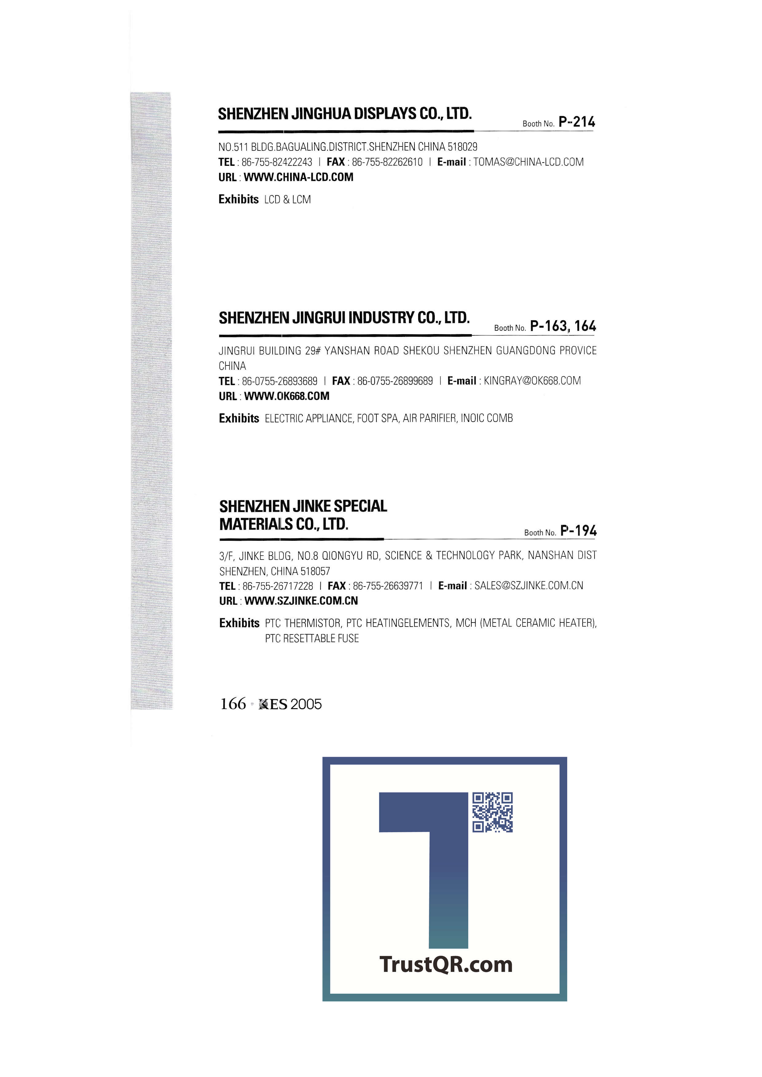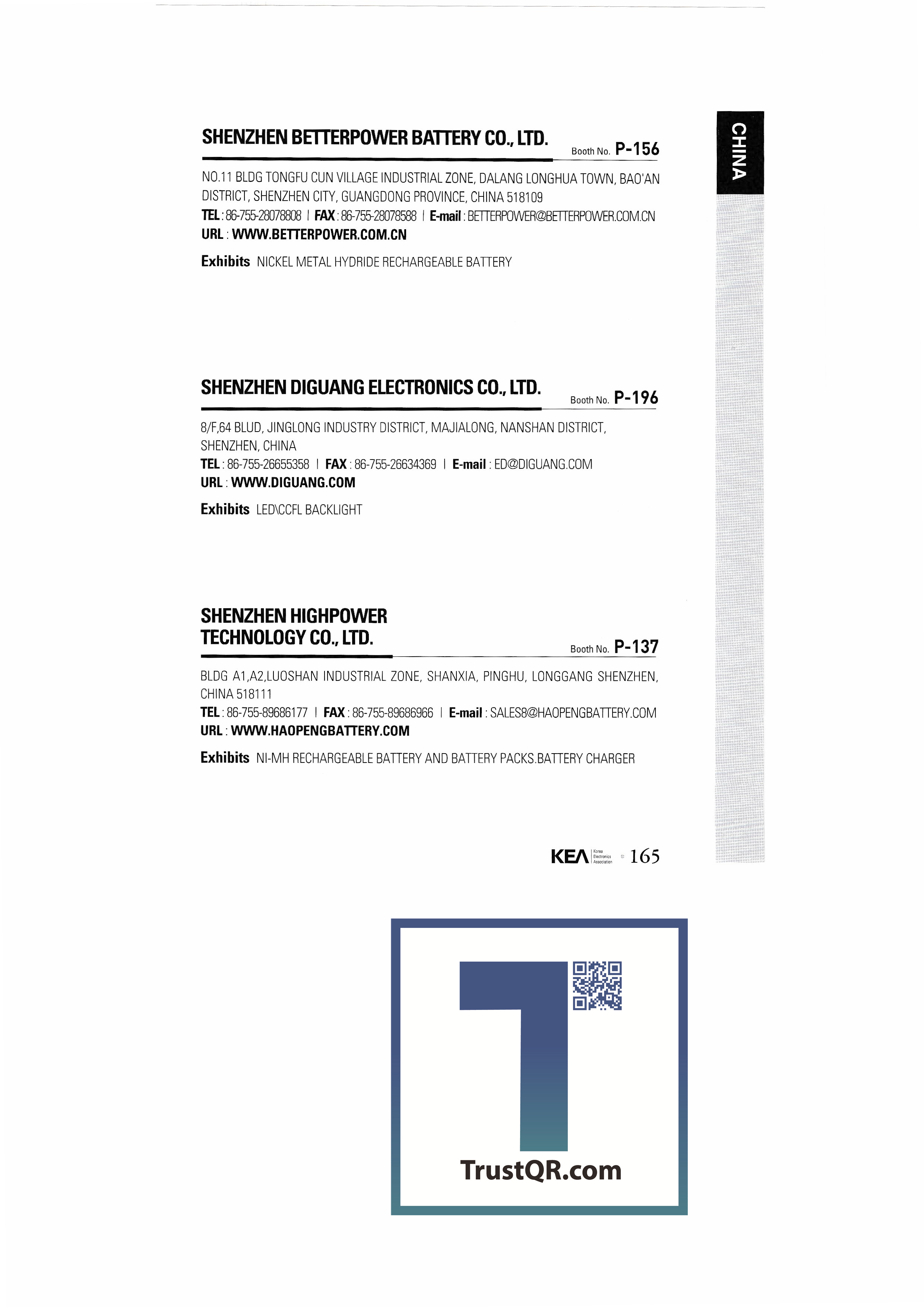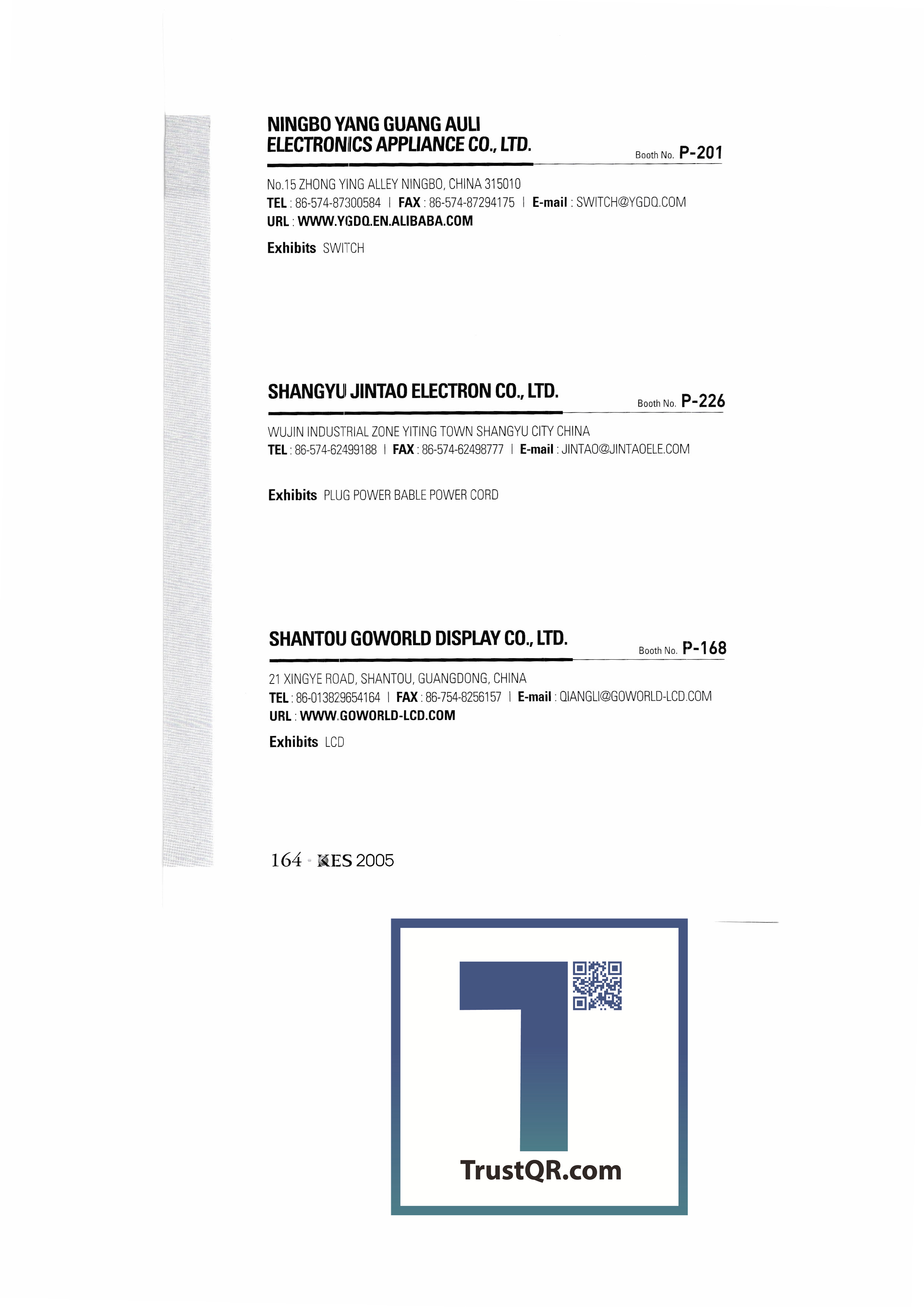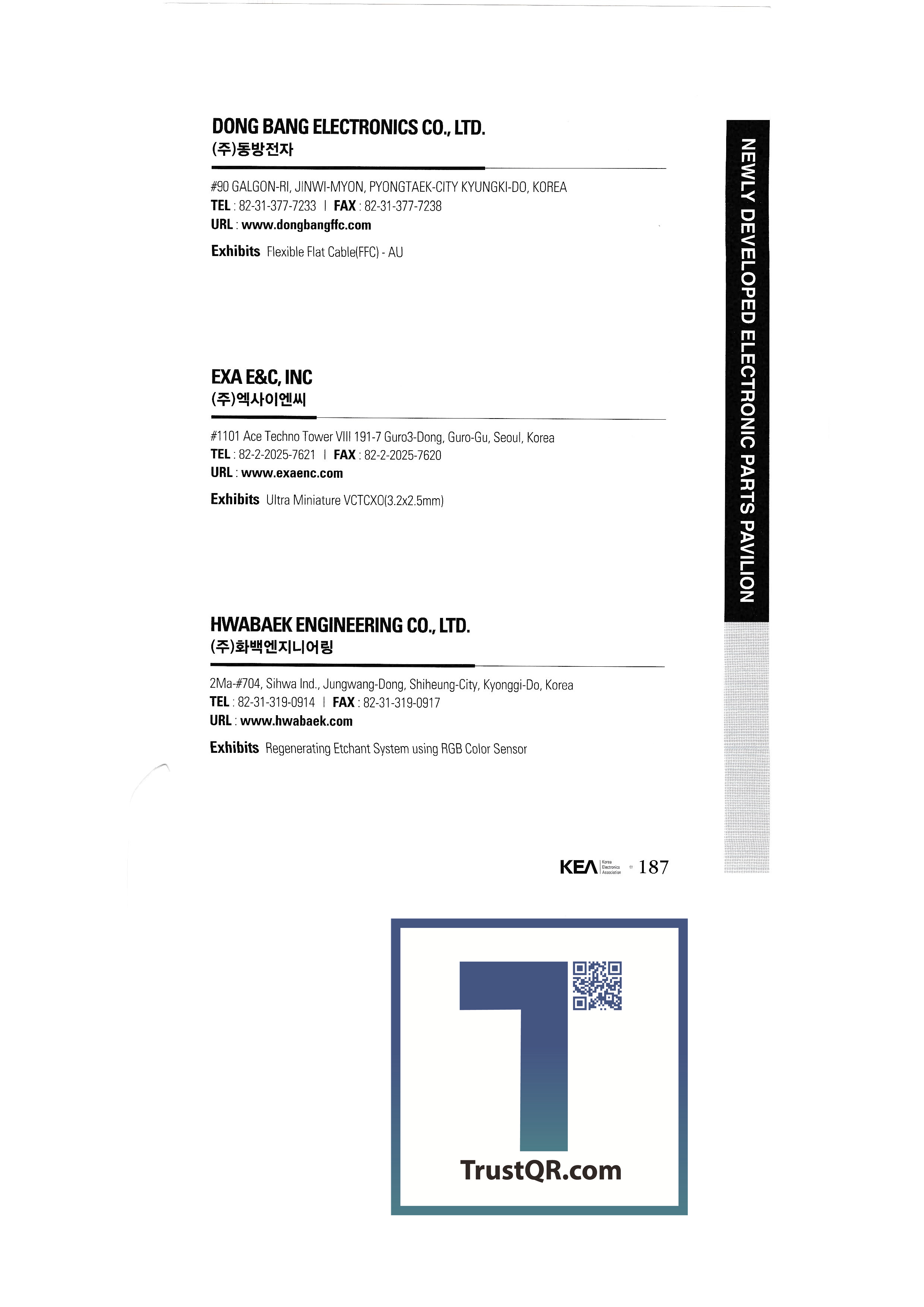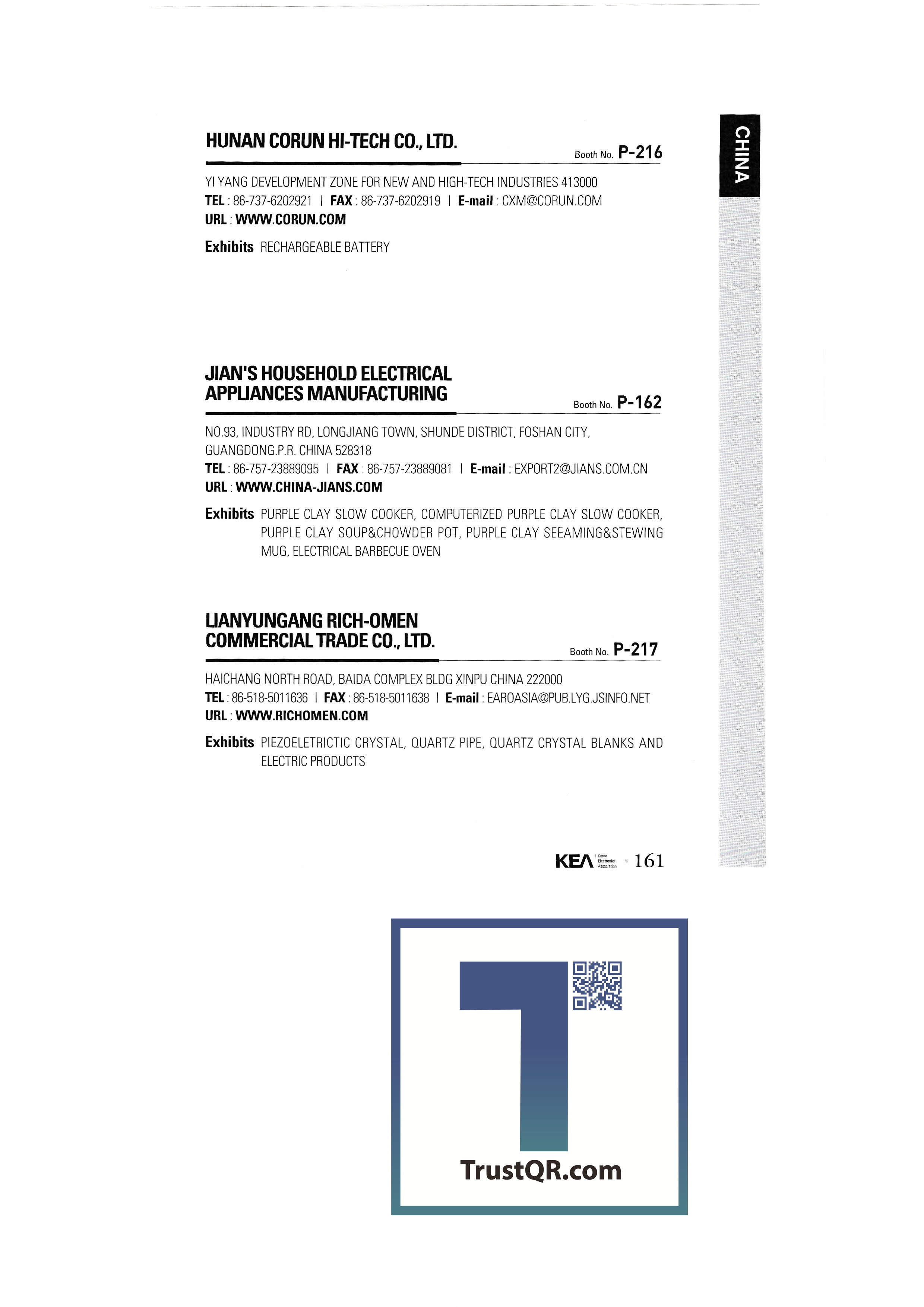 AAC ACOUSTIC TECHNOLOGIES HOLDINGS INC & YEC ELECTRONICS LTD. BAOTOU HUAZI ELECTRONICS TECHNOLOGY CO., LTD. BAOTOU XINHONGDA ELECTRONIC CO., LTD. CHANGZHOU GALAXY ELECTRICAL CO., LTD. CHENGDU SPACEOM ELECTRONICS CO., LTD. CHINA DISPLAY TECHNOLOGY CO., LTD. CHINA NATIONAL ELECTRONICS IMP & EXP ZHEJIANG CO., LTD. DANYANG HAOYUAN &HUAMIN ELECTRON CO., LTD. DEGSON ELECTRONICS CO., LTD. DONGGUAM SANYOU ELECTRICAL APPLIANCES CO ., LTD. DONGGUAM WAFE HARDWARE ELECTRONICS CO., LTD. DONGYANG JINMA MAGNET CO., LTD. ENPING AOERSI DIGITAL SCIENCE AND TECHNOLOGY ELECTRON CO., LTD. ENPING HENGDA ELECTRONIC INDUSTRY CO., LTD. ENPING MISHA ELECTRONIC CO., LTD. HAN'S LASER TECHNOLOGY CO., LTD. HISAUN INDUSTRIES CO., LTD. HUGELENT TELECOMMUNICATION (SUZHOU) CO., LTD. HUNAN CORUN HI-TECH CO.,LTD. JIAN'S HOUSEHOLD ELECTRICAL APPLIANCESS MANUFACTURING LIANYUNGANG RICH-OMEN COMMERCIAL TRADE CO., LTD. NENSHI COMMUNICATION EQUIPMENT CO., LTD. NEW STAR MAGNETS CO., LTD. NINGBOCHARM AUDIO CO.,LTD. NINGBO FORWARD RELAY CORPORATION NINGBO RI-DA ELECTRIC APPLIANCE CO., LTD. NINGBO STRONG MAGNETS CO., LTD. NINGBO YANG GUANG AULI ELECTRONICS APPLIANCE CO., LTD. SHANGYU JINTAO ELECTRON CO.,LTD. SHANTOU GOWORLD DISPLAY CO., LTD. SHENZHEN DIGUANG ELECTRONICS CO.,LTD SHENZHEN HIGHPOWER TECHNOLOGY CO.,LTD. SHENZHEN JINGHUA DISPLAYS. CO., LTD. SHENZHEN JINGRUI INDUSTRY CO., LTD. SHENZHEN JINKE SPECIAL MATERIALS CO., LTD. SHENZHEN SUCCESS ELECTRONIC CO., LTD. SHENZHEN SUNLORD ELECTRONICS CO., LTD. SHOWA INDUSTRIES (SHANGHAI) LTD. SINHUA ELECTRONICS (SHANGHAI) CO., LTD. START MUSICAL INSTRUMENT (HANGZHOU) MANUFACTORY TIANJIN TONG GUANG GROUP DIGITAL COMMUNUCATION CO., LTD. UNIVERSAL (CHANGZHOU) ELECTRONICS CO., LTD. WENZHOU YIHUA COMMUNICATED CONNECTOR CO.,LTD. WORLD TRADE INFORMATION OF MACHINELECTRONICS WUHAN LIXING POWER SOURCES CO., LTD. XIAMEN FREQUENCY-TECH ELECTRONICS CO.,LTD. XIAMEN GUANGPU ELECTRONICS CO., LTD. XIAMEN OCULAR LCD DEVICES CO.,LTD. YUEQING GREAT ELECTRONICS CO., LTD. YUEQING ZHONGZHOU ELECTRONICS. CO., LTD. ZHEJIANG INNUOVO MAGNETICS CO.,LTD. ZHEJIANG JIAKANG ELECTRONICS CO., LTD. ZHEJIANG TIANTONG ELECTRONICS CO., LTD. ZHEJIANG YUEHUA TELECOMMUNICATION CO., LTD. A-BRIGHT INDUSTRICAL CO., LTD. CEN LINK CO., LTD. GOOD WILL INSTRUMENT CO., LTD. HI-LIGHT ELECTRONIC CO., LTD. KUNMING ELECTRONICS CO., LTD. SUN-LIGHT ELECTRONIC TECHNOLOGIES INC. TAIWAN ELECTRICAL AND ELECTRONIC MANUFACTURERS' ASSOCIATION(TEEMA) TRANYOUNG TECHNOLOGY CORP. ZAWARD CORPORATION Abiko Electronics Co., Ltd. A&P Telecom Co., Ltd. Ana Pass Co., Ltd. Bujeon Electronic Components Co., Ltd. Celluon Co., Ltd. Crucial Tech Co., Ltd. Dongbang Electronics Co., Ltd. ExCNC Co., Ltd. Hwabaek Engineering Co., Ltd. Intotech Co., Ltd. IOCELL Co., Ltd. Written by KC Corporation Kyungwon Enterprise Co., Ltd. Mecus Co., Ltd. Maxpo Co., Ltd. MS Solution Co., Ltd. M-Tekvision NexG Telecom Co., Ltd. Next Chip Co., Ltd. Patnick Pilco Electronics Co., Ltd. PnP Network Co., Ltd. RBC Inc. Samjin LND Shinsung Lux Technology Co., Ltd. Korea Sprite Co., Ltd. Take Tech Co., Ltd. Tsio Corporation Union Electronics Eroom Electronics Zalman Tech Co., Ltd. |