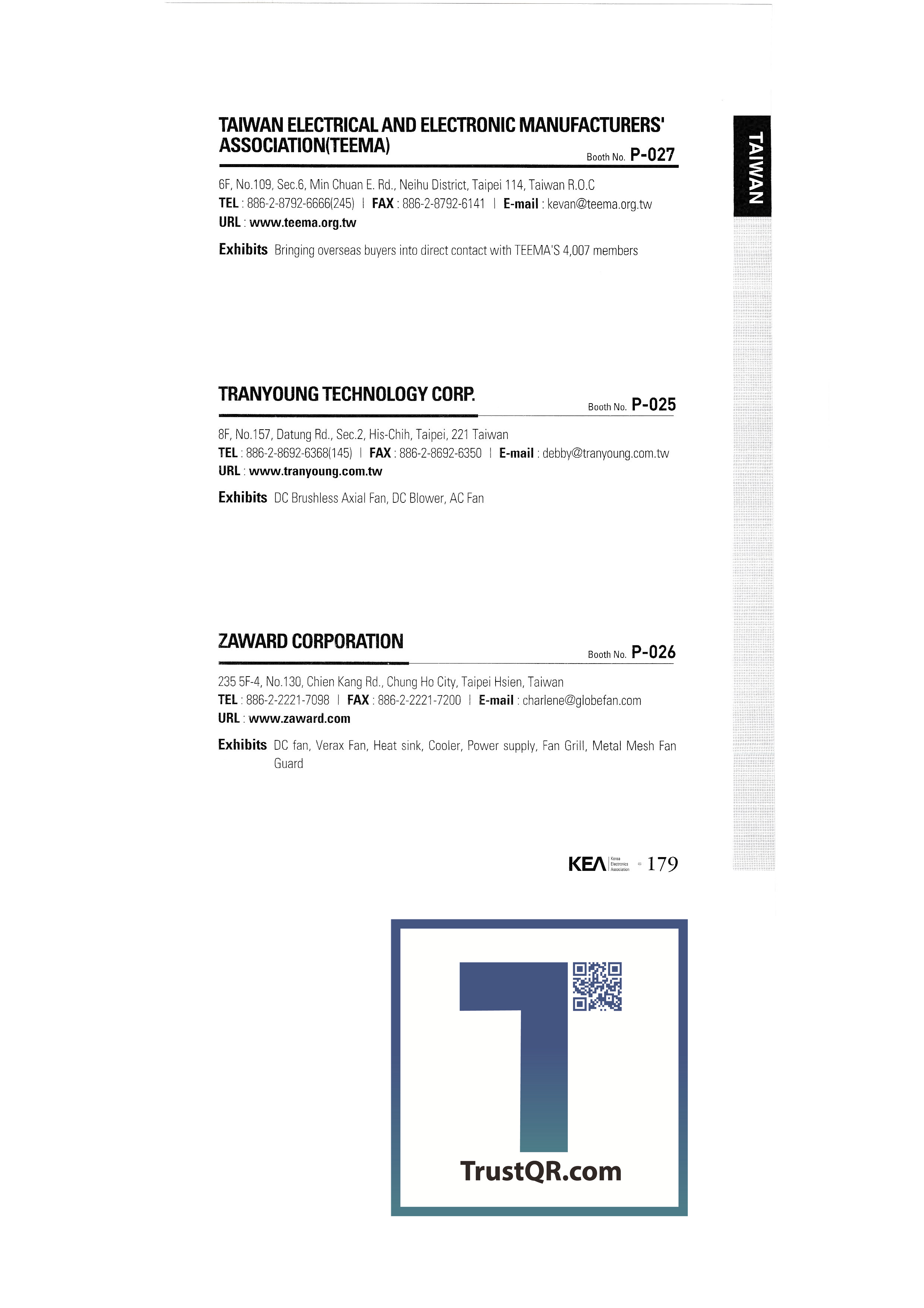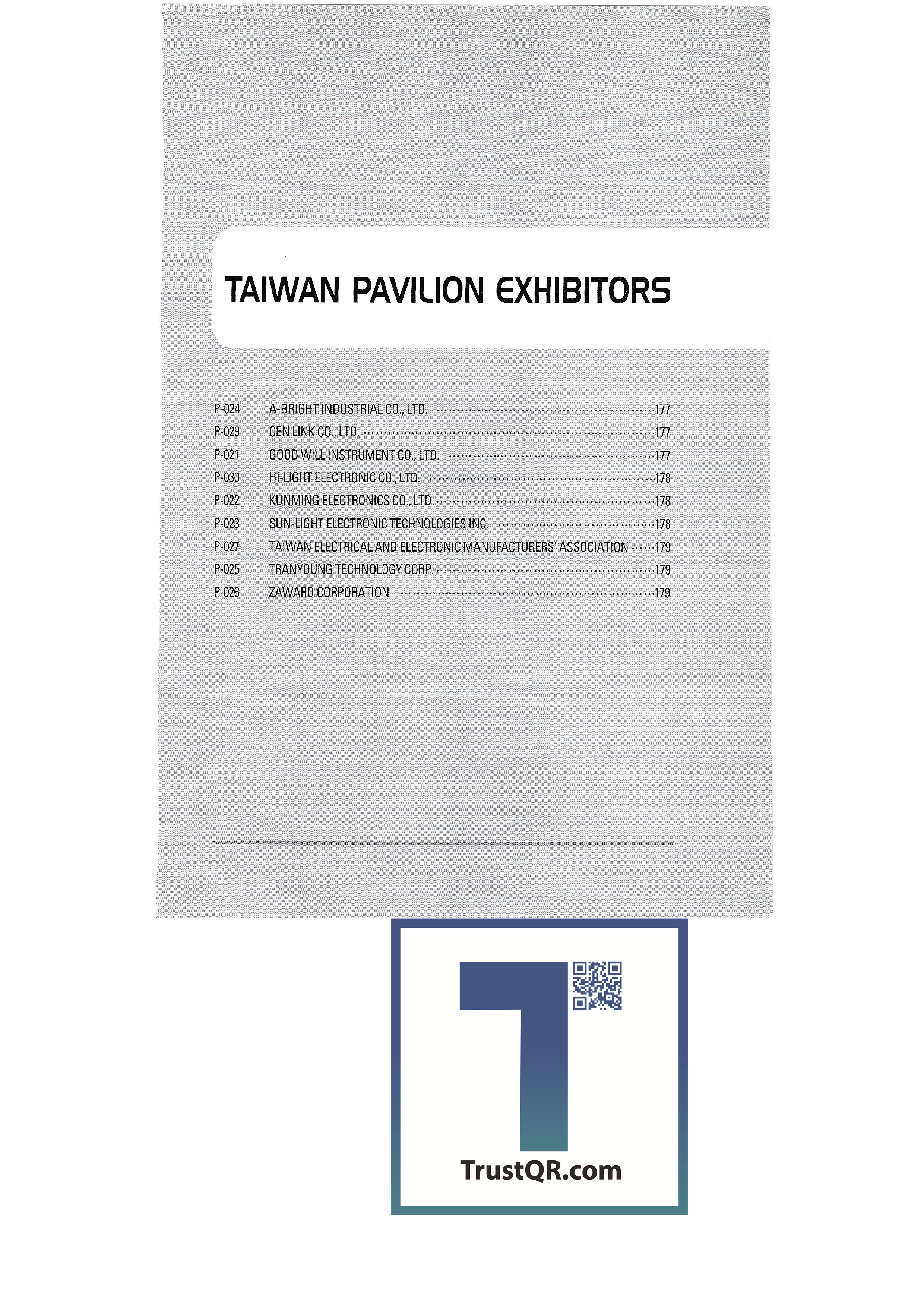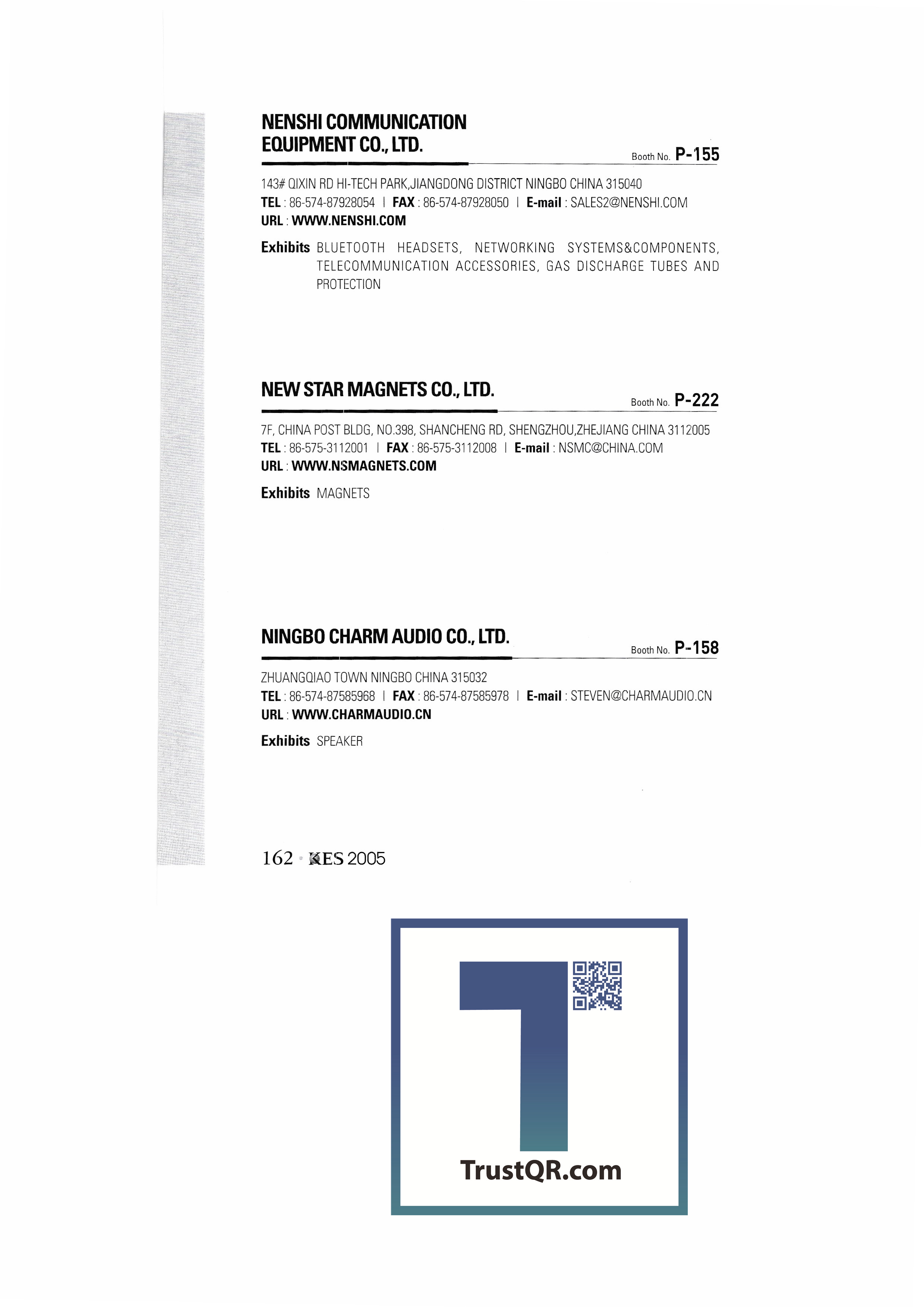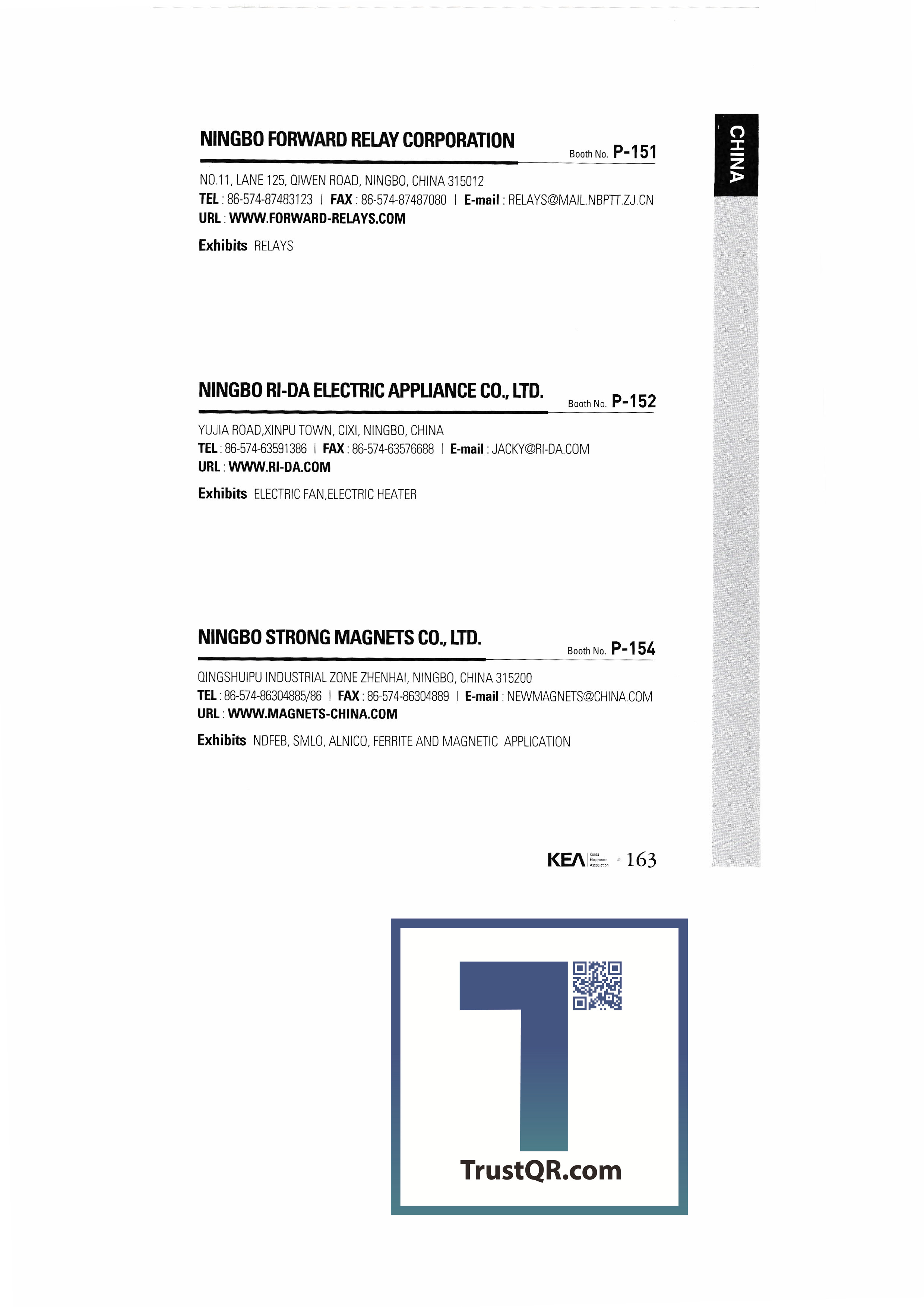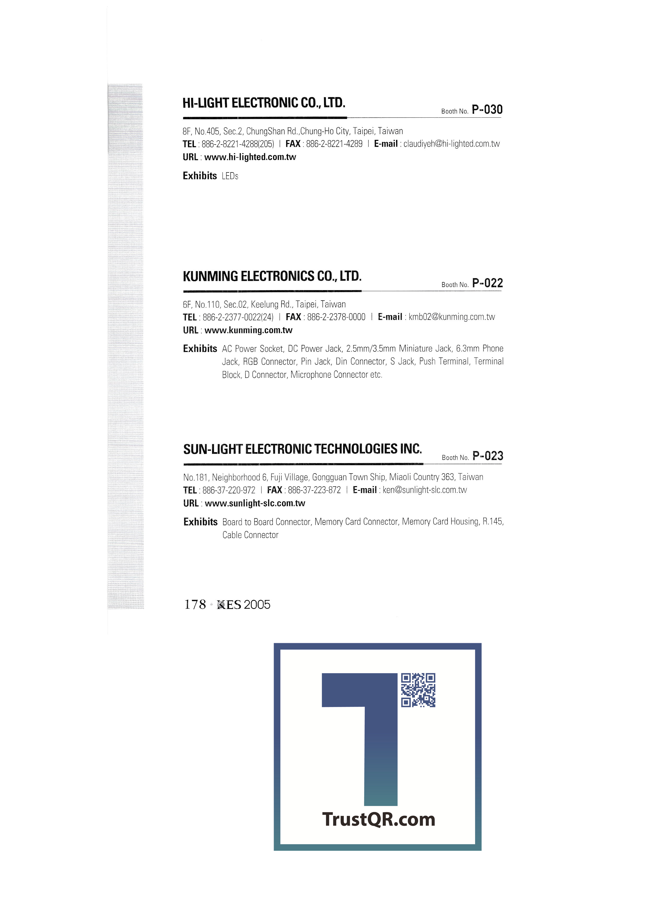 AAC ACOUSTIC TECHNOLOGIES HOLDINGS INC & YEC ELECTRONICS LTD. BAOTOU HUAZI ELECTRONICS TECHNOLOGY CO., LTD. BAOTOU XINHONGDA ELECTRONIC CO., LTD. CHANGZHOU GALAXY ELECTRICAL CO., LTD. CHENGDU SPACEOM ELECTRONICS CO., LTD. CHINA DISPLAY TECHNOLOGY CO., LTD. CHINA NATIONAL ELECTRONICS IMP & EXP ZHEJIANG CO., LTD. DANYANG HAOYUAN &HUAMIN ELECTRON CO., LTD. DEGSON ELECTRONICS CO., LTD. DONGGUAM SANYOU ELECTRICAL APPLIANCES CO ., LTD. DONGGUAM WAFE HARDWARE ELECTRONICS CO., LTD. DONGYANG JINMA MAGNET CO., LTD. ENPING AOERSI DIGITAL SCIENCE AND TECHNOLOGY ELECTRON CO., LTD. ENPING HENGDA ELECTRONIC INDUSTRY CO., LTD. ENPING MISHA ELECTRONIC CO., LTD. HAN'S LASER TECHNOLOGY CO., LTD. HISAUN INDUSTRIES CO., LTD. HUGELENT TELECOMMUNICATION (SUZHOU) CO., LTD. HUNAN CORUN HI-TECH CO.,LTD. JIAN'S HOUSEHOLD ELECTRICAL APPLIANCESS MANUFACTURING LIANYUNGANG RICH-OMEN COMMERCIAL TRADE CO., LTD. NENSHI COMMUNICATION EQUIPMENT CO., LTD. NEW STAR MAGNETS CO., LTD. NINGBOCHARM AUDIO CO.,LTD. NINGBO FORWARD RELAY CORPORATION NINGBO RI-DA ELECTRIC APPLIANCE CO., LTD. NINGBO STRONG MAGNETS CO., LTD. NINGBO YANG GUANG AULI ELECTRONICS APPLIANCE CO., LTD. SHANGYU JINTAO ELECTRON CO.,LTD. SHANTOU GOWORLD DISPLAY CO., LTD. SHENZHEN DIGUANG ELECTRONICS CO.,LTD SHENZHEN HIGHPOWER TECHNOLOGY CO.,LTD. SHENZHEN JINGHUA DISPLAYS. CO., LTD. SHENZHEN JINGRUI INDUSTRY CO., LTD. SHENZHEN JINKE SPECIAL MATERIALS CO., LTD. SHENZHEN SUCCESS ELECTRONIC CO., LTD. SHENZHEN SUNLORD ELECTRONICS CO., LTD. SHOWA INDUSTRIES (SHANGHAI) LTD. SINHUA ELECTRONICS (SHANGHAI) CO., LTD. START MUSICAL INSTRUMENT (HANGZHOU) MANUFACTORY TIANJIN TONG GUANG GROUP DIGITAL COMMUNUCATION CO., LTD. UNIVERSAL (CHANGZHOU) ELECTRONICS CO., LTD. WENZHOU YIHUA COMMUNICATED CONNECTOR CO.,LTD. WORLD TRADE INFORMATION OF MACHINELECTRONICS WUHAN LIXING POWER SOURCES CO., LTD. XIAMEN FREQUENCY-TECH ELECTRONICS CO.,LTD. XIAMEN GUANGPU ELECTRONICS CO., LTD. XIAMEN OCULAR LCD DEVICES CO.,LTD. YUEQING GREAT ELECTRONICS CO., LTD. YUEQING ZHONGZHOU ELECTRONICS. CO., LTD. ZHEJIANG INNUOVO MAGNETICS CO.,LTD. ZHEJIANG JIAKANG ELECTRONICS CO., LTD. ZHEJIANG TIANTONG ELECTRONICS CO., LTD. ZHEJIANG YUEHUA TELECOMMUNICATION CO., LTD. A-BRIGHT INDUSTRICAL CO., LTD. CEN LINK CO., LTD. GOOD WILL INSTRUMENT CO., LTD. HI-LIGHT ELECTRONIC CO., LTD. KUNMING ELECTRONICS CO., LTD. SUN-LIGHT ELECTRONIC TECHNOLOGIES INC. TAIWAN ELECTRICAL AND ELECTRONIC MANUFACTURERS' ASSOCIATION(TEEMA) TRANYOUNG TECHNOLOGY CORP. ZAWARD CORPORATION Abiko Electronics Co., Ltd. A&P Telecom Co., Ltd. Ana Pass Co., Ltd. Bujeon Electronic Components Co., Ltd. Celluon Co., Ltd. Crucial Tech Co., Ltd. Dongbang Electronics Co., Ltd. ExCNC Co., Ltd. Hwabaek Engineering Co., Ltd. Intotech Co., Ltd. IOCELL Co., Ltd. Written by KC Corporation Kyungwon Enterprise Co., Ltd. Mecus Co., Ltd. Maxpo Co., Ltd. MS Solution Co., Ltd. M-Tekvision NexG Telecom Co., Ltd. Next Chip Co., Ltd. Patnick Pilco Electronics Co., Ltd. PnP Network Co., Ltd. RBC Inc. Samjin LND Shinsung Lux Technology Co., Ltd. Korea Sprite Co., Ltd. Take Tech Co., Ltd. Tsio Corporation Union Electronics Eroom Electronics Zalman Tech Co., Ltd. |