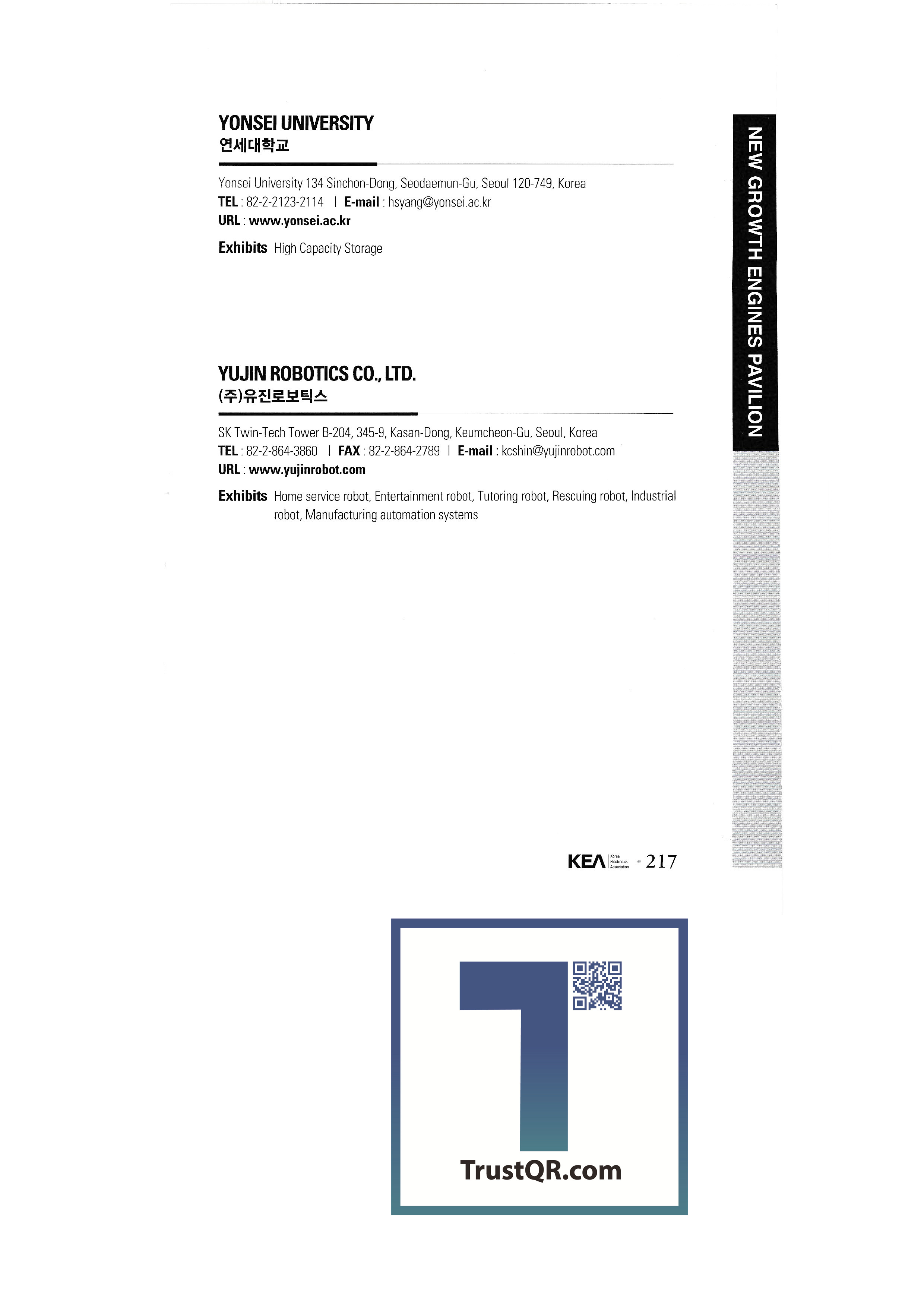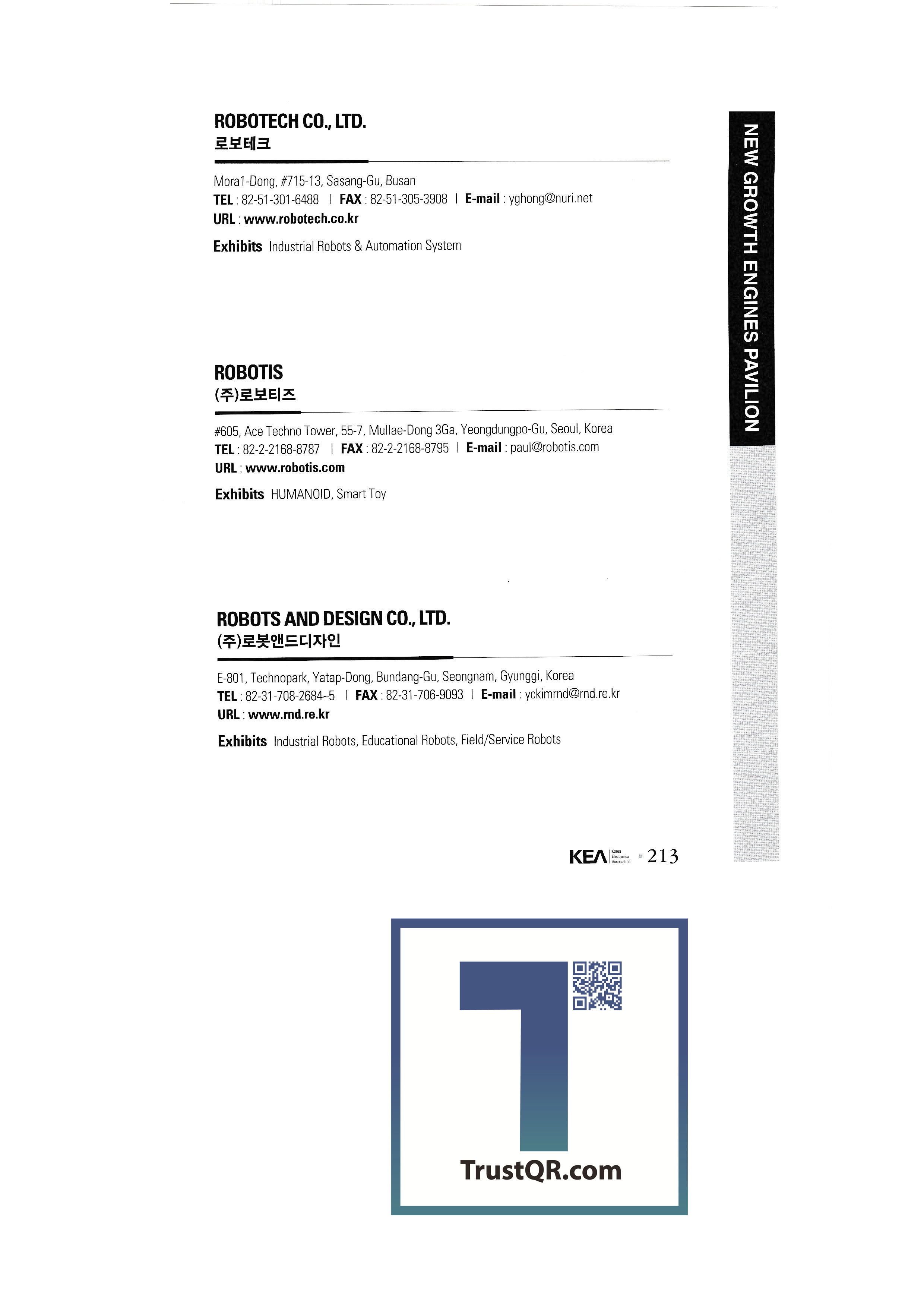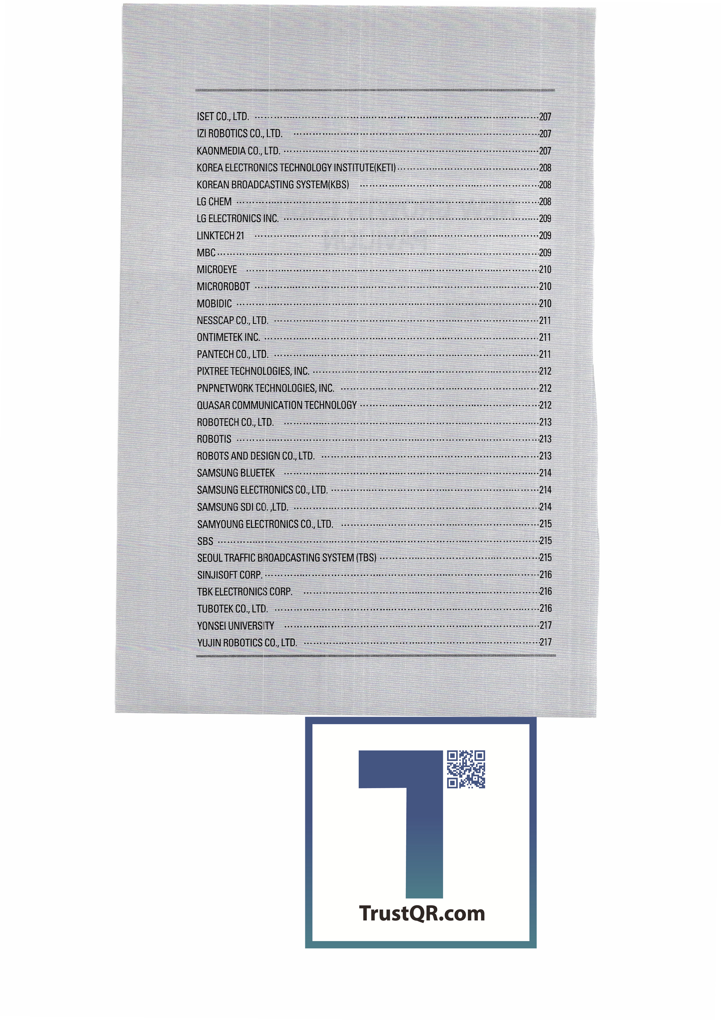 Ace Tech Air code Alticast Asia Pacific Satellite Industry Co., Ltd. Korea Battery Research Association Serings Co., Ltd. Daewoo Electronics Co., Ltd. DM Technology Dooshin Electronics Mthiomega Inc. Inweiser Co., Ltd. Ere Electronics Industry Co., Ltd. EJEX Co., Ltd. Freesat Co., Ltd. Sky Eye Co., Ltd. Hyundai Autonet IB Photonics Co., Ltd. ICantec Eyeset Co., Ltd. Easy Robotics Co., Ltd. Gaon Media Co., Ltd. Electronic Components Research Institute Korea Broadcasting LG Chemical LG Electronics Link Tech 21 MBC Micro eye Micro Robot Co., Ltd. Moby Dick Nescap On Time Tech Pantech Pixtree Co., Ltd. PnP Network Quasar Korea Robotech ROBOTIS Co., Ltd. Robot & Design Co., Ltd. Samsung Bluetech Co., Ltd. Samsung Electronics Co., Ltd. Samsung SD Co., Ltd. Samyoung Electronics Co., Ltd. SBS SEOUL TRAFFIC BROADCASTING SYSTEM (TBS) Shinji Soft TBK Electronics Turbo Tech Yonsei University Eugene Robotics Co., Ltd. |