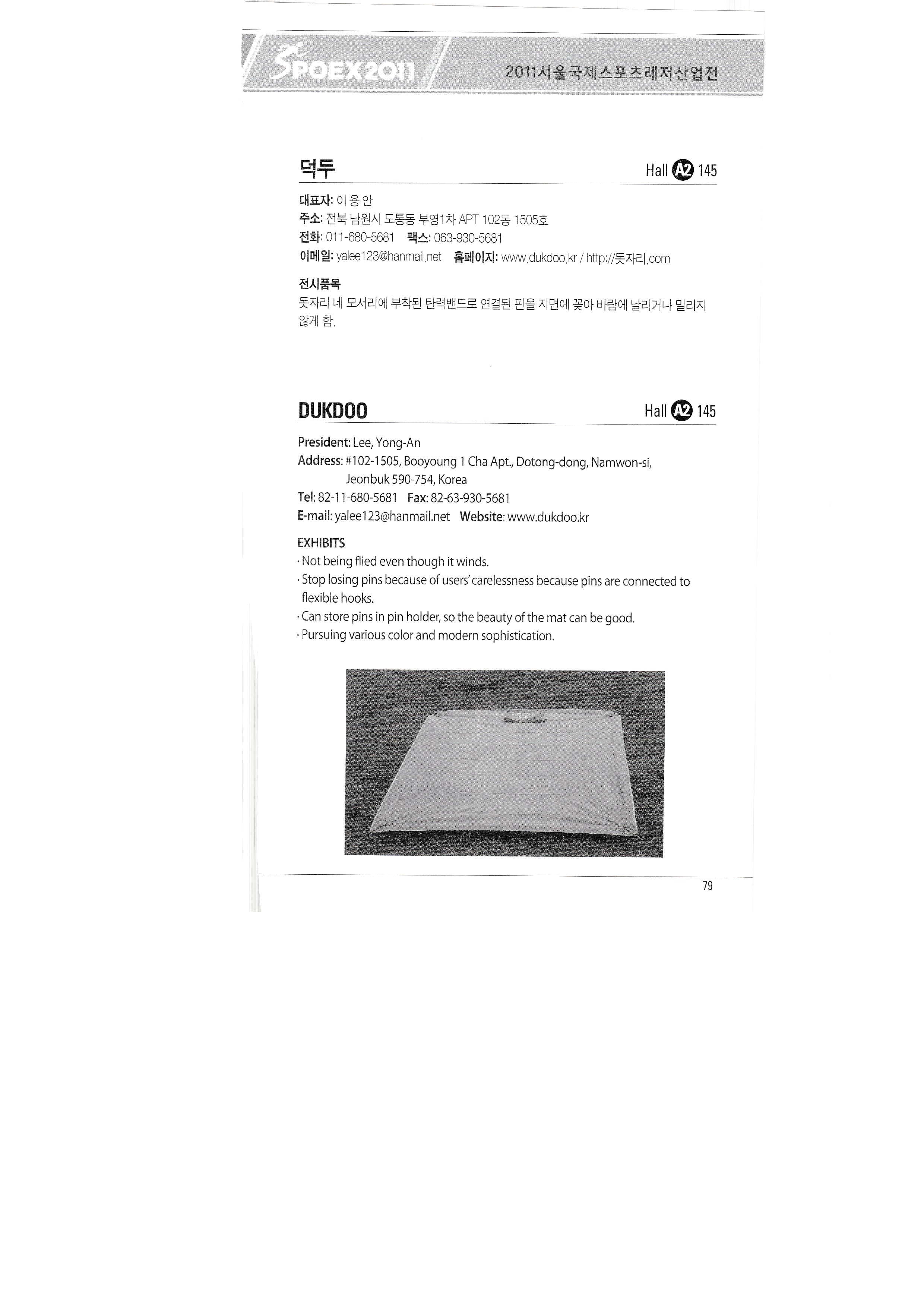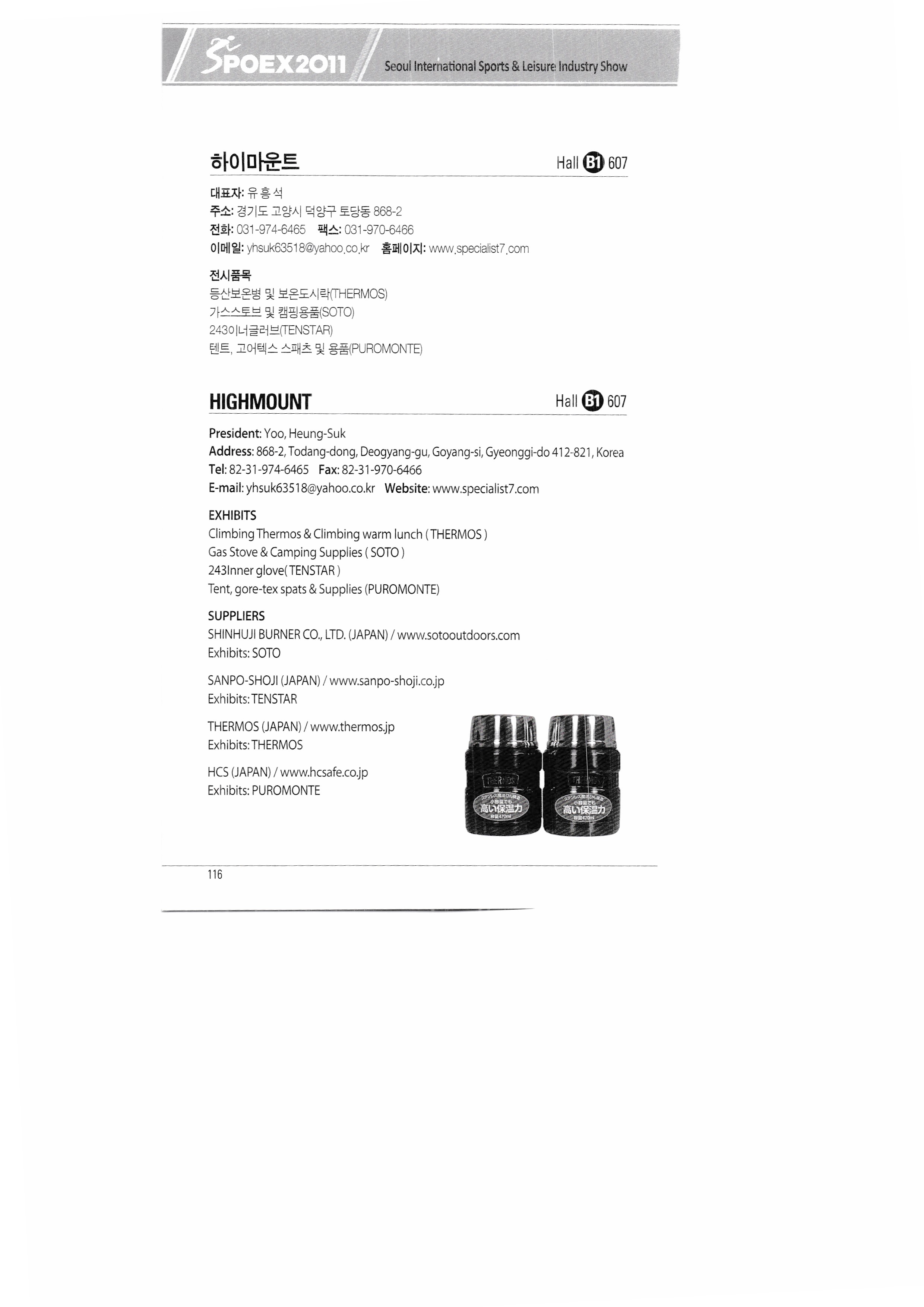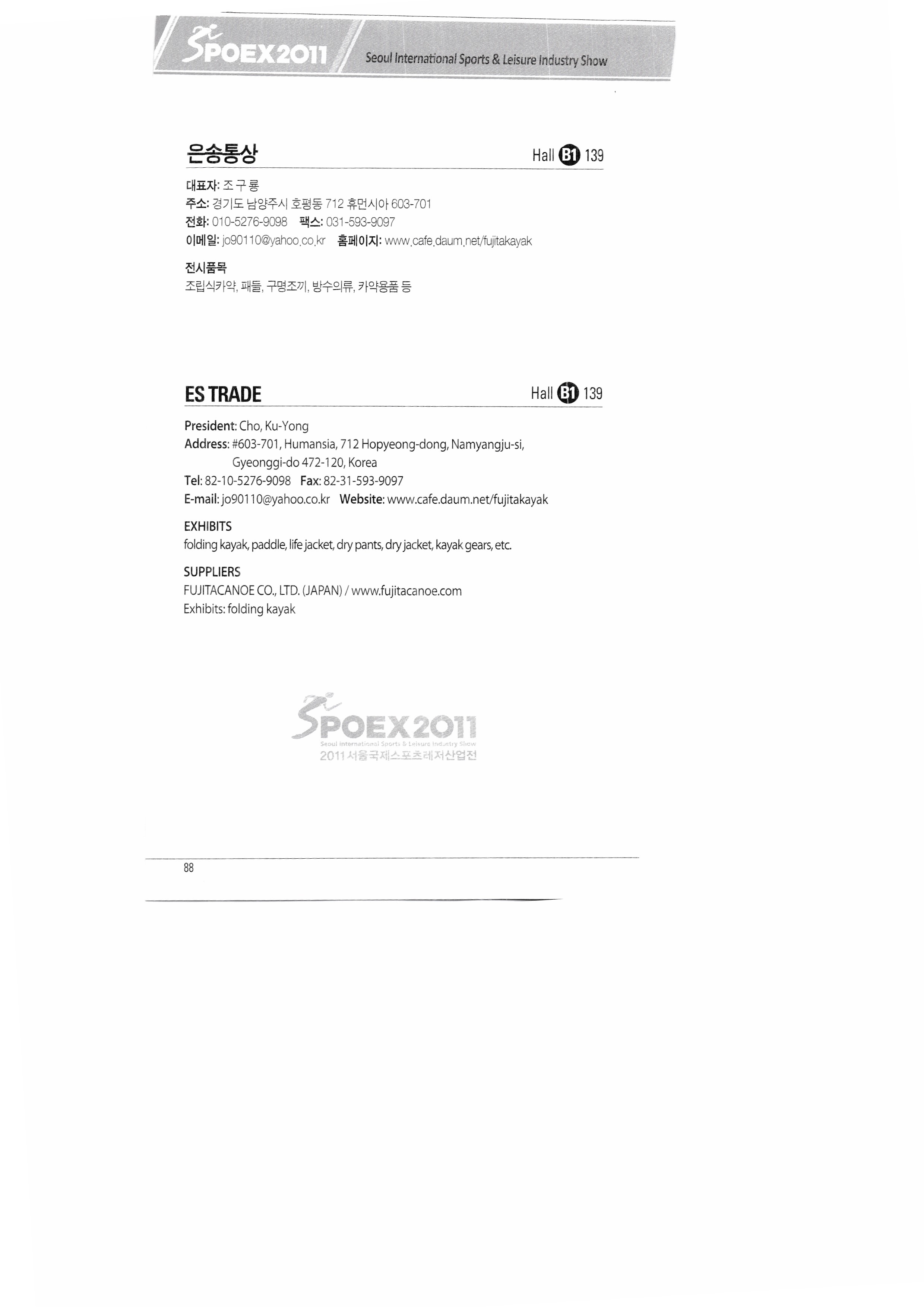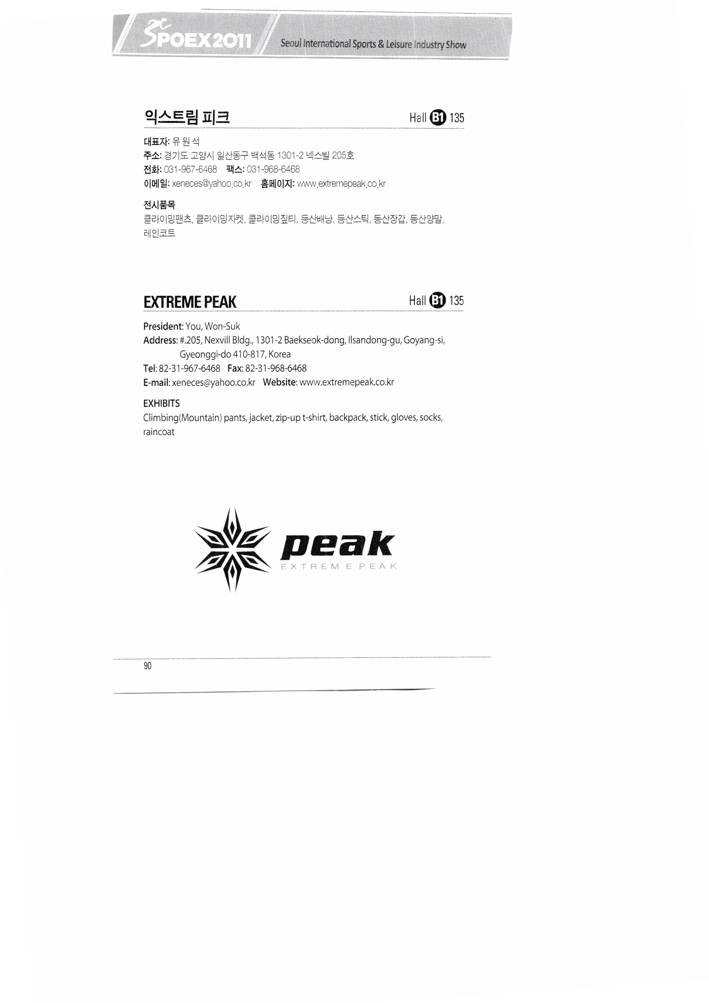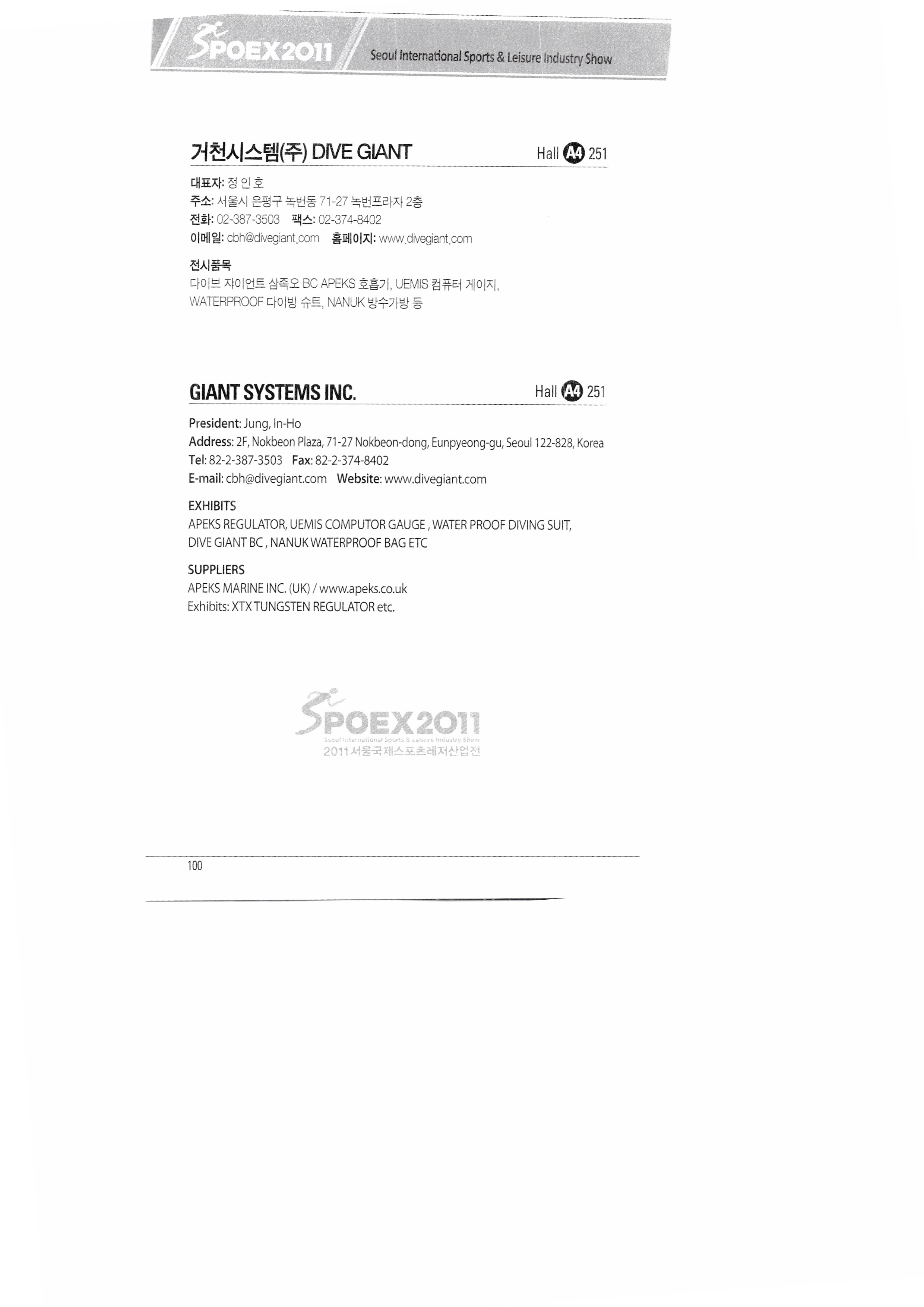 | 디에스유 덕두 ㈜두성기술 에코드림 ㈜에코그라운드 ㈜엑시코 이랜드체육산업㈜ 에너바이크 ㈜앙투카 ㈜에픽소프트 은송통상 에버그린아이앤디 익스트림 피크 ㈜준우 ㈜필드테크 필드터프승목㈜ ㈜대원포티스 ㈜파인엠 지지㈜ 갤러리에스 ㈜강가산 게이트웨이옵티칼 거천시스템㈜DIVE GIANT 글로스텍㈜ 굿 다이버 ㈜지피에이코리아 GULL 스포츠 해저2만리 ㈜학산/비트로 헬시온코리아 하나프라자 ㈜한강스포츠 한미상사 HARTUNG BOUFFAY ㈜에이치베네슈 H캔두스 ㈜헬스원 헤븐2리조트 하이마운트 ㈜에이치케이 필라테스 ㈜에이치앤비 |