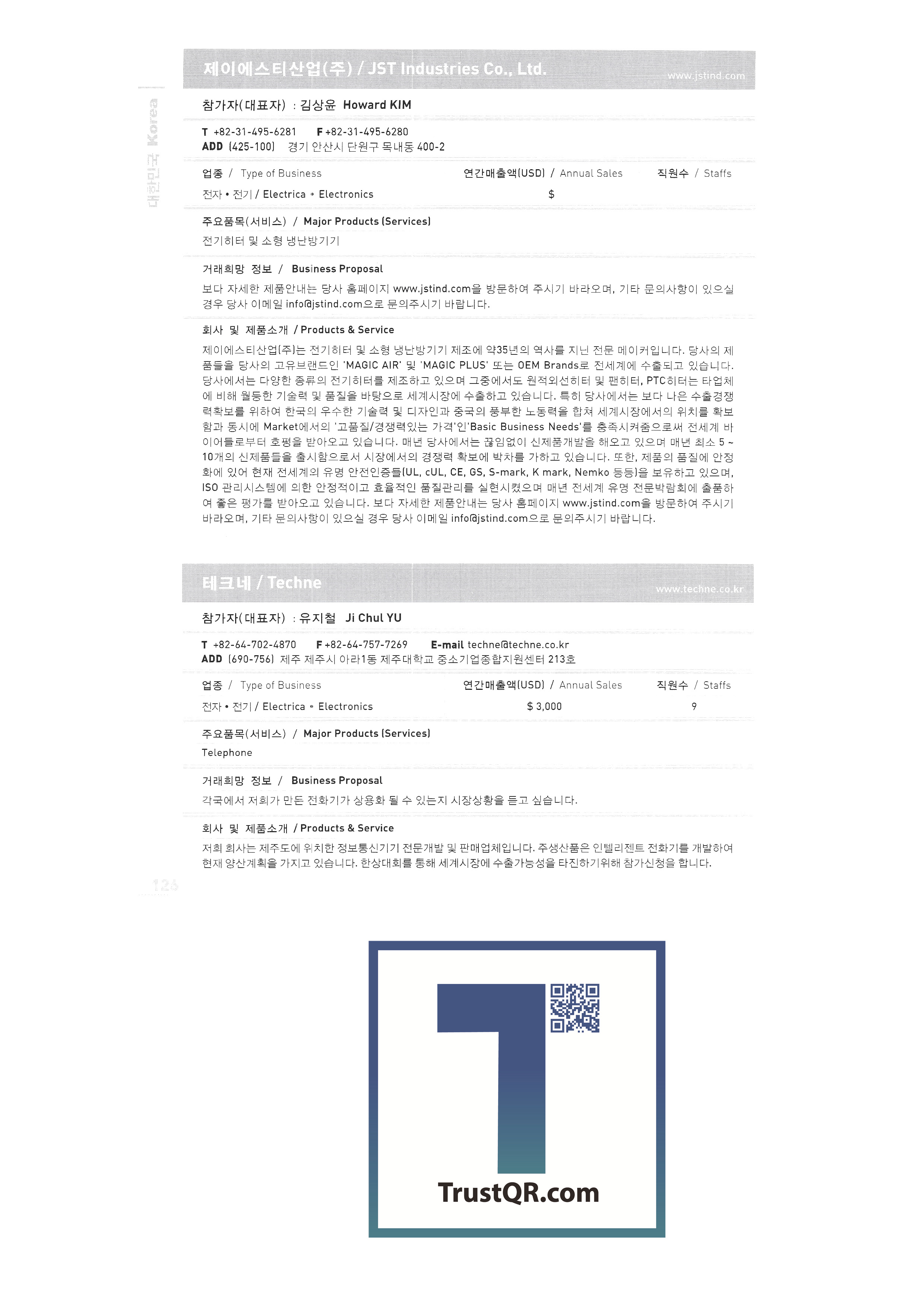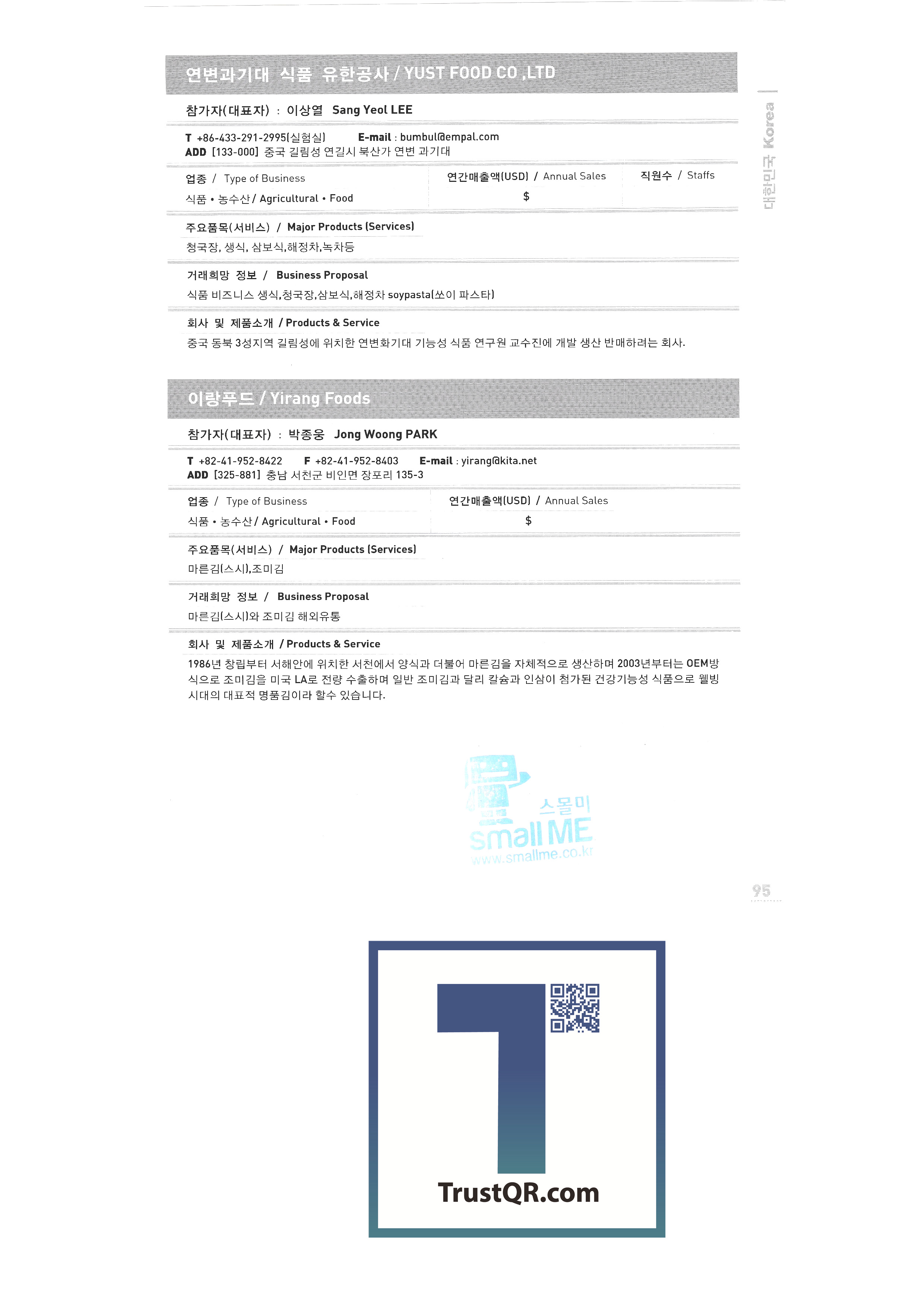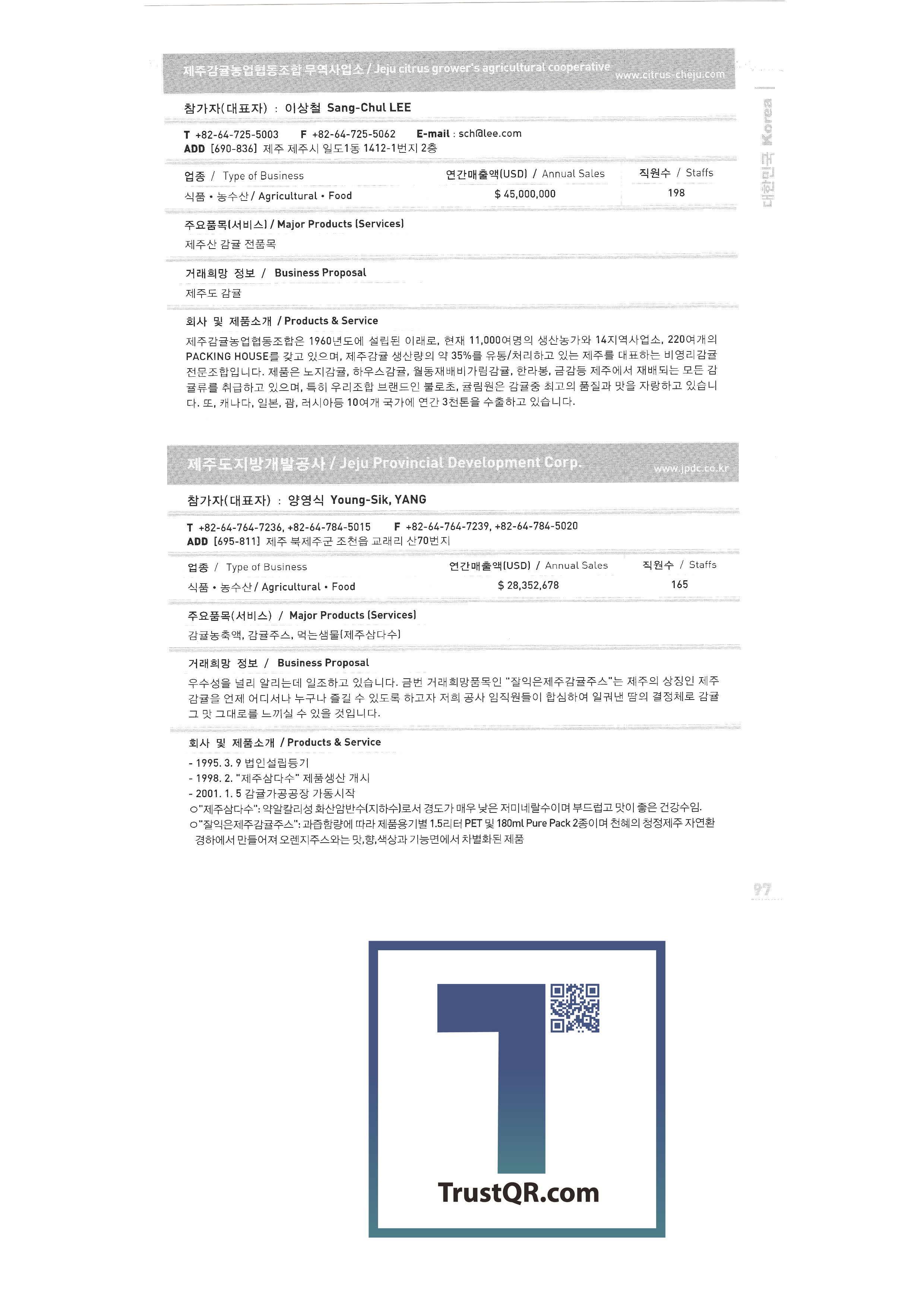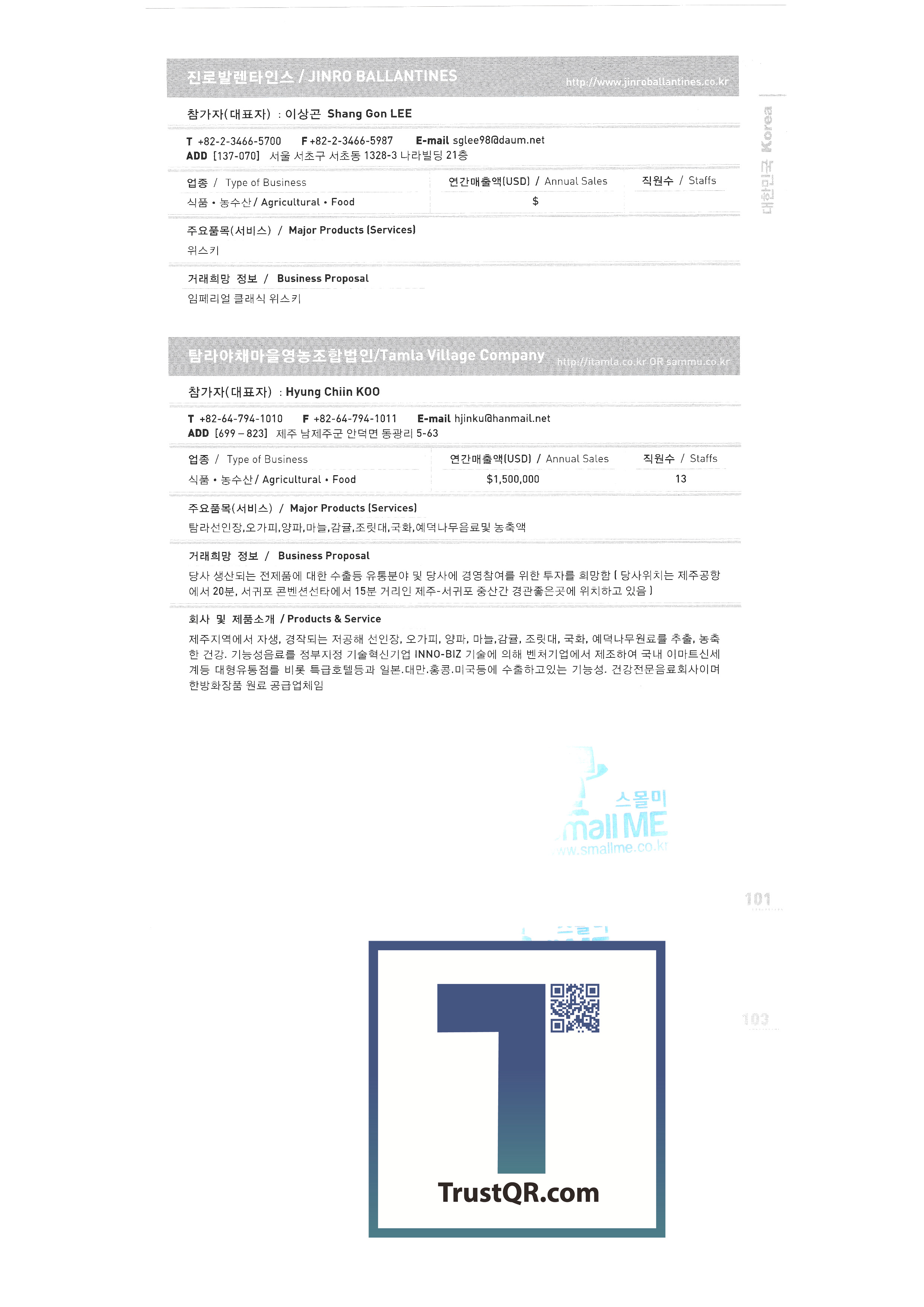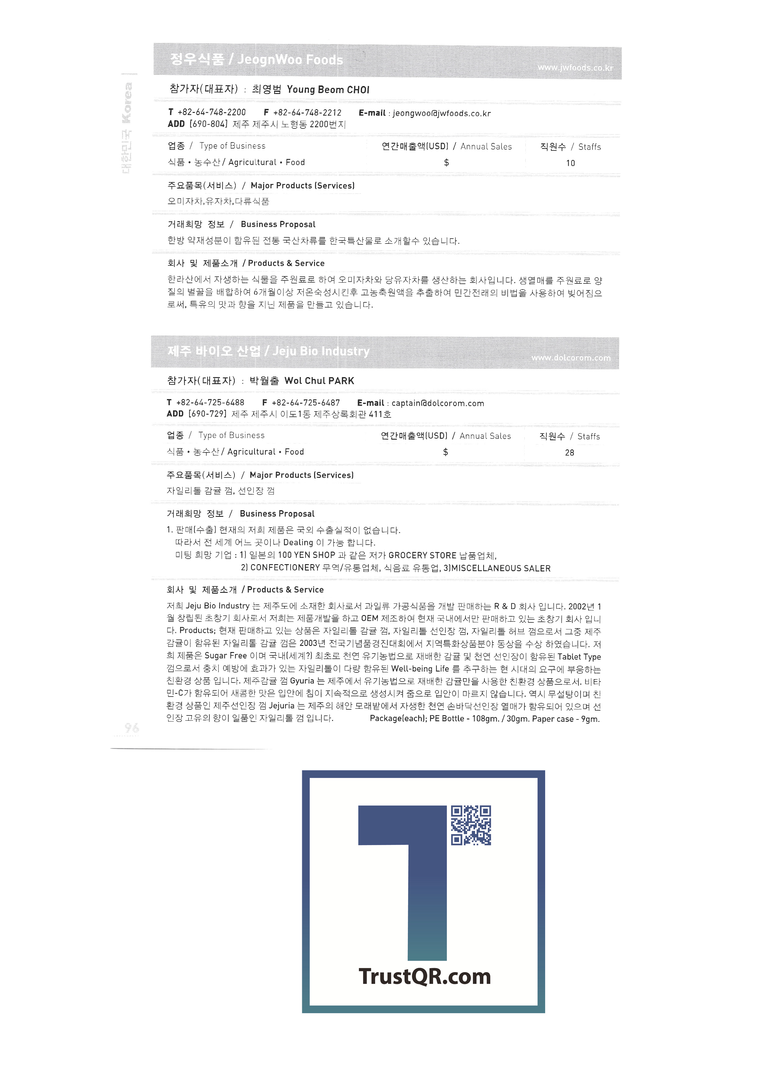 Midang Food Service Division Biotech Co., Ltd. Samshin ginseng processing farming association Seojeong Traditional Food Altien Yanbian University of Science and Technology Food Co., Ltd. Mockup food Jungwoo Food Jeju Bio Industry Jeju Citrus Agricultural Cooperative Trade Office Jeju Regional Development Corporation Jeju Fisheries Logistics Co., Ltd. Jeju Natural Food Jeju Special Products Jirisan Solsongju Jinro Valentine Tamra Vegetable Village Farming Association Taelim Corporation Fermentec Korea Stevia Happy Story Co., Ltd. Maekyung bias guide Daewoo Environment Industry Co., Ltd. Hair Science Co., Ltd. Geonpoong Bio Co., Ltd. Nuri Tech I&C Biomex Co., Ltd. Marine Product Tech Co., Ltd. Doul Healthcare Best World Industry Co., Ltd. Sticks Co., Ltd. IV Food Co., Ltd. Ames Phil Co., Ltd. Hair Science Co., Ltd. Jeju Love Co., Ltd. BH Biotech Daewon Carbontech Daehan Median Co., Ltd. Divia Korea Libopia Co., Ltd. Bio Spectrum Co., Ltd. Revival Medical Jeju National University Hospital OBS Co., Ltd. Now CheilJedang Special Edition Galaxy Corporation Jinduk Biotech Co., Ltd. Hasung Electronics Korea Latex Industry Co., Ltd. Health Life Morning Art Co., Ltd. Itel Korea Co., Ltd. WIZLUX Co., Ltd. EasyM Tech Co., Ltd. Jinwoo Hi-Tech Co., Ltd. Offer Electronics Inc. Sun Heindust Rani Industry Co., Ltd. JST Industry Co., Ltd. Techne Tongseong Unemployment Ipilsonic Good Telecom Co., Ltd. Mirae Innovation Co., Ltd. Nupinet Invest Club Siri Corporation Qtel Soft Co., Ltd. Rubins Samsung SDS Seoul Digital University You's One Co., Ltd. U platform Nexmobile Co., Ltd. DalK Co., Ltd. Sky UMS Co., Ltd. Faber Nine Rapien Corporation Global Mars Co., Ltd. International Logistics Seyang Ship Accordistics Garam Appraisal Corporation Gwangyang Bay Area Free Economic Zone Authority Kim Miracemusa Sloan Korea Sun Valley |