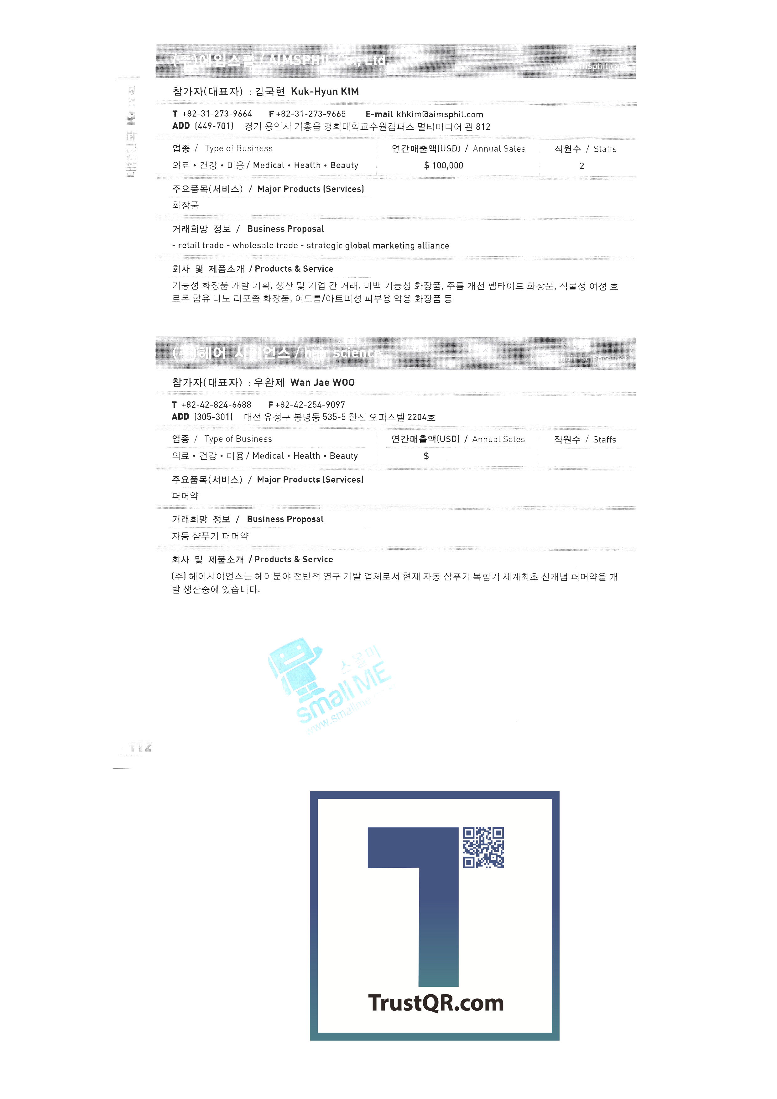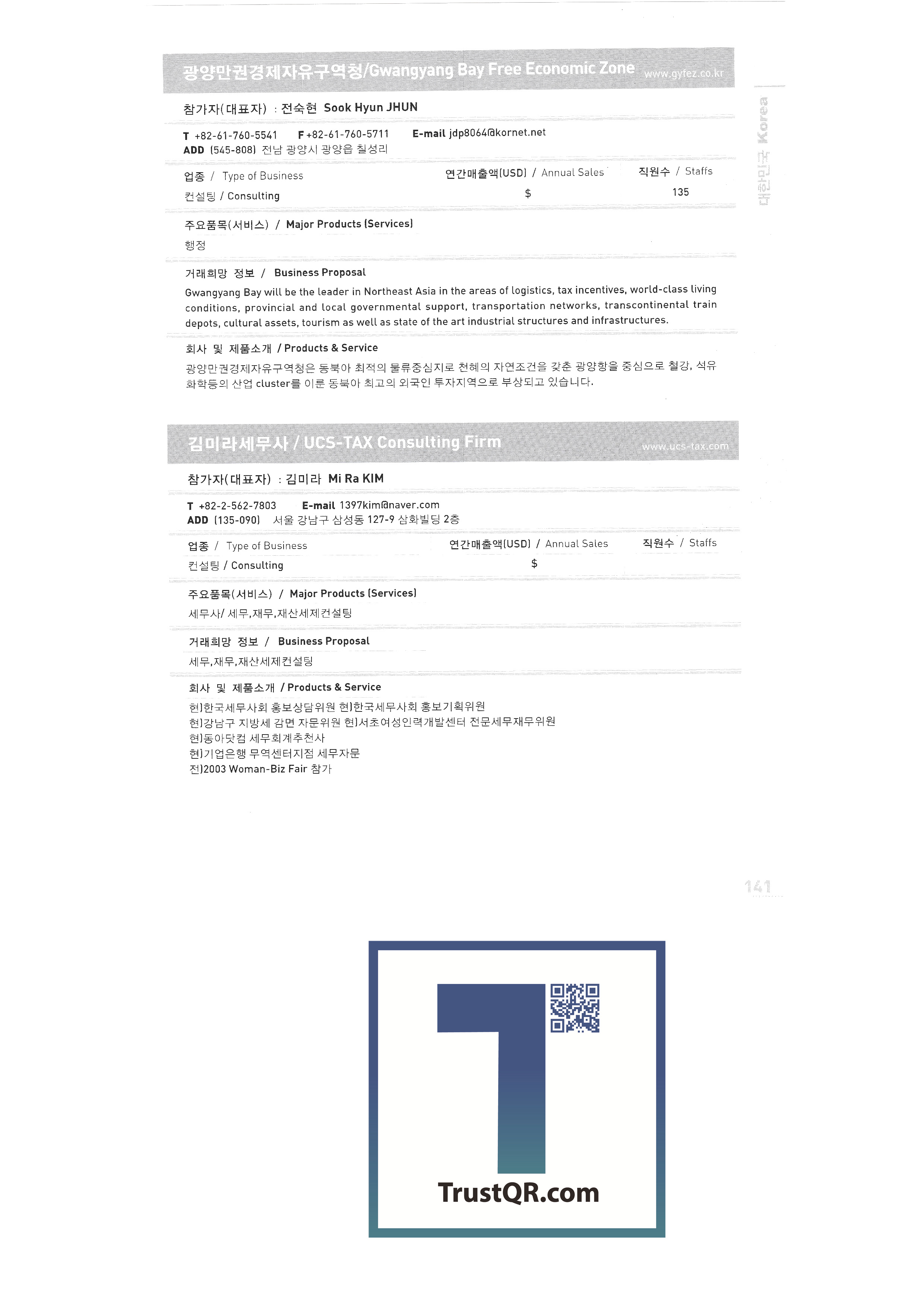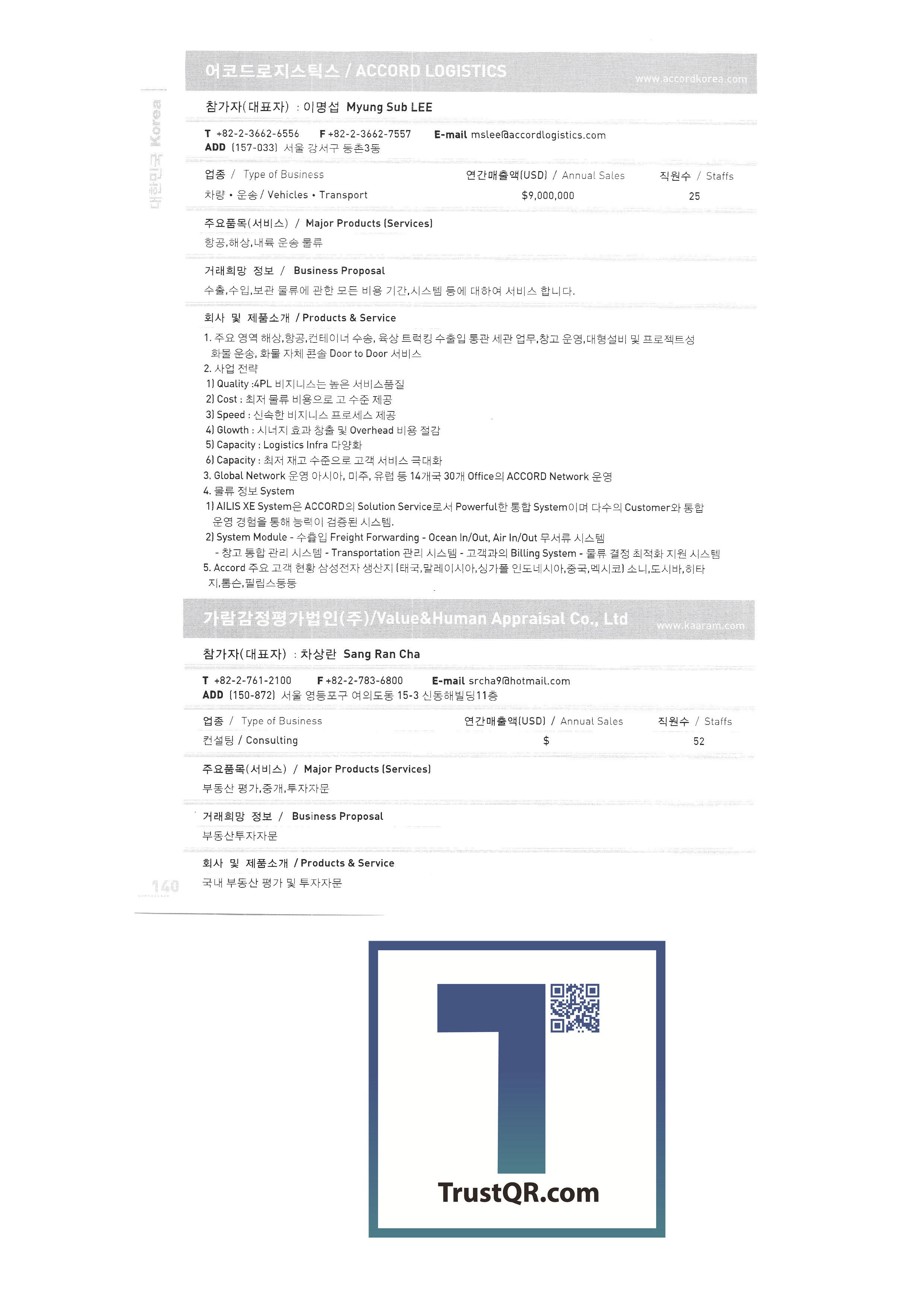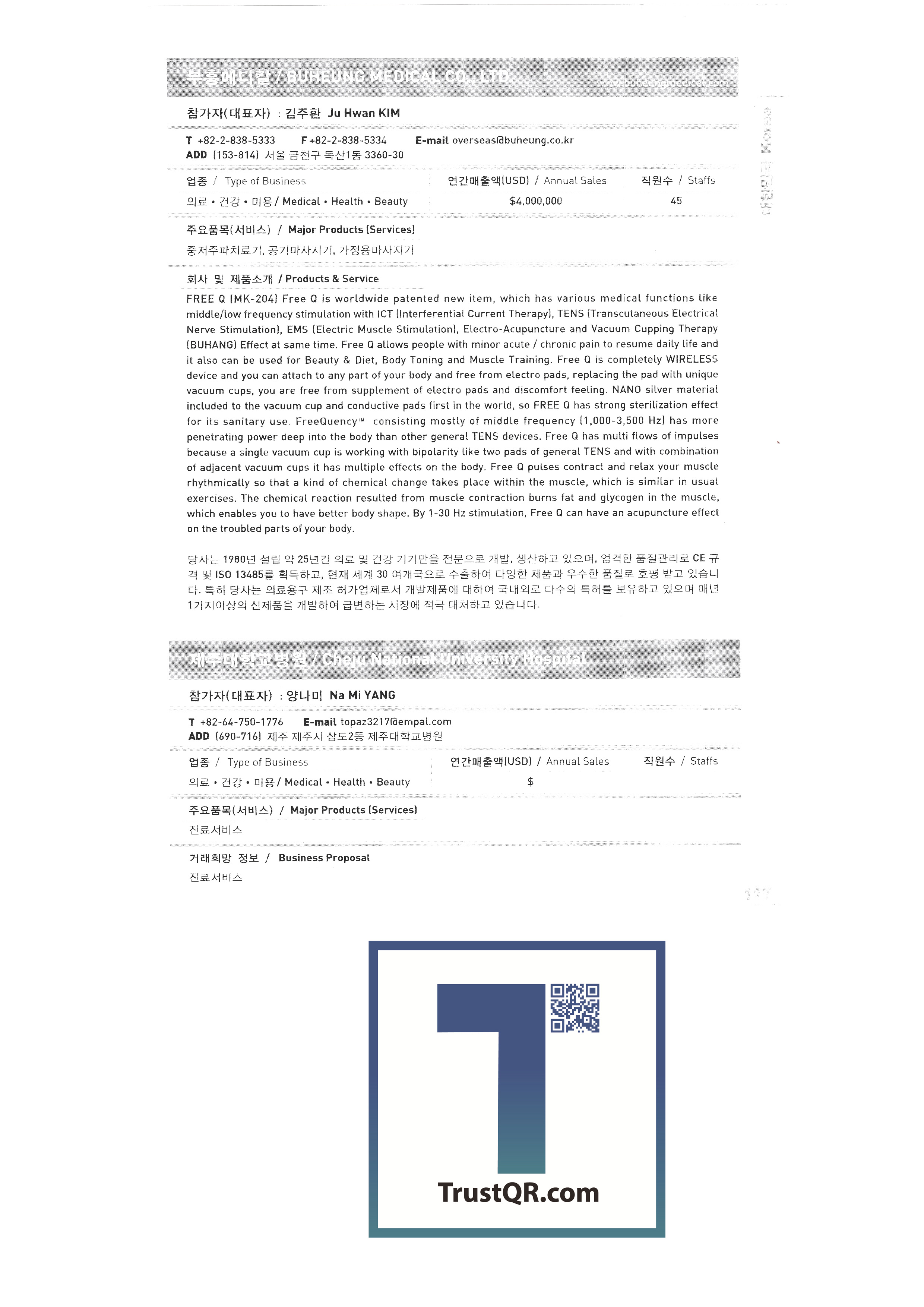 Midang Food Service Division Biotech Co., Ltd. Samshin ginseng processing farming association Seojeong Traditional Food Altien Yanbian University of Science and Technology Food Co., Ltd. Mockup food Jungwoo Food Jeju Bio Industry Jeju Citrus Agricultural Cooperative Trade Office Jeju Regional Development Corporation Jeju Fisheries Logistics Co., Ltd. Jeju Natural Food Jeju Special Products Jirisan Solsongju Jinro Valentine Tamra Vegetable Village Farming Association Taelim Corporation Fermentec Korea Stevia Happy Story Co., Ltd. Maekyung bias guide Daewoo Environment Industry Co., Ltd. Hair Science Co., Ltd. Geonpoong Bio Co., Ltd. Nuri Tech I&C Biomex Co., Ltd. Marine Product Tech Co., Ltd. Doul Healthcare Best World Industry Co., Ltd. Sticks Co., Ltd. IV Food Co., Ltd. Ames Phil Co., Ltd. Hair Science Co., Ltd. Jeju Love Co., Ltd. BH Biotech Daewon Carbontech Daehan Median Co., Ltd. Divia Korea Libopia Co., Ltd. Bio Spectrum Co., Ltd. Revival Medical Jeju National University Hospital OBS Co., Ltd. Now CheilJedang Special Edition Galaxy Corporation Jinduk Biotech Co., Ltd. Hasung Electronics Korea Latex Industry Co., Ltd. Health Life Morning Art Co., Ltd. Itel Korea Co., Ltd. WIZLUX Co., Ltd. EasyM Tech Co., Ltd. Jinwoo Hi-Tech Co., Ltd. Offer Electronics Inc. Sun Heindust Rani Industry Co., Ltd. JST Industry Co., Ltd. Techne Tongseong Unemployment Ipilsonic Good Telecom Co., Ltd. Mirae Innovation Co., Ltd. Nupinet Invest Club Siri Corporation Qtel Soft Co., Ltd. Rubins Samsung SDS Seoul Digital University You's One Co., Ltd. U platform Nexmobile Co., Ltd. DalK Co., Ltd. Sky UMS Co., Ltd. Faber Nine Rapien Corporation Global Mars Co., Ltd. International Logistics Seyang Ship Accordistics Garam Appraisal Corporation Gwangyang Bay Area Free Economic Zone Authority Kim Miracemusa Sloan Korea Sun Valley |