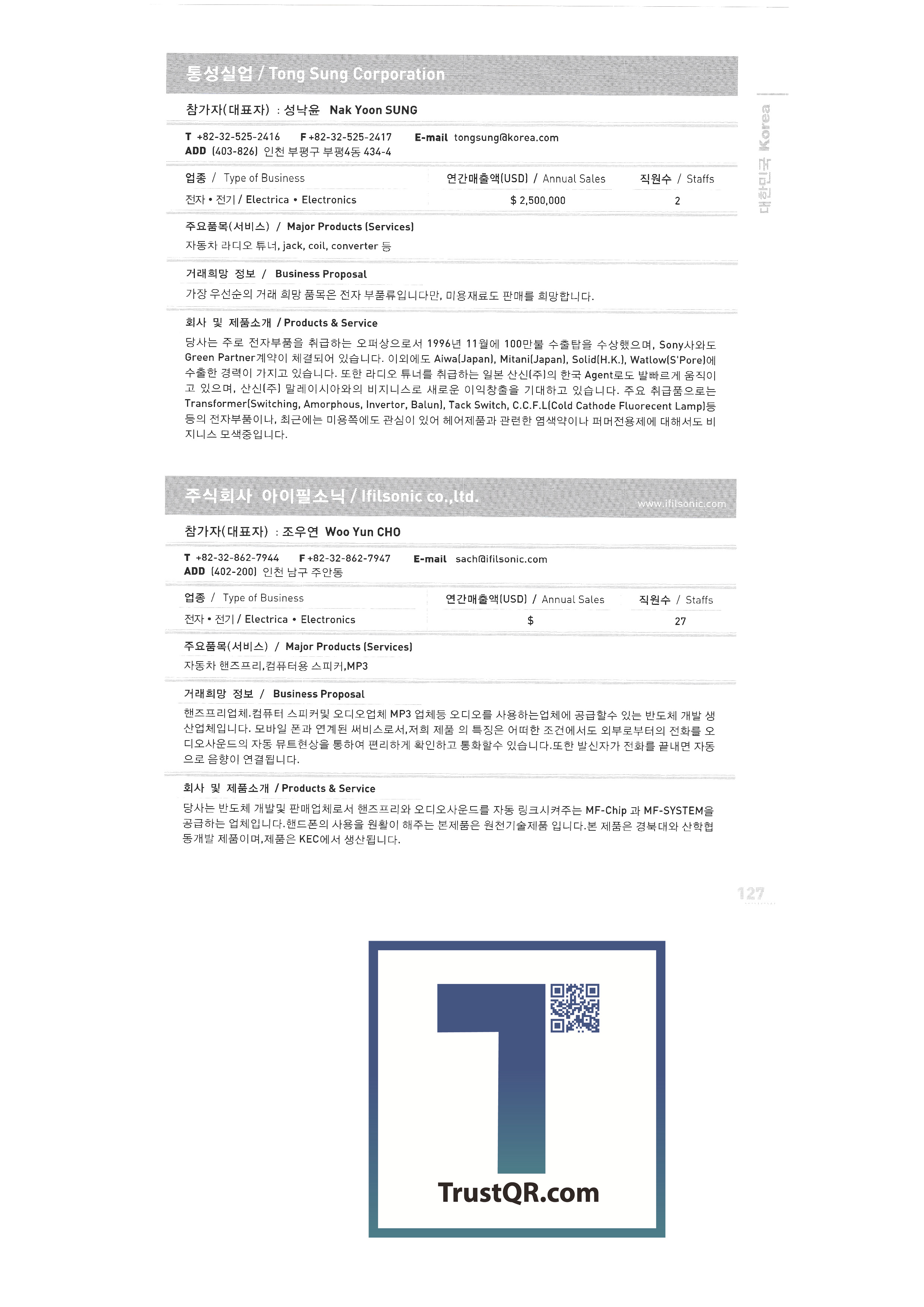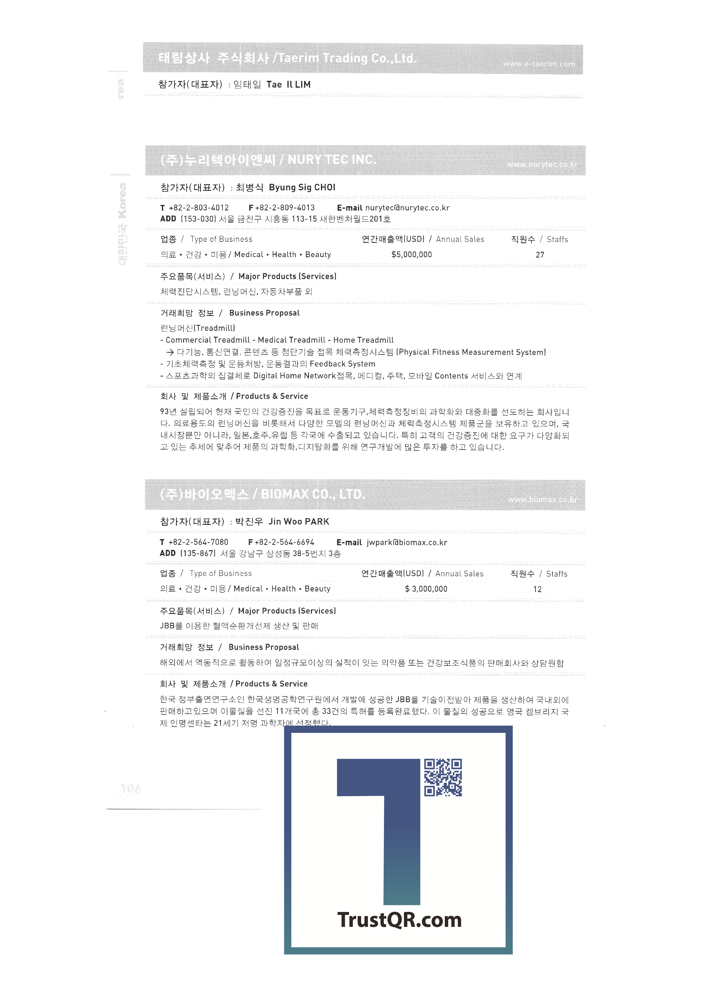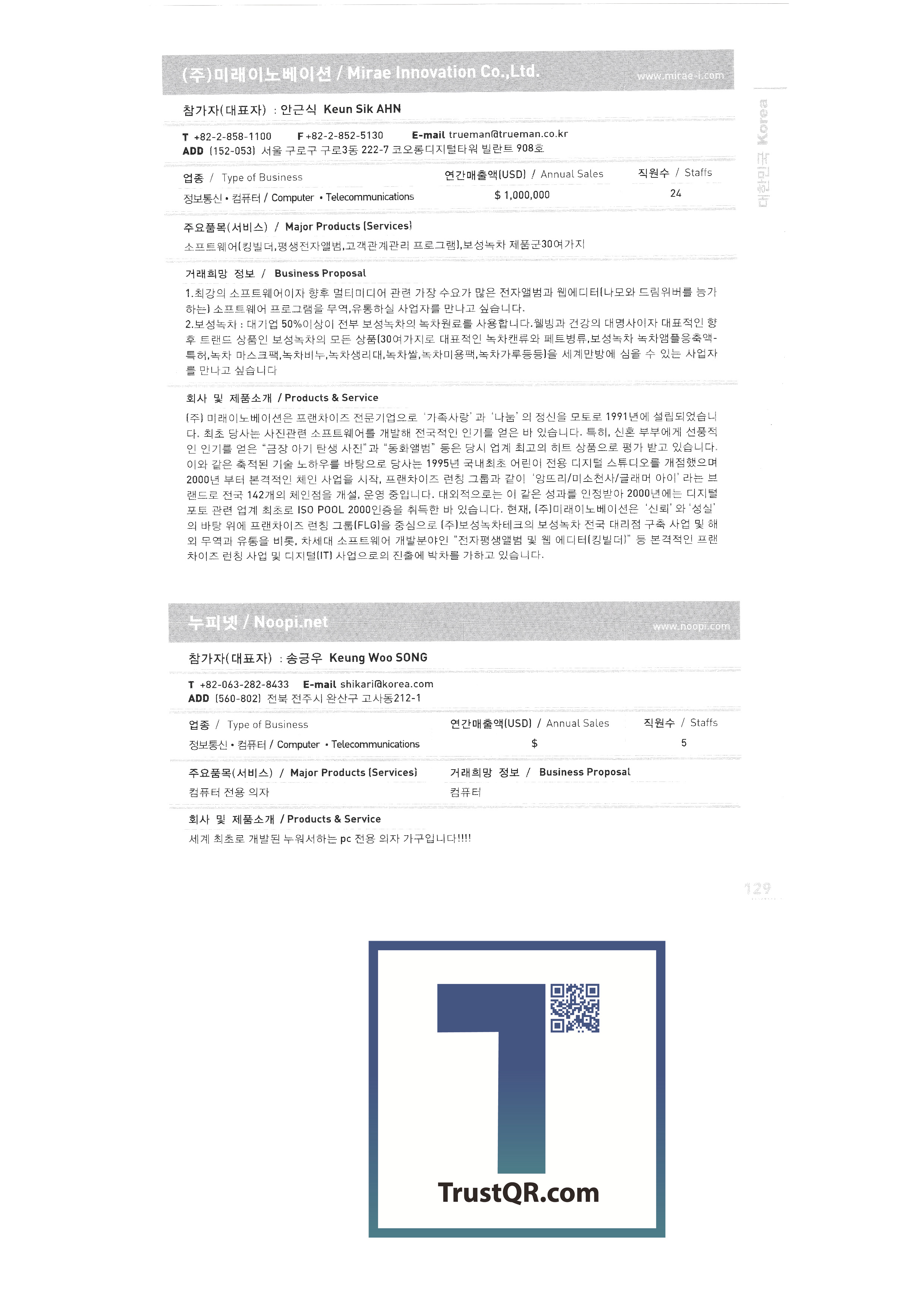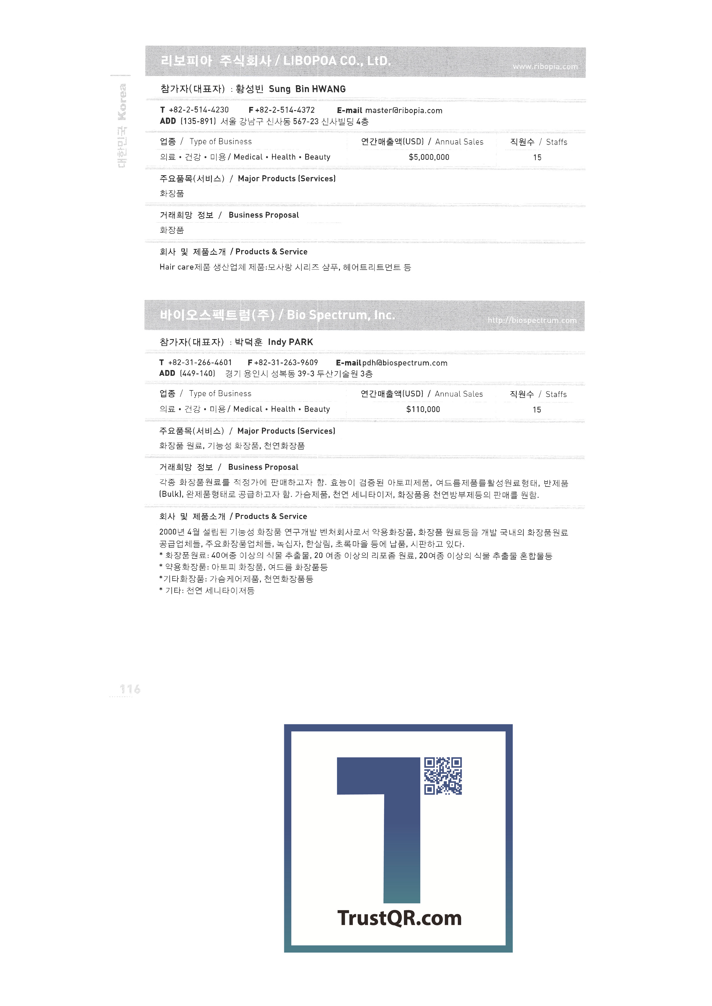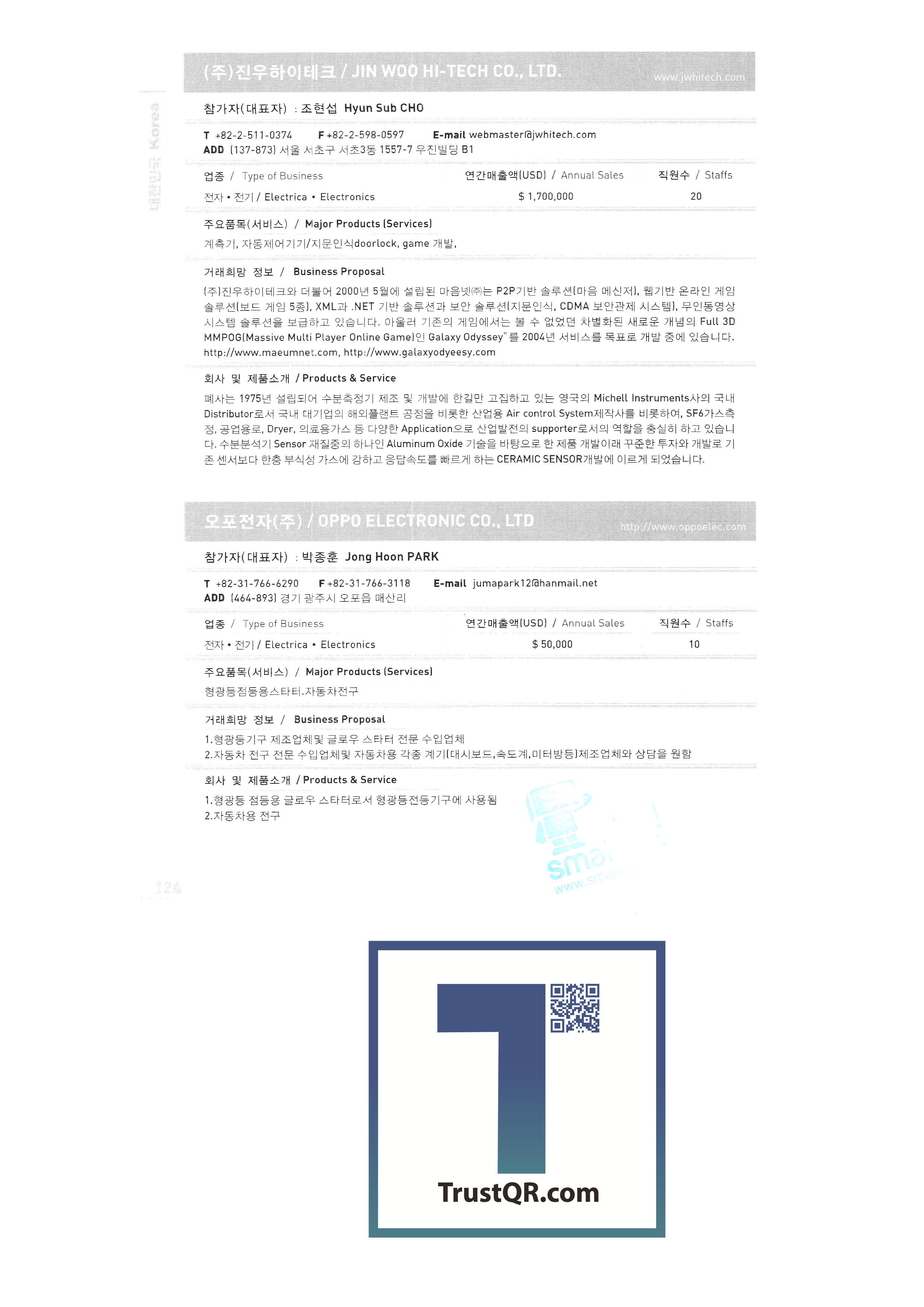 Midang Food Service Division Biotech Co., Ltd. Samshin ginseng processing farming association Seojeong Traditional Food Altien Yanbian University of Science and Technology Food Co., Ltd. Mockup food Jungwoo Food Jeju Bio Industry Jeju Citrus Agricultural Cooperative Trade Office Jeju Regional Development Corporation Jeju Fisheries Logistics Co., Ltd. Jeju Natural Food Jeju Special Products Jirisan Solsongju Jinro Valentine Tamra Vegetable Village Farming Association Taelim Corporation Fermentec Korea Stevia Happy Story Co., Ltd. Maekyung bias guide Daewoo Environment Industry Co., Ltd. Hair Science Co., Ltd. Geonpoong Bio Co., Ltd. Nuri Tech I&C Biomex Co., Ltd. Marine Product Tech Co., Ltd. Doul Healthcare Best World Industry Co., Ltd. Sticks Co., Ltd. IV Food Co., Ltd. Ames Phil Co., Ltd. Hair Science Co., Ltd. Jeju Love Co., Ltd. BH Biotech Daewon Carbontech Daehan Median Co., Ltd. Divia Korea Libopia Co., Ltd. Bio Spectrum Co., Ltd. Revival Medical Jeju National University Hospital OBS Co., Ltd. Now CheilJedang Special Edition Galaxy Corporation Jinduk Biotech Co., Ltd. Hasung Electronics Korea Latex Industry Co., Ltd. Health Life Morning Art Co., Ltd. Itel Korea Co., Ltd. WIZLUX Co., Ltd. EasyM Tech Co., Ltd. Jinwoo Hi-Tech Co., Ltd. Offer Electronics Inc. Sun Heindust Rani Industry Co., Ltd. JST Industry Co., Ltd. Techne Tongseong Unemployment Ipilsonic Good Telecom Co., Ltd. Mirae Innovation Co., Ltd. Nupinet Invest Club Siri Corporation Qtel Soft Co., Ltd. Rubins Samsung SDS Seoul Digital University You's One Co., Ltd. U platform Nexmobile Co., Ltd. DalK Co., Ltd. Sky UMS Co., Ltd. Faber Nine Rapien Corporation Global Mars Co., Ltd. International Logistics Seyang Ship Accordistics Garam Appraisal Corporation Gwangyang Bay Area Free Economic Zone Authority Kim Miracemusa Sloan Korea Sun Valley |