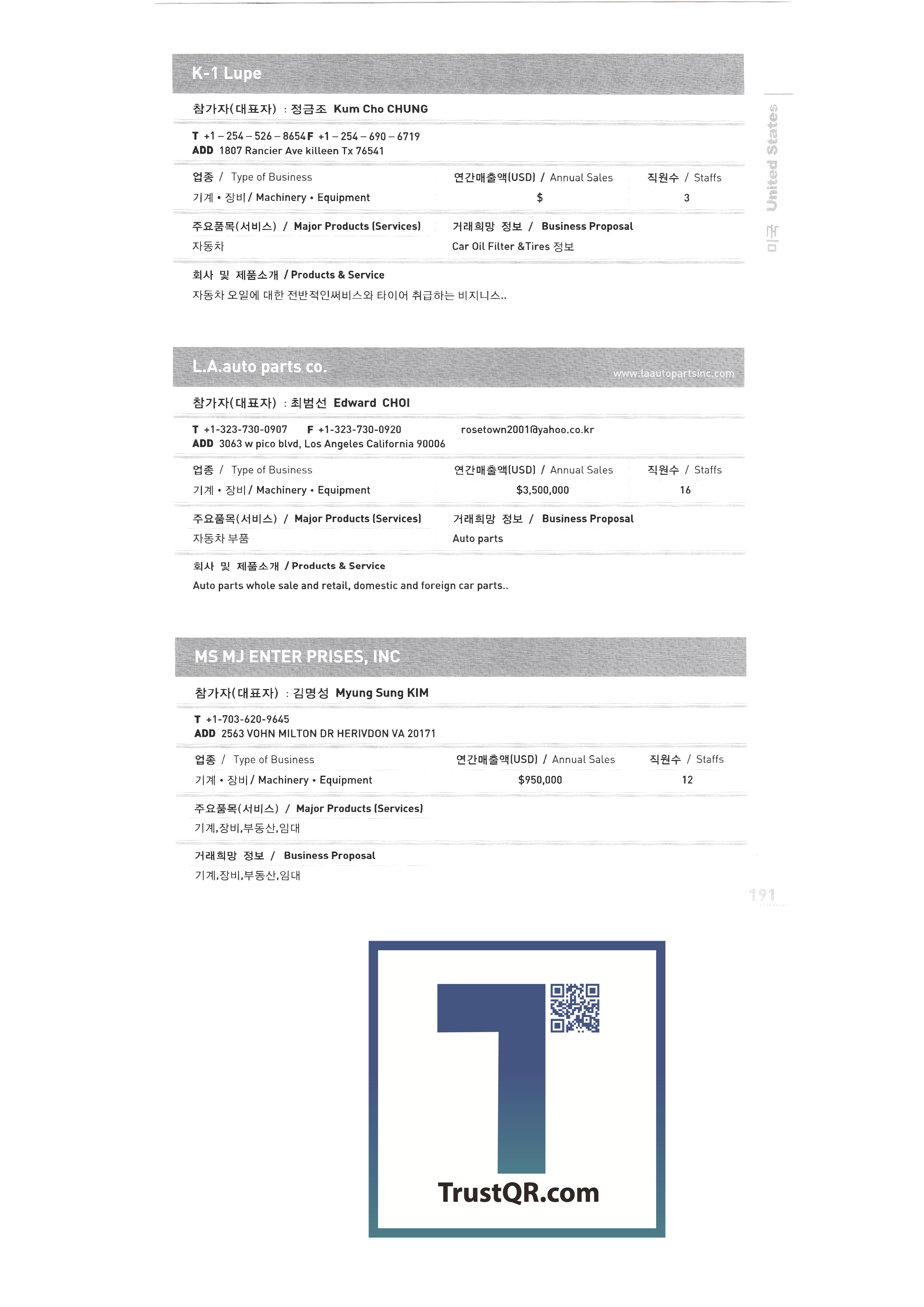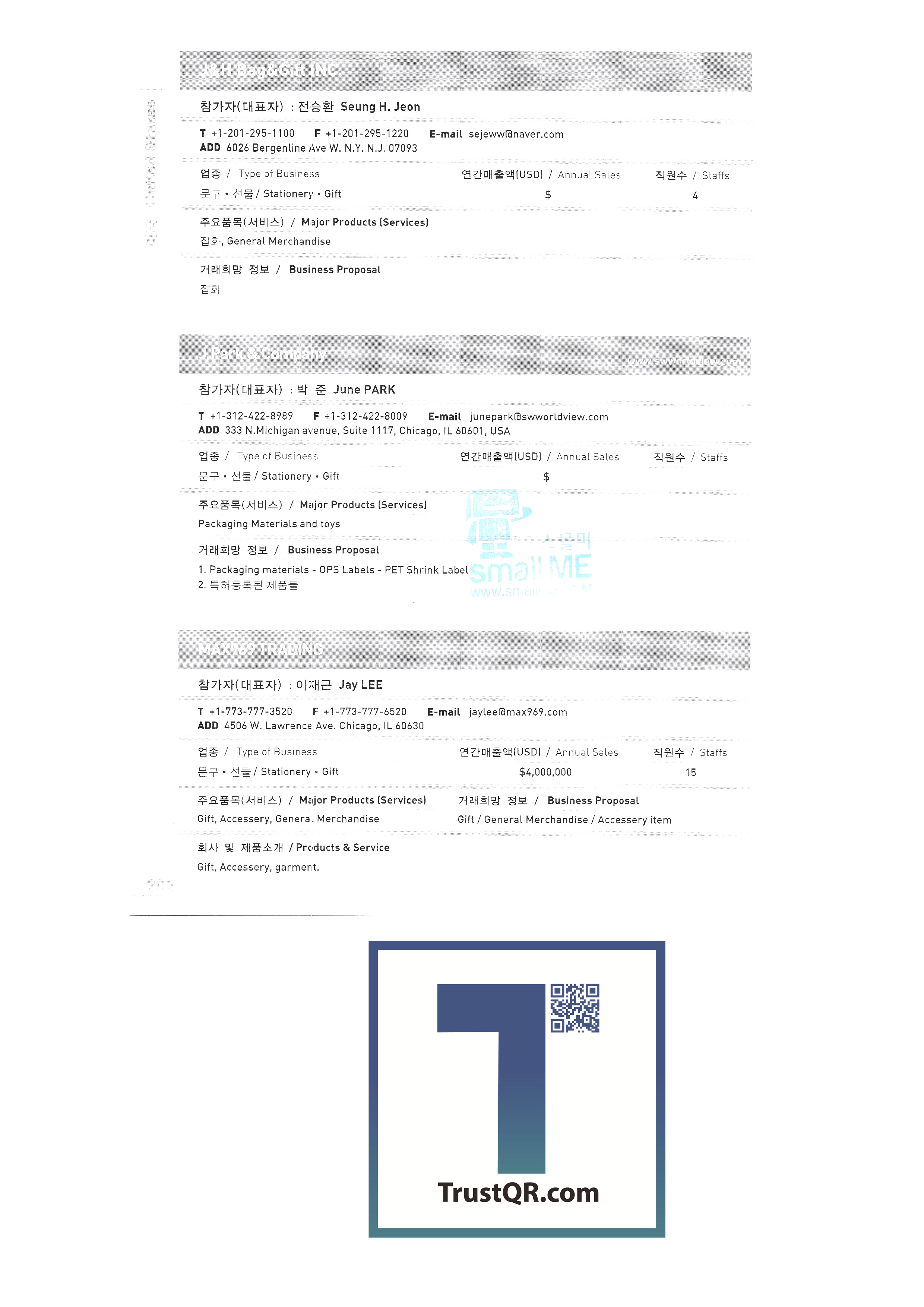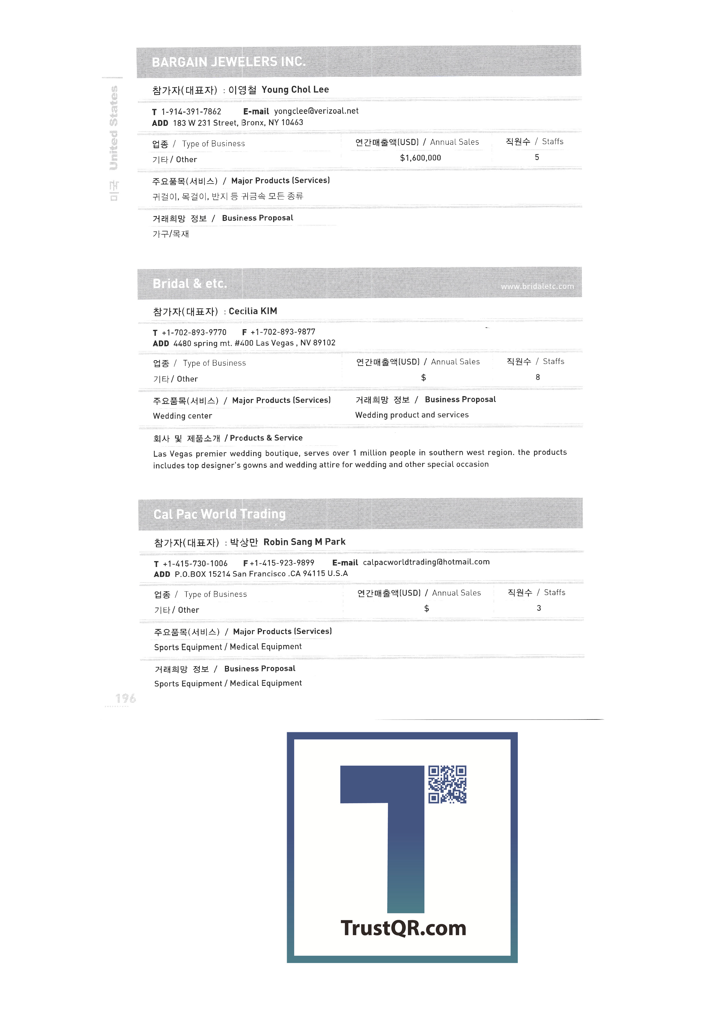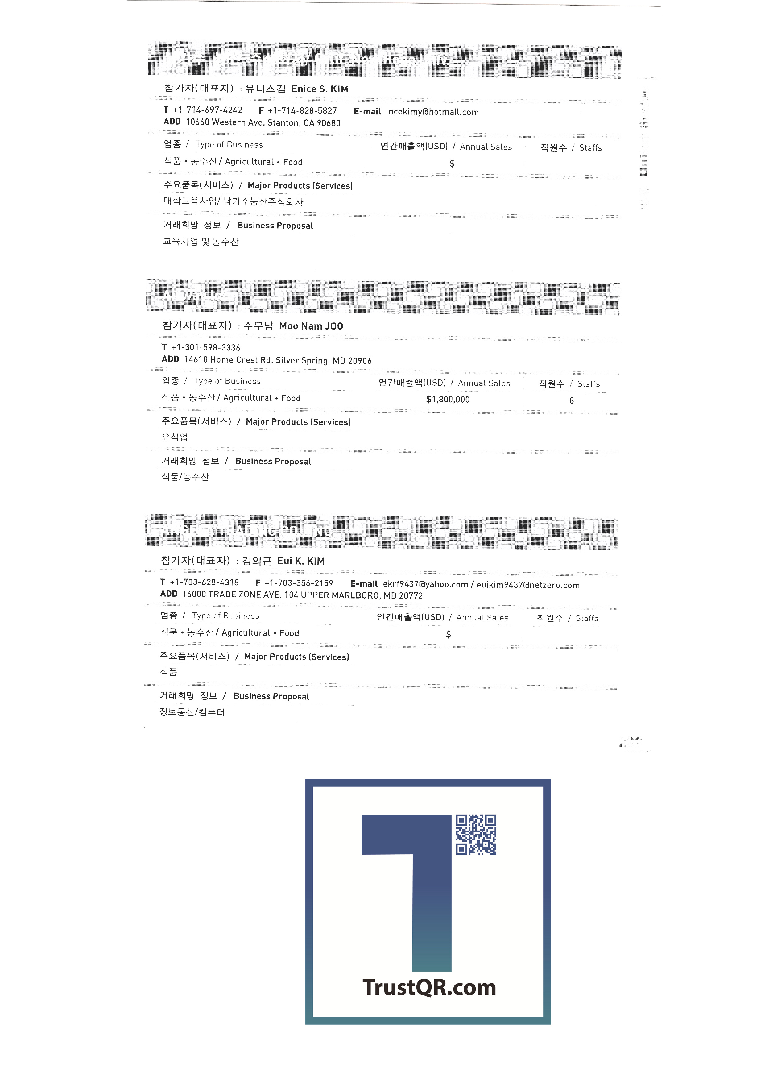 제프선 세탁소 태진 화천 U.S.A. INC FKDA J.N.H TRADING.INC K.C.Inc. K-1 Lupe L.A.auto parts co. MS MJ ENTER PRISES,INC Regal Custom Cleaners Inc. SC Machining, INC Song&In Corp 달라스 한인 상공회 로코코 꽃집 아큐아토피아 원 트레이딩(원 도매상) 케이씨 란드리멧 콘티마 주식회사 킹스코 트레이딩 NIKE,Inc 미주 광복회 Aaone LITHO,INC. BARGAIN JEWELERS INC. Bridal & etc. Cal Pac World Trading GOLFDOM James Yongwon Property Jang's Enterprise Korean American Federation of O.C LAPD New York Golf center, Inc RIPMC CORP Robot Factory Incorporated Rotex Hotel&Condo Sinework Co. Space Works,Inc T&K Pakage Time Warner Cable 몬티 스쿼워 회사 하워드 리 인터내쇼날 J&H Bag&Gift INC. J.Park & Company MAX969 TRADING TOYS&ACC.BY OMNI, INC ㈜라남 뉴스타 그룹 리멕스 부동산 미주사업개발부동산 부동산 뱅크 삼문그룹 아시아퍼시픽 원더미어 부동산 회사 지닉스 케이엔지 프라자 콜드우오 뱅커 디엄 에스테이트 한원 인베스트먼트 호텔 버터후라이 그로브인 Hankook property management S&H 개스 스테이션 AMCO Service Cor. Best Way Realty CR Res. CROWN INVESTMENT Crown Investment HERITAGE I.C INTERNATIONAL, INC Joy Investment K.Y.C Enterprises LA Realty Pro Land Commercial, Inc. Quingroup REALTY WORLD Sincha ㈜삼초종합상사 ㈜엘코스 어메리카 ㈜유에스트레이딩 루이도소 마켓 실크로드 유에스에이 에이 엔드 제이 무역회사 주식회사 유에스 트레이딩 주얼센스 토파 엔터프라이즈 포토맥아이비 할리우드 트레이딩 허리우드 무역 E - 마트 K 트레이딩 Smiling Star Inc YS LTD Cody Printing In K.Corp. International Imports KMC USA,Co Napawater,inc THREE BROTHERS ACC. INC 쏘네트 인크 에그던 히스 인크 유정 국제 유한공사 제이 앤드 에이치 무역회사 티엔티 패션 ABC TRADING INC. Cicci, Inc. CRÈME DE SILK INC. E&C Fashion EVEREST TRDING CORP K-ORIGINALS NM-Hi Fashion,Inc S.G.T Lee Inc. SHOE MART TRADING Sox Avenue, Inc Ton-To Corp WESTAR TEXTILES CORP ㈜유로파 고메이 고려장수식품무역 Blue Sea Inc. 던킨 도너츠 델러웨어 식품협회 리스 디스카운터 리커 매릴랜드 식품 주류협회 미주식품협회 미주한미식품상총연합회 스텐스 마케트 씨프코 아리랑 디어 팜 아틀란타 동양식품 주식회사 앰스트롱 코프레이션 에스프레쏘 베스트 회사 에이앤에이 엑스포트 컴퍼니 TugboatFish&Chips Inc. 카브 더 월드 캘리포니아 농산㈜ 코나 트레이딩㈜ 코카콜라 티오 윌리암스 육류생산회사 해외통상㈜ AF Food IRG 슈퍼마켓 MD 식품주류협회 남가주 농산 주식회사 Airway Inn ANGELA TRADING CO.,INC. Babba's Supermarket BERKELEY INTERNATIONAL CO. BIG -H Food Market C&J Enterprise Chevron Gas Station CHOICE LIQUORS D.K Inc. Exxon Fivestar Investment, Inc IRG Supermarket Korea House B.B.Q Lee's Discount Liquor O.N.M INC Olive Bakery |