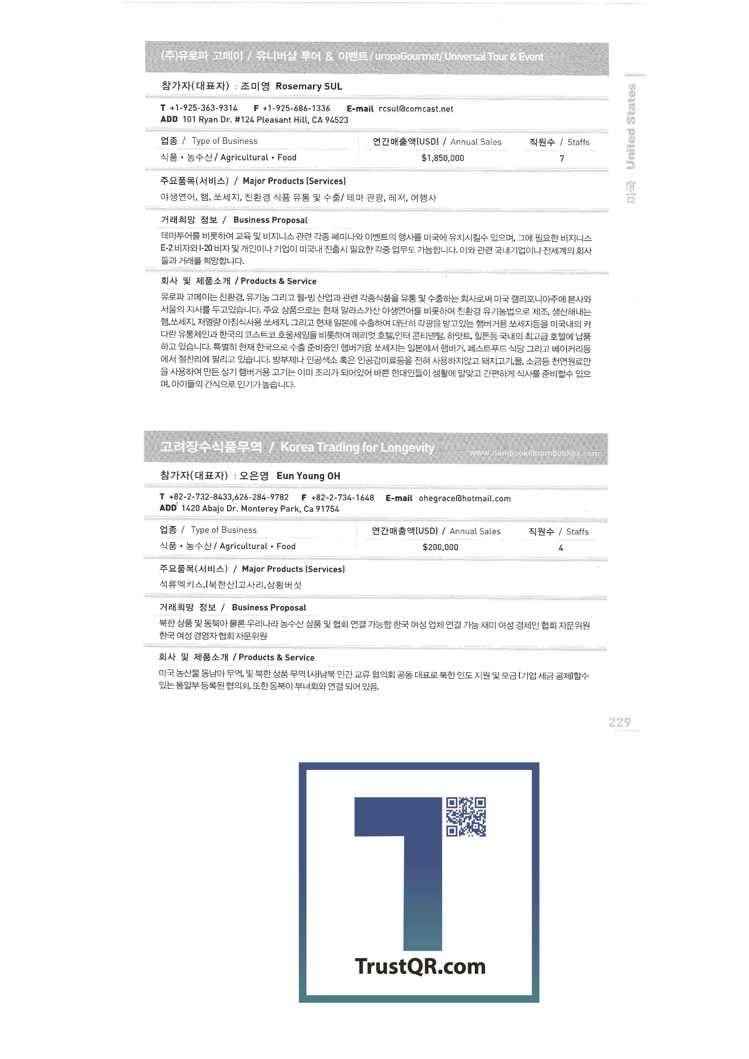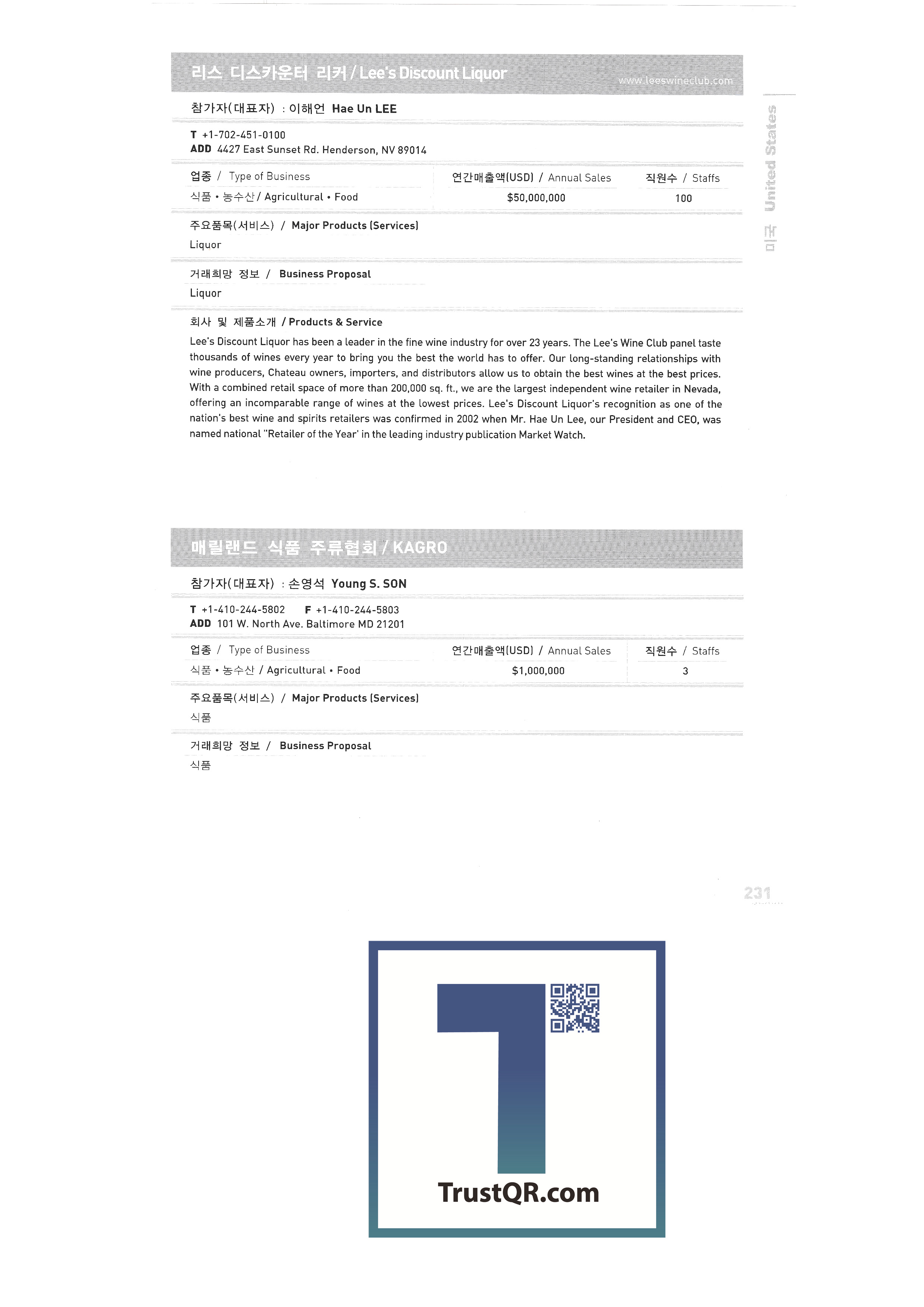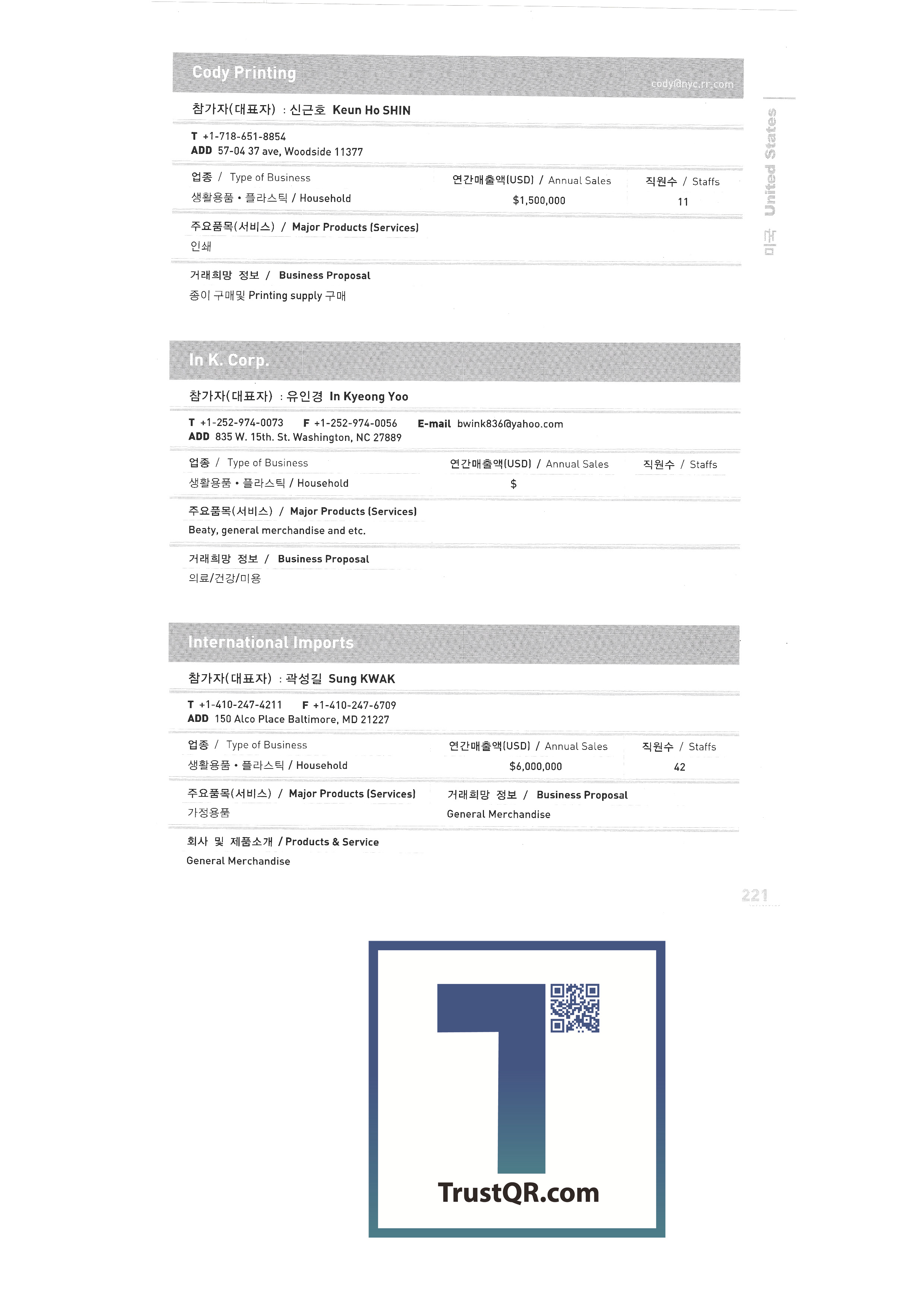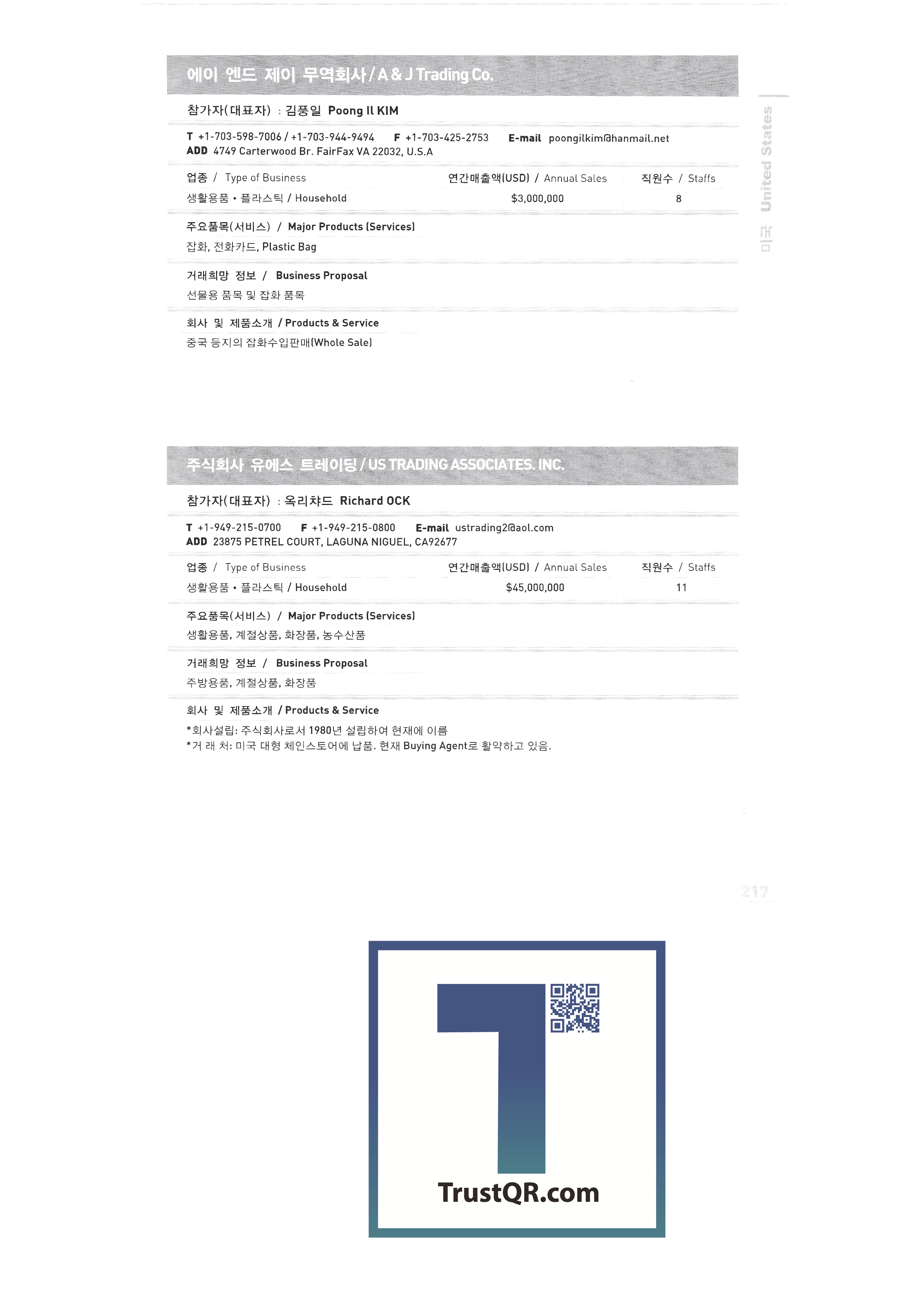 제프선 세탁소 태진 화천 U.S.A. INC FKDA J.N.H TRADING.INC K.C.Inc. K-1 Lupe L.A.auto parts co. MS MJ ENTER PRISES,INC Regal Custom Cleaners Inc. SC Machining, INC Song&In Corp 달라스 한인 상공회 로코코 꽃집 아큐아토피아 원 트레이딩(원 도매상) 케이씨 란드리멧 콘티마 주식회사 킹스코 트레이딩 NIKE,Inc 미주 광복회 Aaone LITHO,INC. BARGAIN JEWELERS INC. Bridal & etc. Cal Pac World Trading GOLFDOM James Yongwon Property Jang's Enterprise Korean American Federation of O.C LAPD New York Golf center, Inc RIPMC CORP Robot Factory Incorporated Rotex Hotel&Condo Sinework Co. Space Works,Inc T&K Pakage Time Warner Cable 몬티 스쿼워 회사 하워드 리 인터내쇼날 J&H Bag&Gift INC. J.Park & Company MAX969 TRADING TOYS&ACC.BY OMNI, INC ㈜라남 뉴스타 그룹 리멕스 부동산 미주사업개발부동산 부동산 뱅크 삼문그룹 아시아퍼시픽 원더미어 부동산 회사 지닉스 케이엔지 프라자 콜드우오 뱅커 디엄 에스테이트 한원 인베스트먼트 호텔 버터후라이 그로브인 Hankook property management S&H 개스 스테이션 AMCO Service Cor. Best Way Realty CR Res. CROWN INVESTMENT Crown Investment HERITAGE I.C INTERNATIONAL, INC Joy Investment K.Y.C Enterprises LA Realty Pro Land Commercial, Inc. Quingroup REALTY WORLD Sincha ㈜삼초종합상사 ㈜엘코스 어메리카 ㈜유에스트레이딩 루이도소 마켓 실크로드 유에스에이 에이 엔드 제이 무역회사 주식회사 유에스 트레이딩 주얼센스 토파 엔터프라이즈 포토맥아이비 할리우드 트레이딩 허리우드 무역 E - 마트 K 트레이딩 Smiling Star Inc YS LTD Cody Printing In K.Corp. International Imports KMC USA,Co Napawater,inc THREE BROTHERS ACC. INC 쏘네트 인크 에그던 히스 인크 유정 국제 유한공사 제이 앤드 에이치 무역회사 티엔티 패션 ABC TRADING INC. Cicci, Inc. CRÈME DE SILK INC. E&C Fashion EVEREST TRDING CORP K-ORIGINALS NM-Hi Fashion,Inc S.G.T Lee Inc. SHOE MART TRADING Sox Avenue, Inc Ton-To Corp WESTAR TEXTILES CORP ㈜유로파 고메이 고려장수식품무역 Blue Sea Inc. 던킨 도너츠 델러웨어 식품협회 리스 디스카운터 리커 매릴랜드 식품 주류협회 미주식품협회 미주한미식품상총연합회 스텐스 마케트 씨프코 아리랑 디어 팜 아틀란타 동양식품 주식회사 앰스트롱 코프레이션 에스프레쏘 베스트 회사 에이앤에이 엑스포트 컴퍼니 TugboatFish&Chips Inc. 카브 더 월드 캘리포니아 농산㈜ 코나 트레이딩㈜ 코카콜라 티오 윌리암스 육류생산회사 해외통상㈜ AF Food IRG 슈퍼마켓 MD 식품주류협회 남가주 농산 주식회사 Airway Inn ANGELA TRADING CO.,INC. Babba's Supermarket BERKELEY INTERNATIONAL CO. BIG -H Food Market C&J Enterprise Chevron Gas Station CHOICE LIQUORS D.K Inc. Exxon Fivestar Investment, Inc IRG Supermarket Korea House B.B.Q Lee's Discount Liquor O.N.M INC Olive Bakery |