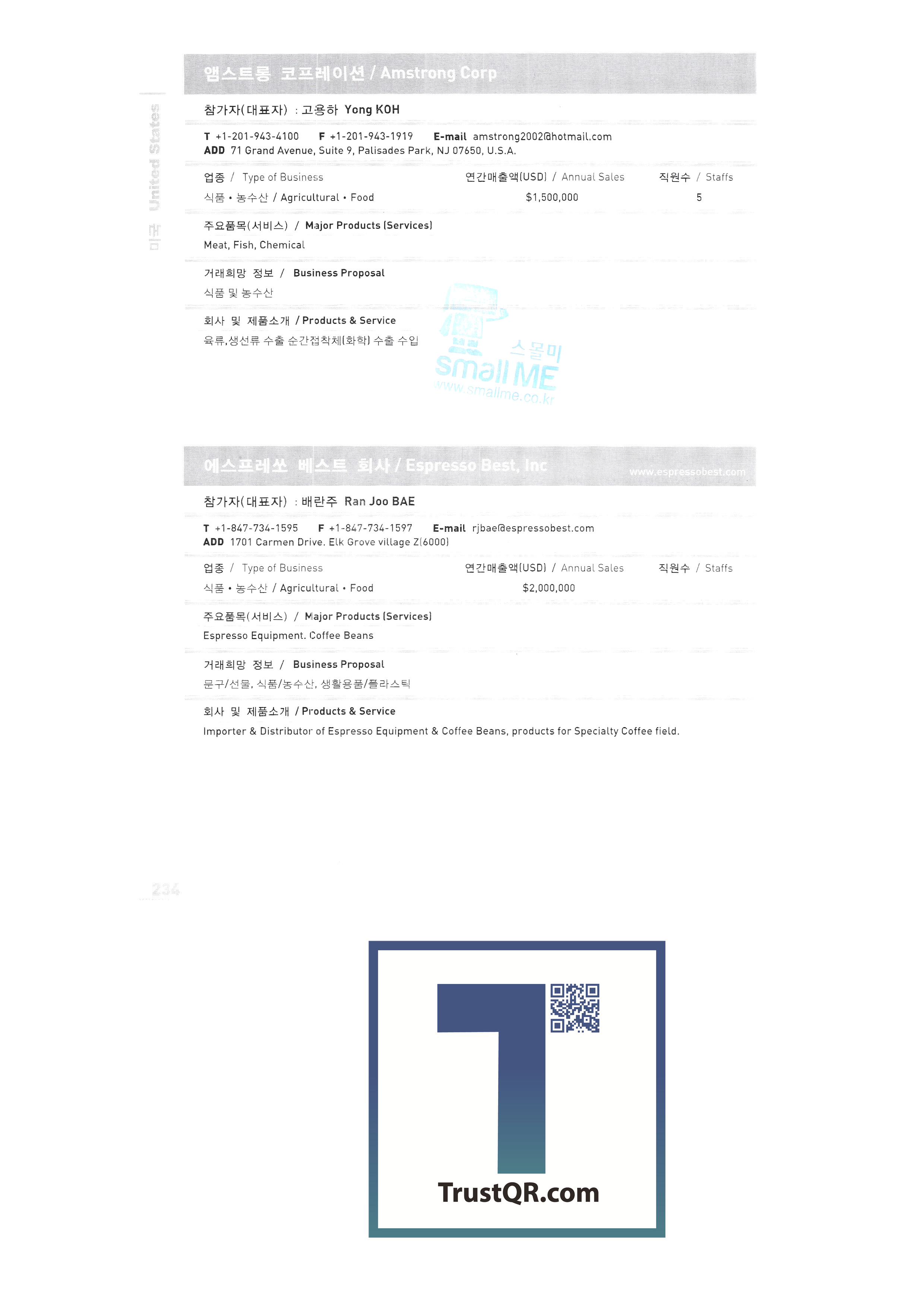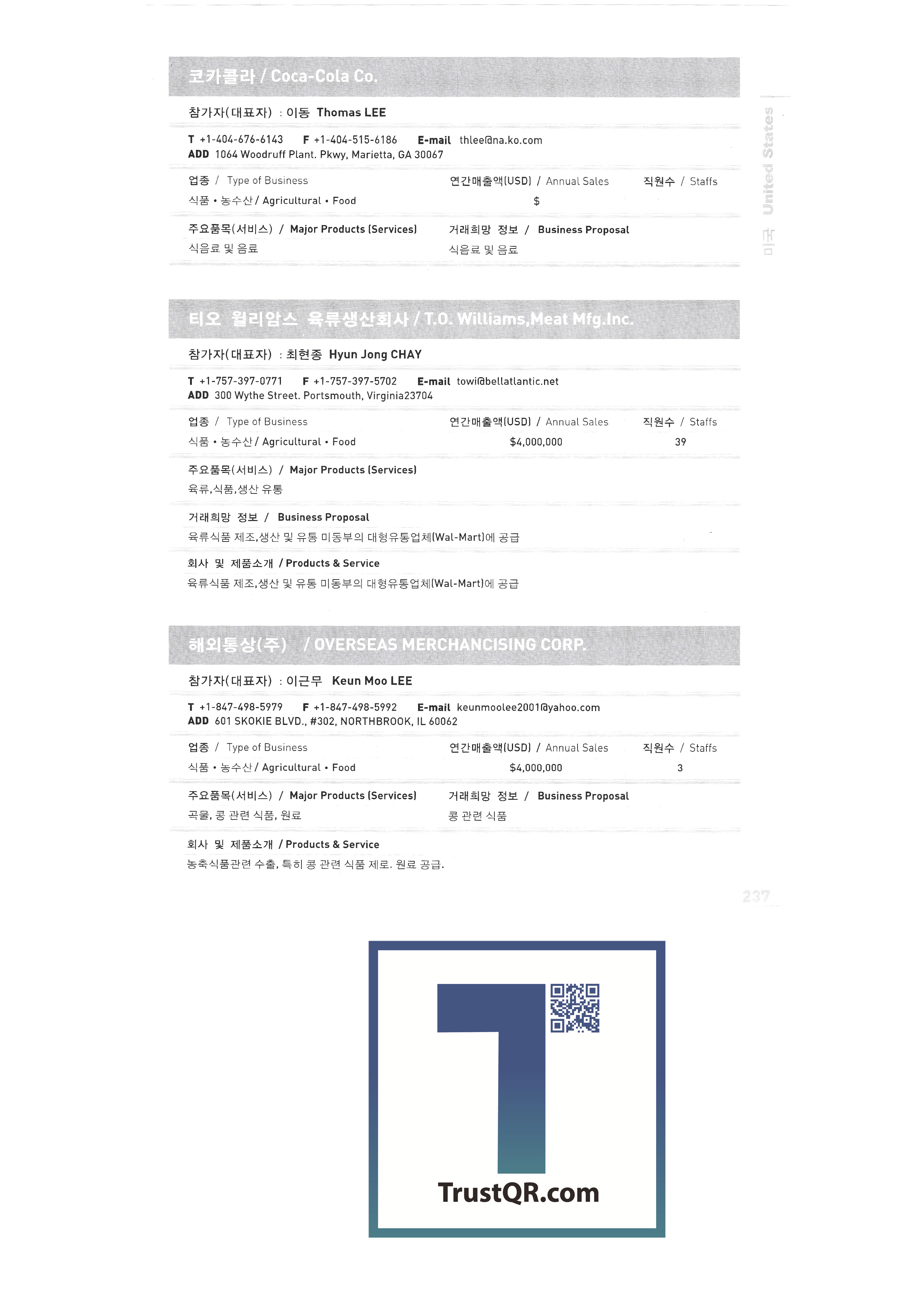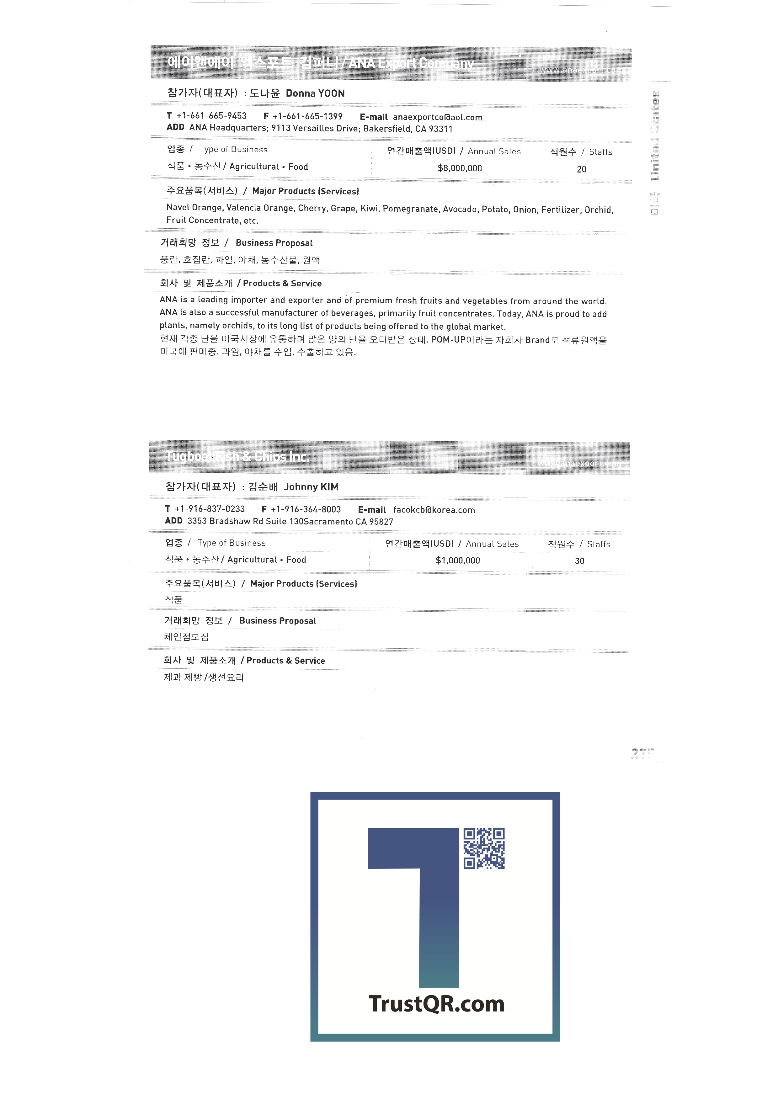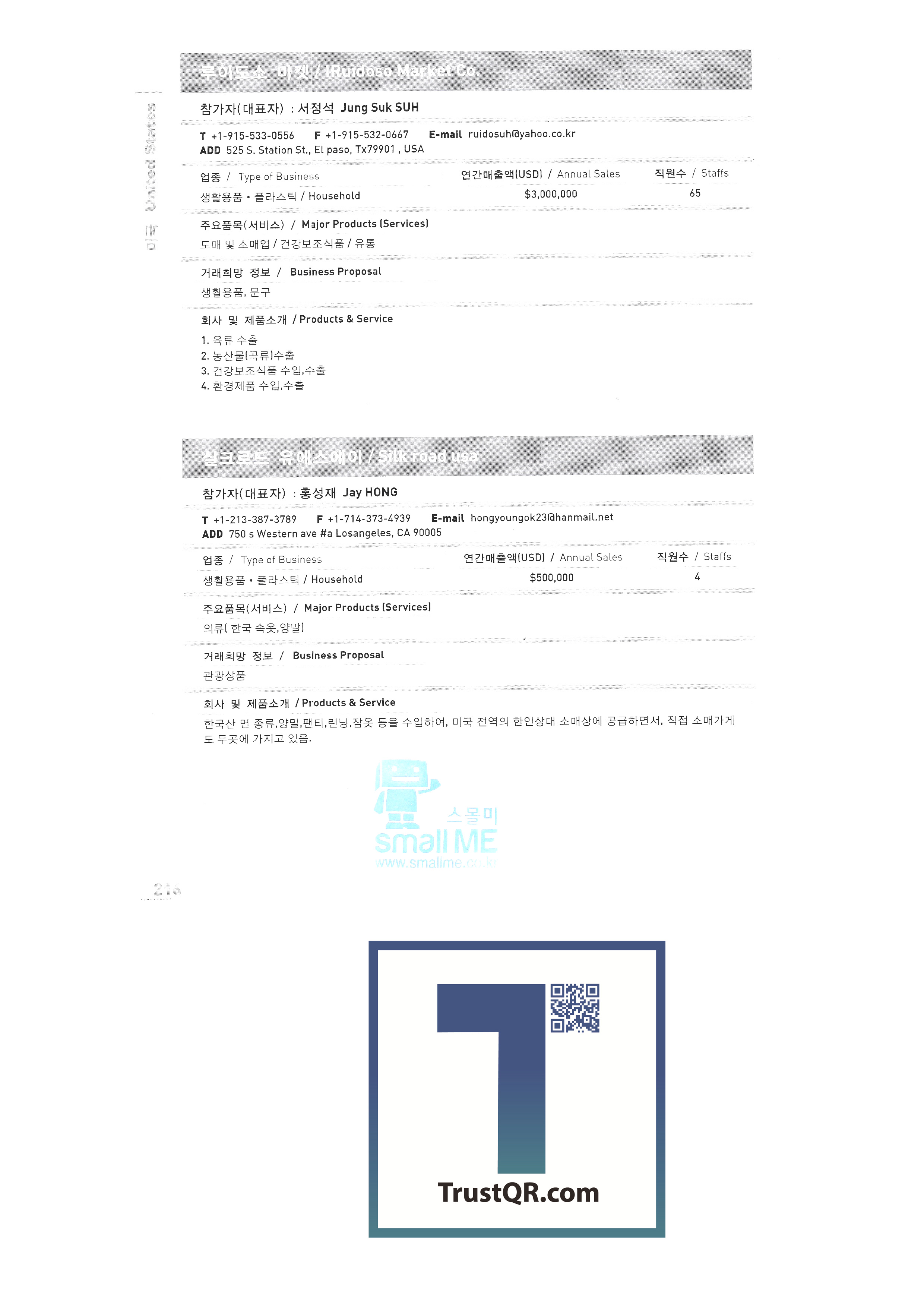 제프선 세탁소 태진 화천 U.S.A. INC FKDA J.N.H TRADING.INC K.C.Inc. K-1 Lupe L.A.auto parts co. MS MJ ENTER PRISES,INC Regal Custom Cleaners Inc. SC Machining, INC Song&In Corp 달라스 한인 상공회 로코코 꽃집 아큐아토피아 원 트레이딩(원 도매상) 케이씨 란드리멧 콘티마 주식회사 킹스코 트레이딩 NIKE,Inc 미주 광복회 Aaone LITHO,INC. BARGAIN JEWELERS INC. Bridal & etc. Cal Pac World Trading GOLFDOM James Yongwon Property Jang's Enterprise Korean American Federation of O.C LAPD New York Golf center, Inc RIPMC CORP Robot Factory Incorporated Rotex Hotel&Condo Sinework Co. Space Works,Inc T&K Pakage Time Warner Cable 몬티 스쿼워 회사 하워드 리 인터내쇼날 J&H Bag&Gift INC. J.Park & Company MAX969 TRADING TOYS&ACC.BY OMNI, INC ㈜라남 뉴스타 그룹 리멕스 부동산 미주사업개발부동산 부동산 뱅크 삼문그룹 아시아퍼시픽 원더미어 부동산 회사 지닉스 케이엔지 프라자 콜드우오 뱅커 디엄 에스테이트 한원 인베스트먼트 호텔 버터후라이 그로브인 Hankook property management S&H 개스 스테이션 AMCO Service Cor. Best Way Realty CR Res. CROWN INVESTMENT Crown Investment HERITAGE I.C INTERNATIONAL, INC Joy Investment K.Y.C Enterprises LA Realty Pro Land Commercial, Inc. Quingroup REALTY WORLD Sincha ㈜삼초종합상사 ㈜엘코스 어메리카 ㈜유에스트레이딩 루이도소 마켓 실크로드 유에스에이 에이 엔드 제이 무역회사 주식회사 유에스 트레이딩 주얼센스 토파 엔터프라이즈 포토맥아이비 할리우드 트레이딩 허리우드 무역 E - 마트 K 트레이딩 Smiling Star Inc YS LTD Cody Printing In K.Corp. International Imports KMC USA,Co Napawater,inc THREE BROTHERS ACC. INC 쏘네트 인크 에그던 히스 인크 유정 국제 유한공사 제이 앤드 에이치 무역회사 티엔티 패션 ABC TRADING INC. Cicci, Inc. CRÈME DE SILK INC. E&C Fashion EVEREST TRDING CORP K-ORIGINALS NM-Hi Fashion,Inc S.G.T Lee Inc. SHOE MART TRADING Sox Avenue, Inc Ton-To Corp WESTAR TEXTILES CORP ㈜유로파 고메이 고려장수식품무역 Blue Sea Inc. 던킨 도너츠 델러웨어 식품협회 리스 디스카운터 리커 매릴랜드 식품 주류협회 미주식품협회 미주한미식품상총연합회 스텐스 마케트 씨프코 아리랑 디어 팜 아틀란타 동양식품 주식회사 앰스트롱 코프레이션 에스프레쏘 베스트 회사 에이앤에이 엑스포트 컴퍼니 TugboatFish&Chips Inc. 카브 더 월드 캘리포니아 농산㈜ 코나 트레이딩㈜ 코카콜라 티오 윌리암스 육류생산회사 해외통상㈜ AF Food IRG 슈퍼마켓 MD 식품주류협회 남가주 농산 주식회사 Airway Inn ANGELA TRADING CO.,INC. Babba's Supermarket BERKELEY INTERNATIONAL CO. BIG -H Food Market C&J Enterprise Chevron Gas Station CHOICE LIQUORS D.K Inc. Exxon Fivestar Investment, Inc IRG Supermarket Korea House B.B.Q Lee's Discount Liquor O.N.M INC Olive Bakery |