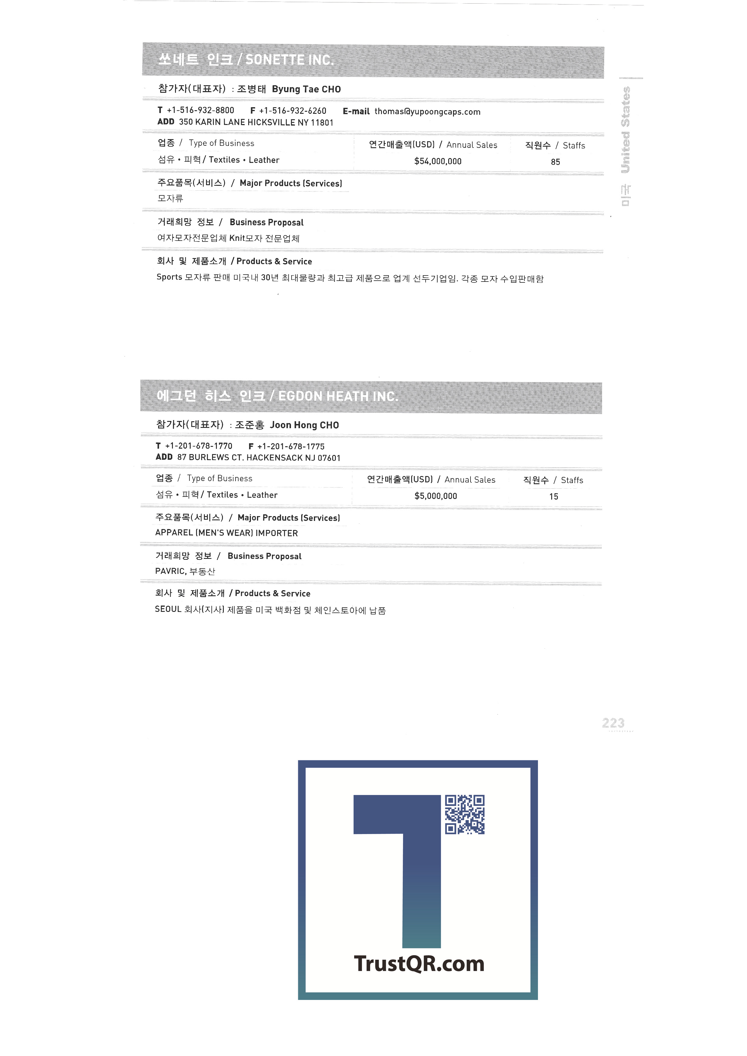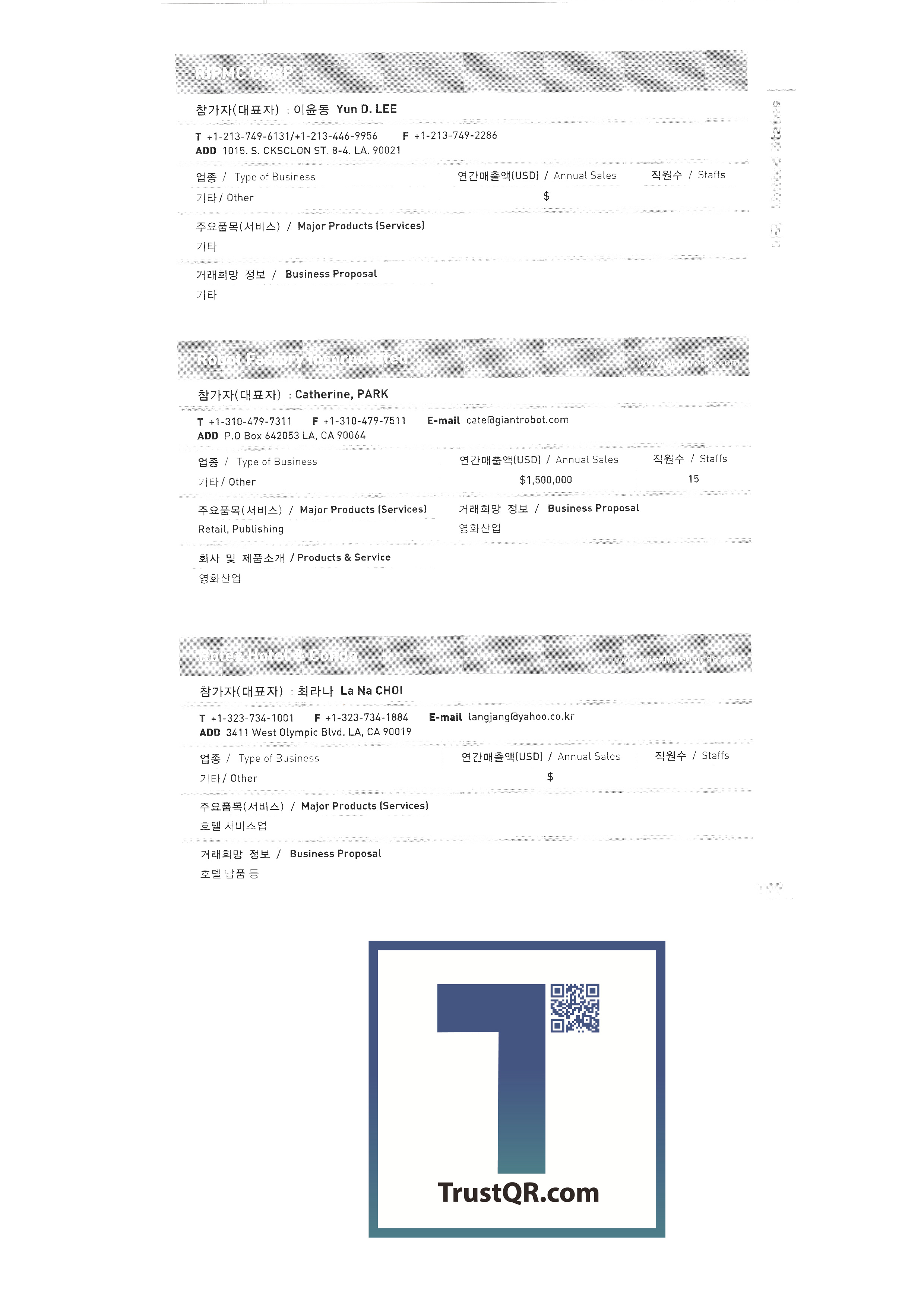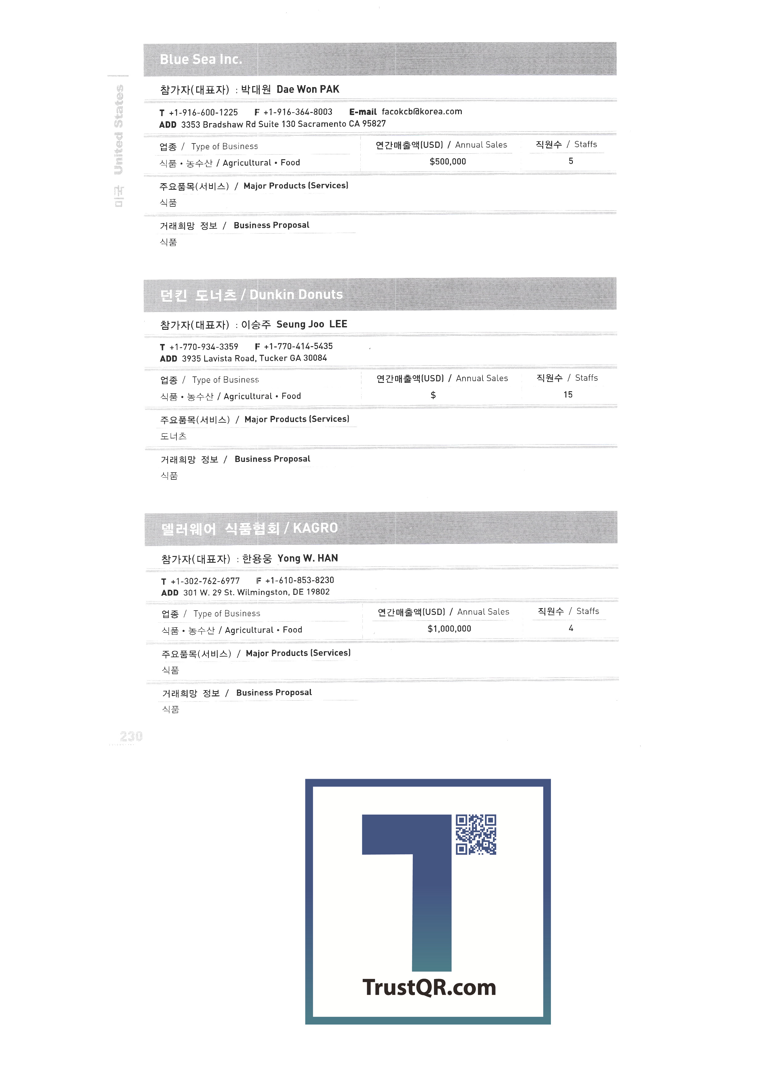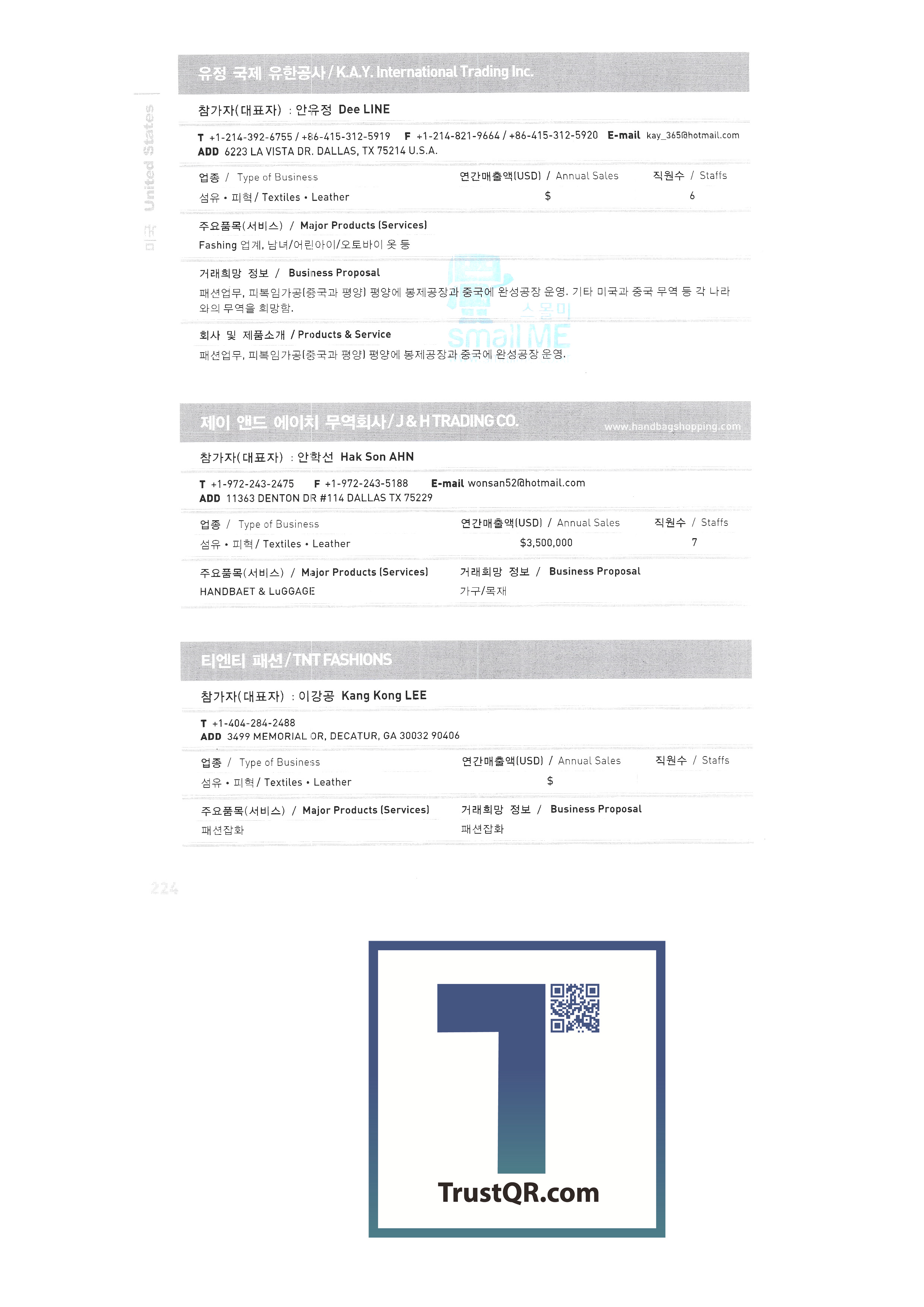 Jeff's Laundry Taejin Hwacheon U.S.A. INC FKDA J.N.H TRADING.INC K.C.Inc. K-1 Lupe L.A.auto parts co. MS MJ ENTER PRISES,INC Regal Custom Cleaners Inc. SC Machining, INC Song&In Corp Dallas Korean Chamber of Commerce Rococo Florist Accutopia One trading (one wholesaler) KC Landrimet Contima Corporation Kingsco Trading NIKE,Inc America's Liberation Society Aaone LITHO, INC. BARGAIN JEWELERS INC. Bridal & etc. Cal Pac World Trading GOLFDOM James Yongwon Property Jang's Enterprise Korean American Federation of O.C LAPD New York Golf center, Inc RIPMC CORP Robot Factory Incorporated Rotex Hotel&Condo Sinework Co. Space Works,Inc T&K Pakage Time Warner Cable Monty Squawer Company Howard Lee International J&H Bag&Gift INC. J.Park & Company MAX969 TRADING TOYS&ACC.BY OMNI, INC Ranam Corporation Newsta Group Remex Real Estate Americas Business Development Real Estate Real estate bank Sammun Group Asia Pacific Wondermere Real Estate Company Genix Kn Plaza Coldo Banker Dim Estate Hanwon Investment Hotel Butterfly Grove Inn Hankook property management S&H Gas Station AMCO Service Cor. Best Way Realty CR Res. CROWN INVESTMENT Crown Investment HERITAGE I.C INTERNATIONAL, INC Joy Investment K.Y.C Enterprises LA Realty Pro Land Commercial, Inc. Quingroup REALTY WORLD Sincha Samcho General Corporation Elcos America Co., Ltd. U-Strading Ruidoso Market Silk Road USA A-end J Trading Company US Trading Co., Ltd. Jewel sense Topa Enterprise Potomac Ivy Hollywood Trading Waistwood trade E-Mart K trading Smiling Star Inc YS LTD Cody Printing In K.Corp. International Imports KMC USA,Co Napawater,inc THREE BROTHERS ACC. INC Sonnet Inc Eggdon Heath Inc Yujung International Co., Ltd. J&H Trading Company Tianti fashion ABC TRADING INC. Cicci, Inc. CRÈME DE SILK INC. E&C Fashion EVEREST TRDING CORP K-ORIGINALS NM-Hi Fashion,Inc S.G.T Lee Inc. SHOE MART TRADING Sox Avenue, Inc Ton-To Corp WESTAR TEXTILES CORP Europa Gomei Corporation Korea Longevity Food Trade Blue Sea Inc. Dunkin' Donuts Delaware Food Association Lease counter licker Maryland Food Liquor Association American Food Association Korea-US Food Association Stainless Market Sifco Arirang Deer Farm Atlanta Dongyang Food Co., Ltd. Amstrong Corporation Espresso Best Company A&A Export Company TugboatFish&Chips Inc. Cab the world California Agriculture Kona Trading Co., Ltd. Coca Cola Tio Williams Meat Production Company Overseas Trade AF Food IRG supermarket MD Food Liquor Association Southern California Agricultural Products Co., Ltd. Airway Inn ANGELA TRADING CO.,INC. Babba's Supermarket BERKELEY INTERNATIONAL CO. BIG -H Food Market C&J Enterprise Chevron Gas Station CHOICE LIQUORS D.K Inc. Exxon Fivestar Investment, Inc IRG Supermarket Korea House B.B.Q Lee's Discount Liquor O.N.M INC Olive Bakery |