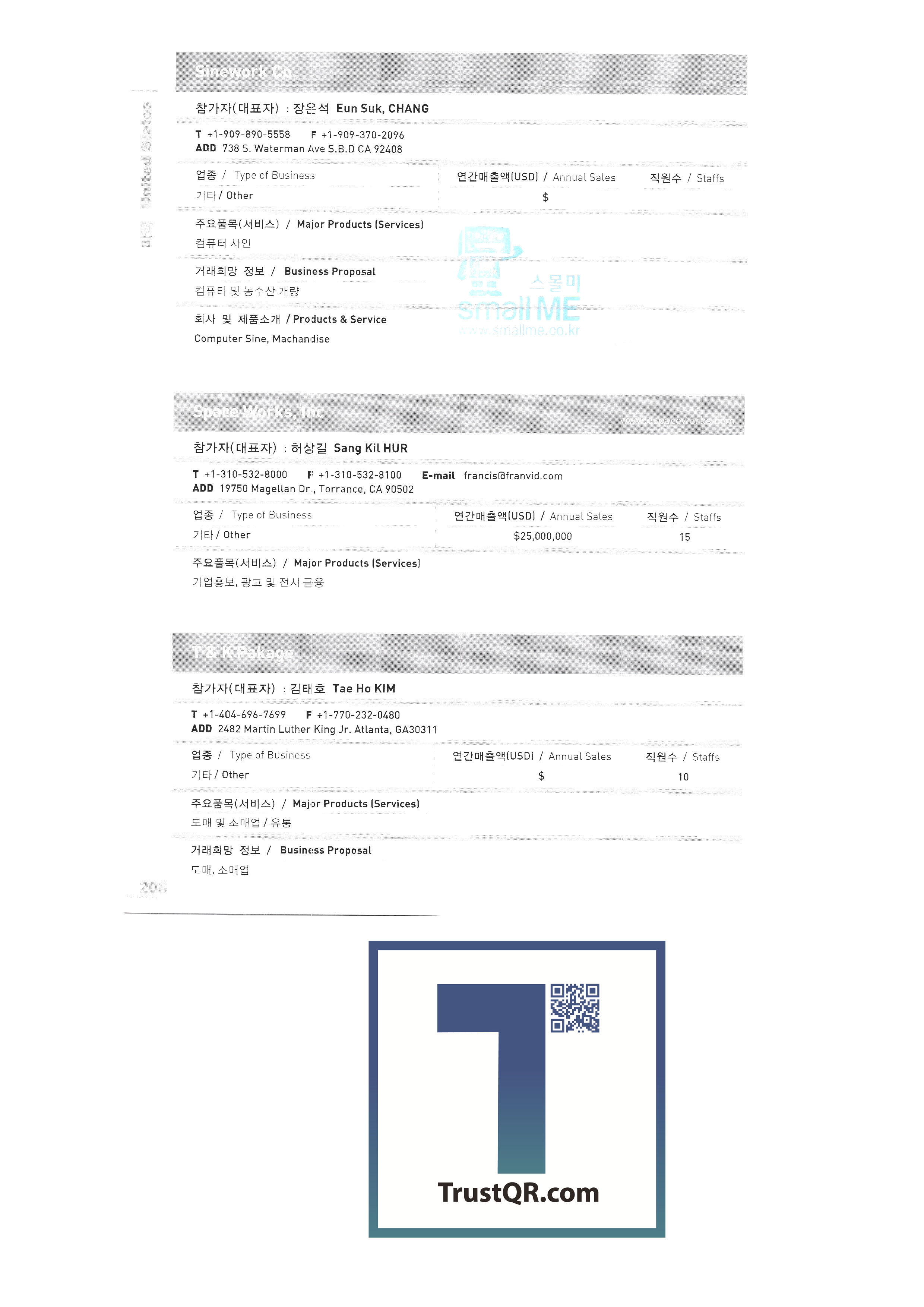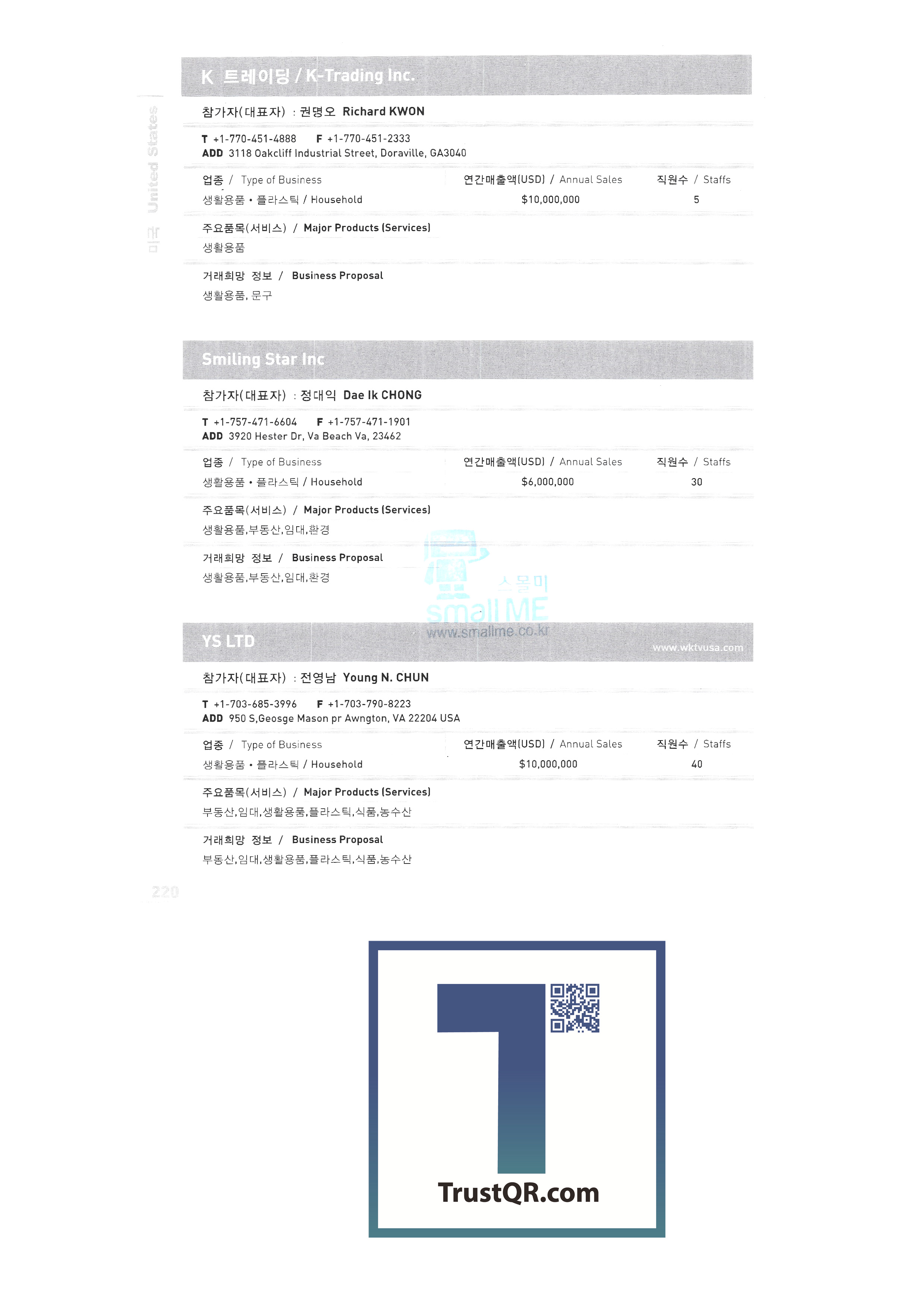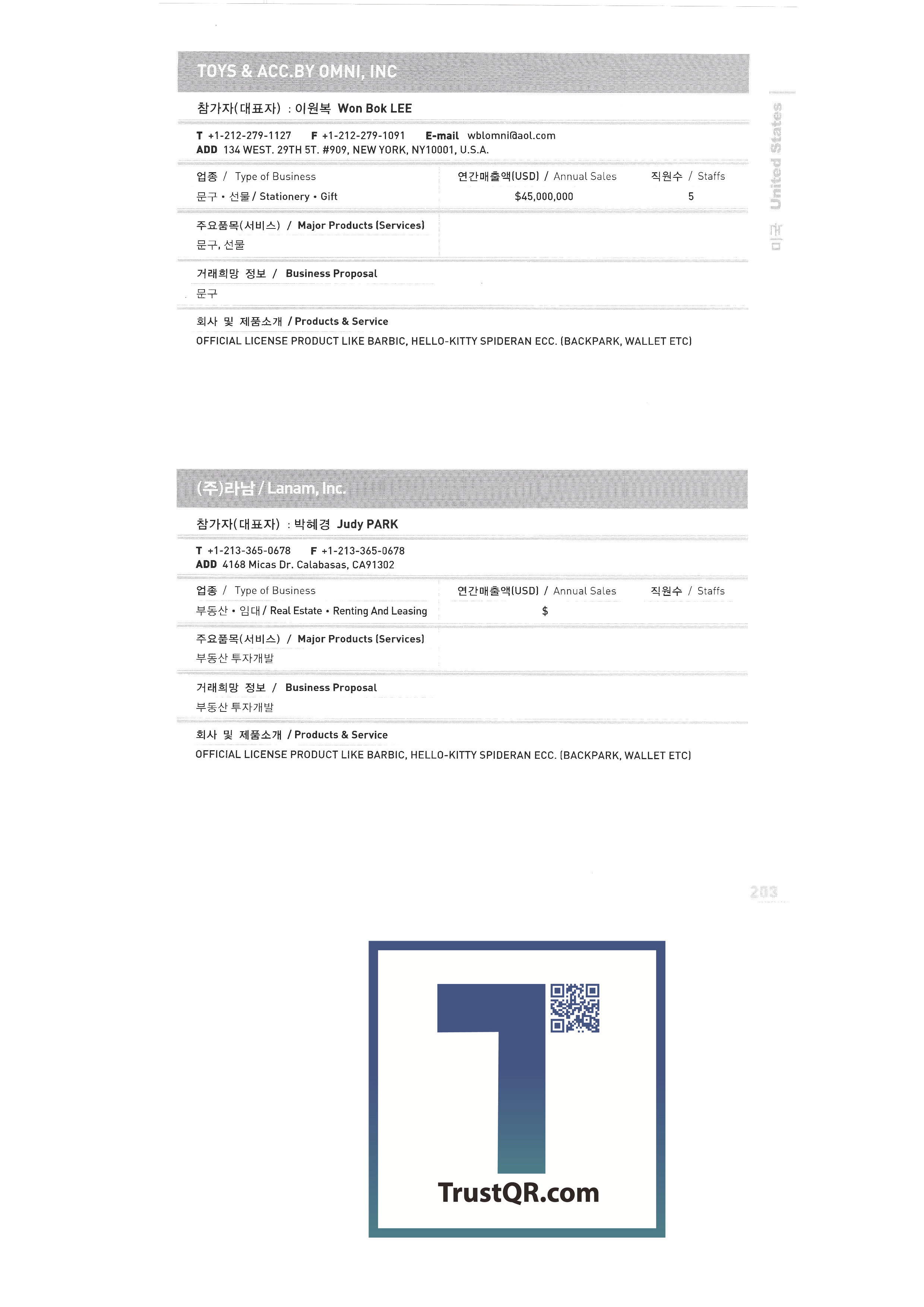 Jeff's Laundry Taejin Hwacheon U.S.A. INC FKDA J.N.H TRADING.INC K.C.Inc. K-1 Lupe L.A.auto parts co. MS MJ ENTER PRISES,INC Regal Custom Cleaners Inc. SC Machining, INC Song&In Corp Dallas Korean Chamber of Commerce Rococo Florist Accutopia One trading (one wholesaler) KC Landrimet Contima Corporation Kingsco Trading NIKE,Inc America's Liberation Society Aaone LITHO, INC. BARGAIN JEWELERS INC. Bridal & etc. Cal Pac World Trading GOLFDOM James Yongwon Property Jang's Enterprise Korean American Federation of O.C LAPD New York Golf center, Inc RIPMC CORP Robot Factory Incorporated Rotex Hotel&Condo Sinework Co. Space Works,Inc T&K Pakage Time Warner Cable Monty Squawer Company Howard Lee International J&H Bag&Gift INC. J.Park & Company MAX969 TRADING TOYS&ACC.BY OMNI, INC Ranam Corporation Newsta Group Remex Real Estate Americas Business Development Real Estate Real estate bank Sammun Group Asia Pacific Wondermere Real Estate Company Genix Kn Plaza Coldo Banker Dim Estate Hanwon Investment Hotel Butterfly Grove Inn Hankook property management S&H Gas Station AMCO Service Cor. Best Way Realty CR Res. CROWN INVESTMENT Crown Investment HERITAGE I.C INTERNATIONAL, INC Joy Investment K.Y.C Enterprises LA Realty Pro Land Commercial, Inc. Quingroup REALTY WORLD Sincha Samcho General Corporation Elcos America Co., Ltd. U-Strading Ruidoso Market Silk Road USA A-end J Trading Company US Trading Co., Ltd. Jewel sense Topa Enterprise Potomac Ivy Hollywood Trading Waistwood trade E-Mart K trading Smiling Star Inc YS LTD Cody Printing In K.Corp. International Imports KMC USA,Co Napawater,inc THREE BROTHERS ACC. INC Sonnet Inc Eggdon Heath Inc Yujung International Co., Ltd. J&H Trading Company Tianti fashion ABC TRADING INC. Cicci, Inc. CRÈME DE SILK INC. E&C Fashion EVEREST TRDING CORP K-ORIGINALS NM-Hi Fashion,Inc S.G.T Lee Inc. SHOE MART TRADING Sox Avenue, Inc Ton-To Corp WESTAR TEXTILES CORP Europa Gomei Corporation Korea Longevity Food Trade Blue Sea Inc. Dunkin' Donuts Delaware Food Association Lease counter licker Maryland Food Liquor Association American Food Association Korea-US Food Association Stainless Market Sifco Arirang Deer Farm Atlanta Dongyang Food Co., Ltd. Amstrong Corporation Espresso Best Company A&A Export Company TugboatFish&Chips Inc. Cab the world California Agriculture Kona Trading Co., Ltd. Coca Cola Tio Williams Meat Production Company Overseas Trade AF Food IRG supermarket MD Food Liquor Association Southern California Agricultural Products Co., Ltd. Airway Inn ANGELA TRADING CO.,INC. Babba's Supermarket BERKELEY INTERNATIONAL CO. BIG -H Food Market C&J Enterprise Chevron Gas Station CHOICE LIQUORS D.K Inc. Exxon Fivestar Investment, Inc IRG Supermarket Korea House B.B.Q Lee's Discount Liquor O.N.M INC Olive Bakery |