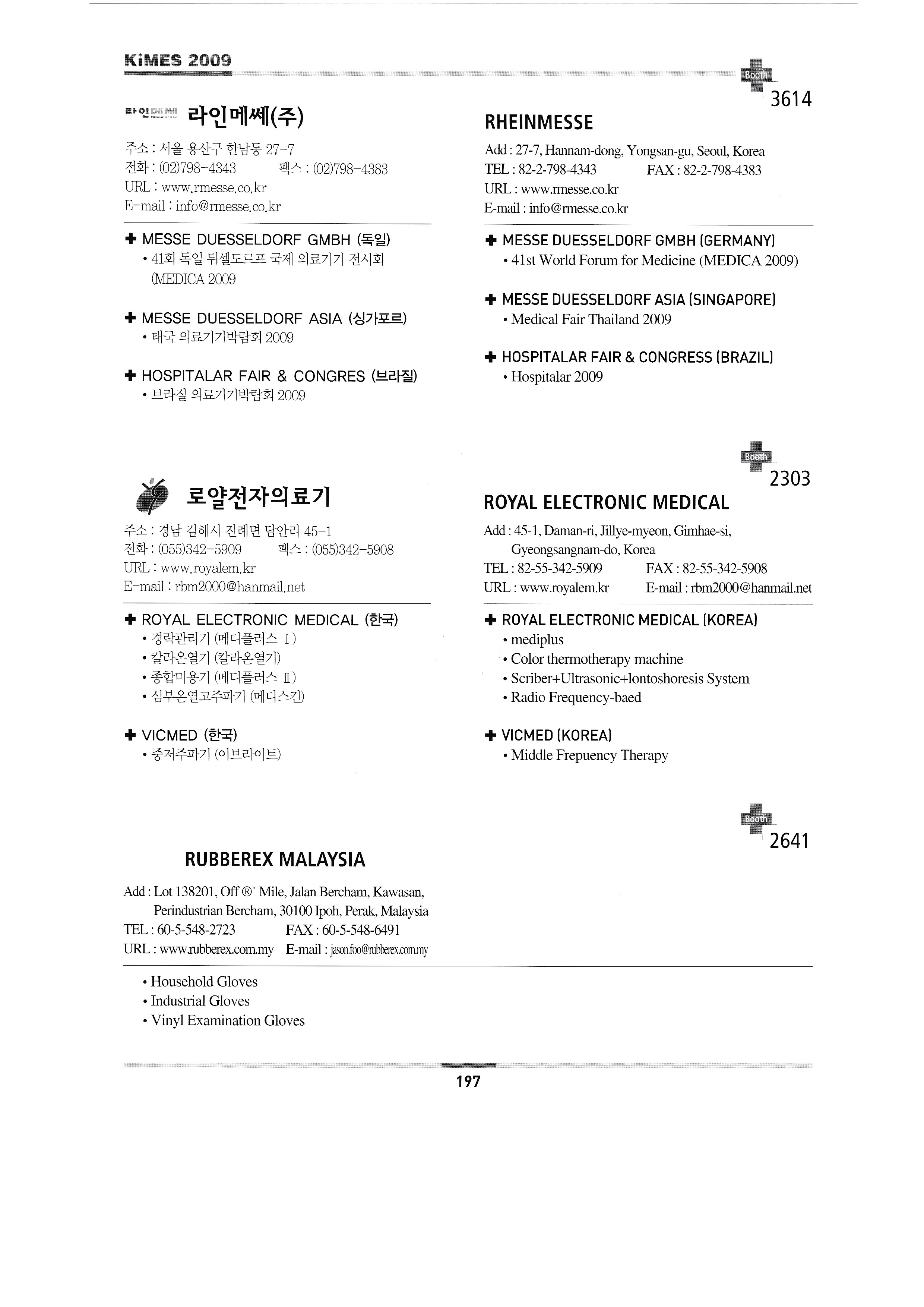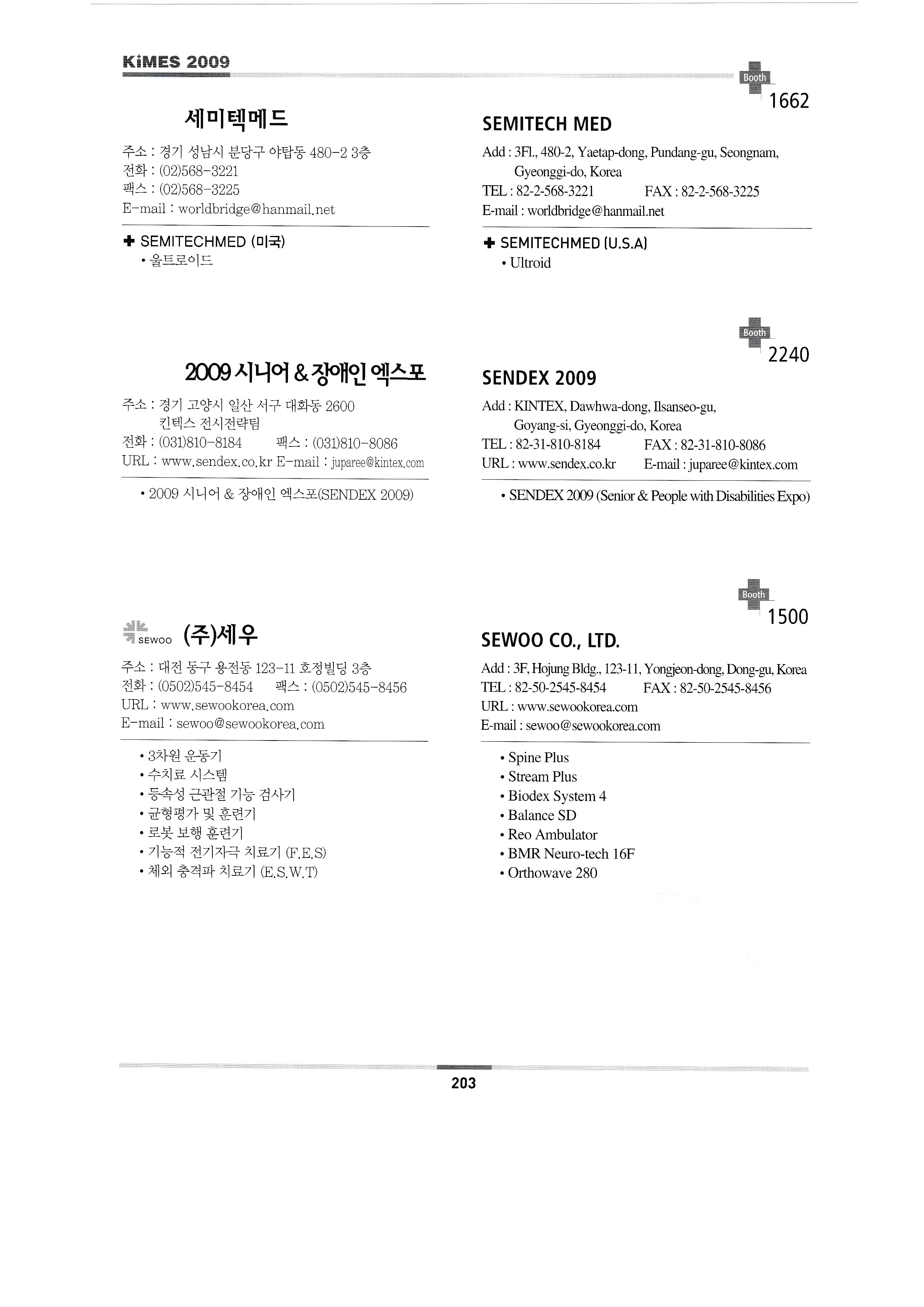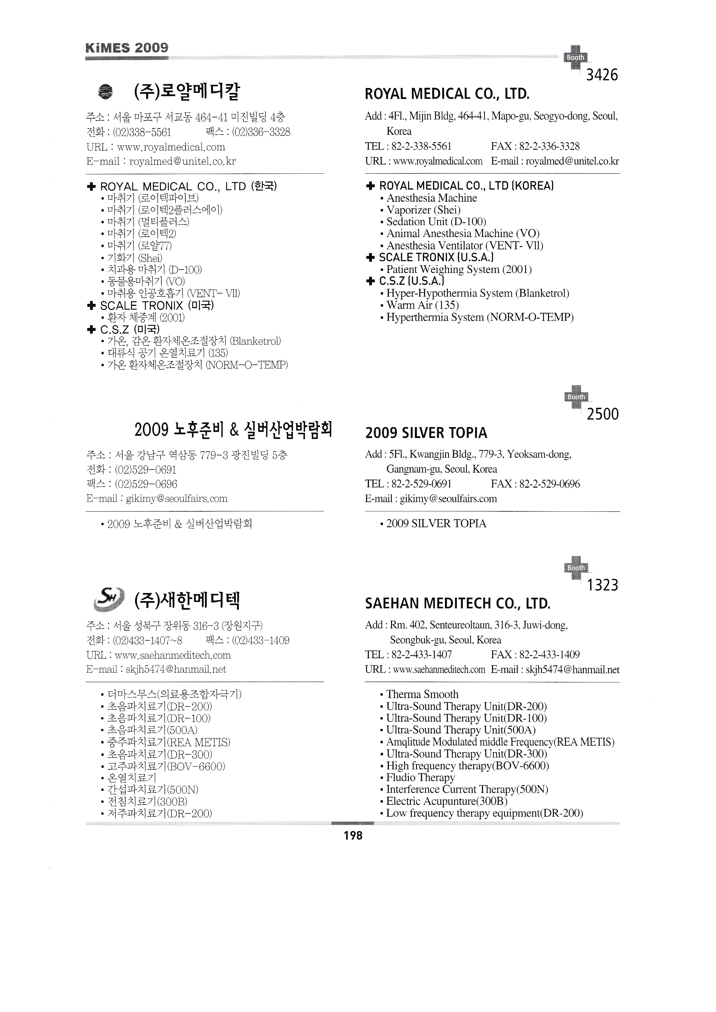 | 미래메딕스 ㈜미래에스앤티 ㈜미소텍B&H 미리 ㈜엠엠에이코리아 명세씨엠케이㈜ ㈜엠케이티 (합)모우메디칼 ㈜MS헬스케어 ㈜앤케어 나가이레벤㈜/주식회사 보보트레이딩 ㈜나노카보나 ㈜나음케어 ㈜네오닥터 네오메드 존 코퍼레이션 네오플라스틱서져리앤드코스메틱인터내셔널 ㈜넷블루 넥슨㈜ ㈜넥스트세이프 놀란바이오 ㈜엔텍 ㈜누가의료기 ㈜오코메드 ㈜오성마이더스 오엠에이 오므론헬스케어㈜ 한마음케어 ㈜옵토바이오메드 ㈜옵토웰 동의대학교 한방실버웰니스사업단 올텍 오릭스 ㈜오씸코리아 ㈜오에스오 ㈜오송라이프 ㈜오스테오시스 오토스테크㈜ ㈜오픈케어 PACIFIC HOSPITAL SUPPLY CO.,LTD. 한국 폴㈜ 피플레이저테크 ㈜파나노믹스 펜실베니아 ㈜피플스 퍼슨메디컬 피닉스비전 ㈜피브트로 ㈜필립스전자 피닉스메카노 코리아㈜ 프러스 ㈜포인트닉스 파인상사 ㈜포스콤 프림포㈜ PRIMESTAR INSTRUMENTS ㈜프로토스 피에스아이㈜ 펄스캠생활과학㈜ 퀸텀메딕스㈜ R.S. 세라코 ㈜알비앤드씨 ㈜리디자인 REED SINOPHARM EXHIBITIONS CO.,LTD. ㈜렙테크 ㈜레베코메디칼 ROSSMAX INTERNATIONAL LTD. 라인메쎄㈜ 로얄전자의료기 RUBBEREX MALAYSIA ㈜로얄메디칼 2009 노후준비& 실버산업박람회 ㈜새한메디텍 ㈜새하늘바이오텍 삼우전자정밀㈜ 삼손 ㈜삼송캐스터 ㈜삼손 삼성보호대 상도메드 ㈜산암텍 세일유프리저 상정상사㈜ 에스씨에이하이진프로덕츠 세인산업 세미텍메드 2009 시니어&장애인 엑스포 ㈜세우 서동무역 신창의료기공업사 신광산업(에스지메드) SHENZHEN BIOCARE ELECTRONICS CO.,LTD. 신화의료기 ㈜신진전자 신신메디테크 신우인터교역 ㈜신용덴탈 지멘스 헬스케어 신우메디칼, 쏠라코리아 ㈜씨텍메디칼 에스케이에스메디칼 ㈜에스엠티 에스엠메디칼테크 (룩소 코리아) ㈜에스앤에스 ㈜에스앤에스케어 솔로몬 멀티미디어 통신 ㈜썸텍 ㈜수일개발 스타빌루스(효일이엔티) 스파테크㈜ SFRI SARL ㈜스트라텍 STERYLAB SRL 썬인터내셔날/두바이국제의료전 태양기계㈜ 성진 주식회사 성진시무라 ㈜성환이엔비 성광메디텍 썬메디텍㈜ SUNPEX TECHNOLOGY CO.,LTD. 성심의료산업㈜ 선우 순우리통상 |