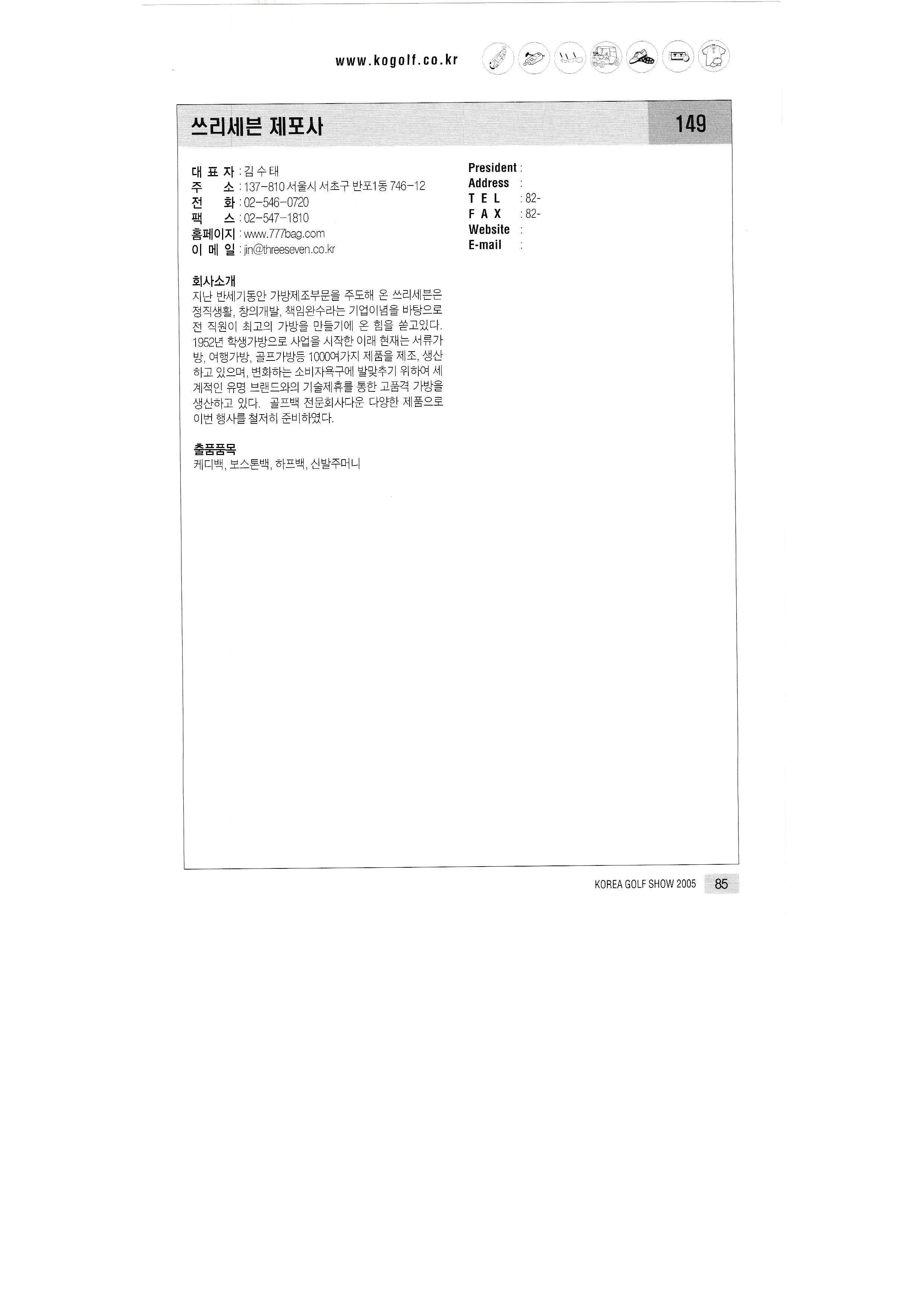 | 쓰리세븐 제포사 ㈜씨엔에스 인터내셔날 씨지텍주식회사 아름다운텍스㈜ 아이랭스필드㈜ 에버그린엠에스티㈜ ㈜에스케이비 케이스 에이스샵21 에이알 스포츠 엠프로골프 영상 코퍼레이션 영신양산 영엔영(백보이코리아) 영풍정밀㈜ ㈜예스퍼터코리아 옥이랑옥창고 월터제뉴인코리아 위즈스포츠 유미 골프텍 ㈜유신모자 이글아이드 이문산업 21세기컨설팅주식회사 이지스포츠총판 ㈜일광기공 ㈜잔디로 재이손산업주식회사 제이엔디테크 ㈜제이엠스포텍 제인통상주식회사 조이시아 좋은생각 ㈜줌테크 지브이골프코리아 지-에치 레포츠 진성스포츠 진일스포츠 창선골프 청풍 청풍교역㈜ 칠칠공예사 ㈜카타나골프 |