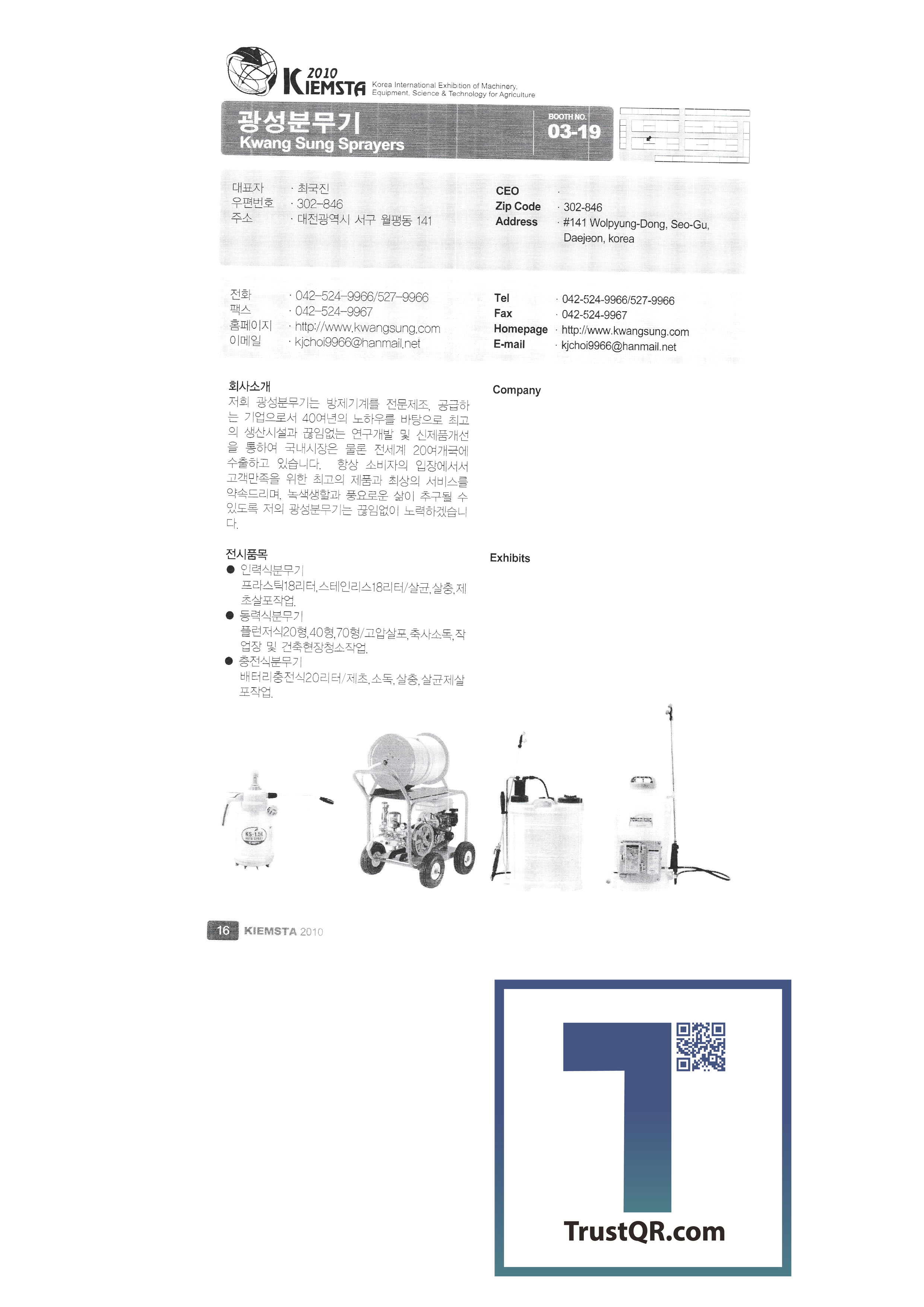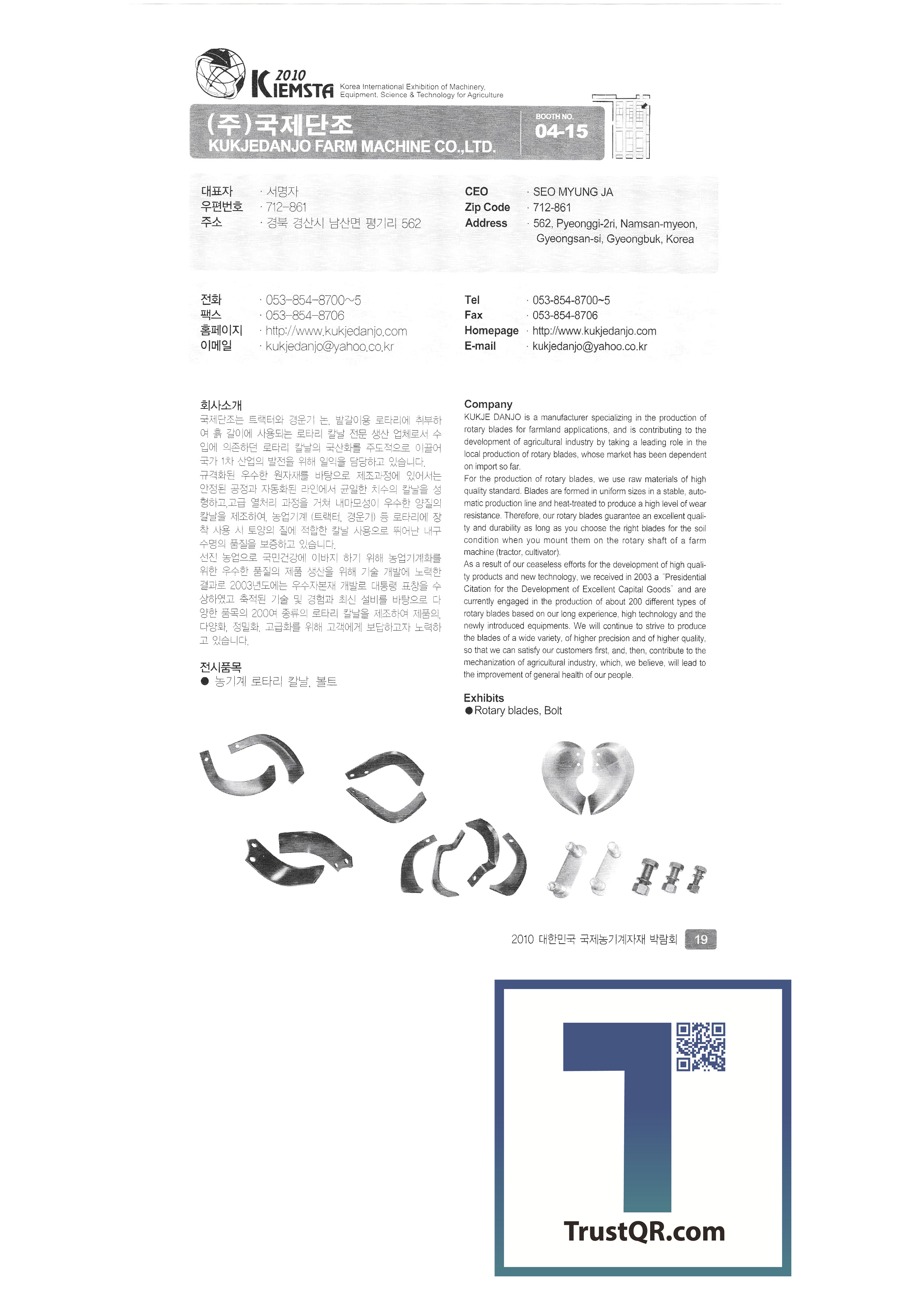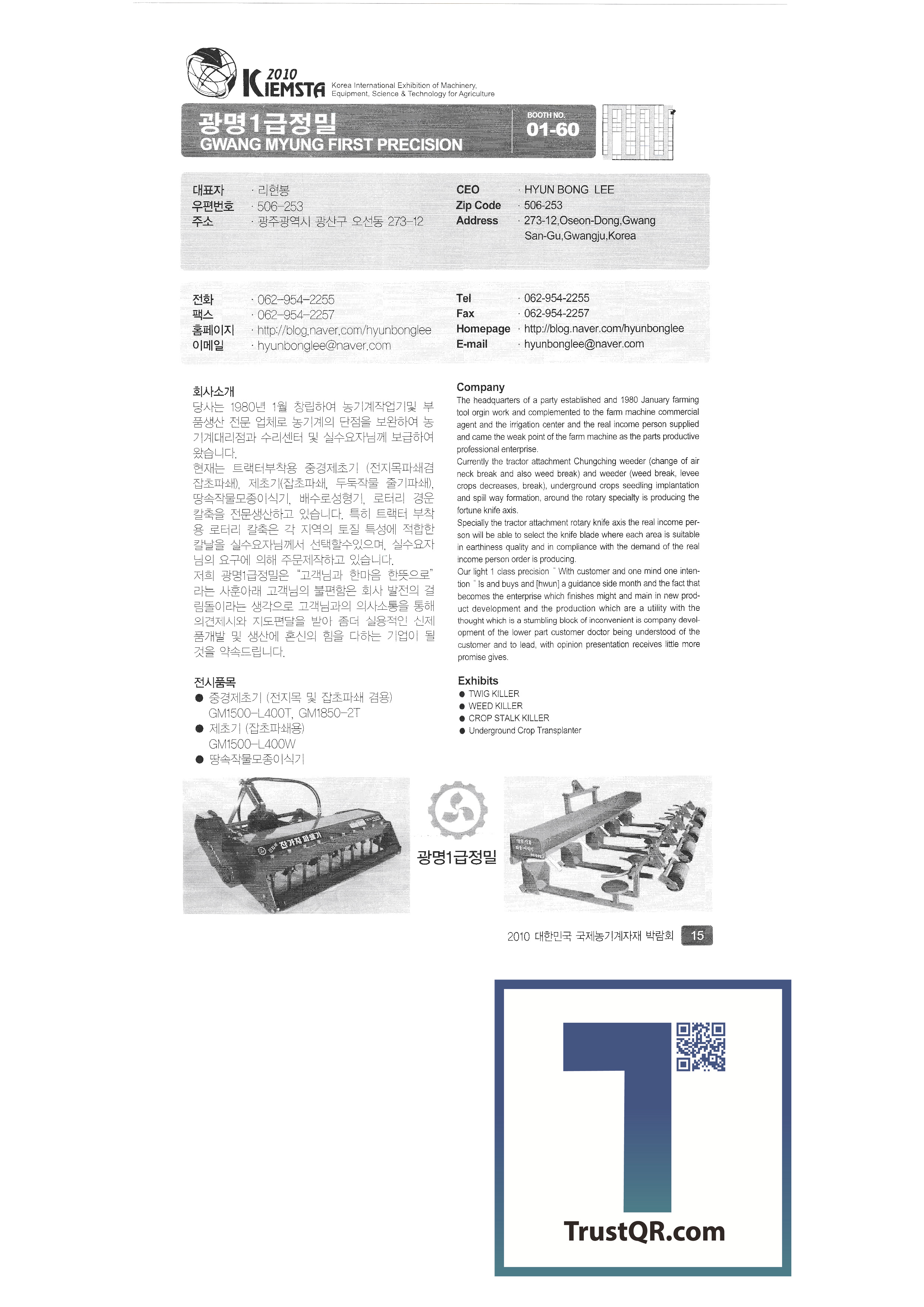 Gangwon Agricultural Machinery Gyeongan Agricultural Machinery Kyungin Pack Gwangmyeong Class 1 Precision Mineral weapon Gwangwon Agricultural Machinery Co., Ltd. Gwangpung Co., Ltd. International Forging Co., Ltd. International General Machinery Kukje General Machinery Co., Ltd. Grand Korea Green Nuri Co., Ltd. Greenmax Co., Ltd. Green Agrotech Co., Ltd. Green Tech Green Heart Bio Geunwoo Tech Co., Ltd. Kui Korea Seedling Co., Ltd. Nara Industry Co., Ltd. Namkyung Co., Ltd. N&B South and North Agricultural Materials Corporation Namjin Agricultural Machinery Co., Ltd. Nokwon |