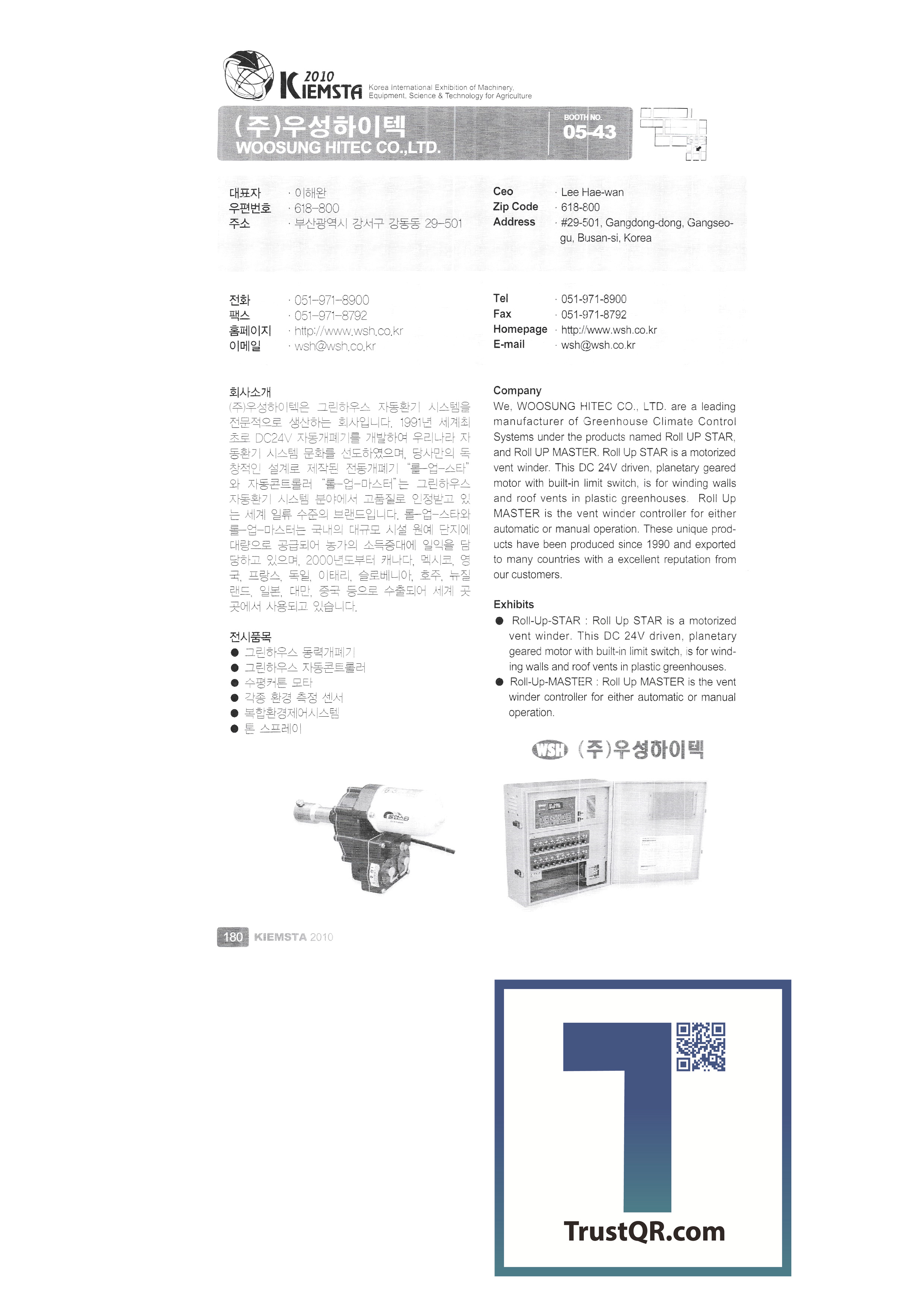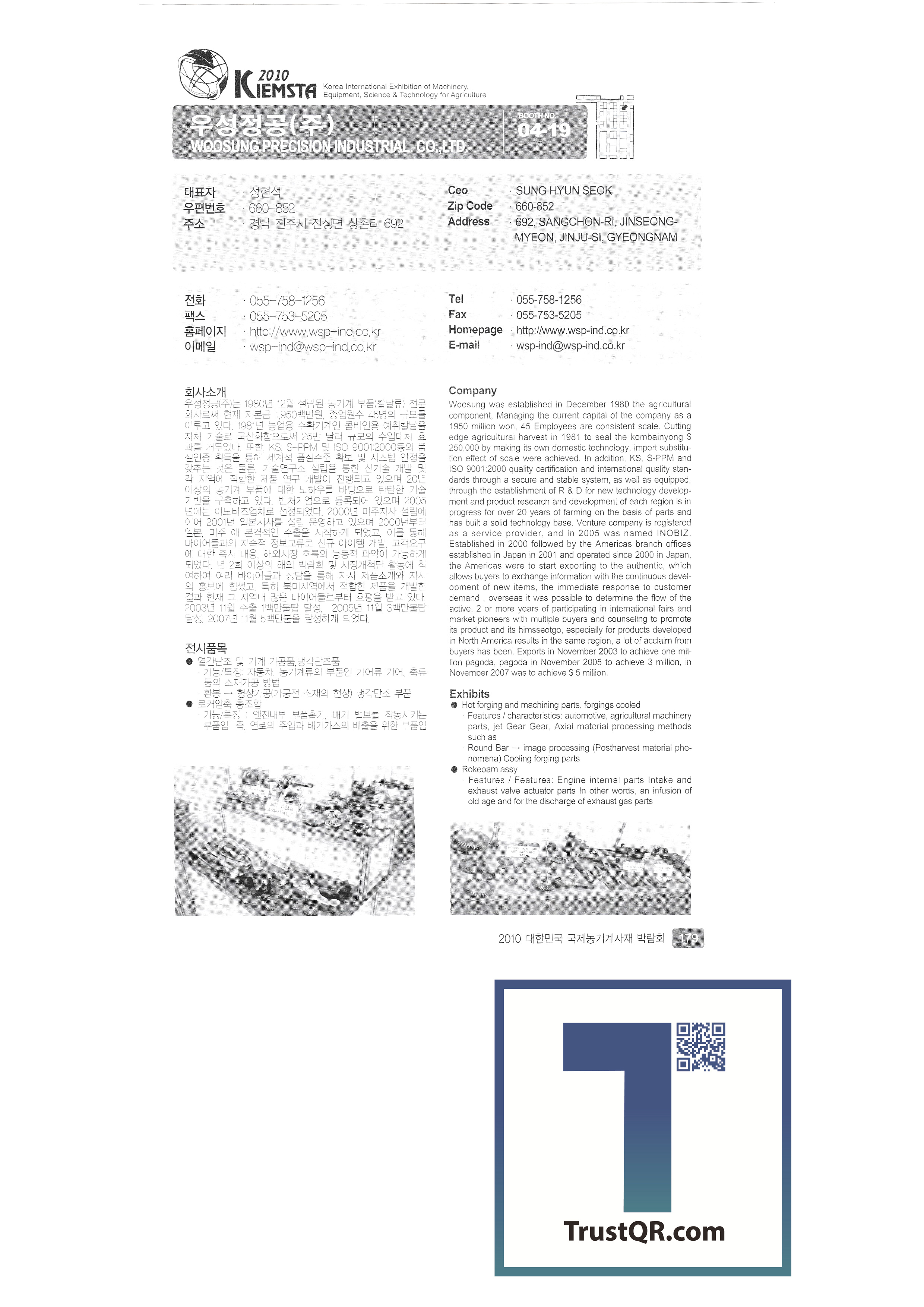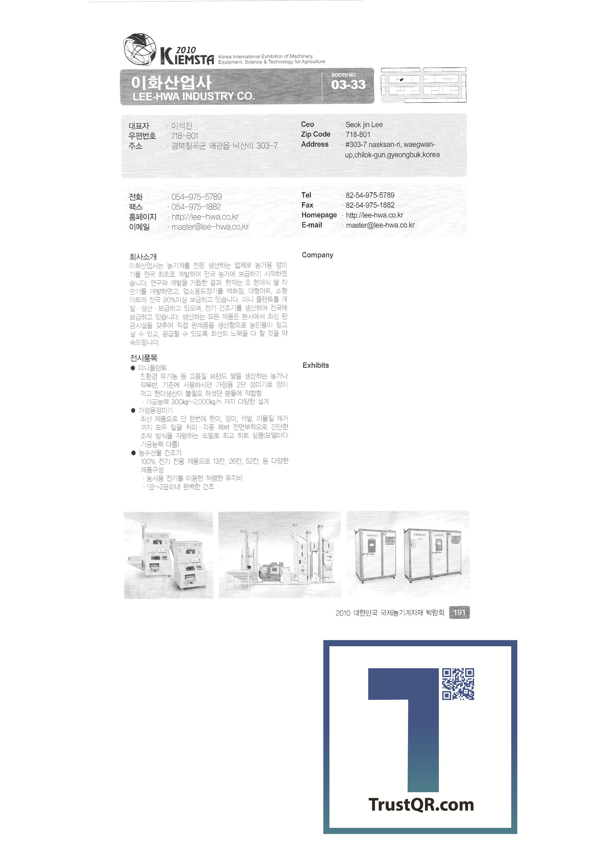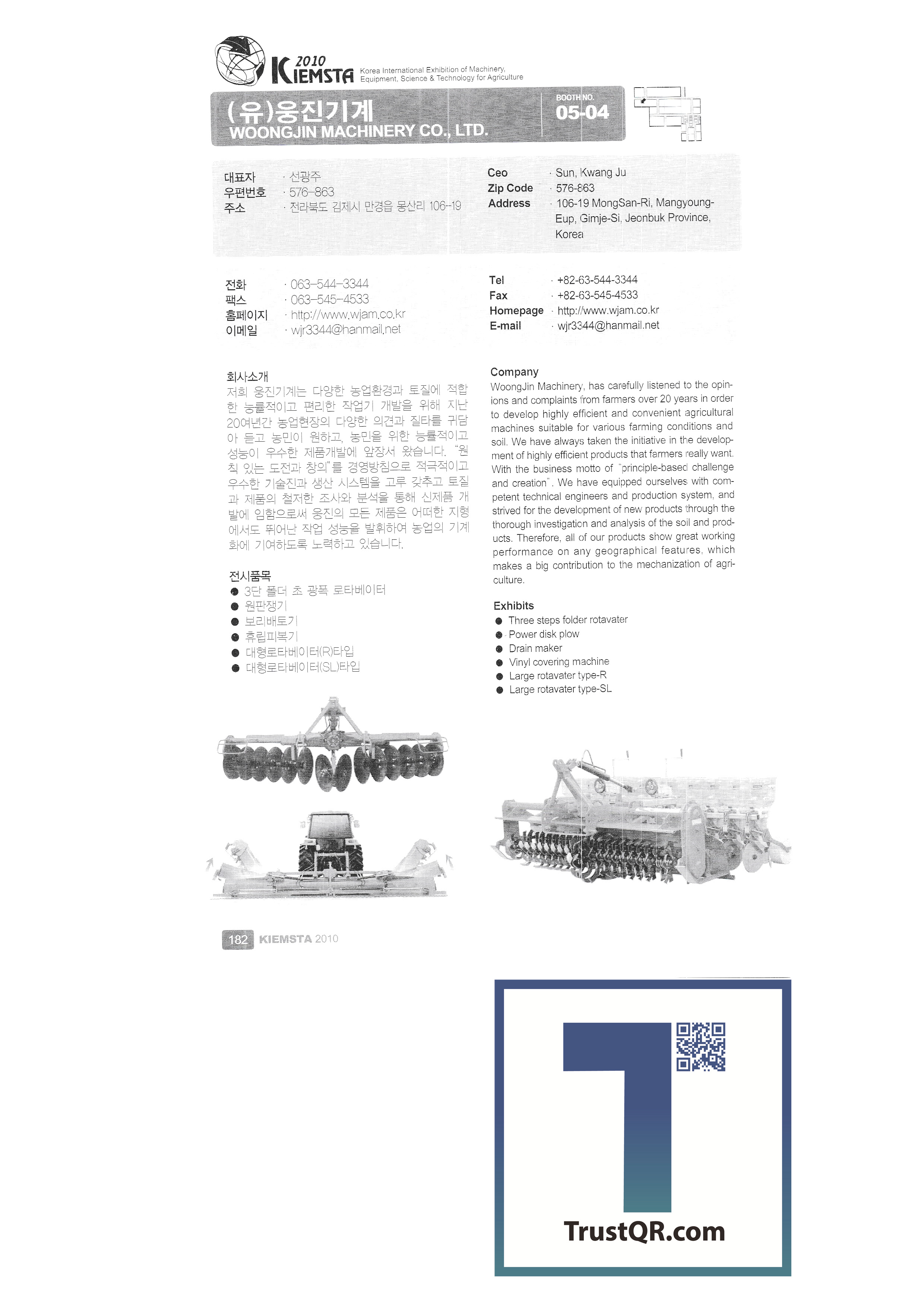 AM Farm Co., Ltd. Age Co., Ltd. Eco Solar Tech Co., Ltd. Eco Pass Co., Ltd. FM Unico LSMtron MNG MG Tech Emfine Co., Ltd. Youngshin (Yu) Youngshin Agricultural Machinery Youngjin Machinery Youngjin Industry Ohsung RST Co., Ltd. Occbank Co., Ltd. Woosung heating Woosung Precision Woosung Hitech Woojin TOOL Woongjin Machinery One International Co., Ltd. weed Uniworm Co., Ltd. Unitech Bio Industry Yooyoung Machinery Yoochang Co., Ltd. Ryuk-il non-woven fabric industry Ire Co., Ltd. Ewha Industrial Company Iksan Agricultural Machinery Ildo Biotech Co., Ltd. Ilam Co., Ltd. Jang Automation Co., Ltd. Reconvergence industry Jane International Jungwoo Industry Zhengzhou Agricultural Livestock Machinery Light Industry Corporation Jeil Farm Equipment Factory Jeil Fine Tech Co., Ltd. Gems Chaoyang Co., Ltd. |