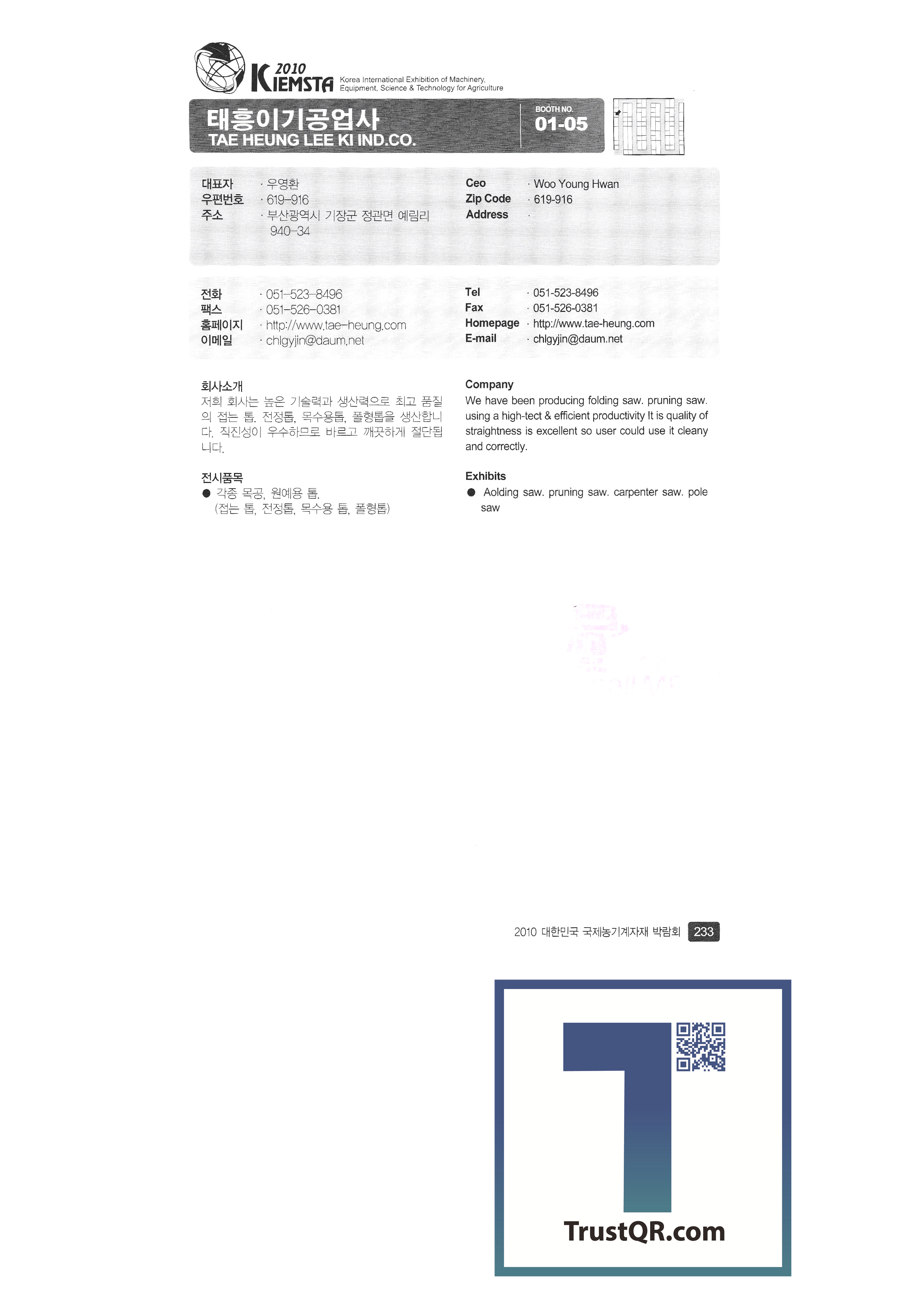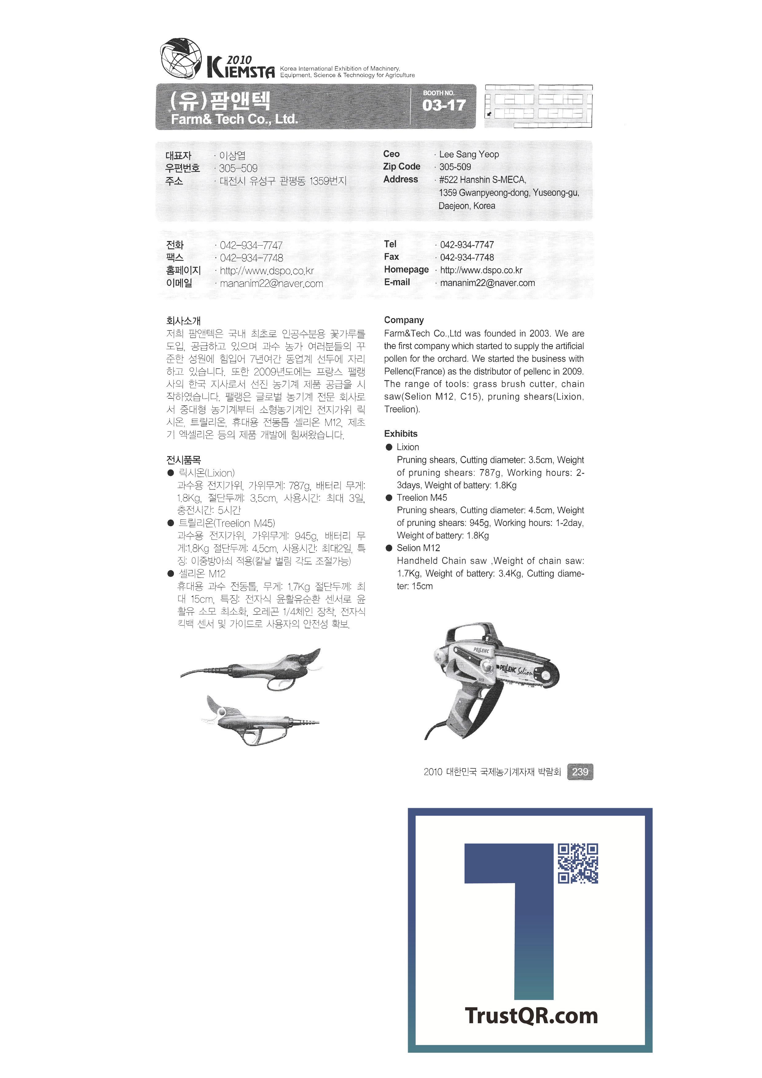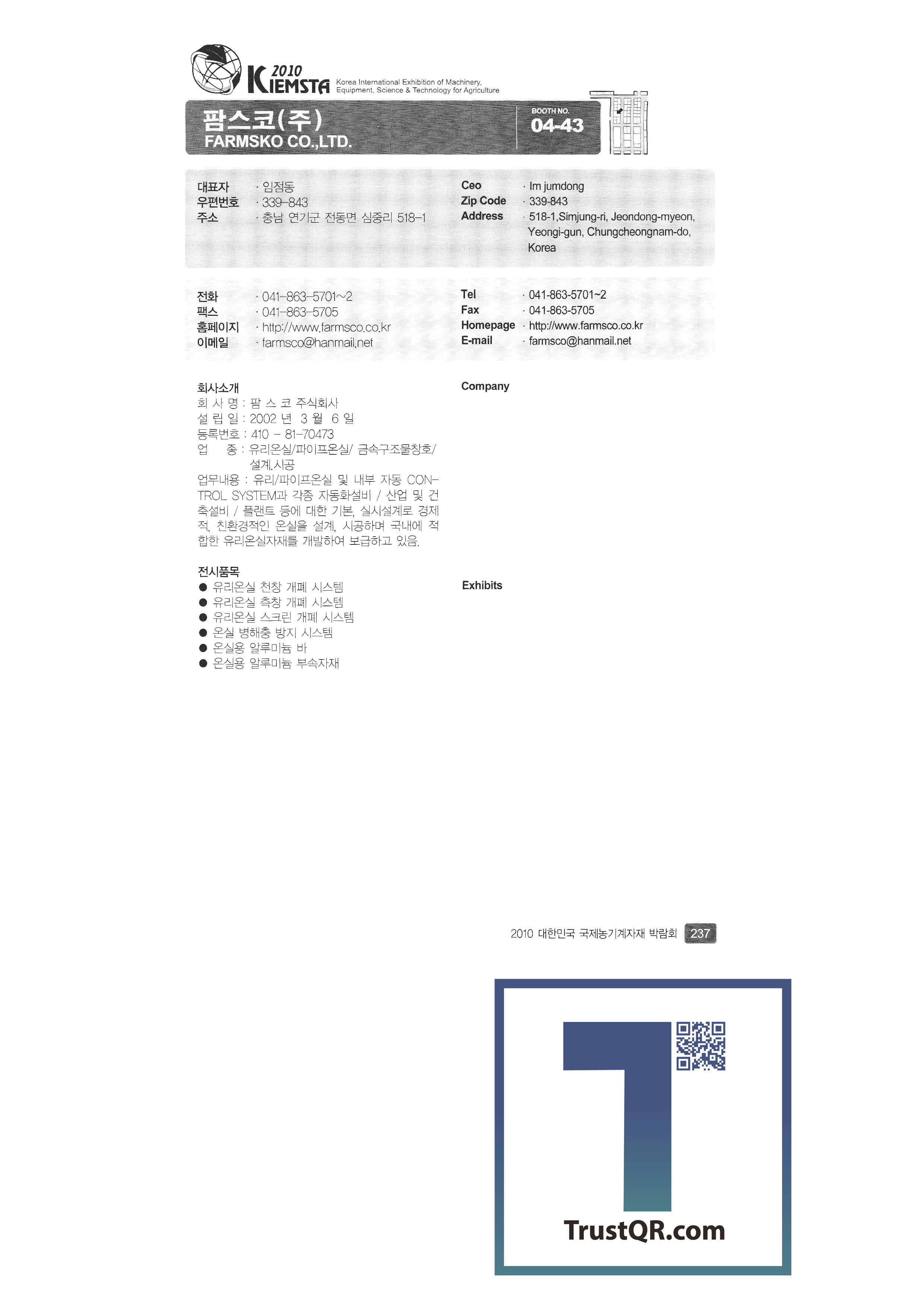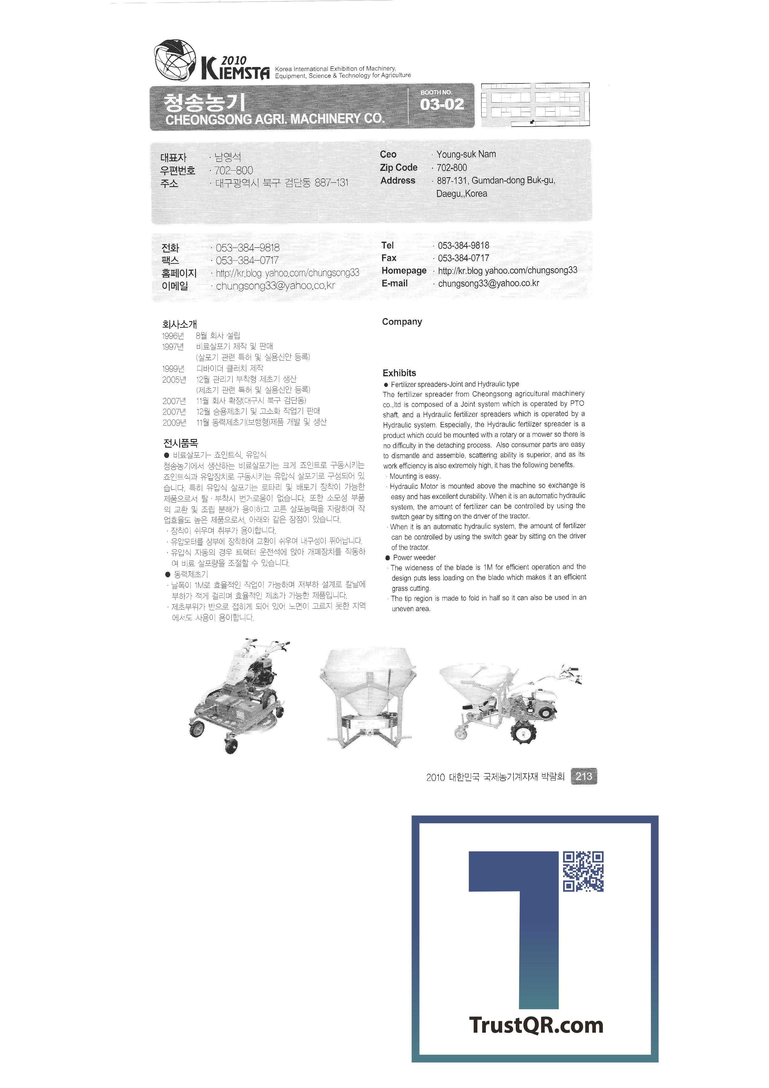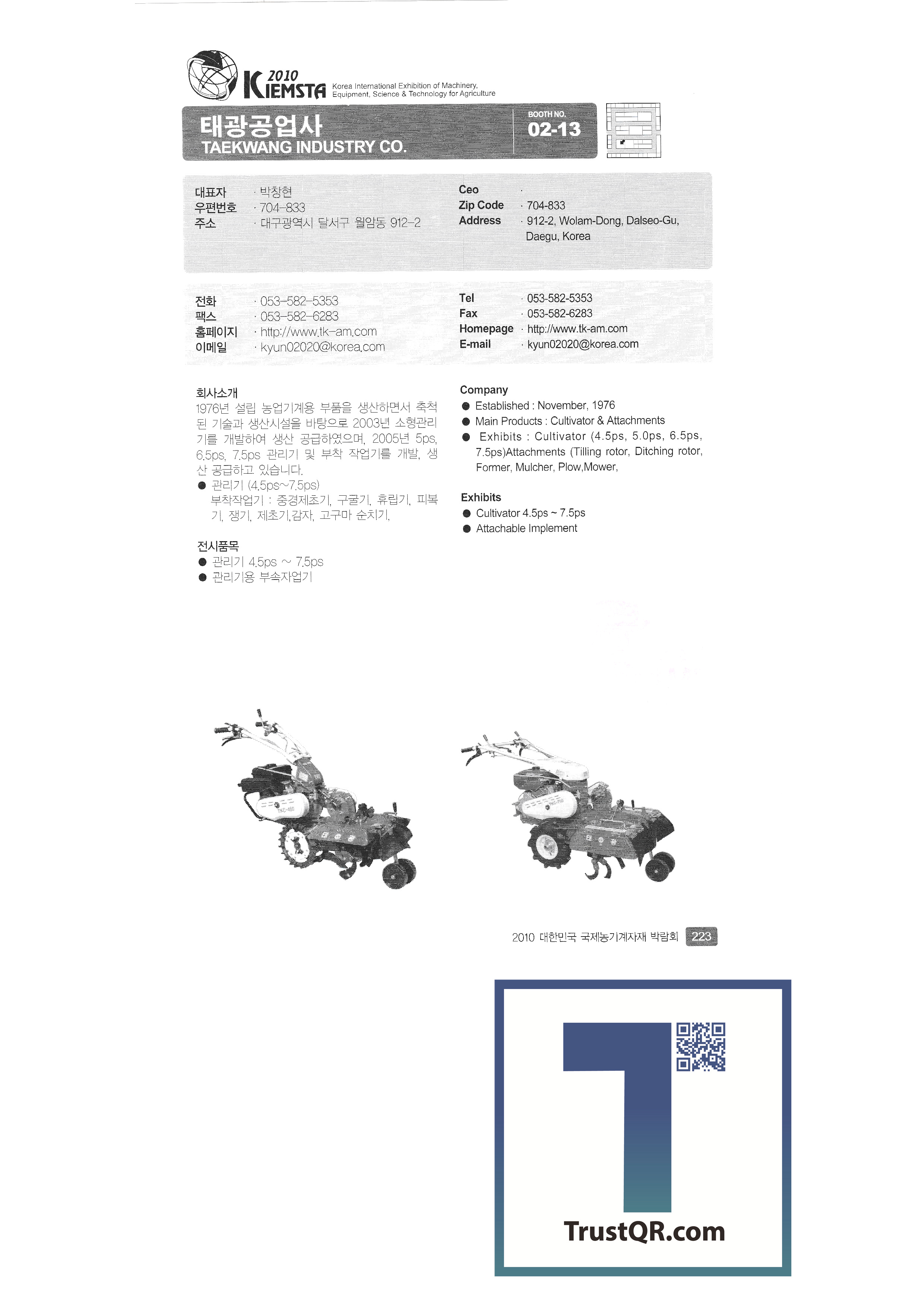 | 주신정밀 중앙기술산업㈜ 중앙정밀㈜ GGB BEARING TECHNOLOGY ㈜진양화학 ㈜진영산업 진영종합기계 천풍산업㈜ 청송농기 ㈜청오엔지니어링 청호산업 카스에프에이 ㈜카프코 케이에스에프㈜ (유)코리아농업개발 코코바이오㈜ 쿨탑 킴스교역 태광공업사 태광교역 ㈜태광기계 태광농기 태광종합기계 태산에코텍㈜ ㈜태성공업 ㈜태성기계 태성프라스틱㈜ 태호㈜ 태흥이기공업사 탱크팡코리아 ㈜툴스텍경복 ㈜파루 팜스코㈜ 팜스틸㈜ (유)팜앤텍 ㈜평화에코 ㈜푸른 ㈜피엔에스 필수기계 PINGXIANG ETERNAL AGRITECH CO.,LTD ㈜하나 ㈜하나팜 |
